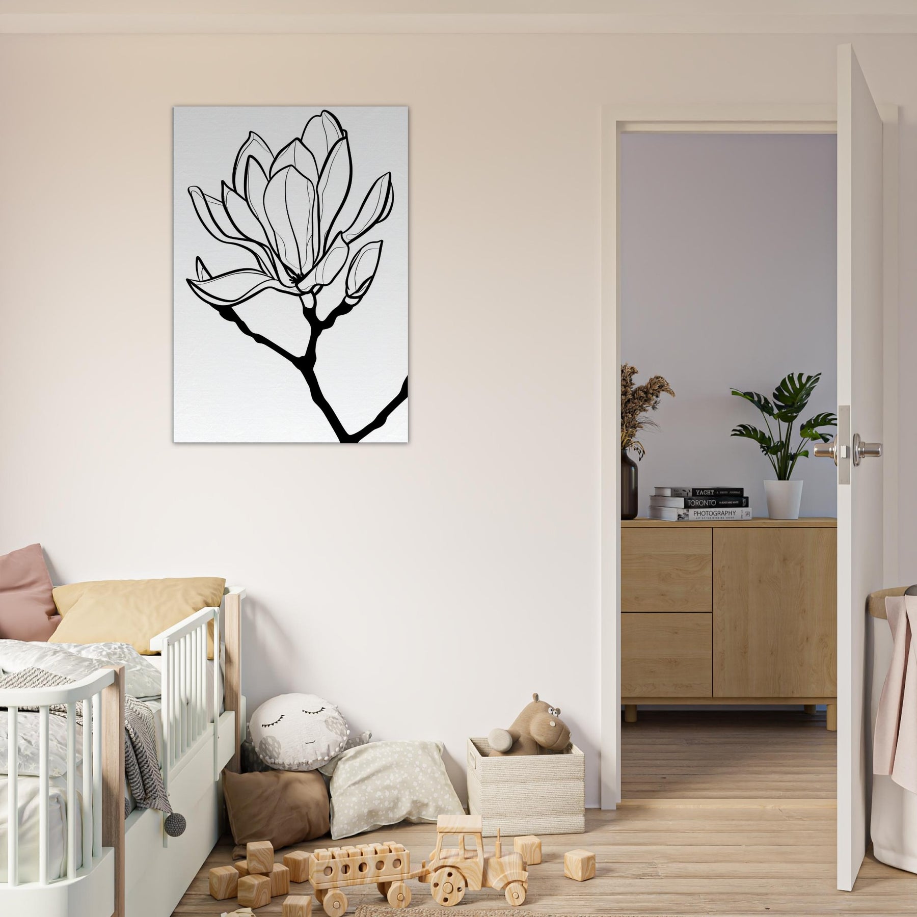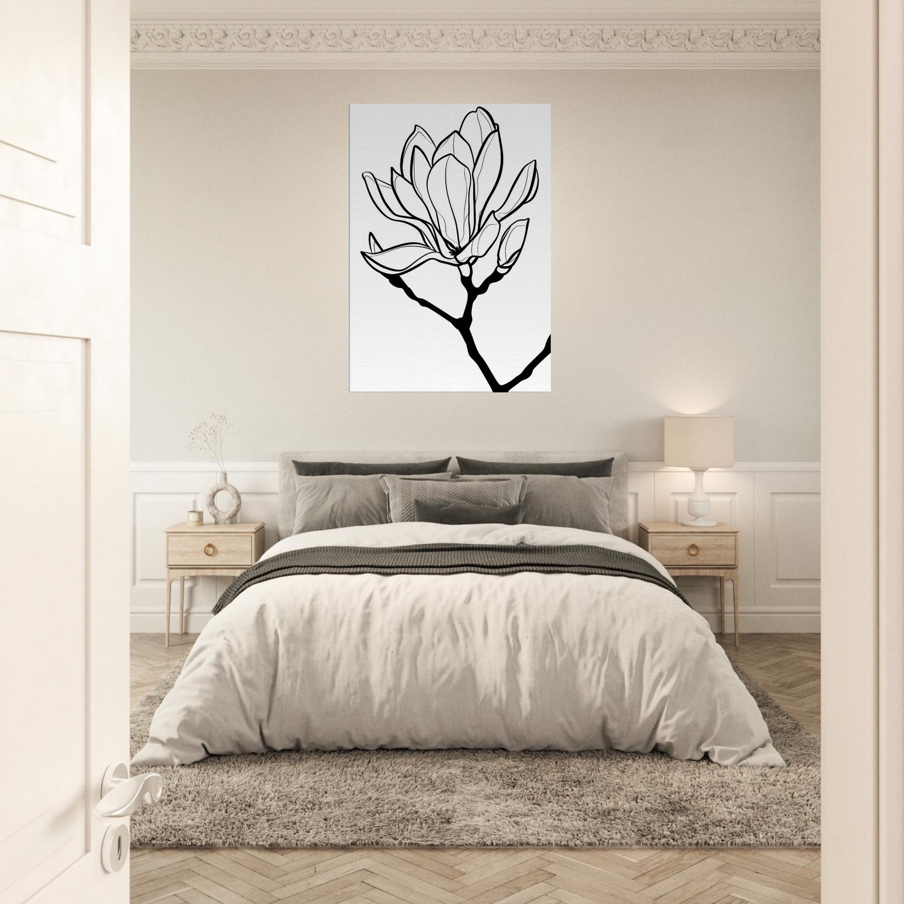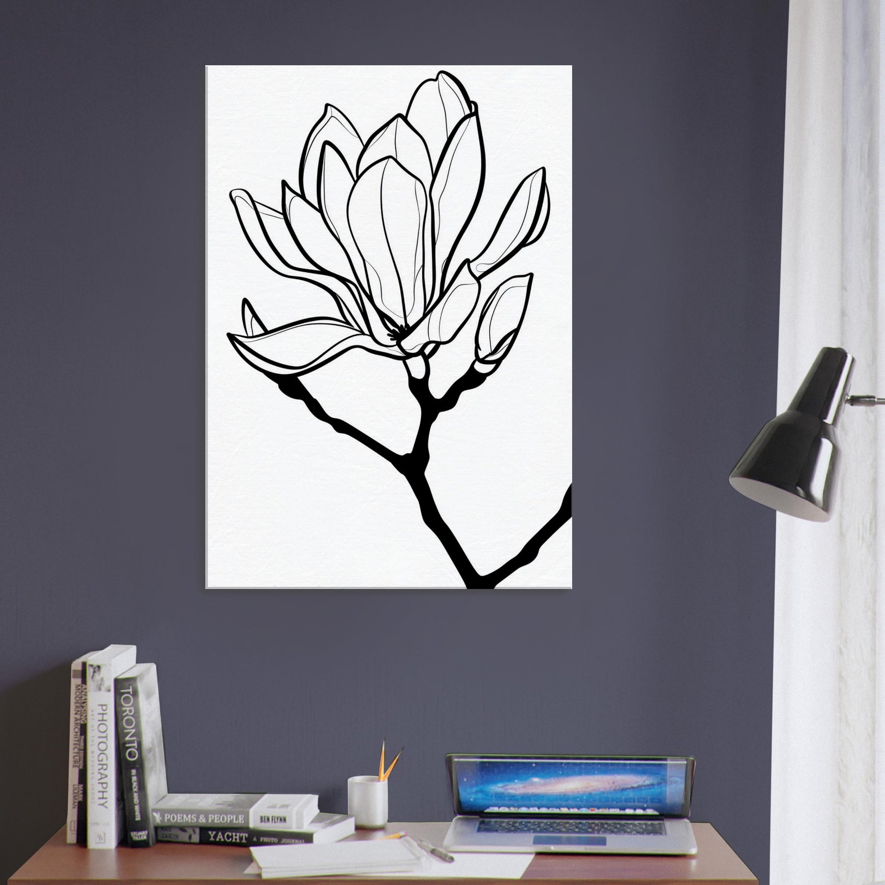 Magnolia blooms unfold in a single, continuous line that feels both effortless and intentional. This magnolia centric composition invites quiet contemplation, its slender curves tracing a memory of spring across your wall. The stark black on white contrasts create a calm, gallery like atmosphere, turning any room into a serene retreat. With its minimalist elegance, this Magnolia focused piece pairs perfectly with soft textiles and warm wood, enhancing natural light and inviting whispered conversations. A timeless accent that breathes life into living spaces without overpowering them.