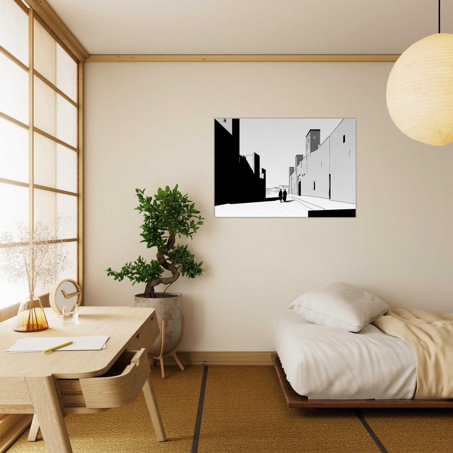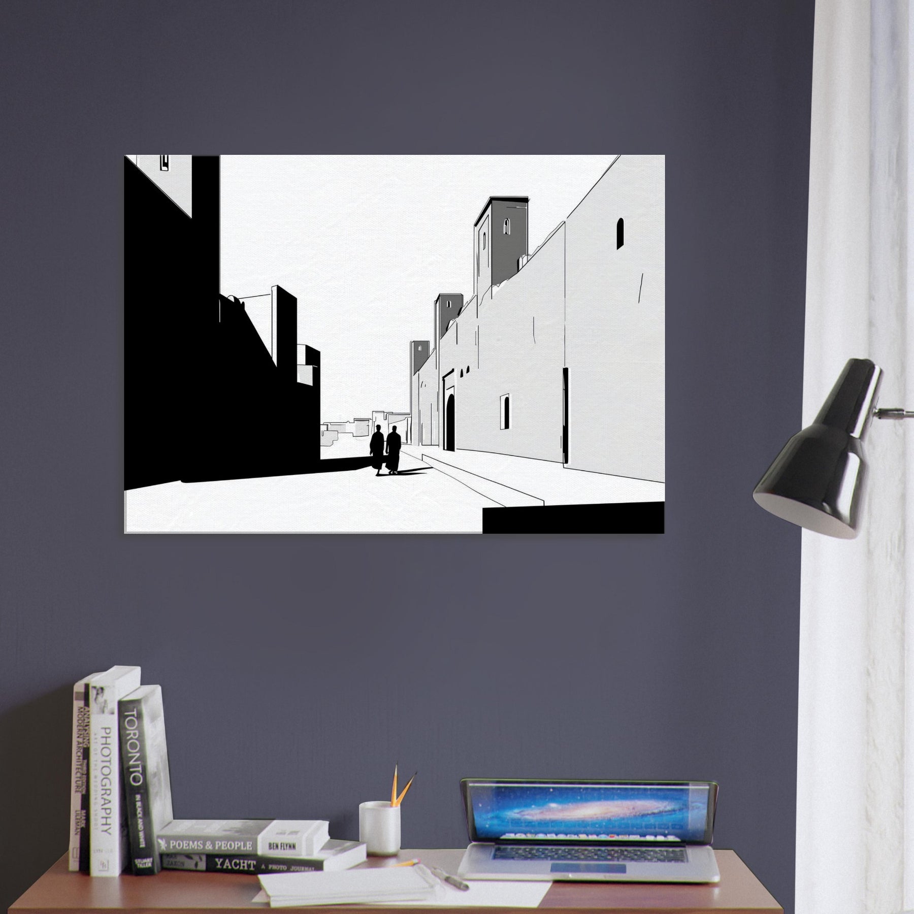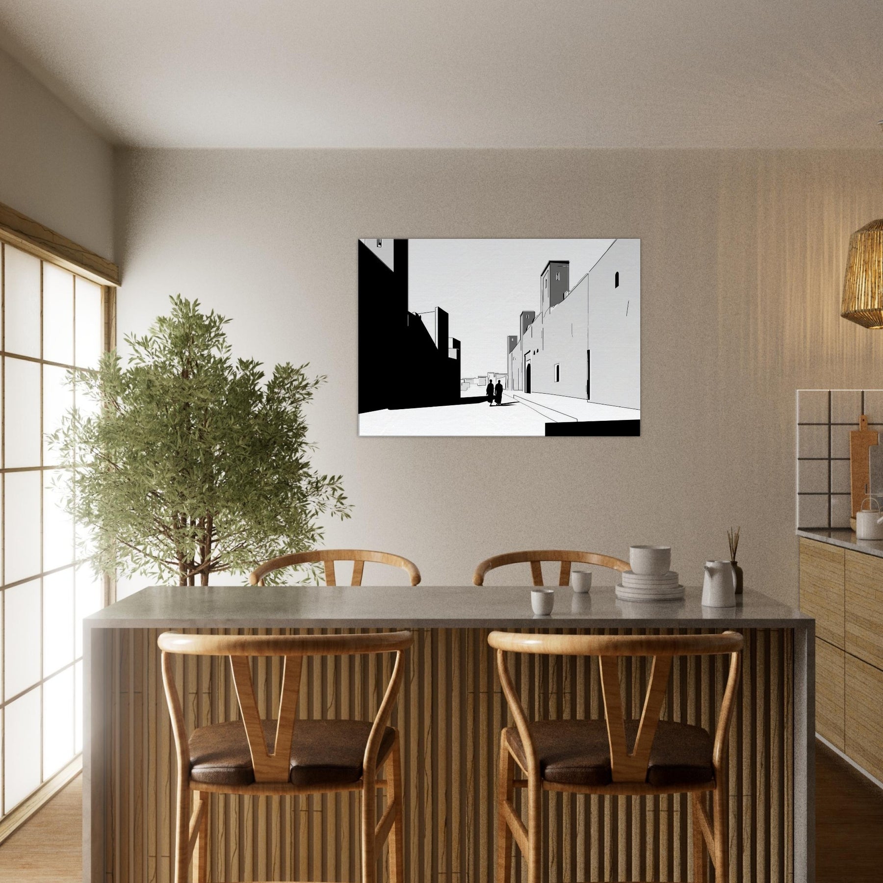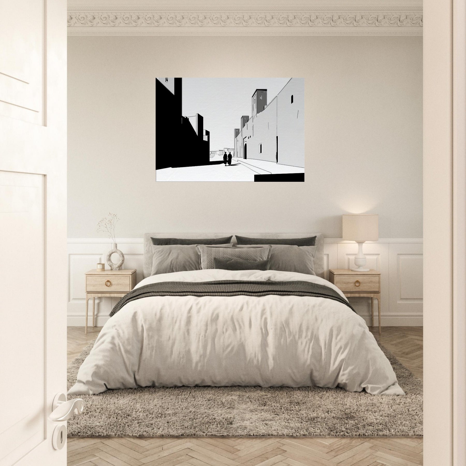 Step into Marrakech through a refined line art vision. This depiction of sunlit walls, arched doorways, and narrow lanes balances stark black and pale white to create a tranquil, gallery like atmosphere. The bold simplicity invites calm focus, turning a living room into a contemplative courtyard. Elegant silhouettes stroll along the street, reminding you of wandering markets and warm afternoons. With its timeless, architectural rhythm, Marrakech becomes a daily meditation every glance reveals new geometry and light, elevating your space with quiet sophistication and memorable charm.