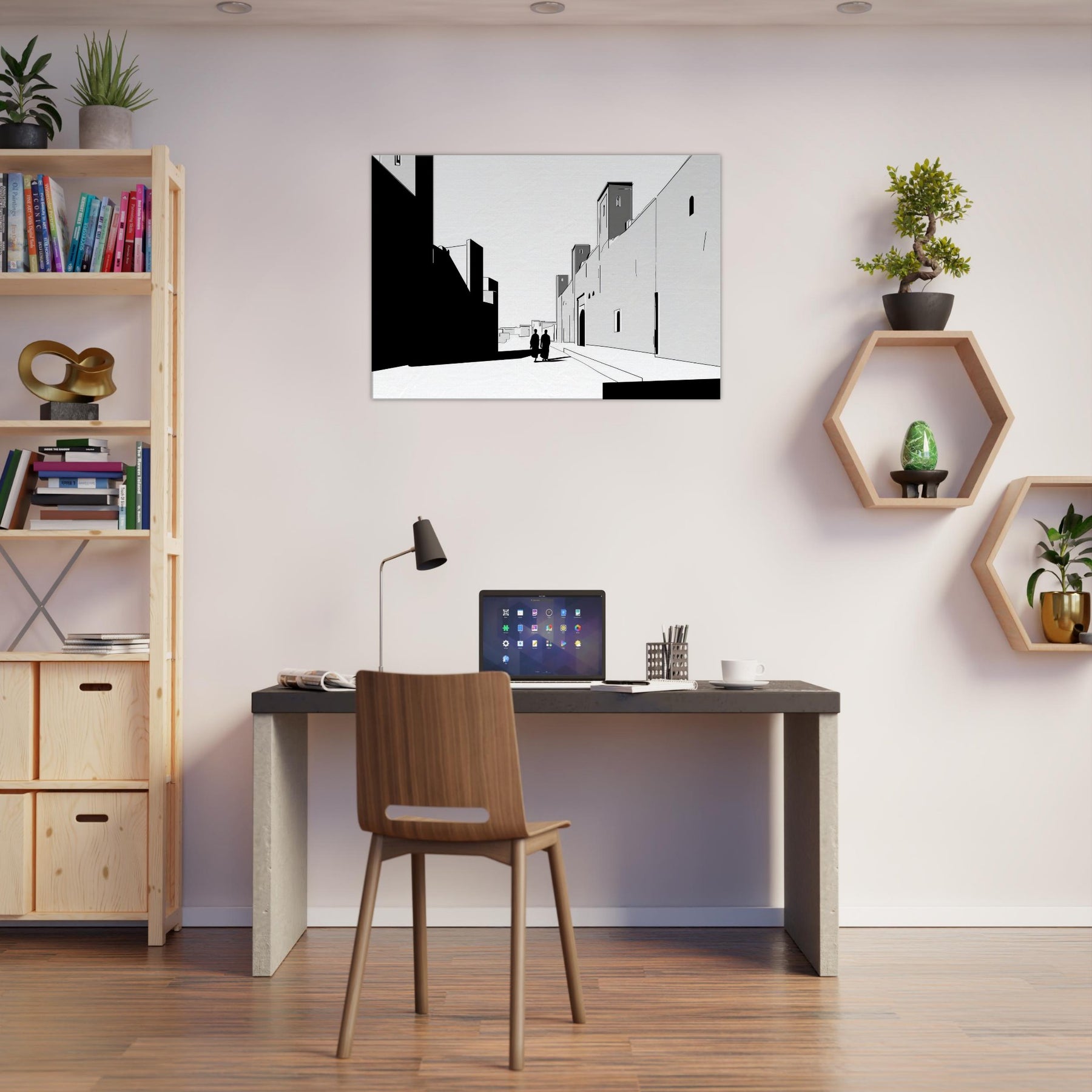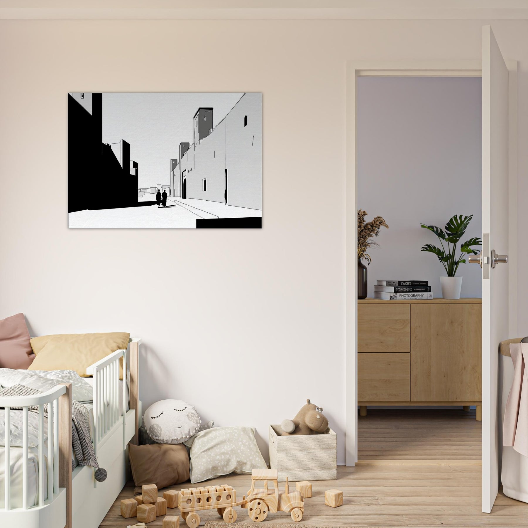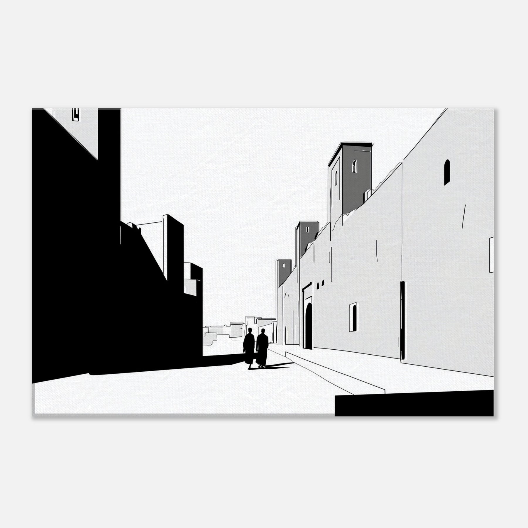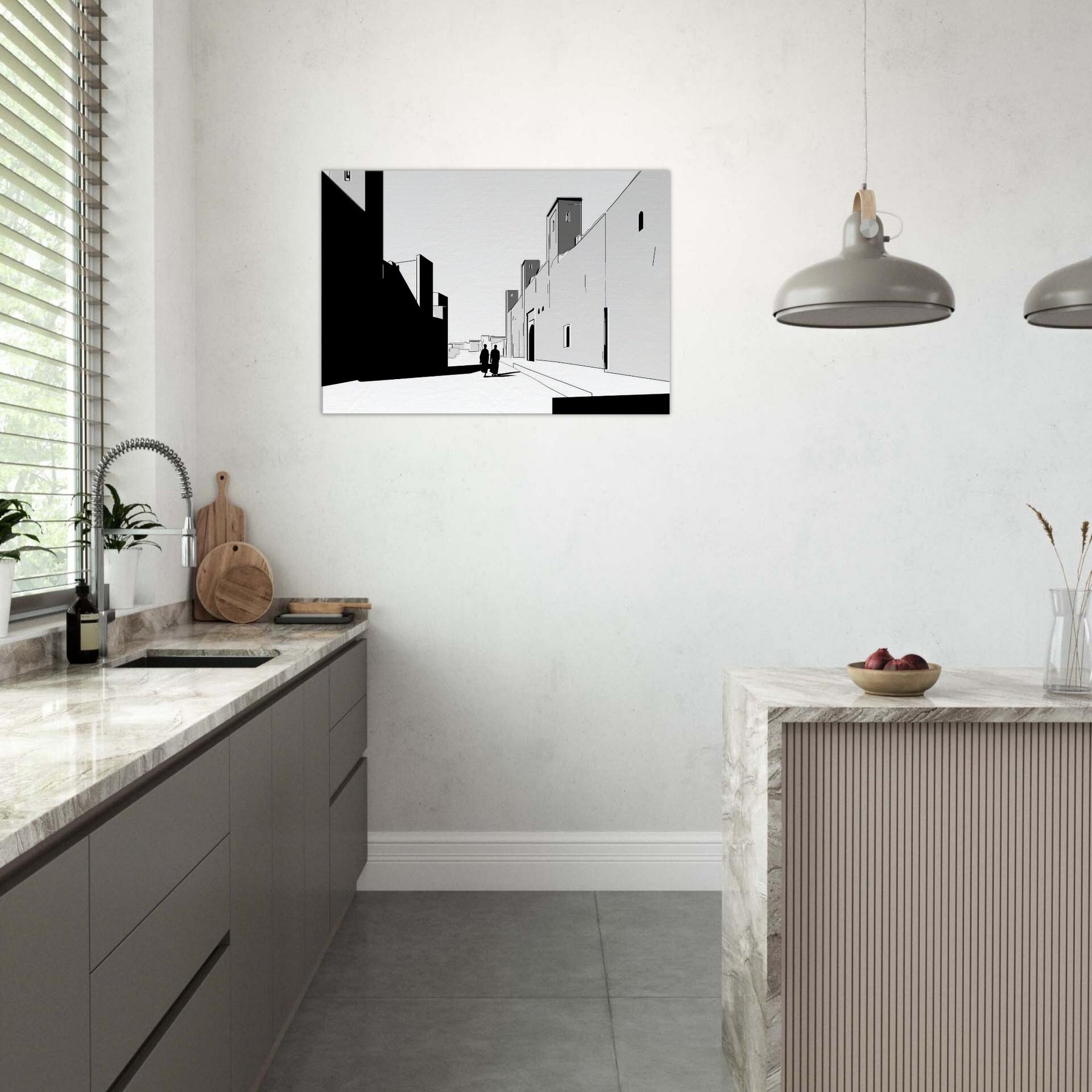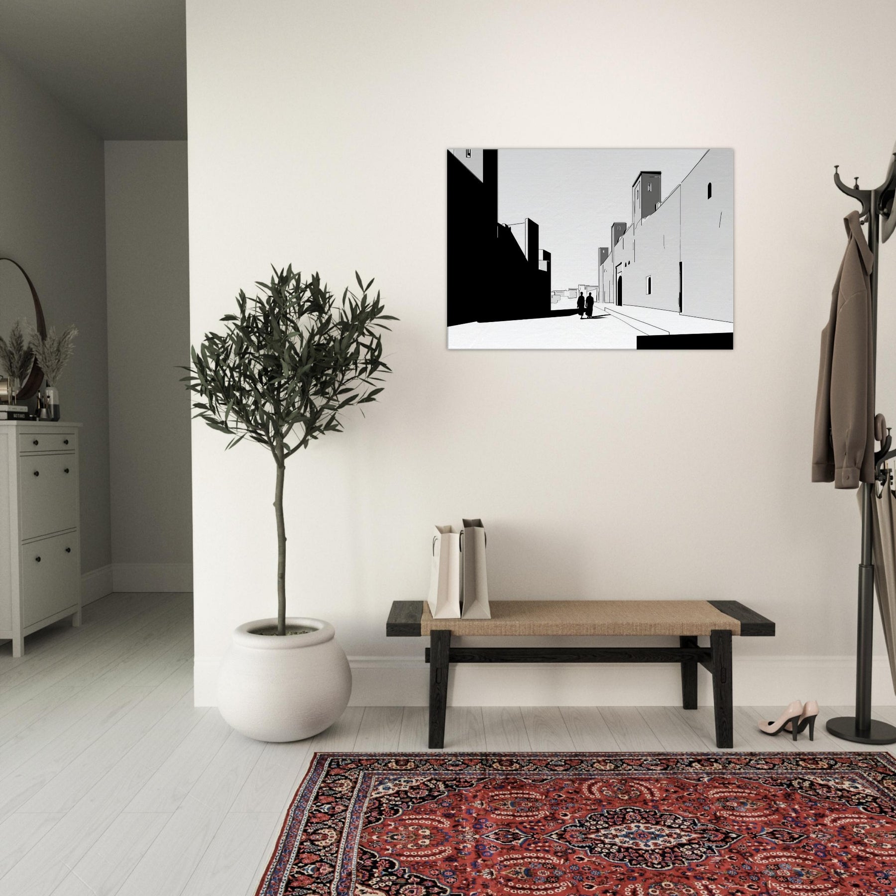 Step into Marrakech through a refined line art vision. This depiction of sunlit walls, arched doorways, and narrow lanes balances stark black and pale white to create a tranquil, gallery like atmosphere. The bold simplicity invites calm focus, turning a living room into a contemplative courtyard. Elegant silhouettes stroll along the street, reminding you of wandering markets and warm afternoons. With its timeless, architectural rhythm, Marrakech becomes a daily meditation every glance reveals new geometry and light, elevating your space with quiet sophistication and memorable charm.