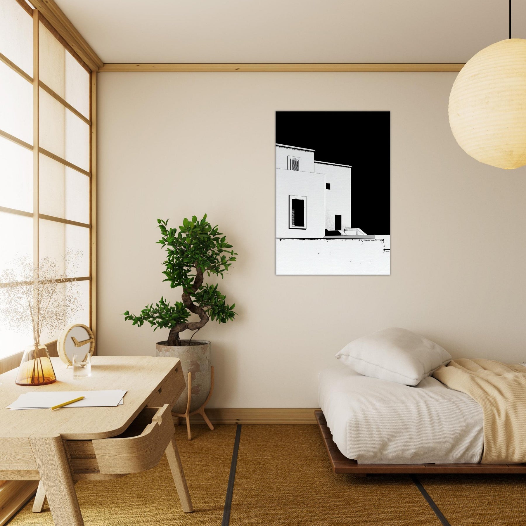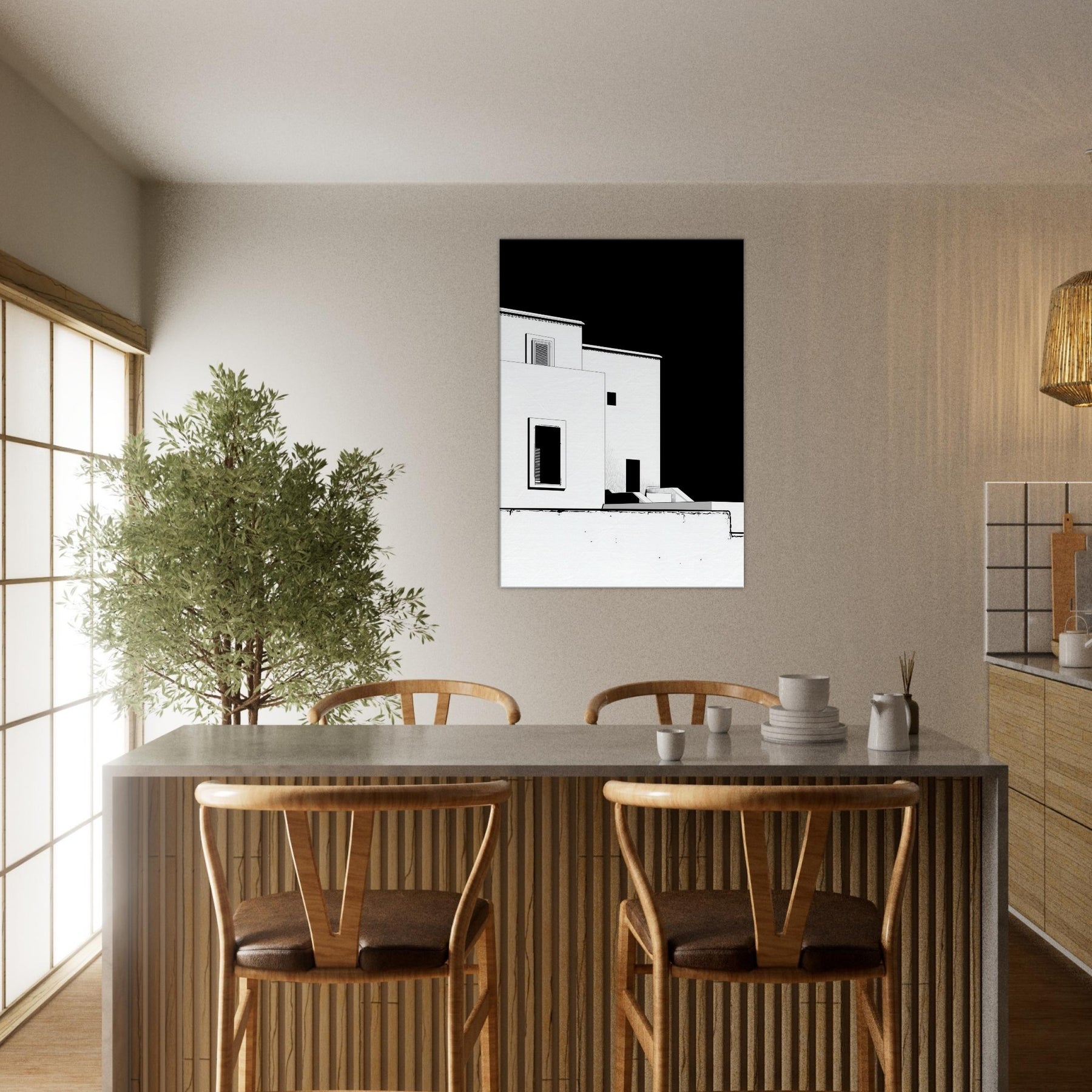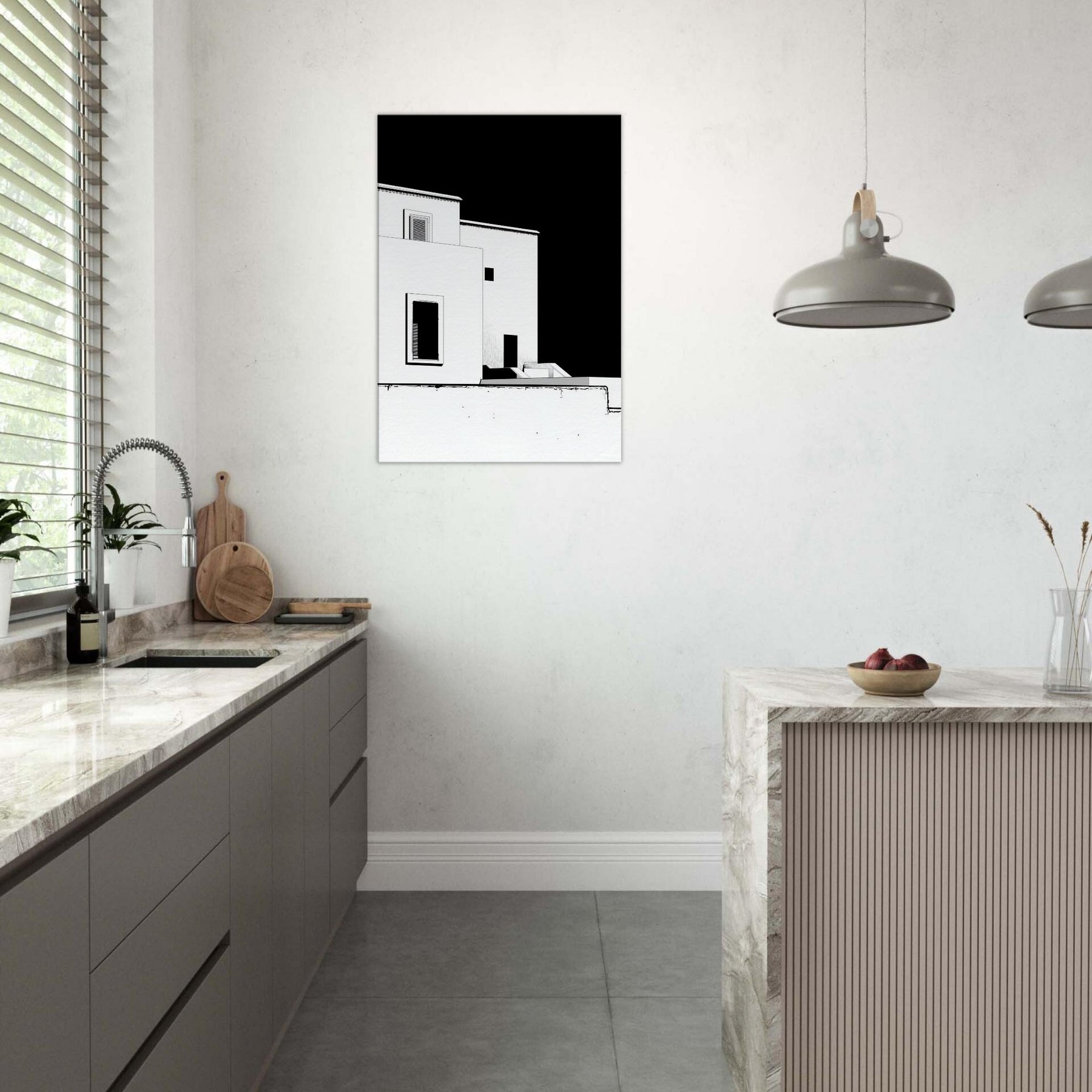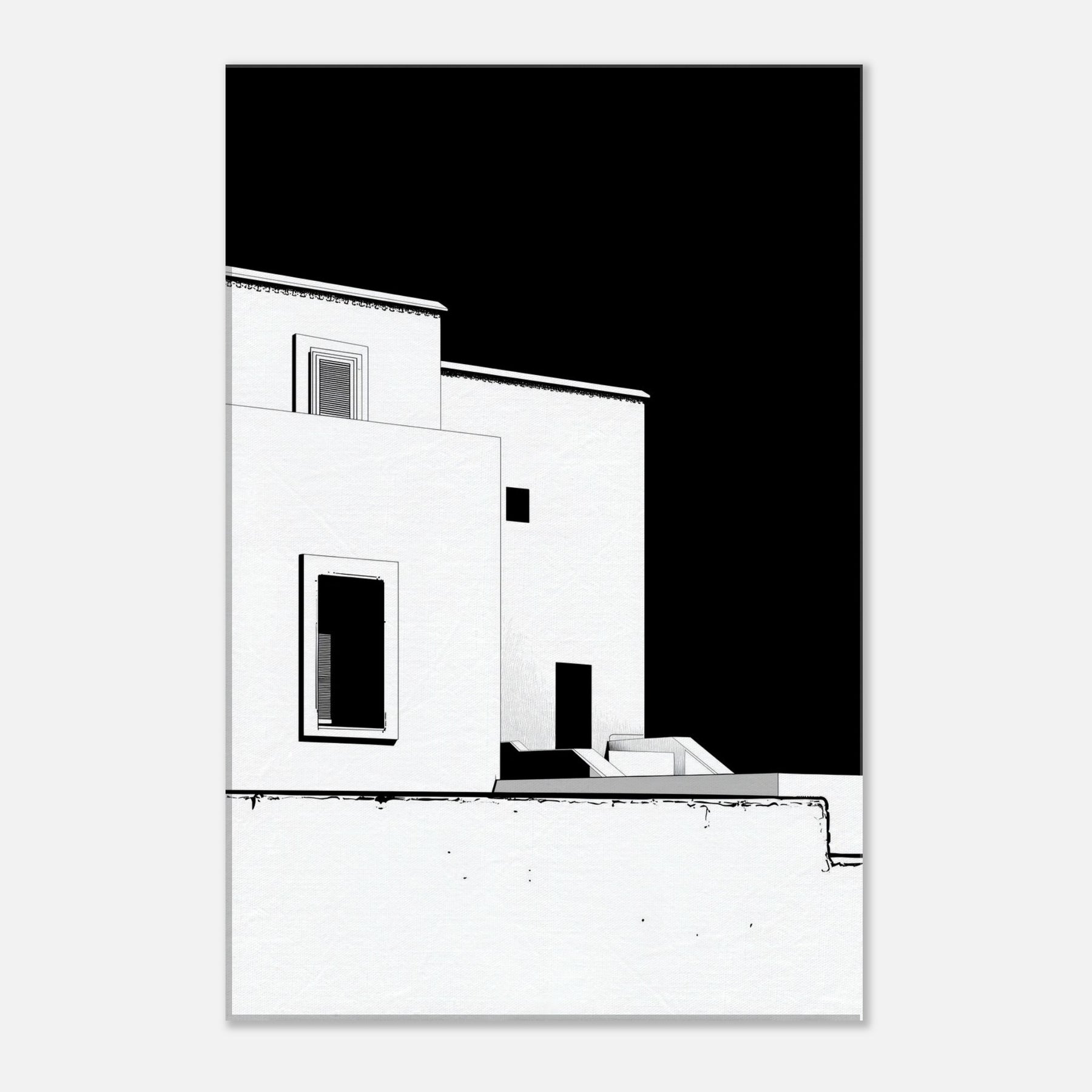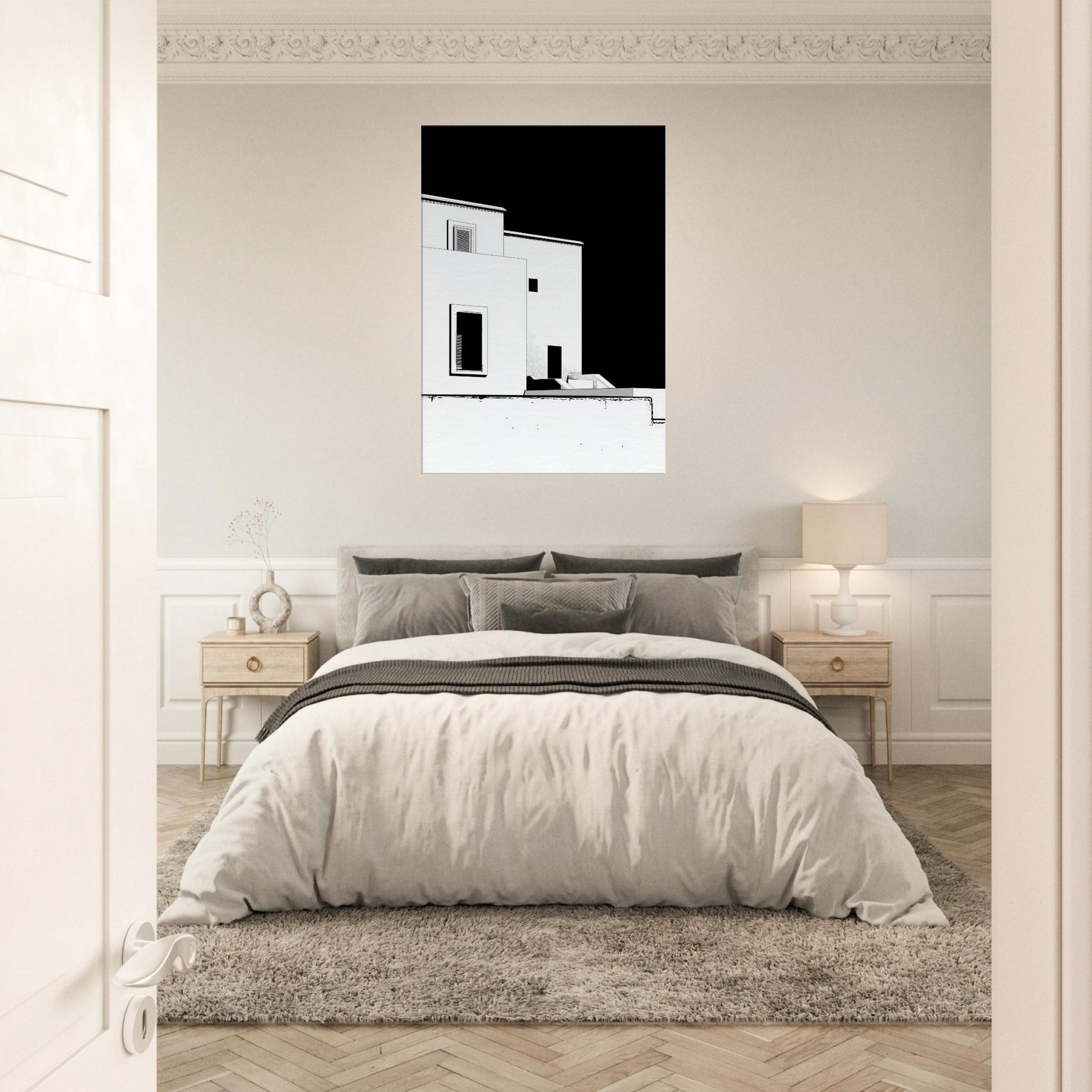 An elegant whisper of Marrakech unfolds in crisp black and white line art. The architecture loosens into fluid, geometric shapes, capturing sun soaked courtyards, pale facades, and narrow shadows that linger along its edges. This piece invites a calm, sculptural energy into your living space perfect for a living room or hallway. It pairs with warm woods or cool neutrals, making the room feel breezy yet grounded, as if a rooftop breeze carries the scent of citrus and distant markets into your home.