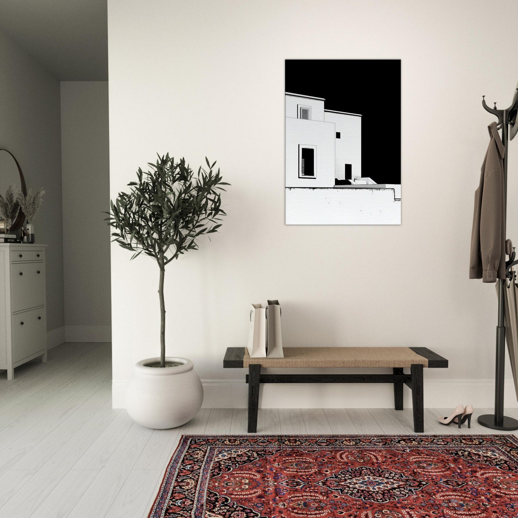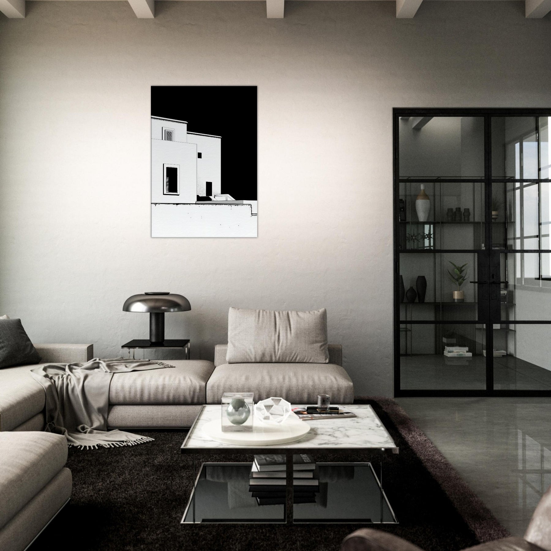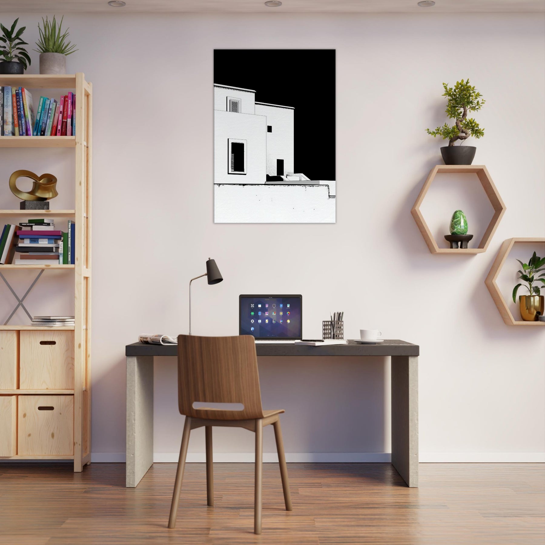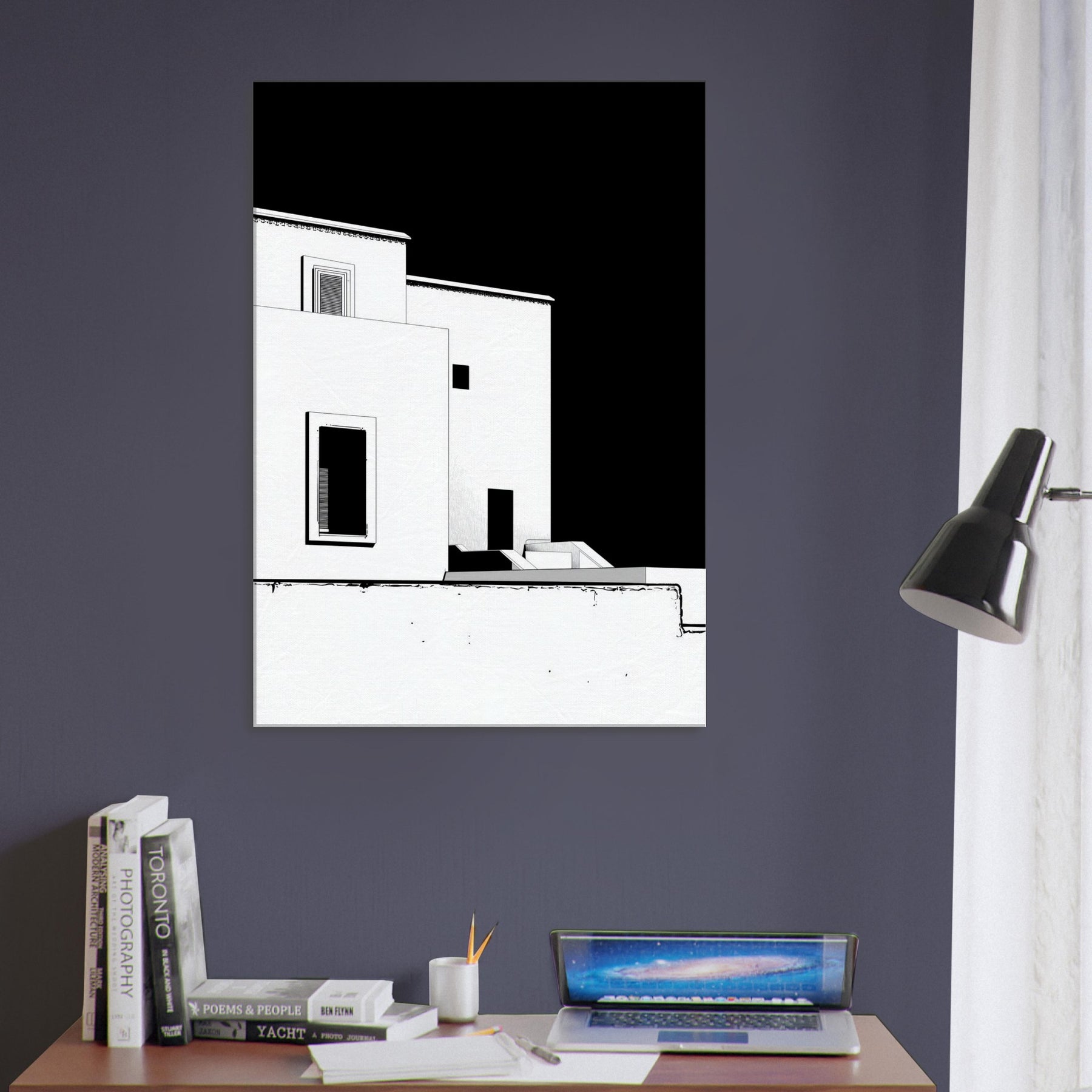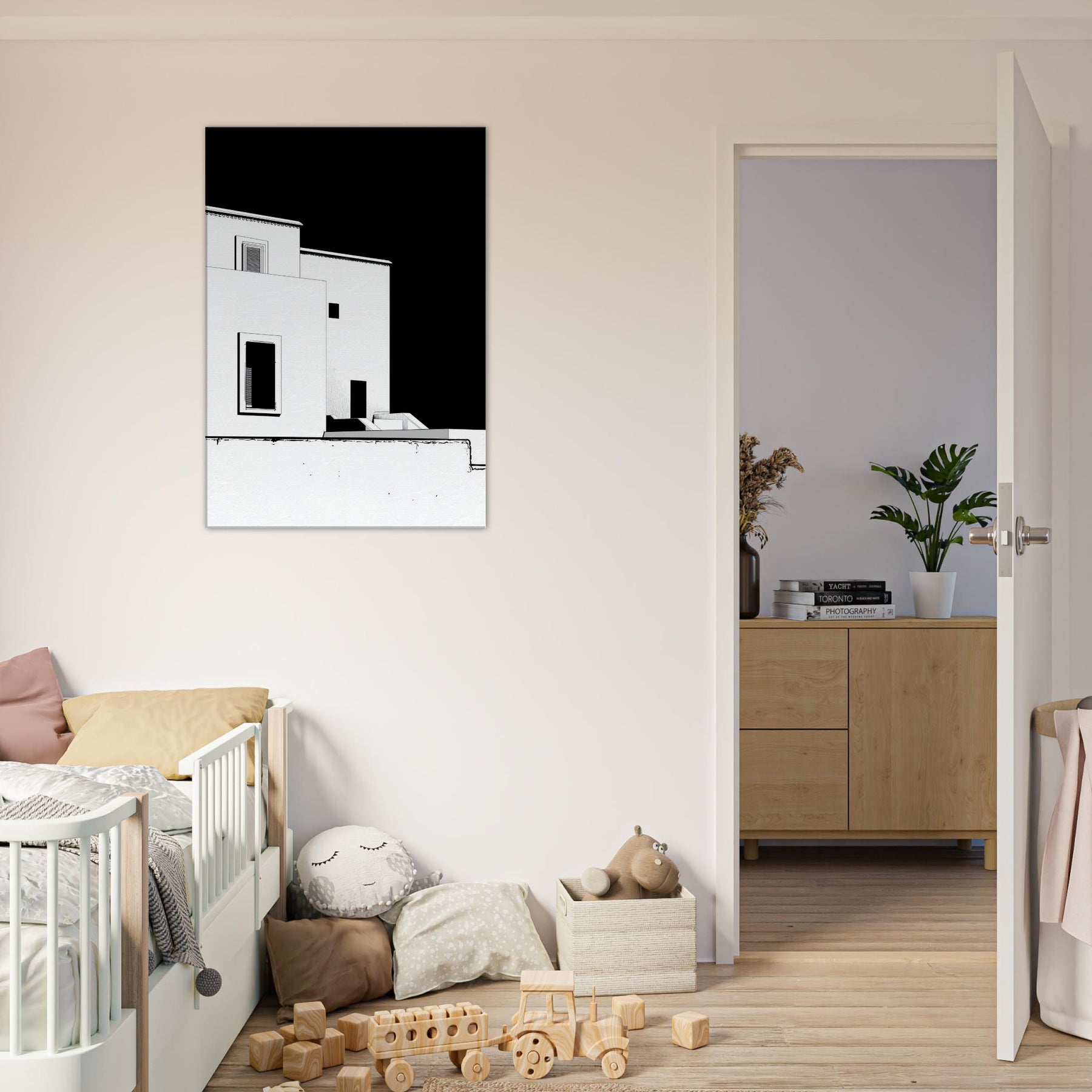 An elegant whisper of Marrakech unfolds in crisp black and white line art. The architecture loosens into fluid, geometric shapes, capturing sun soaked courtyards, pale facades, and narrow shadows that linger along its edges. This piece invites a calm, sculptural energy into your living space perfect for a living room or hallway. It pairs with warm woods or cool neutrals, making the room feel breezy yet grounded, as if a rooftop breeze carries the scent of citrus and distant markets into your home.