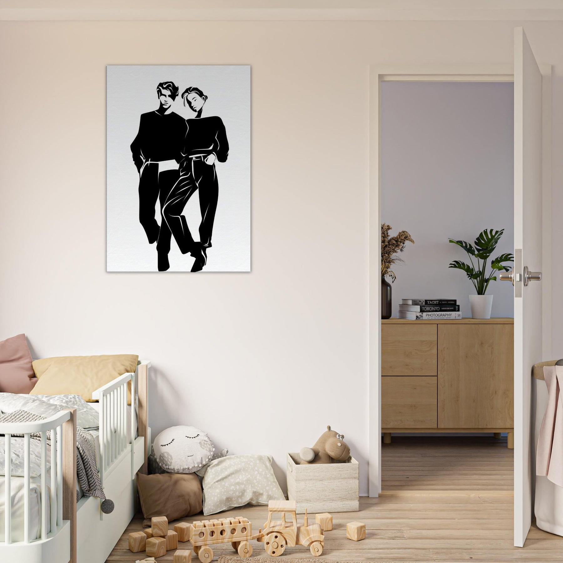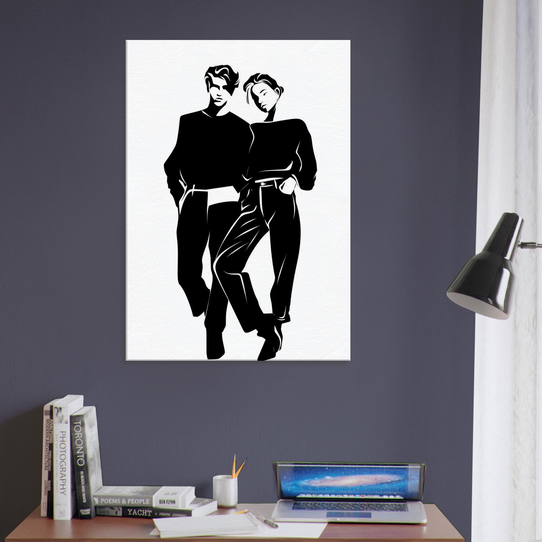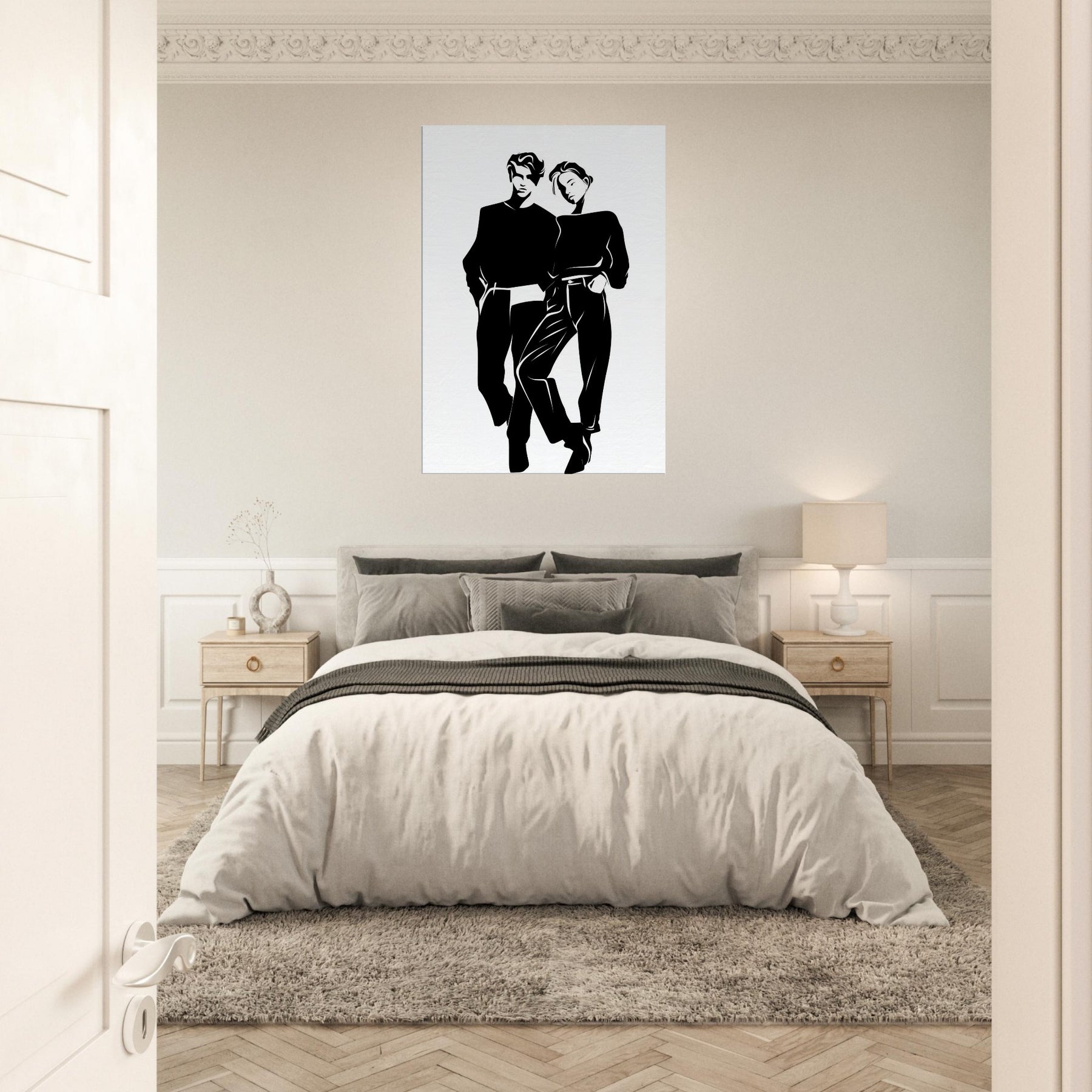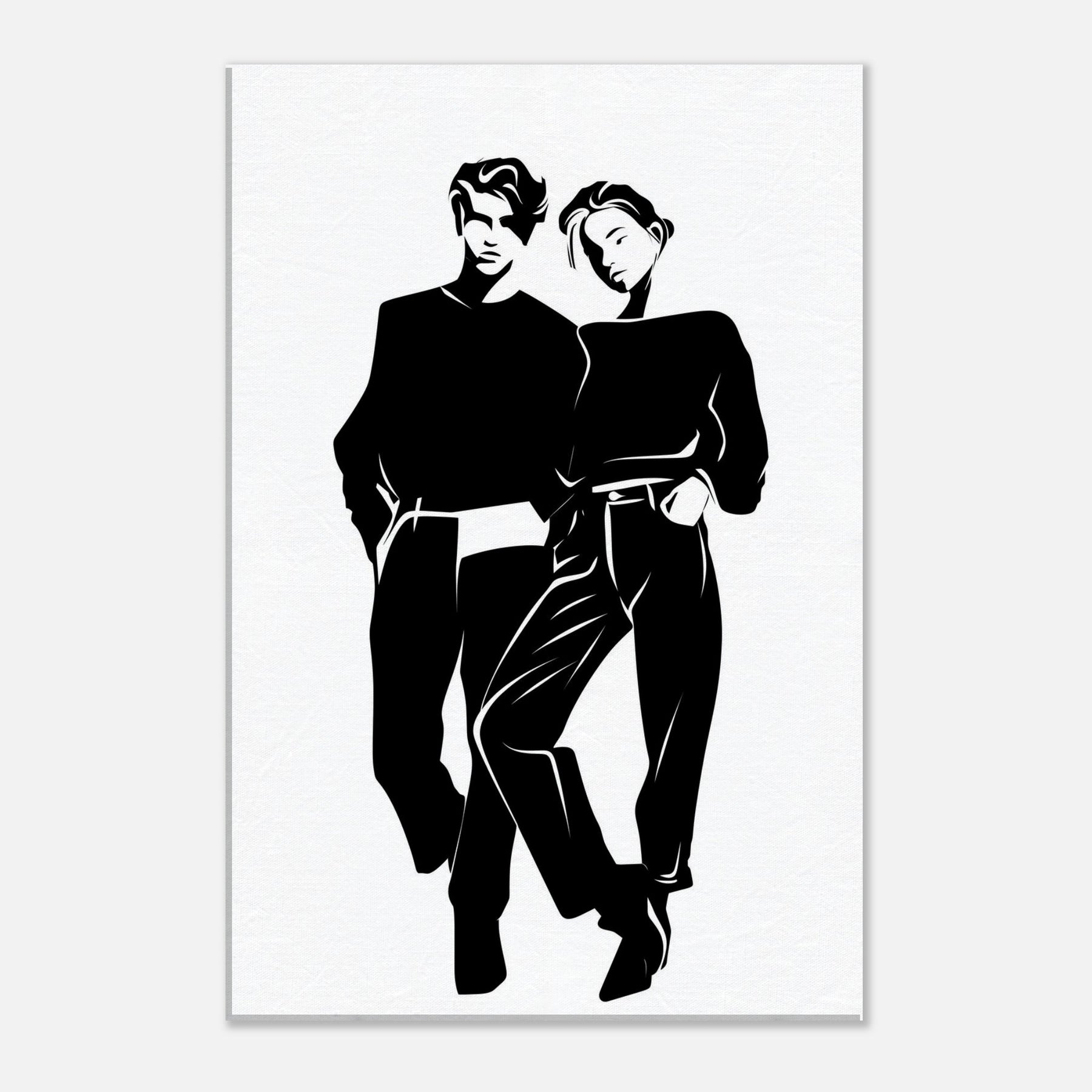 Couple Silhouette unfolds in stark, confident lines that invite quiet reflection. This line art couple captures private ease and shared gravity, a study in balance as their bodies lean into one another. Printed in bold black on white, the piece brings a chic, gallery like presence to any living space, guiding light and mood with simplicity. Perfect above a sofa or in a hallway, it pairs effortlessly with textures, metals, and softer textiles to toast modern connection.