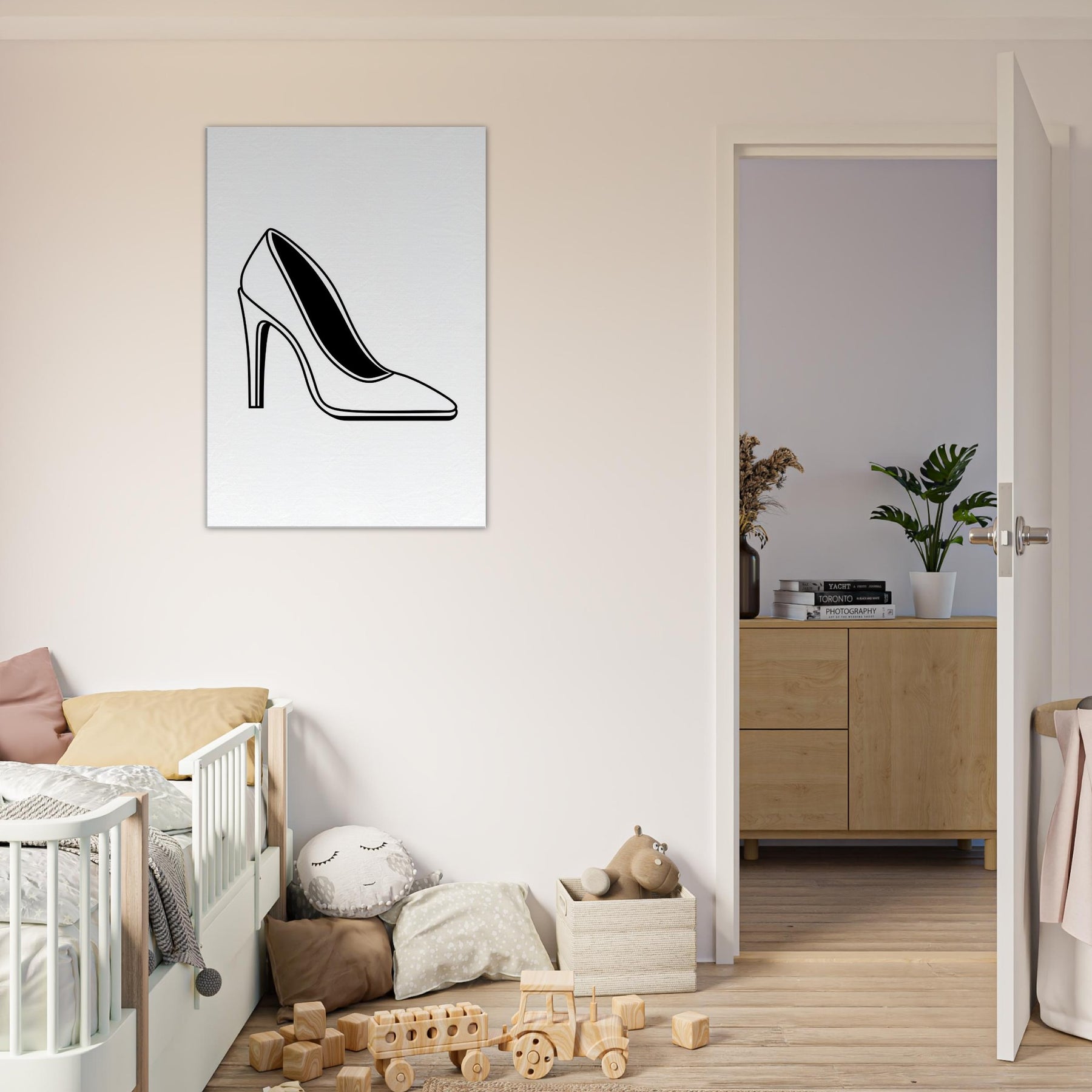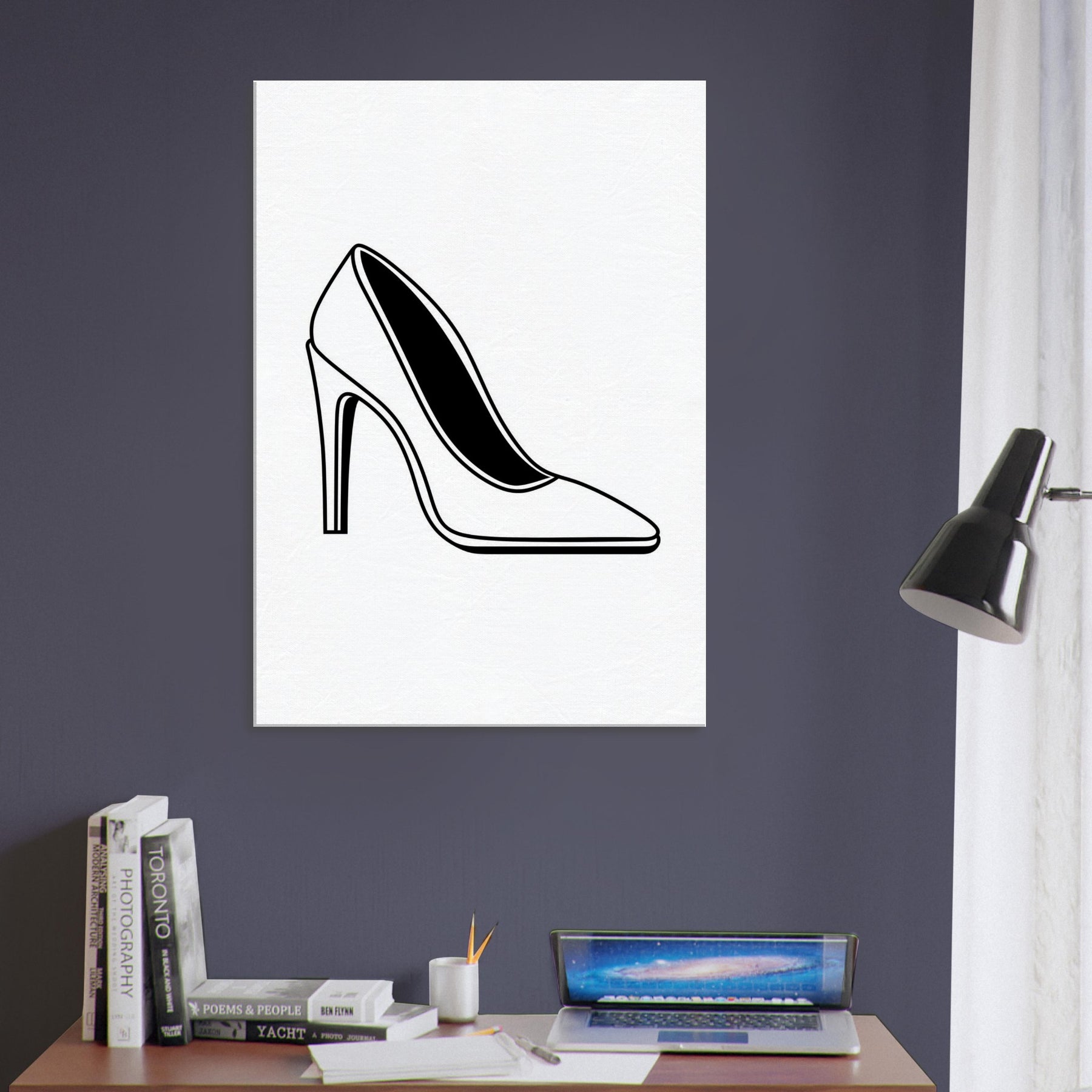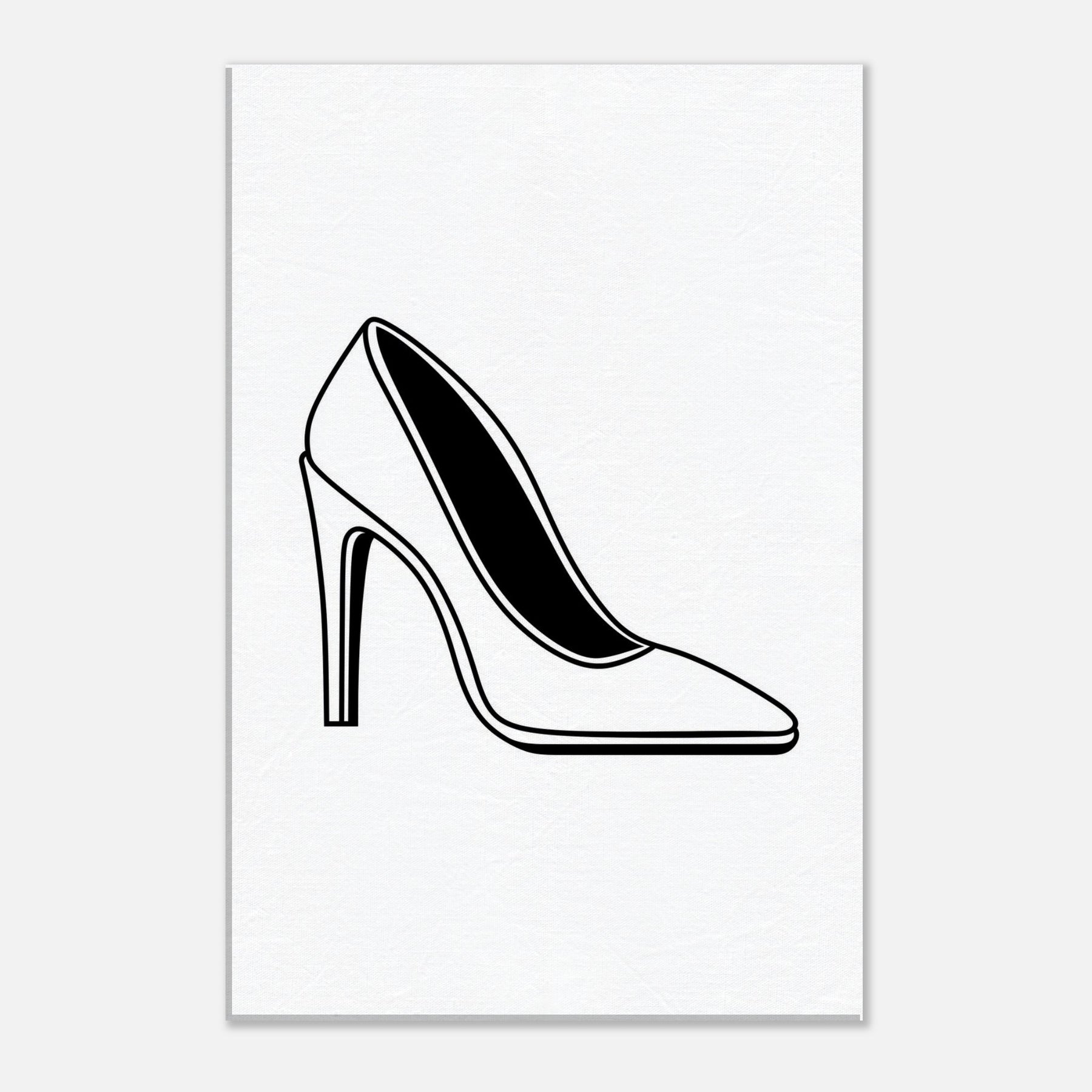 With a single, confident line, this high heel becomes a quiet manifesto of style. The bold black silhouette rests on a sea of white, inviting the eye to glide along its curves the taper of the arch, the lift of the heel, and the subtle inner shadow that hints at hidden stories. In a living room or hallway, this line art elevates the atmosphere: refined, modern, and effortless to pair with chrome, wood, or textiles. A wearable moment translated into wall art.