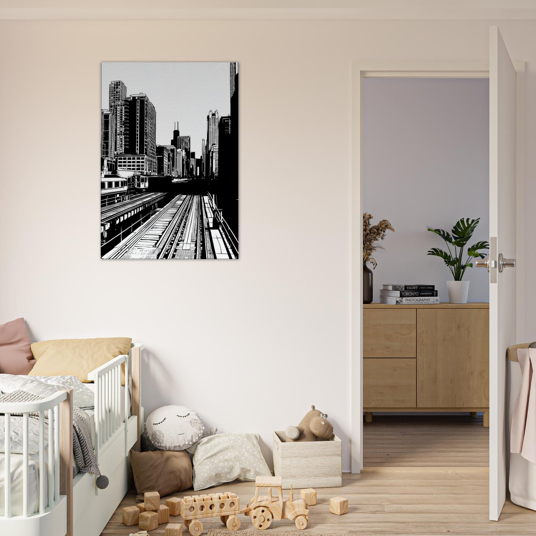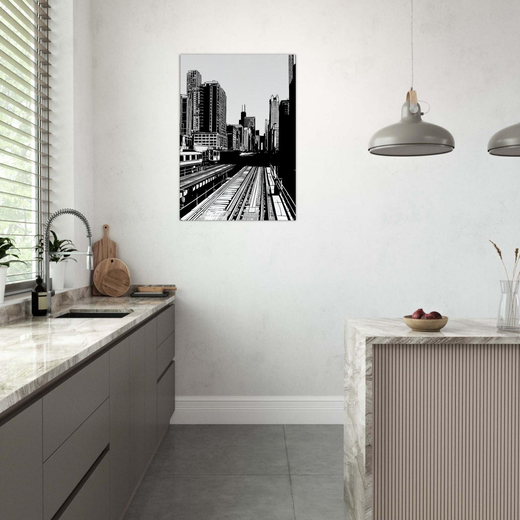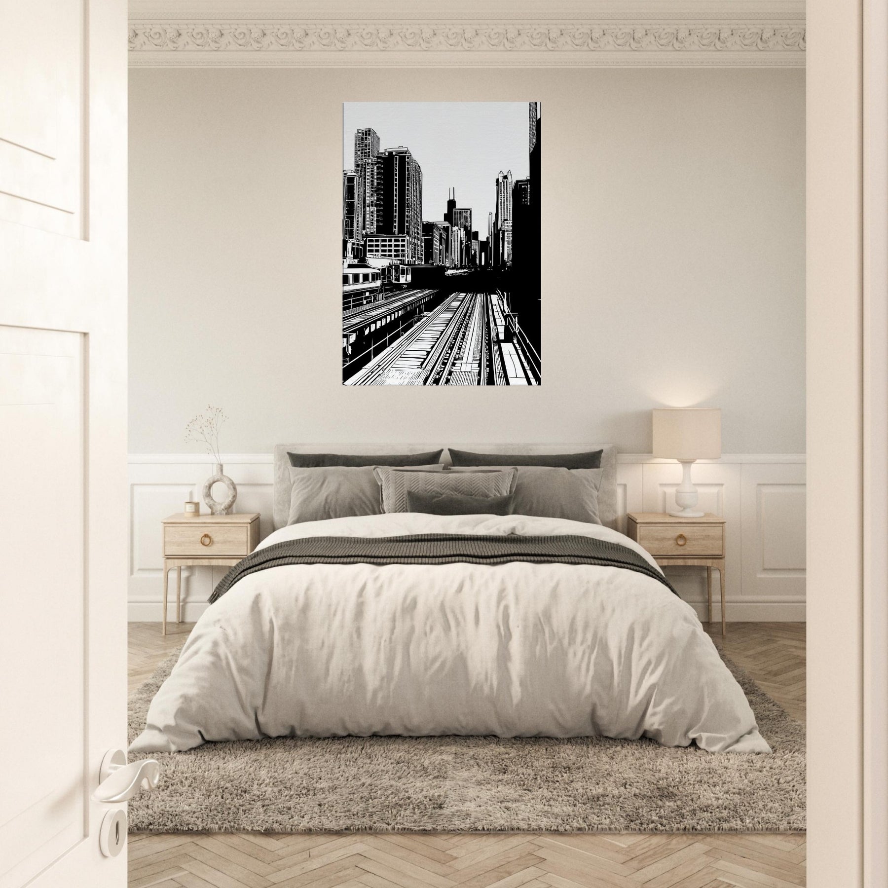 Chicago rises in bold, precise lines a city distilled to rhythm, light, and form. The stark contrast of black on white awakens each corner of a room, while the open negative spaces invite quiet moments of breath. This piece brings the pulse of an urban morning into your living space, offering clarity, balance, and a breeze of sophistication. Perfect above a sofa, it anchors conversations and adds timeless architectural elegance to any room.