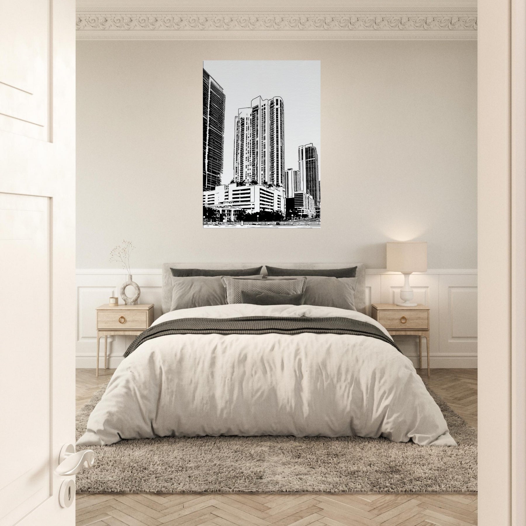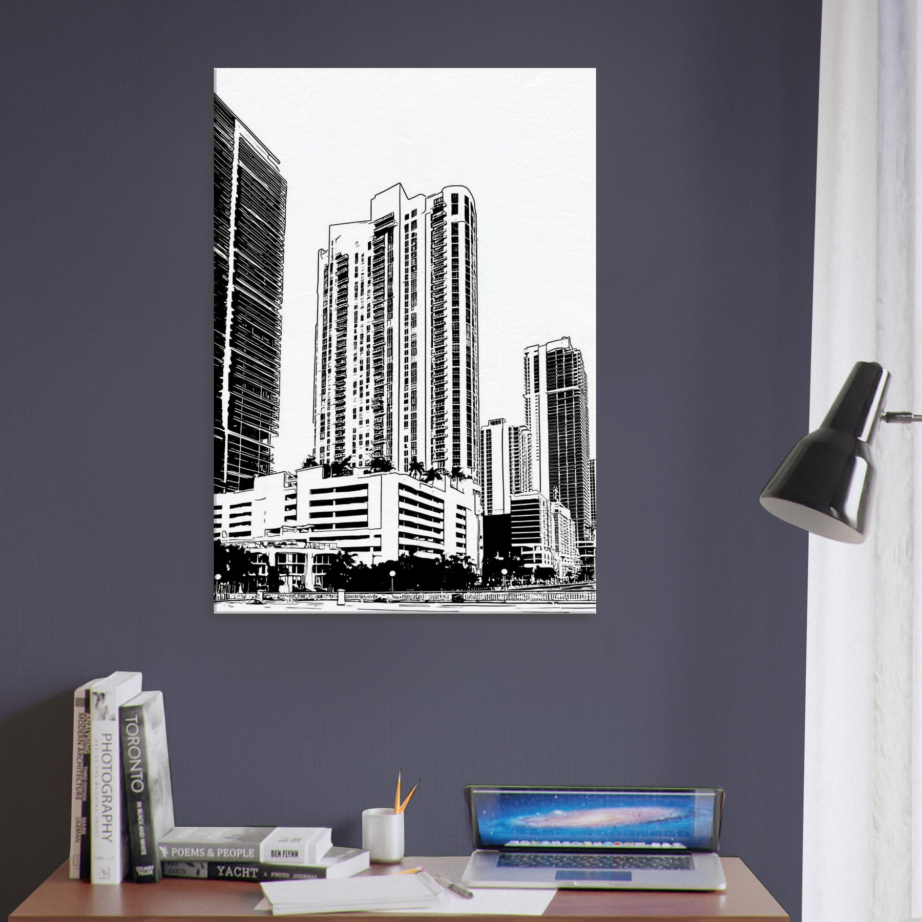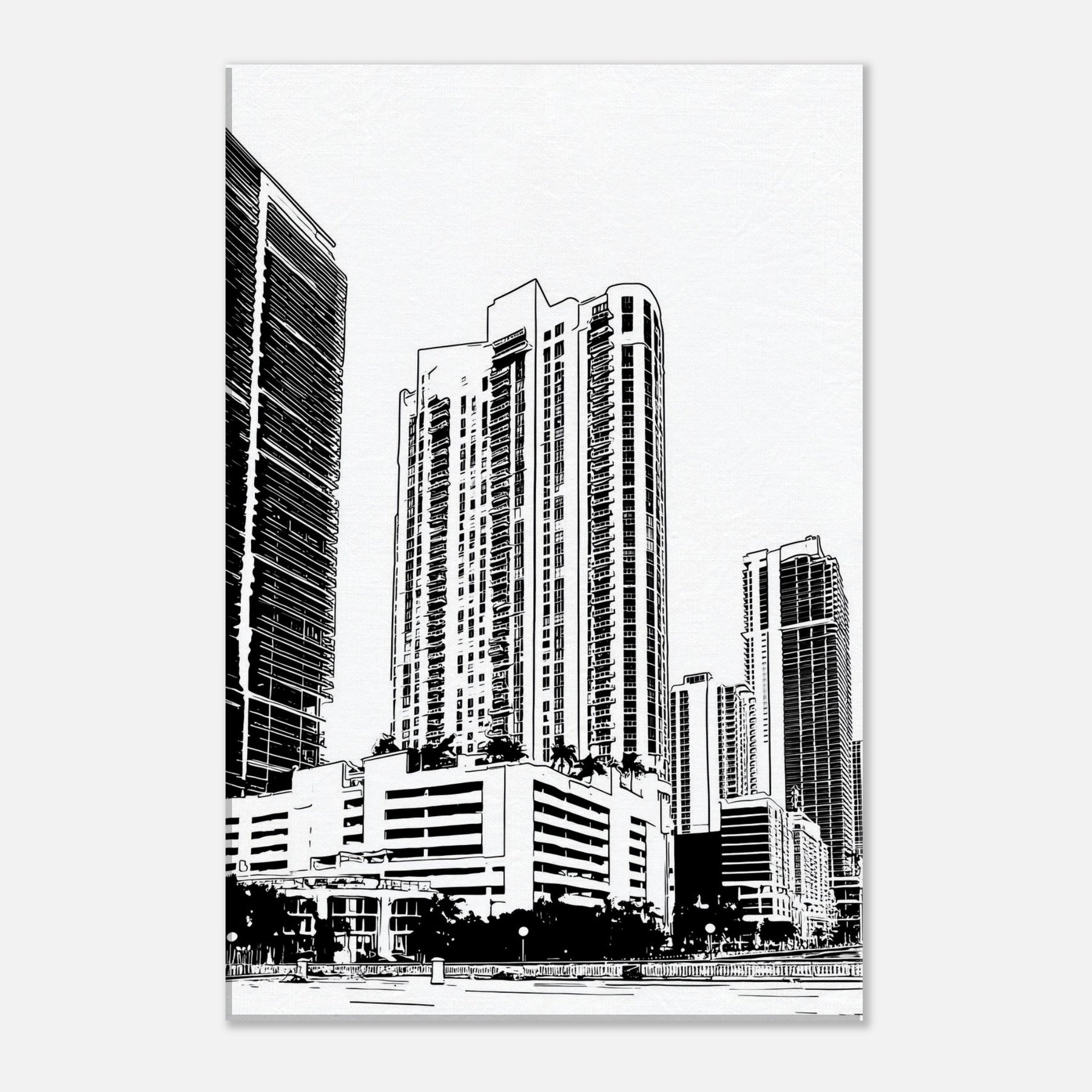 A bold monochrome tribute to Miami, captured in clean line art that breathes quiet sophistication into any room. The skyline ascends with architectural rhythm, where sea breeze and neon nights braid into graceful arcs of light and shadow. This piece brings balance to a lounge or study, inviting everyday contemplation as the eye follows slender towers upward. In its restraint, it offers a sense of pace and clarity, turning walls into a quiet, modern promenade.