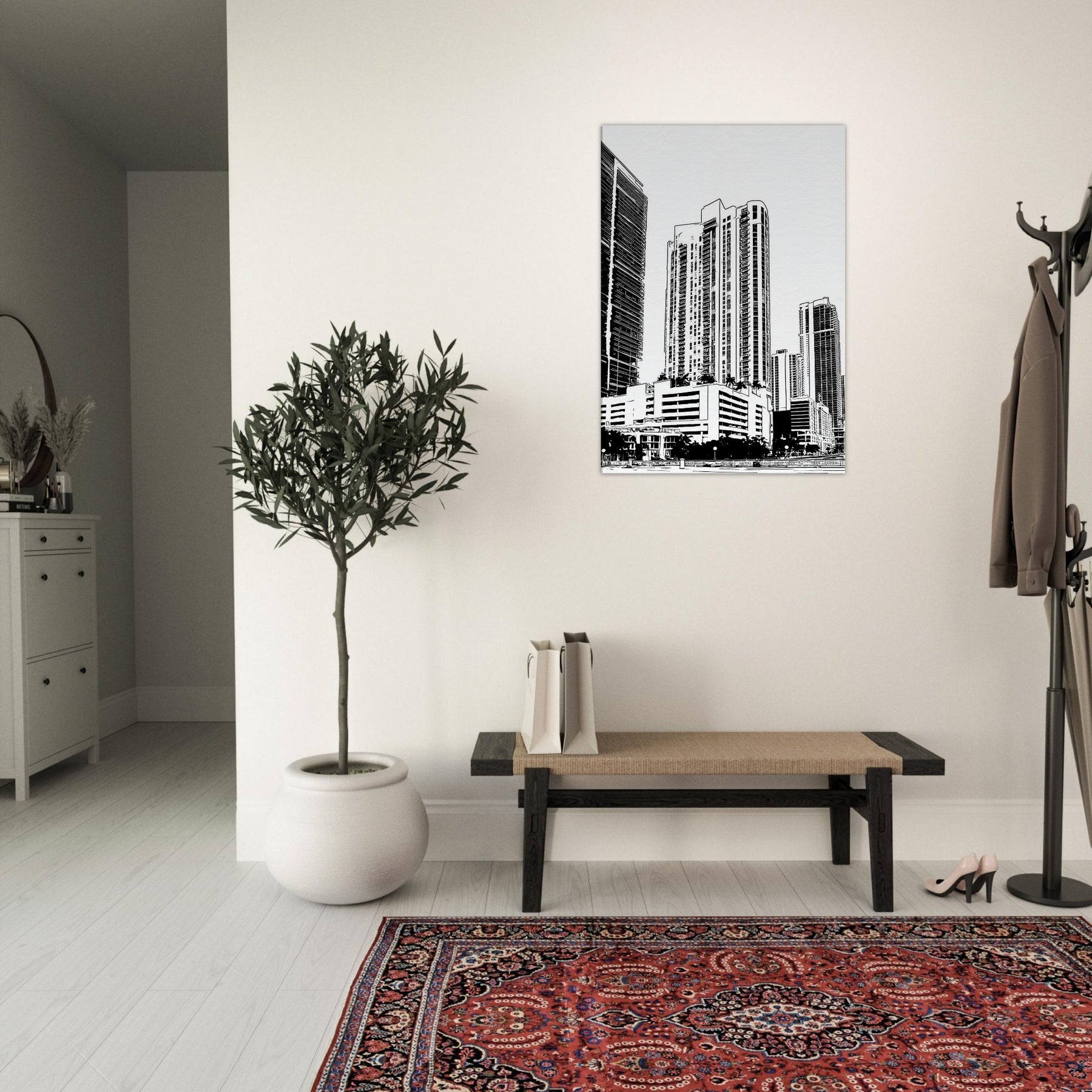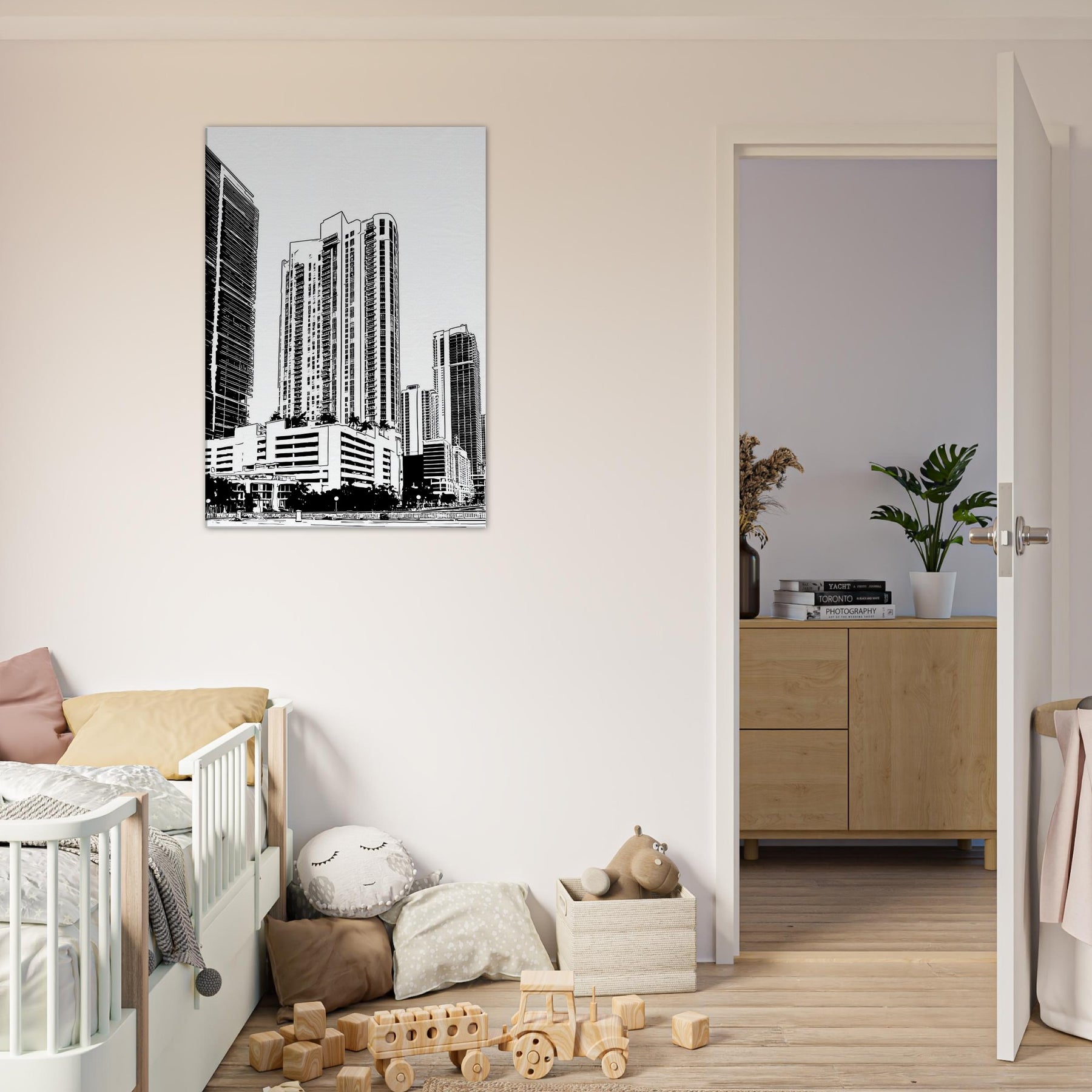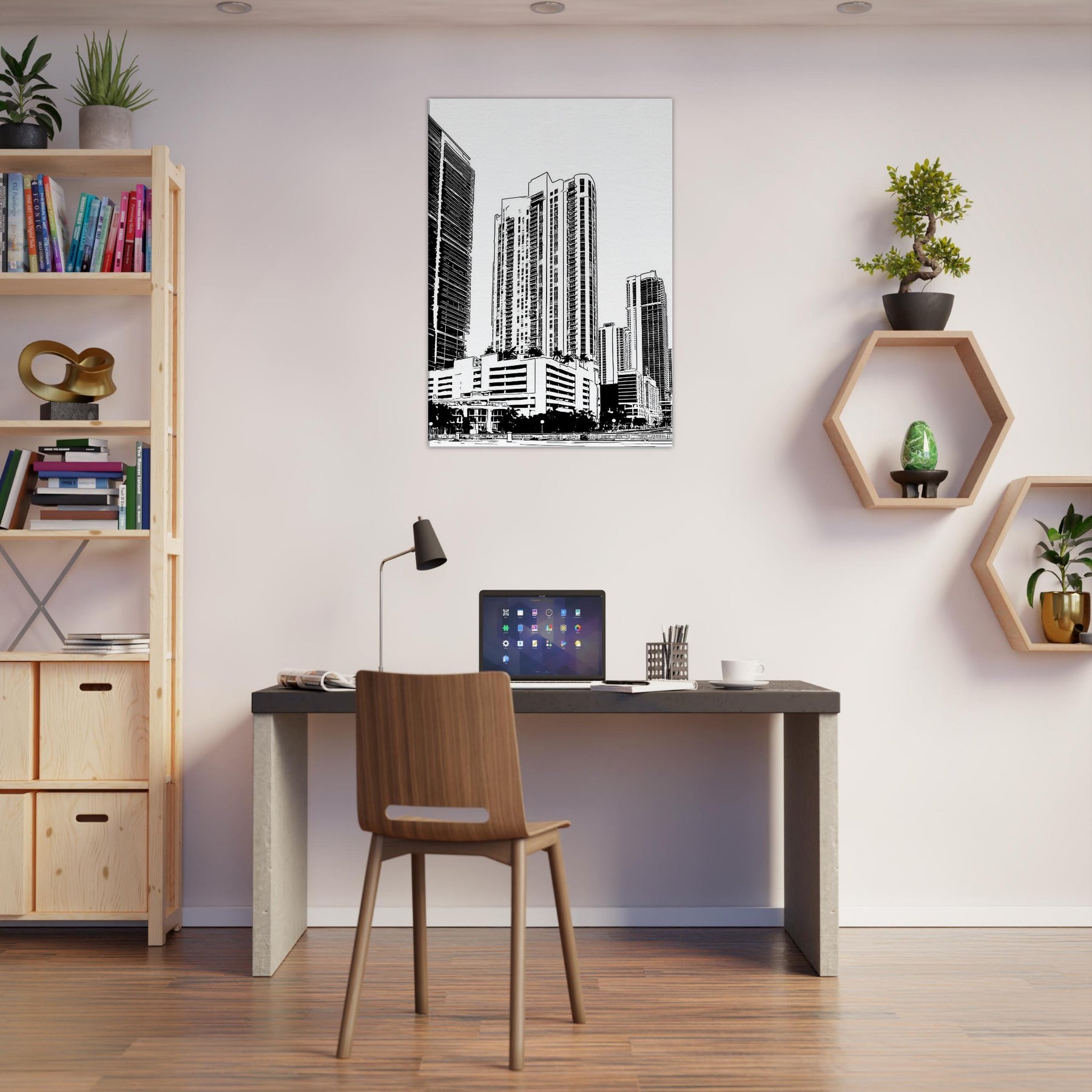 A bold monochrome tribute to Miami, captured in clean line art that breathes quiet sophistication into any room. The skyline ascends with architectural rhythm, where sea breeze and neon nights braid into graceful arcs of light and shadow. This piece brings balance to a lounge or study, inviting everyday contemplation as the eye follows slender towers upward. In its restraint, it offers a sense of pace and clarity, turning walls into a quiet, modern promenade.