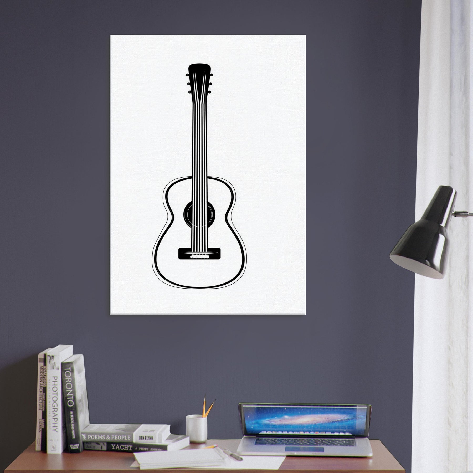 An elegant silhouette of a guitar rises in clean black ink, its strings distilled to precise, rhythmic lines. This line art piece breathes quiet energy into a room, inviting the gaze to travel along curves that hint at melodies beneath the surface. In a living space, it becomes a breath of tempo soothing, modern, and timeless. The stark black on white contrast sharpens the atmosphere while preserving calm. Place it where light caresses the walls and let the guitar's presence echo through conversations and quiet evenings alike.