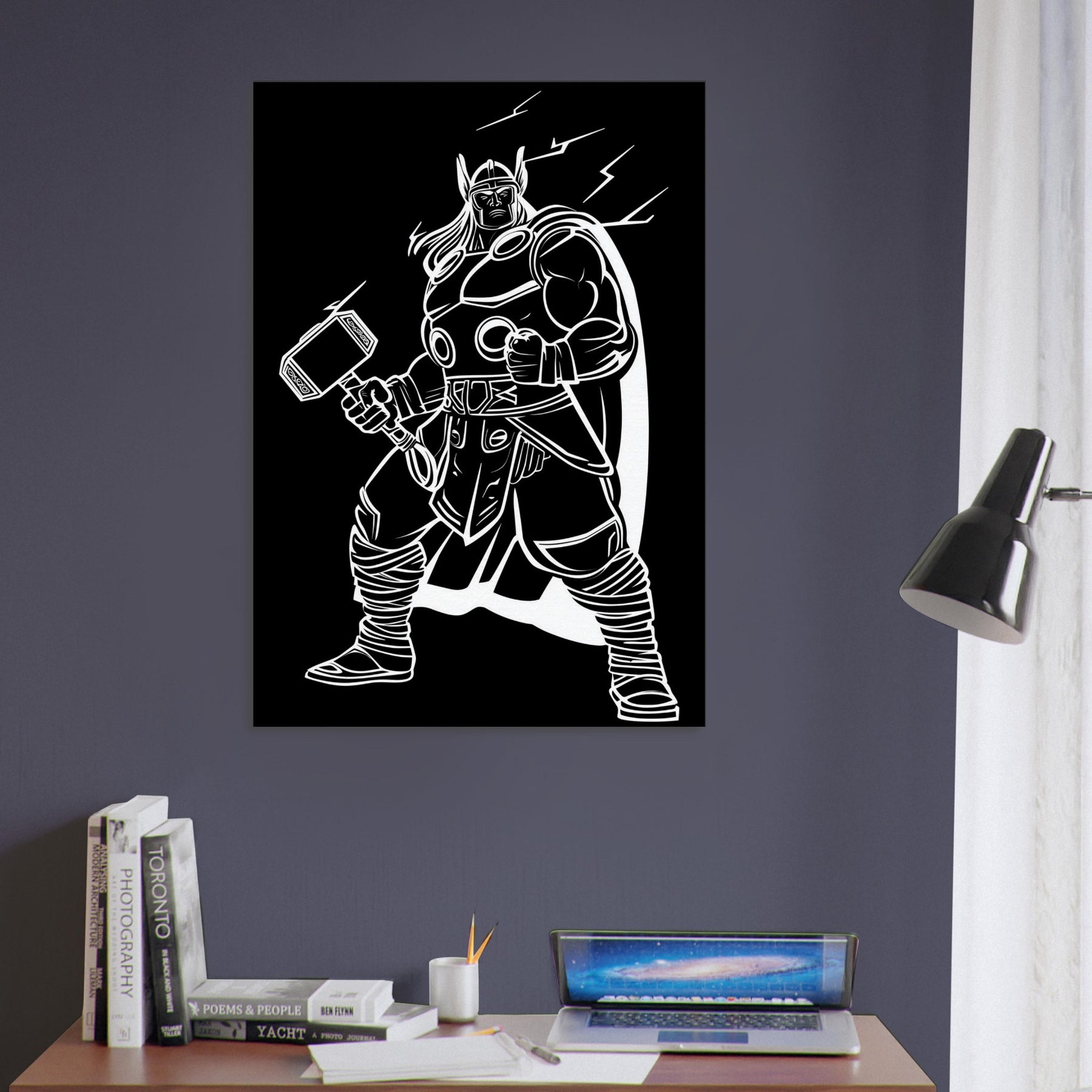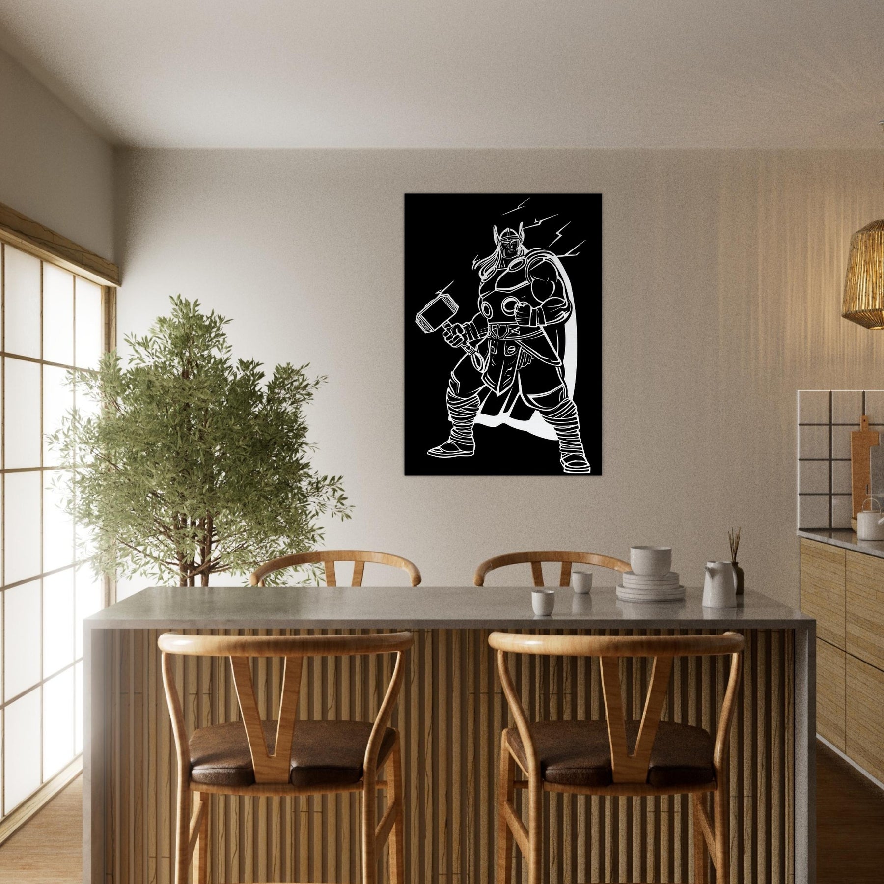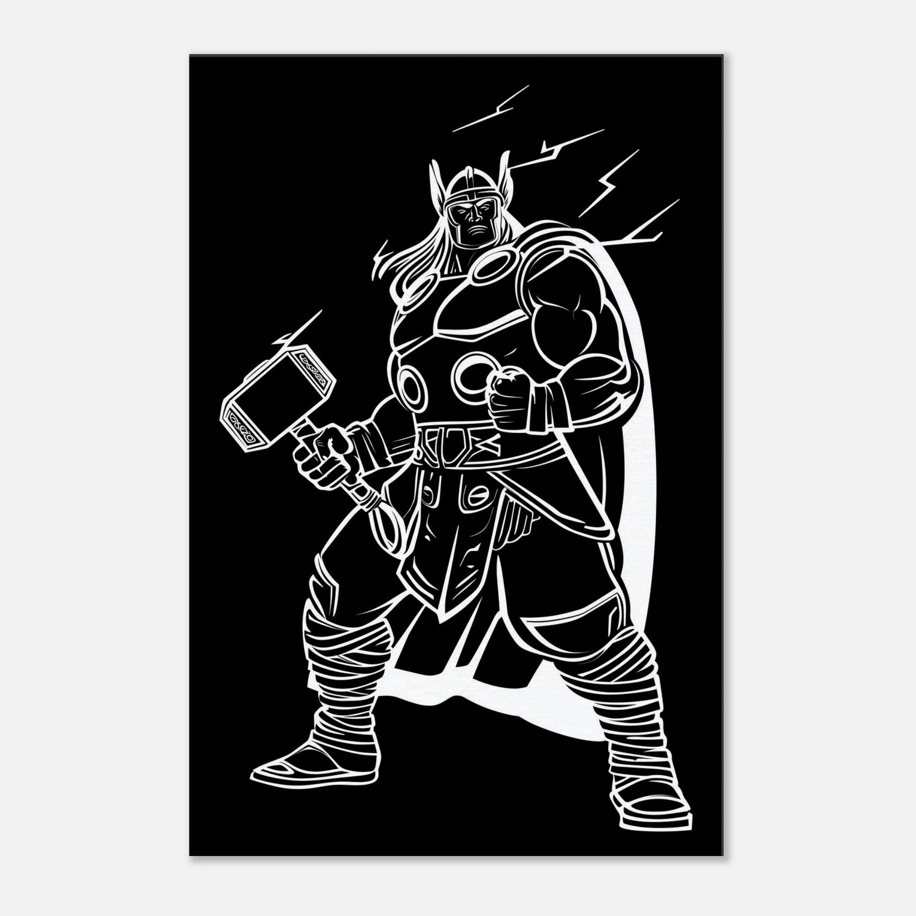 Experience the awe of Thor, God of Thunder, captured in elegant line art that breathes energy into any room. This bold, monochrome portrayal traces the god’s armored stance, Mjölnir raised, and a crackling halo of electricity that seems to hum with power. Hang it in a living room, study, or entryway to invite drama, focus, and mythic storytelling as if the thunder itself were a living companion in your space. The central subject is Thor, God of Thunder Wielding Mjölnir.