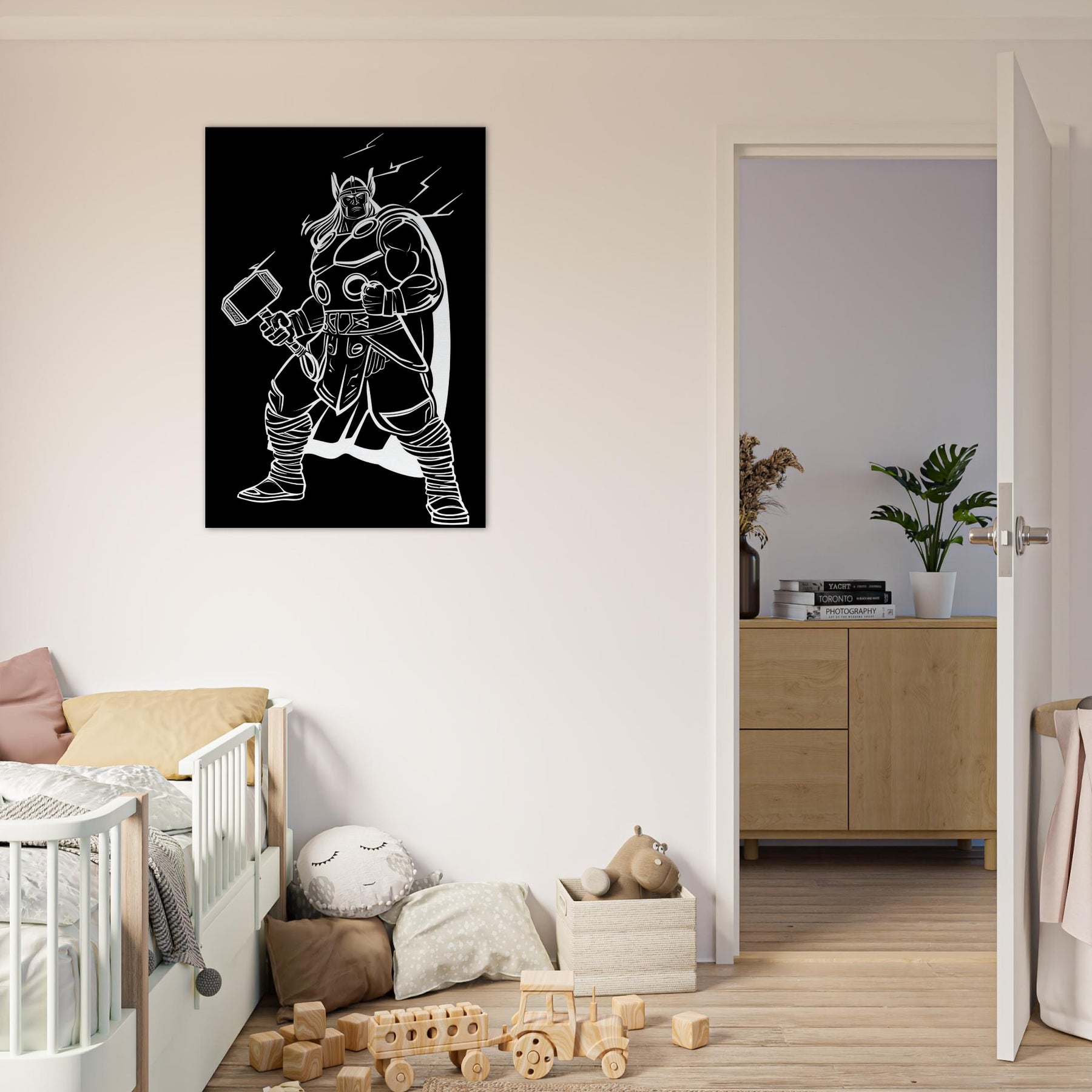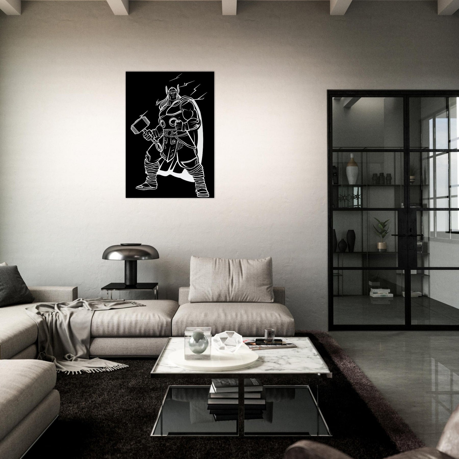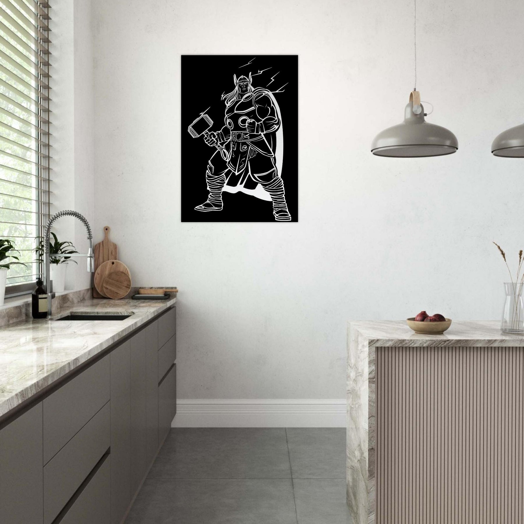 Experience the awe of Thor, God of Thunder, captured in elegant line art that breathes energy into any room. This bold, monochrome portrayal traces the god’s armored stance, Mjölnir raised, and a crackling halo of electricity that seems to hum with power. Hang it in a living room, study, or entryway to invite drama, focus, and mythic storytelling as if the thunder itself were a living companion in your space. The central subject is Thor, God of Thunder Wielding Mjölnir.