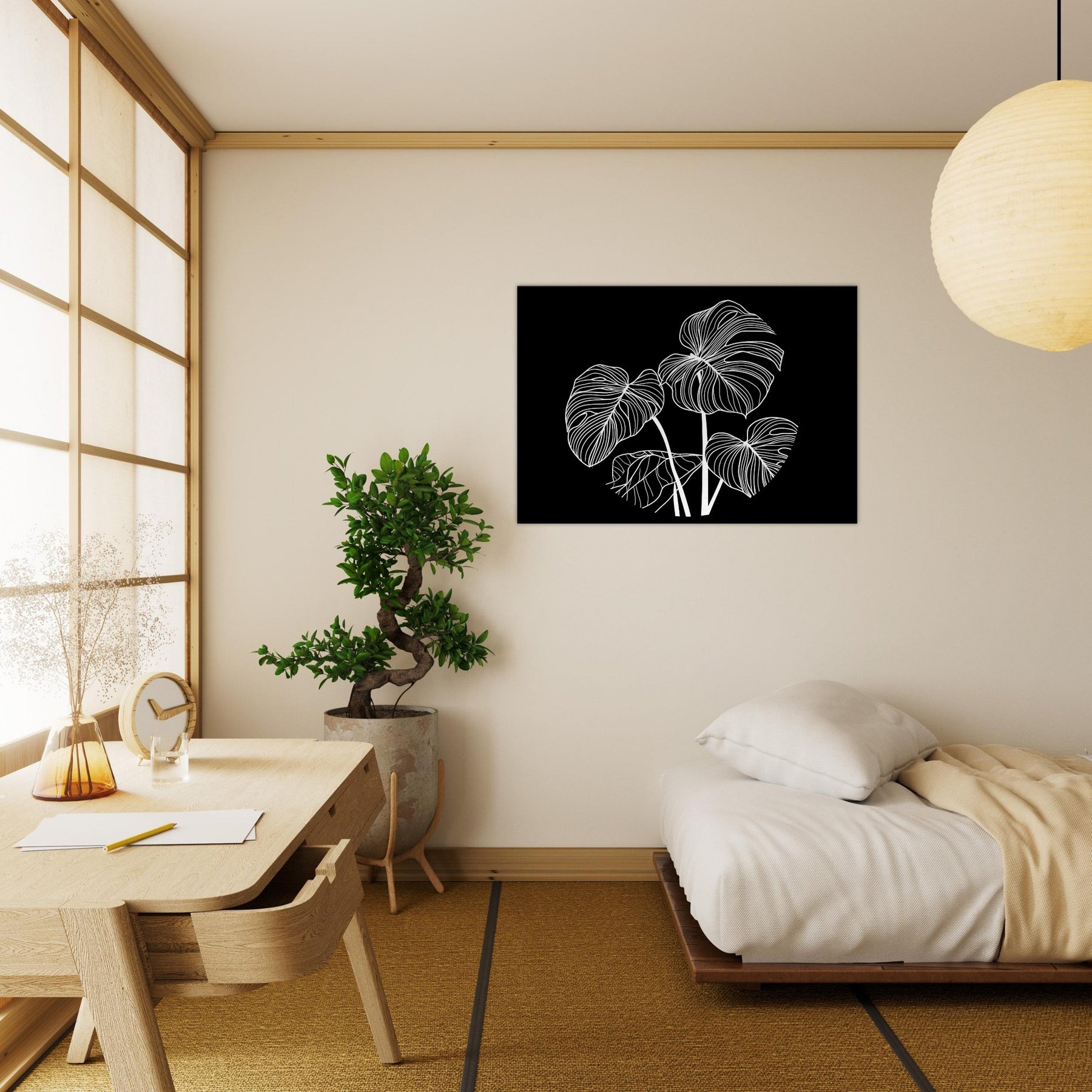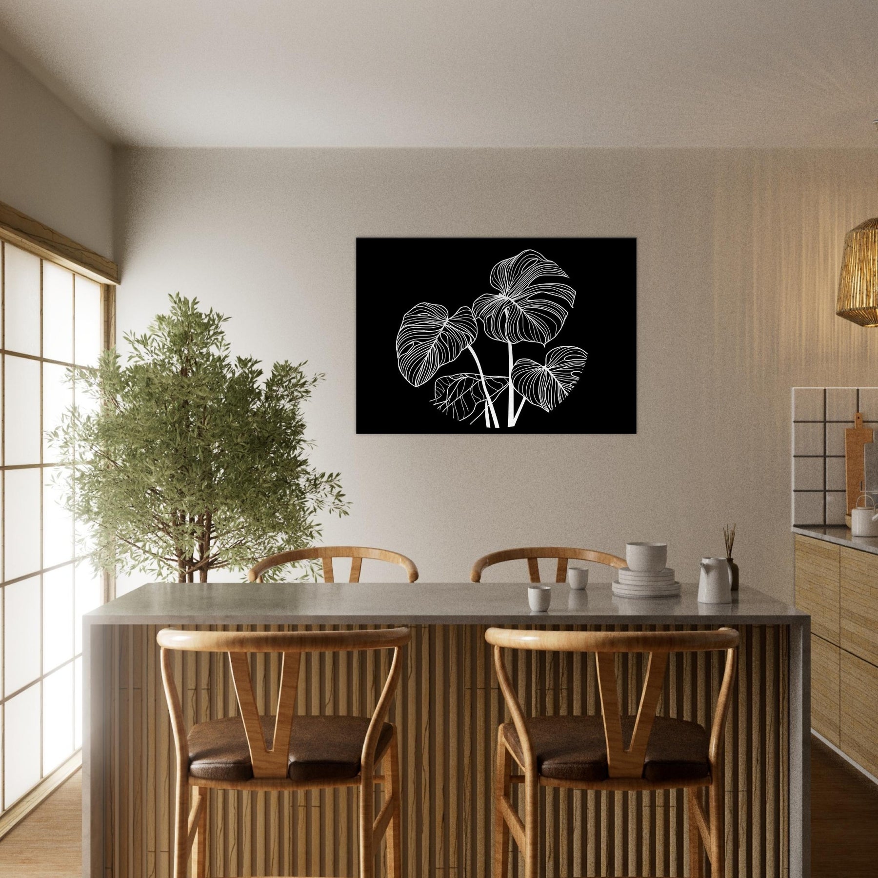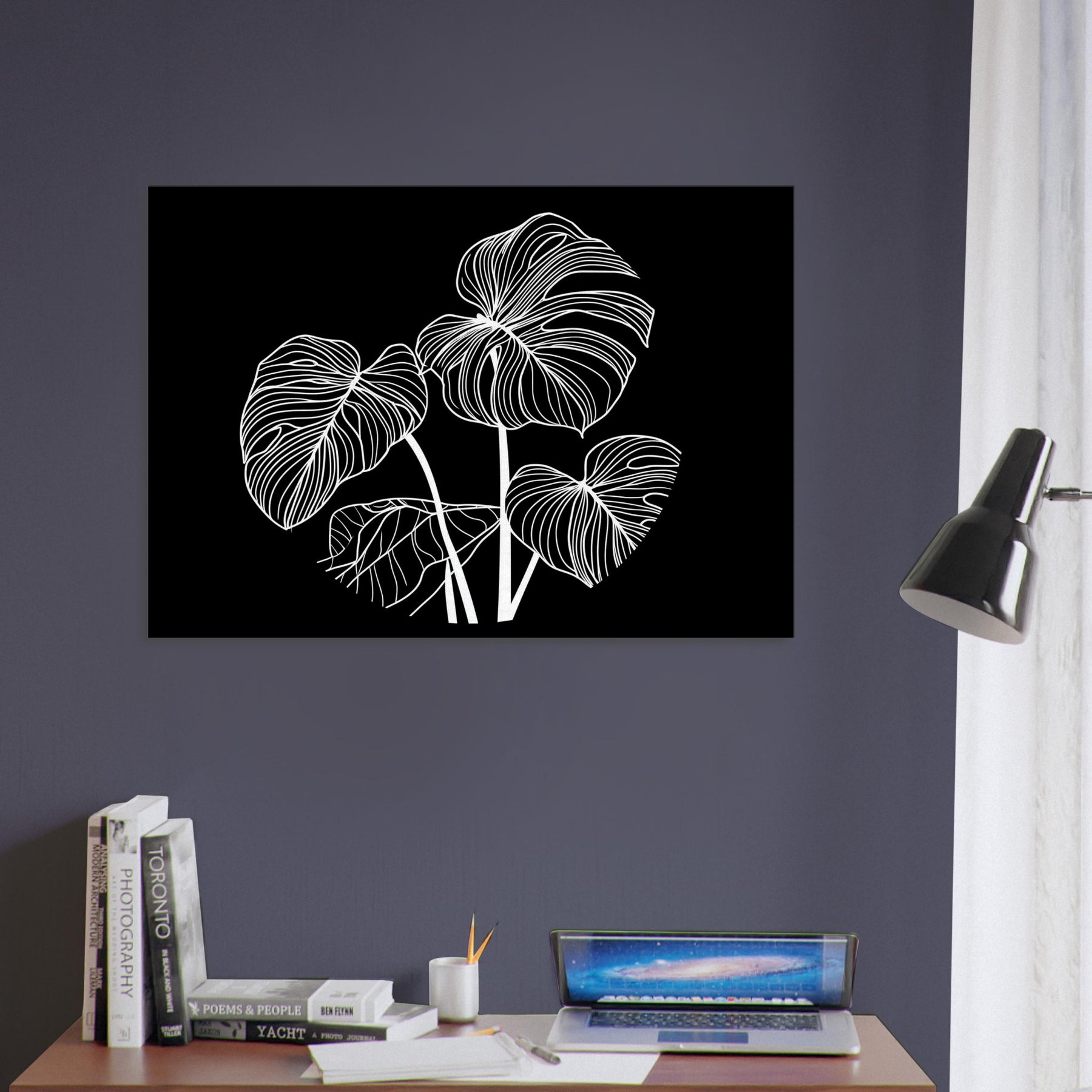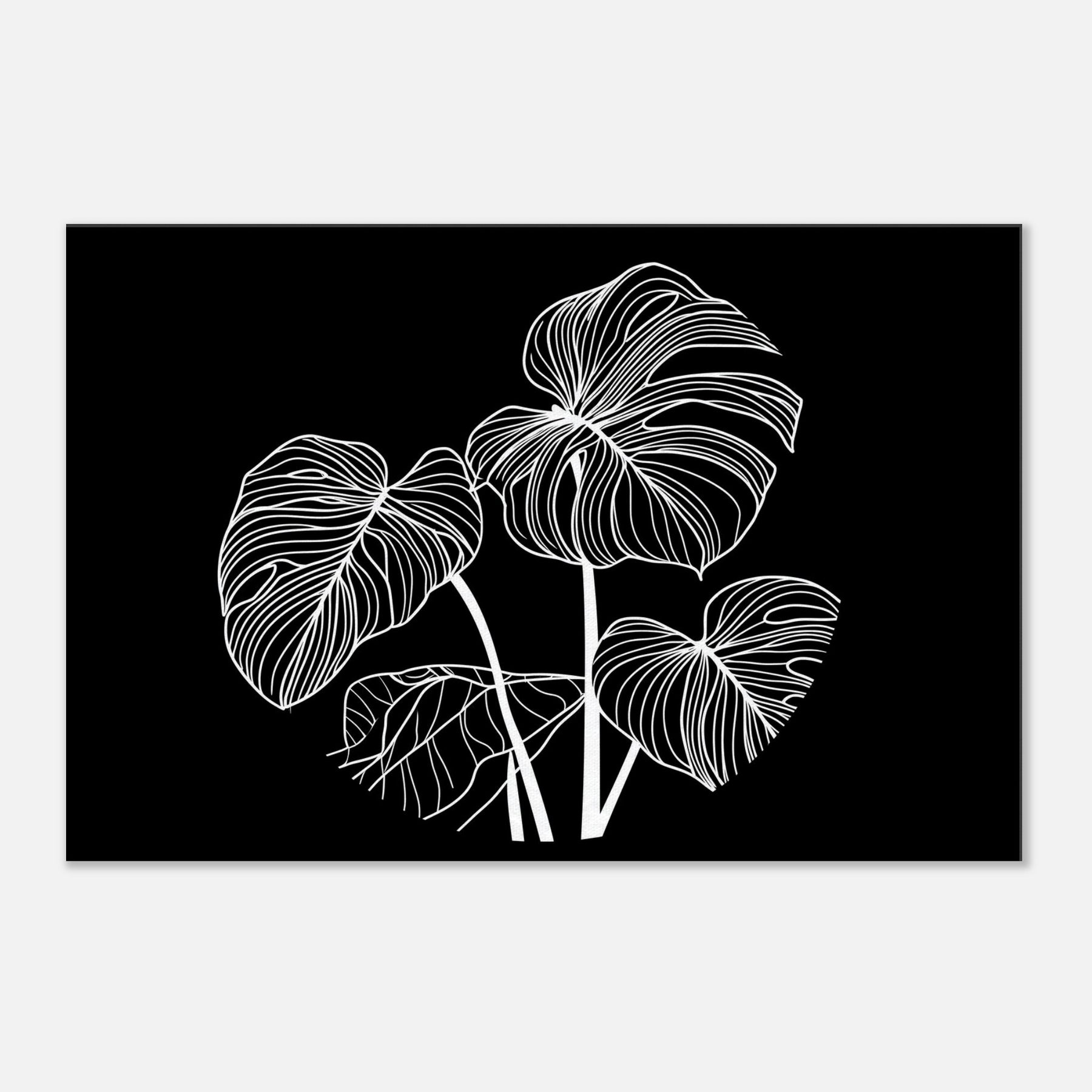 Let the Monstera rise in elegant white lines against a midnight canvas. This line art study conjures a moment of calm and botanical grace, where each curved contour breathes with quiet rhythm. The Monstera's leaves become a lyrical map for a living room or bedroom, framing light and shadow with a sculptural presence. It invites slow, mindful gazing a focal point that softens sharp edges of the day and adds a breathable, botanical atmosphere to any space.