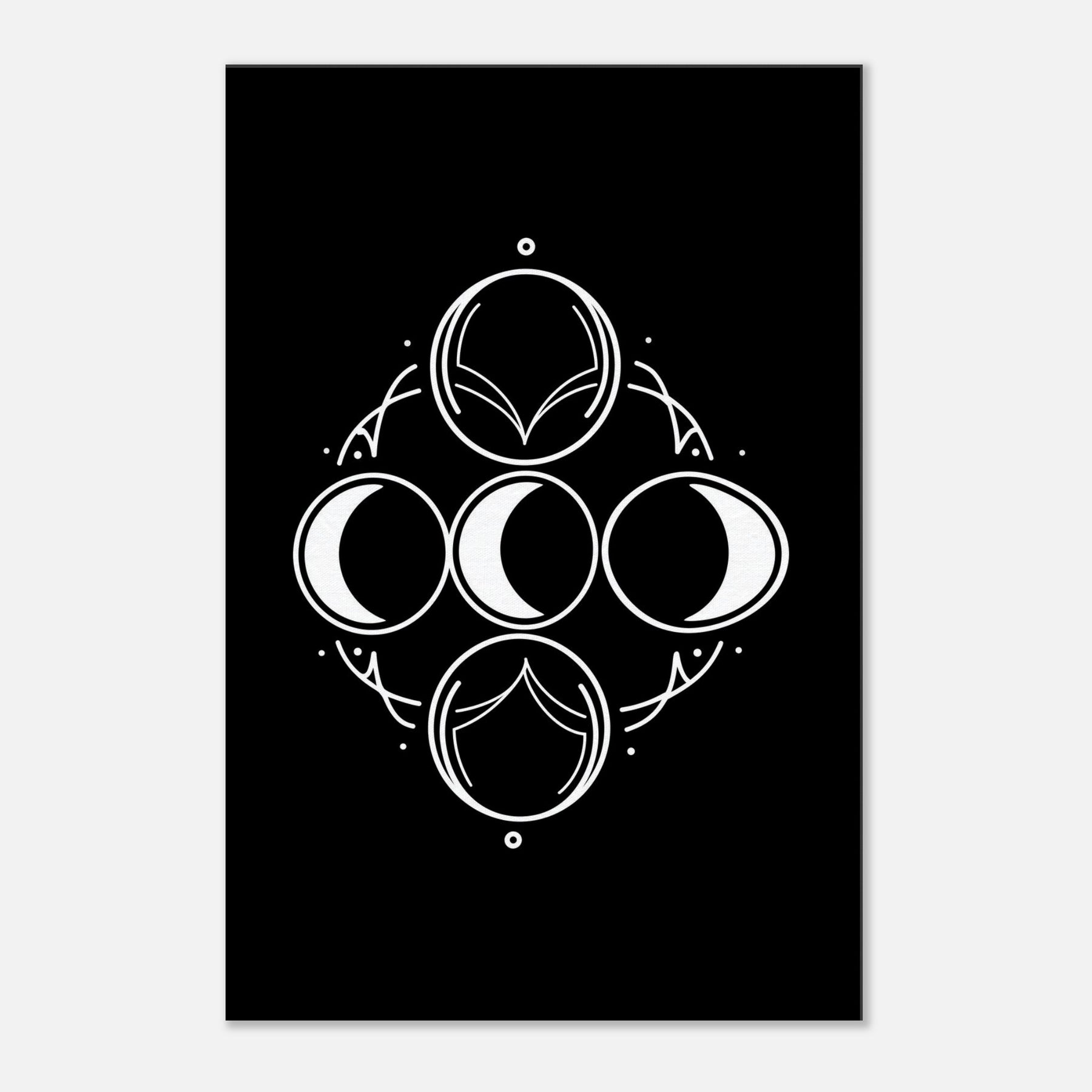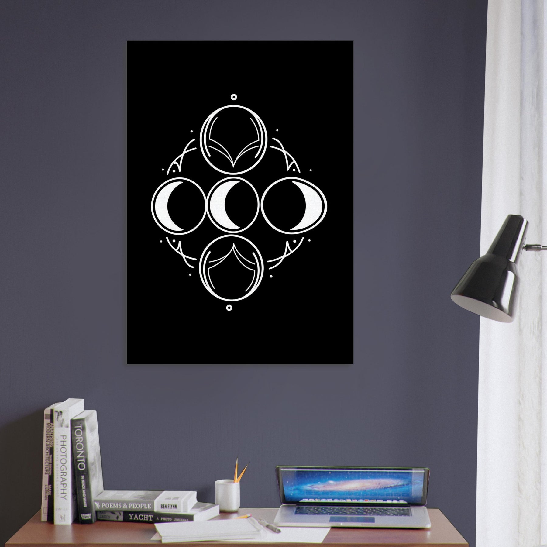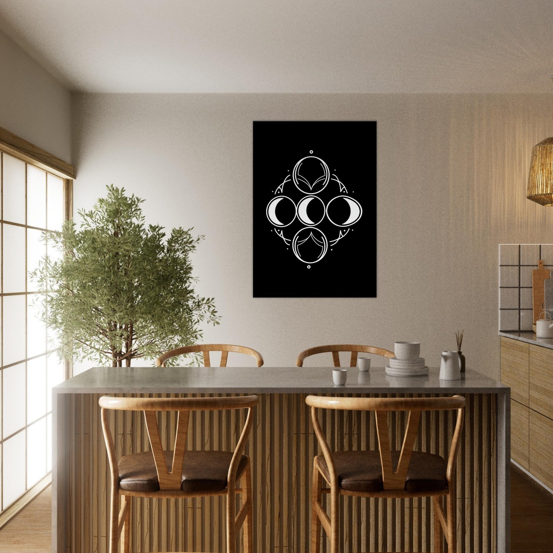 Let Moon Phases drift across your wall in a whisper of light. This line art composition traces the lunar cycle with elegant arcs, turning celestial rhythm into a meditative focal point. The stark white on inky black creates a serene contrast that invites quiet reflection, whether in a cozy living room or an airy study. Its mystical symmetry pairs with soft textures to soften modern spaces, transforming walls into a celestial vignette that feels both timeless and deeply personal.