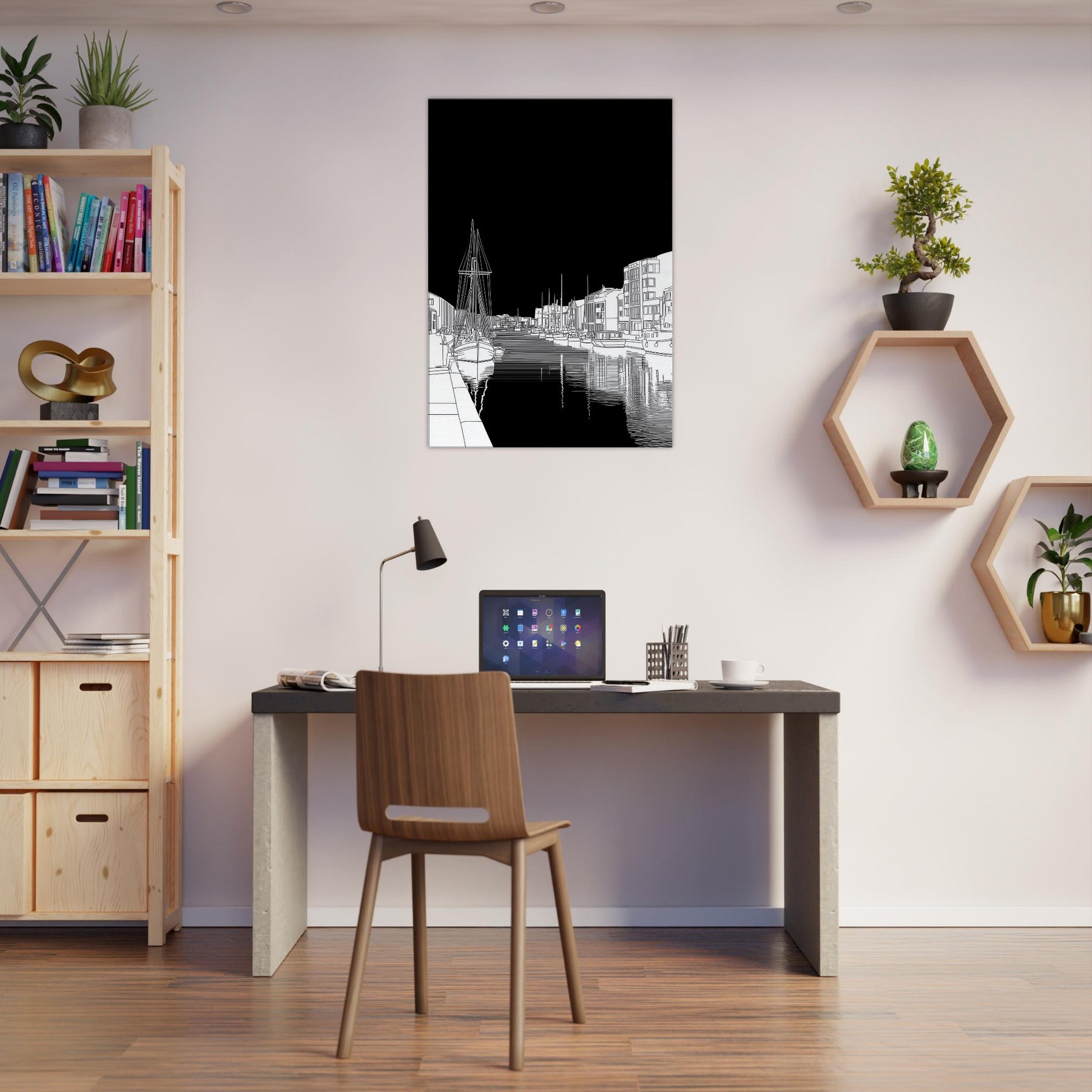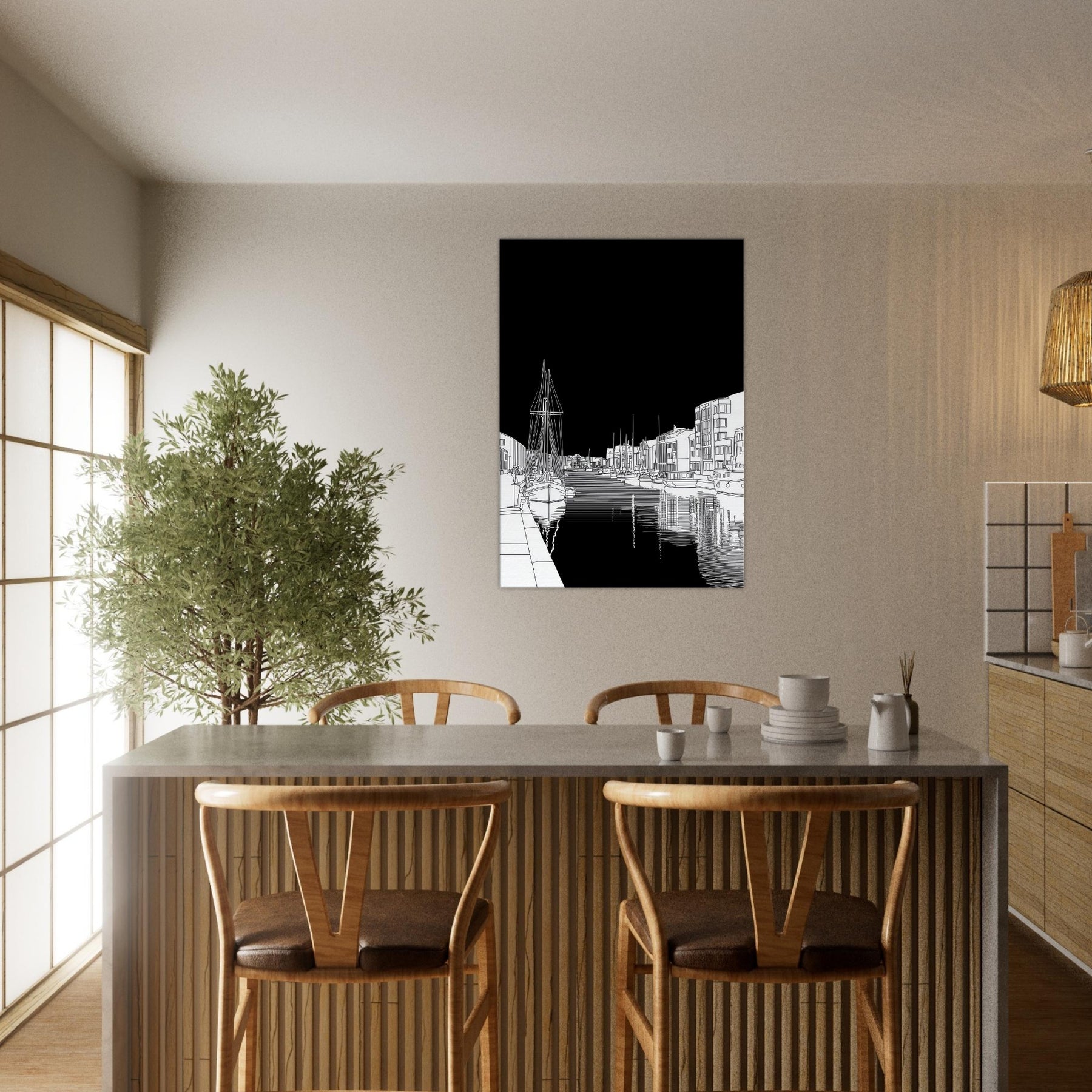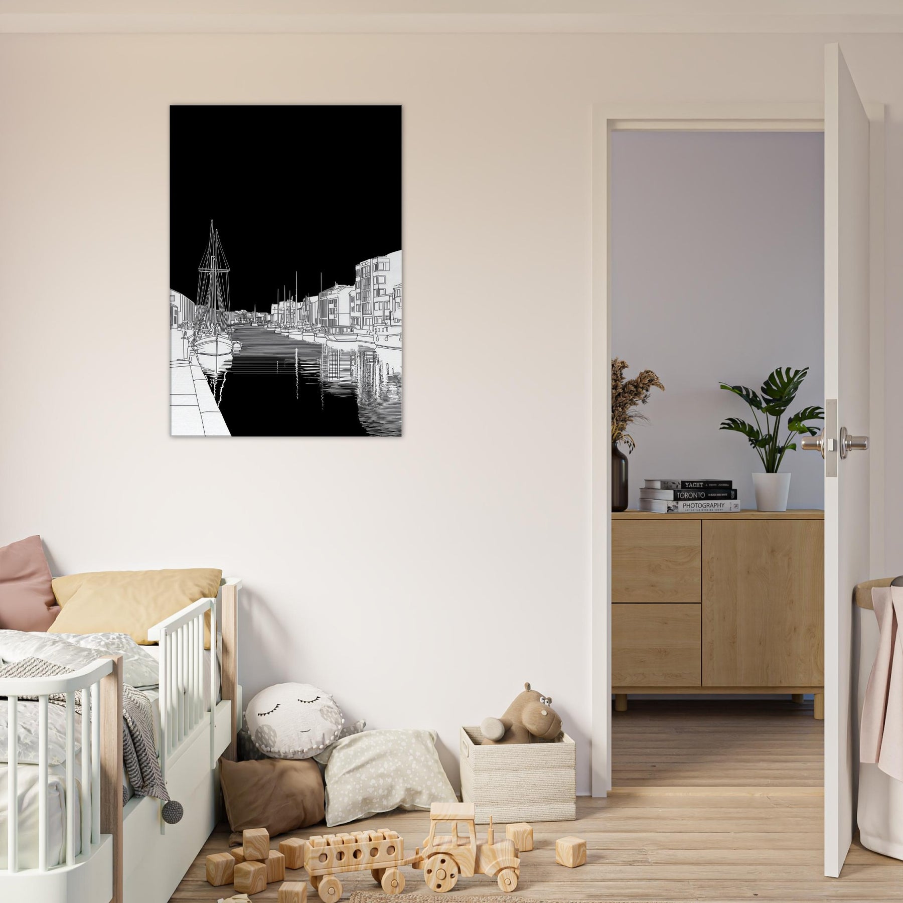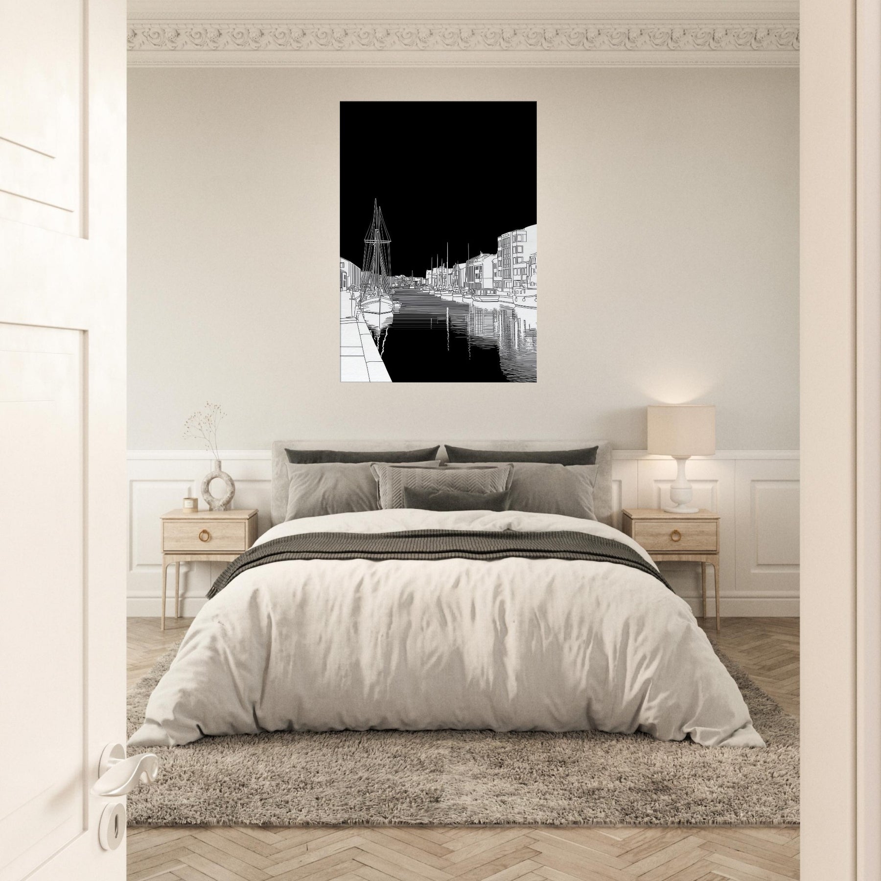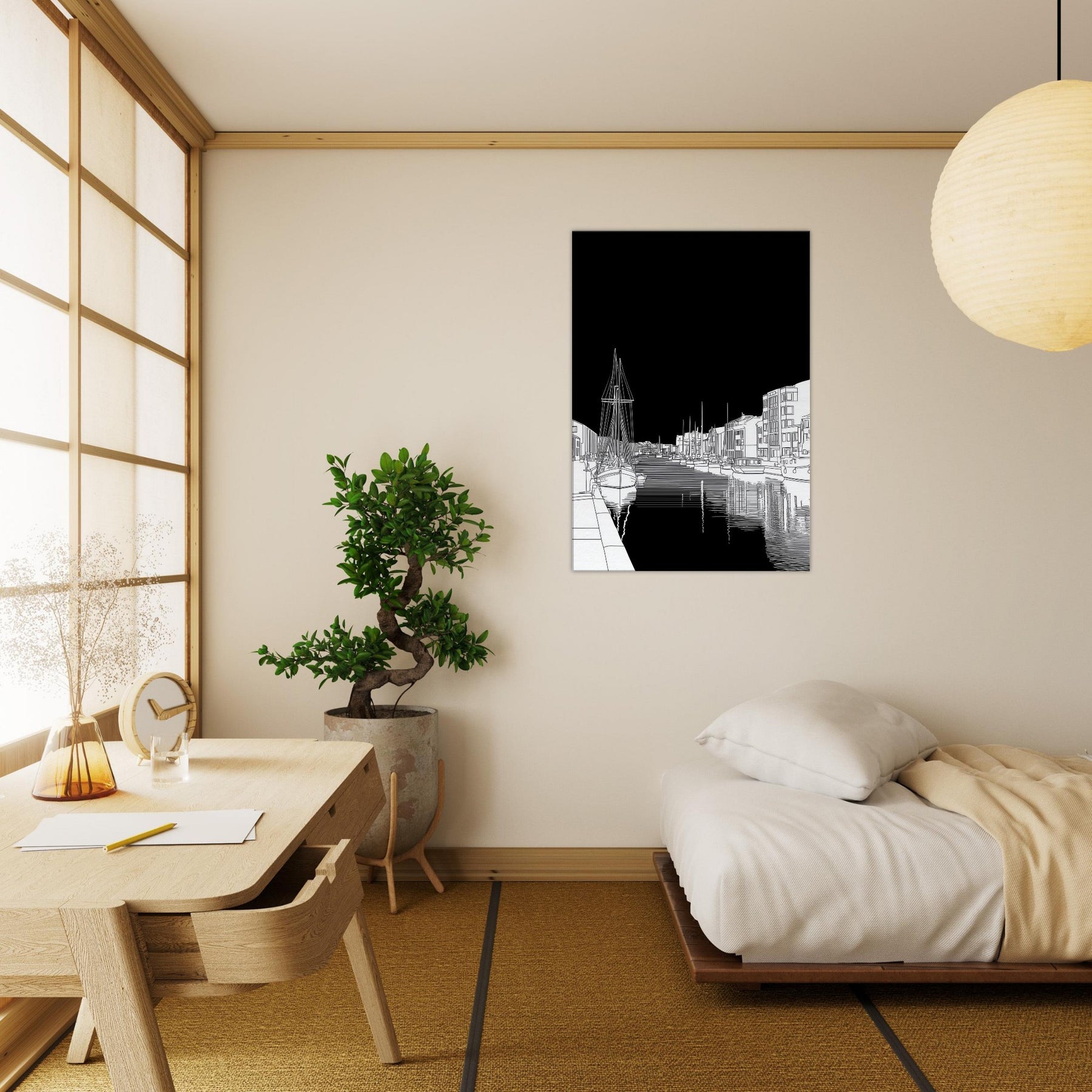 Harbor is drawn in clean, elegant lines that invite the eye to wander along quays and masts. This restrained composition captures the hush of a harbor at dusk reflections ripple across water, boats rest along a quiet promenade, and buildings rise in calm, architectural rhythm. The contrast of white line against a deep black canvas brings a sense of air and depth, turning a living space into a shoreline sanctuary where memory and modernity softly meet.