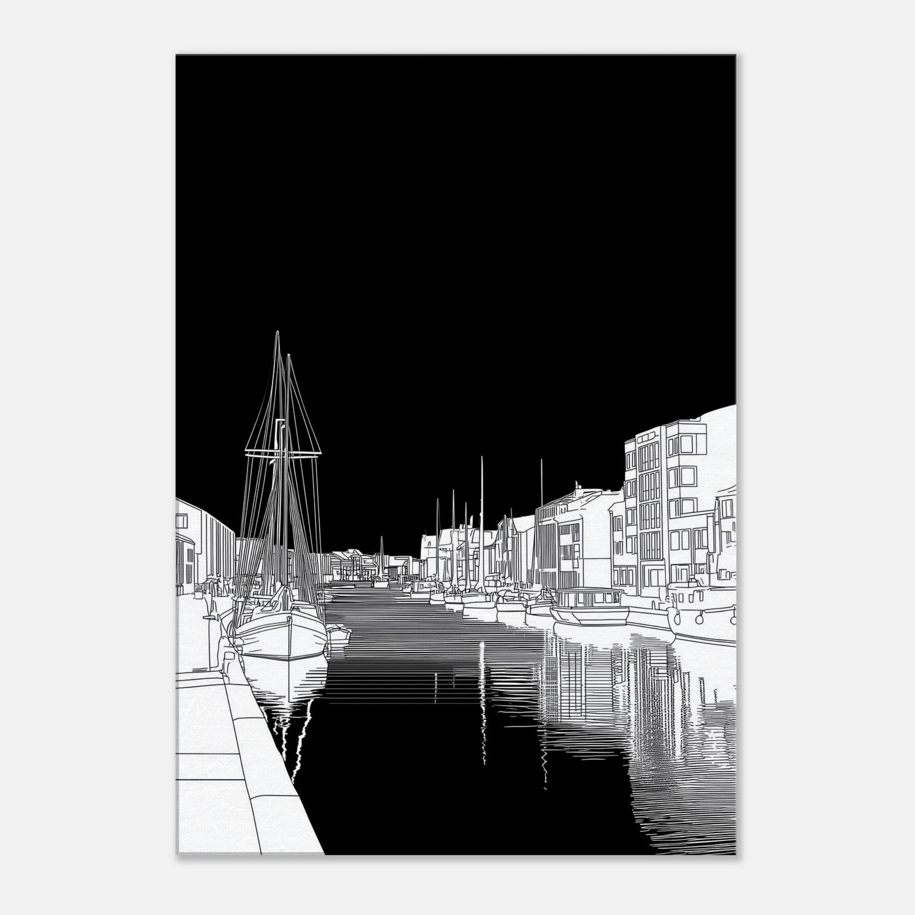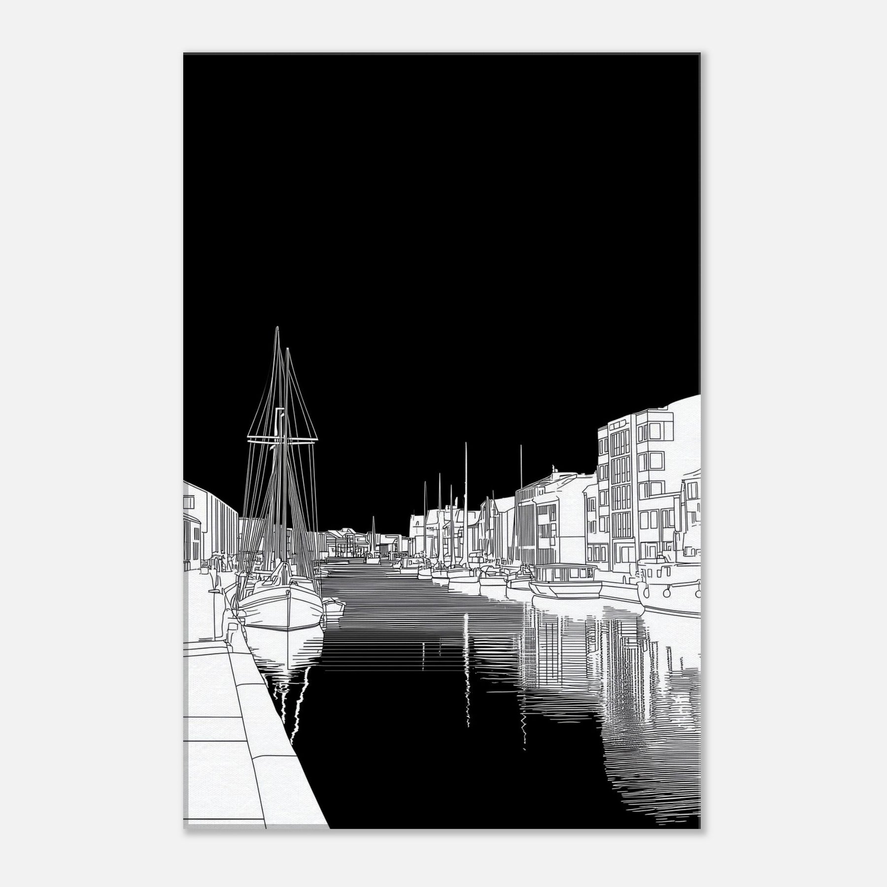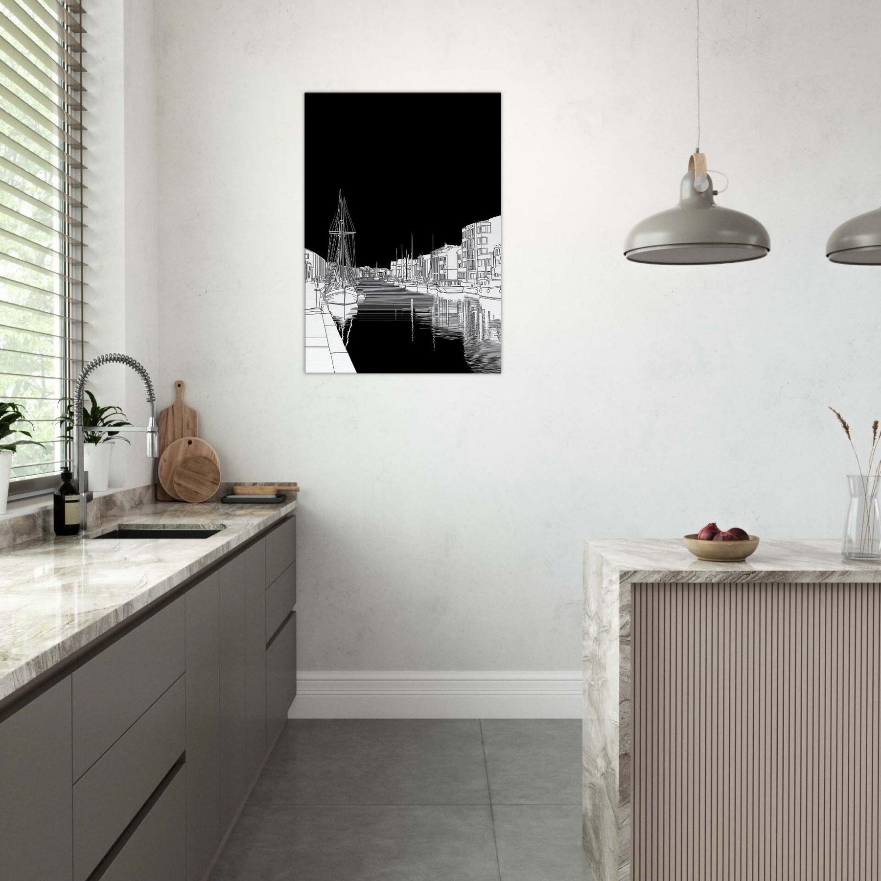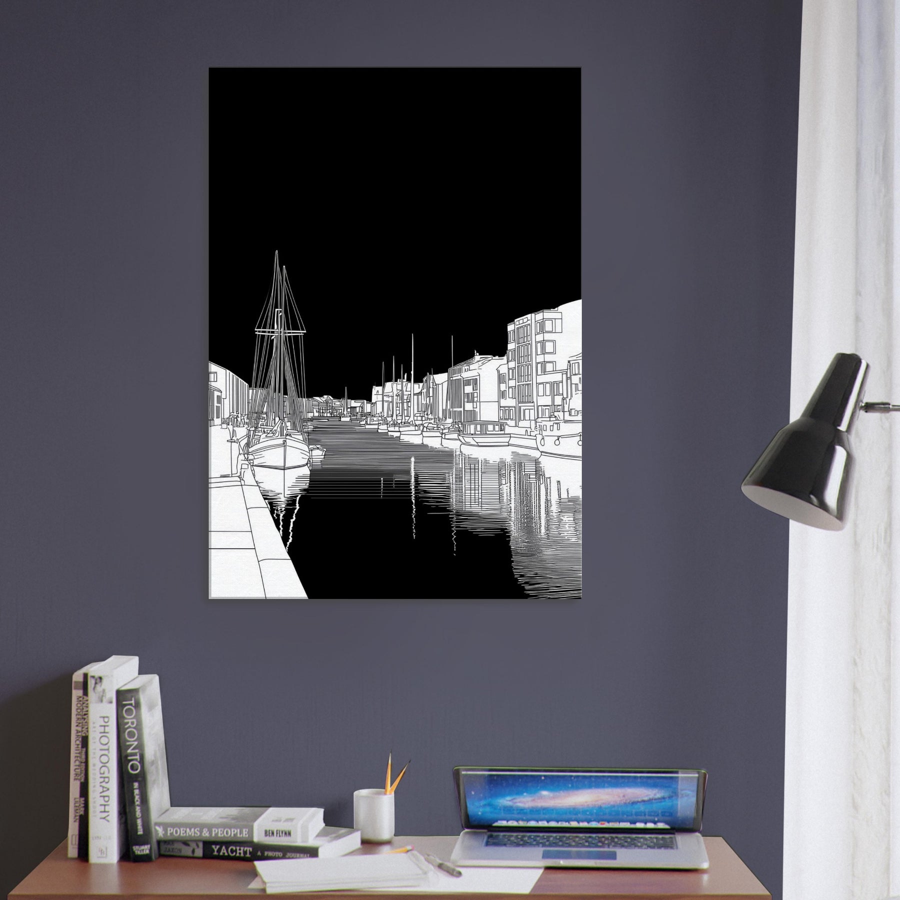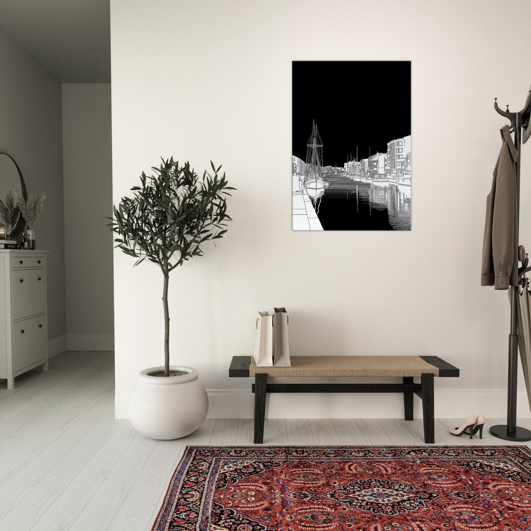Harbor is drawn in clean, elegant lines that invite the eye to wander along quays and masts. This restrained composition captures the hush of a harbor at dusk reflections ripple across water, boats rest along a quiet promenade, and buildings rise in calm, architectural rhythm. The contrast of white line against a deep black canvas brings a sense of air and depth, turning a living space into a shoreline sanctuary where memory and modernity softly meet.