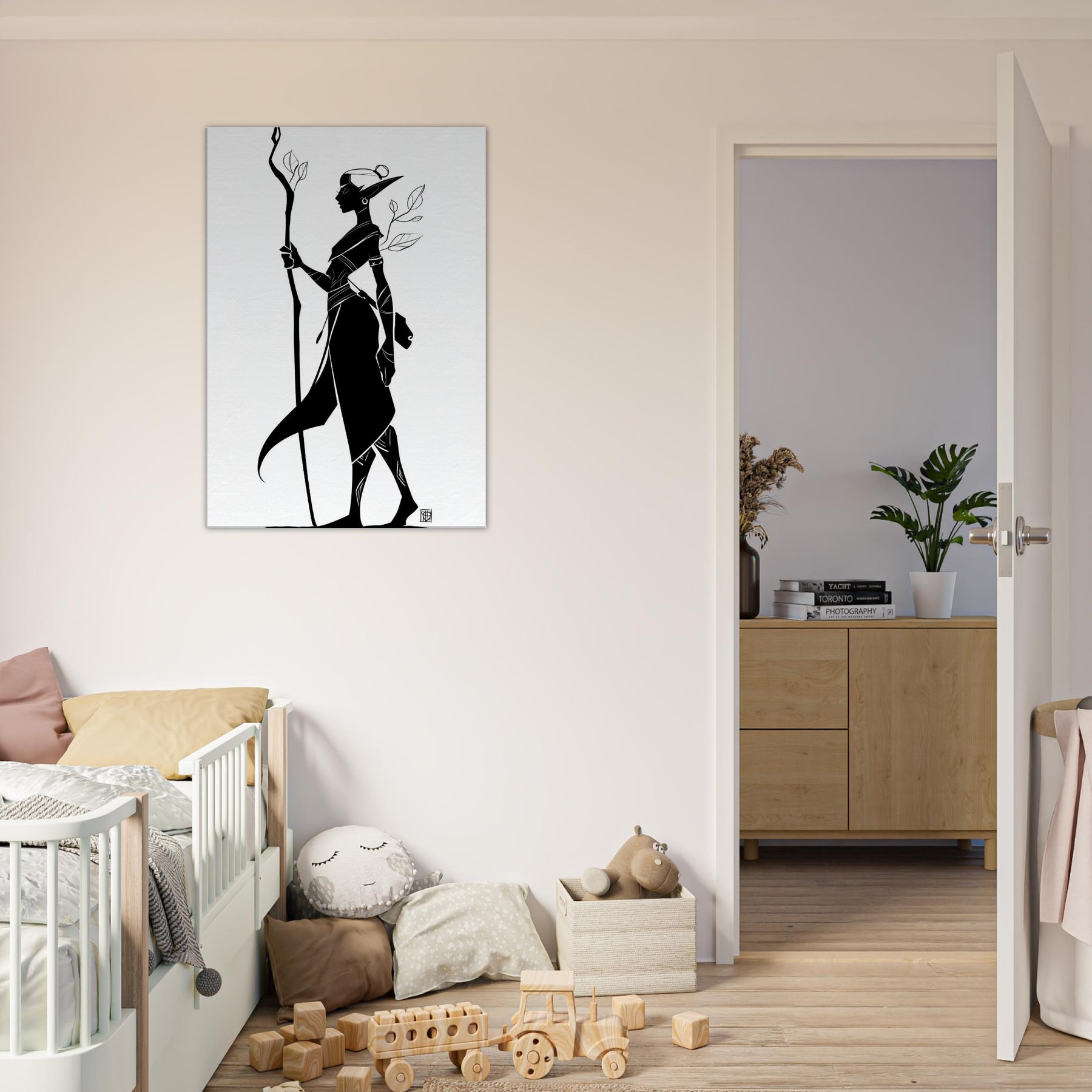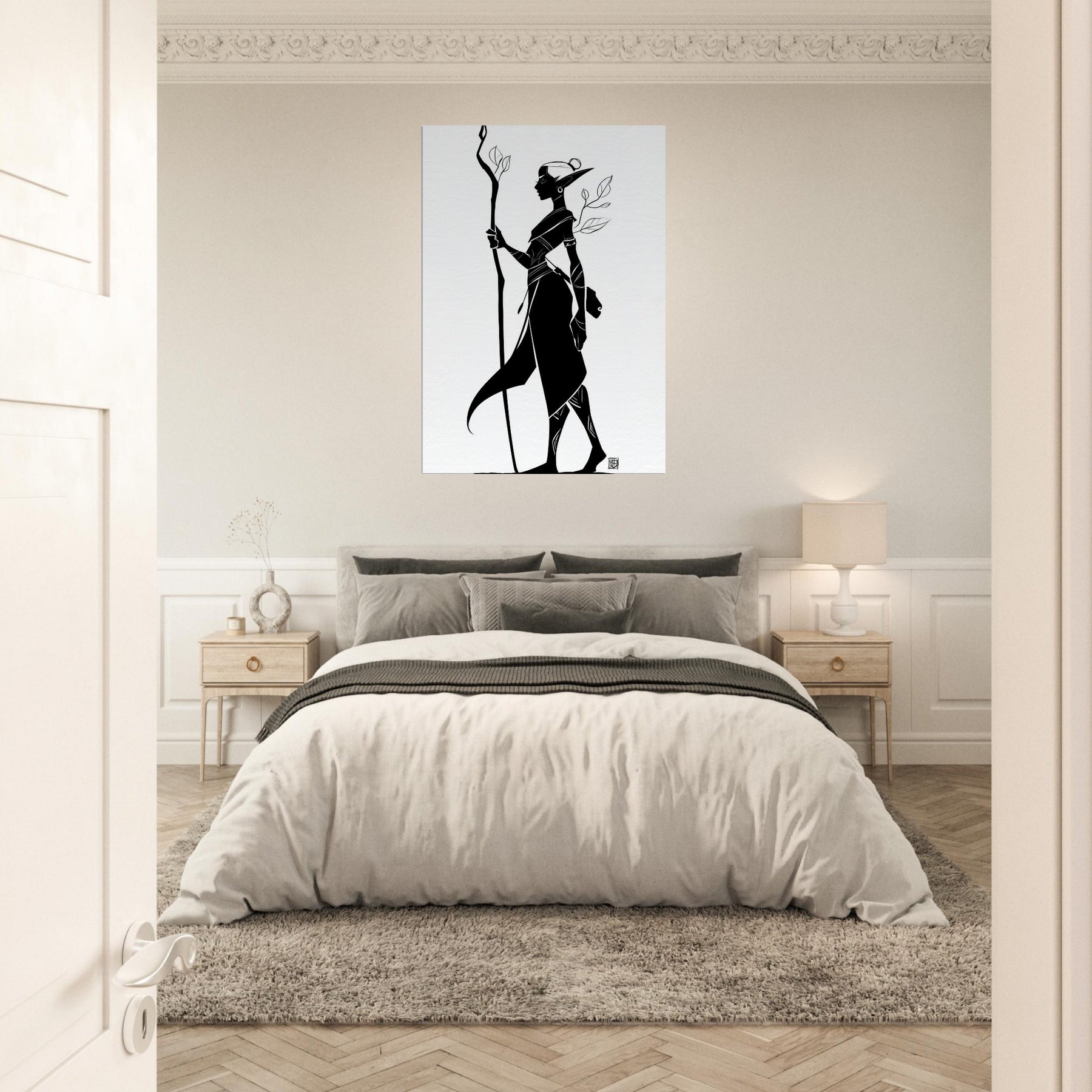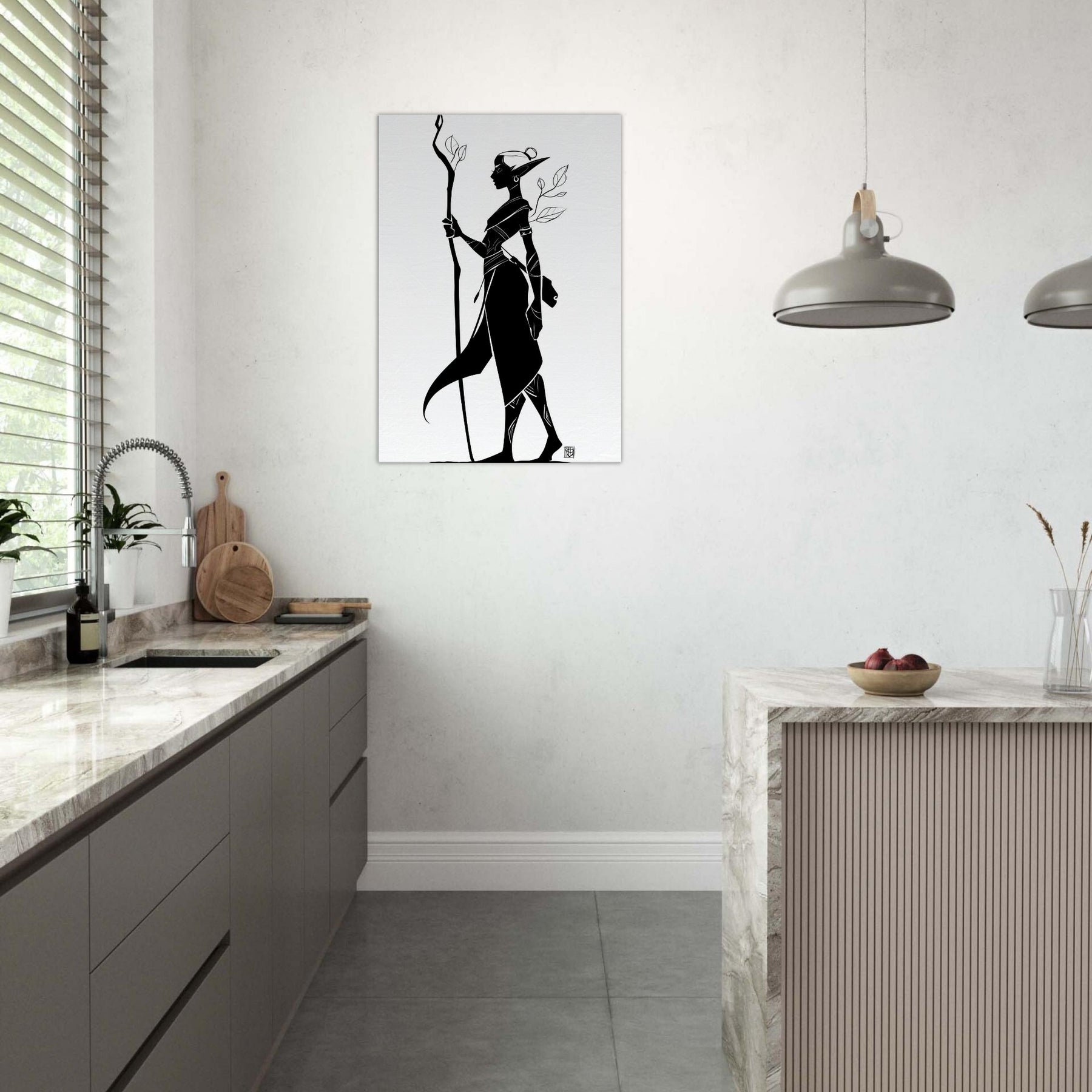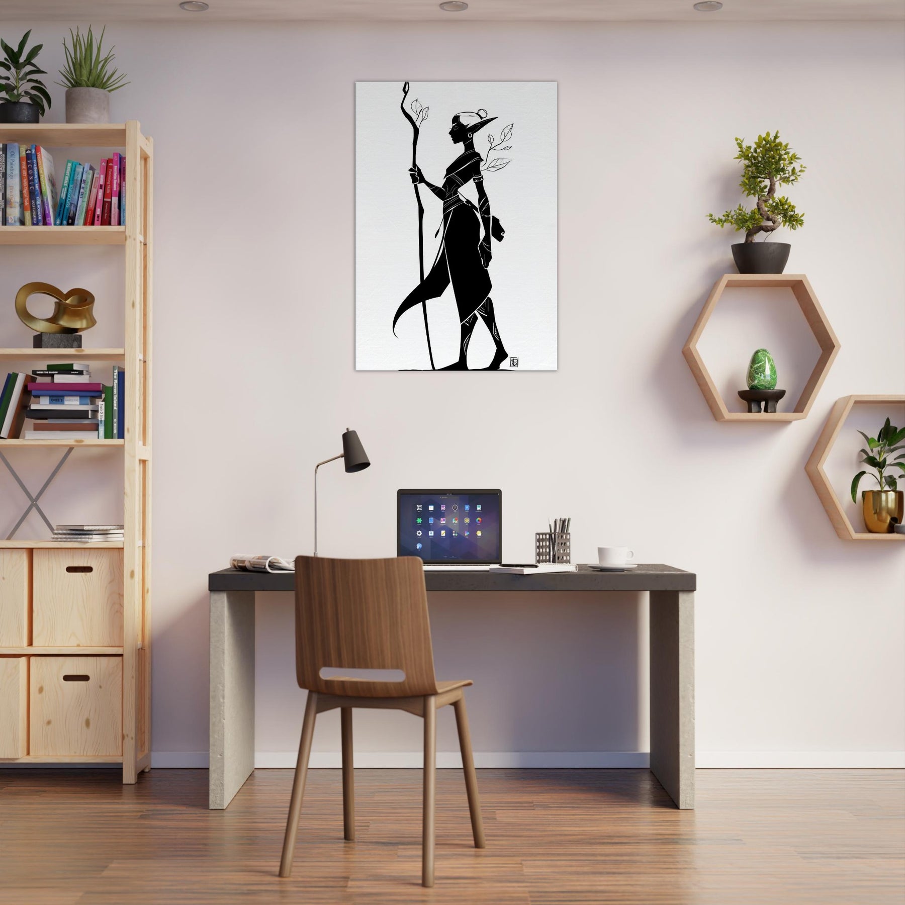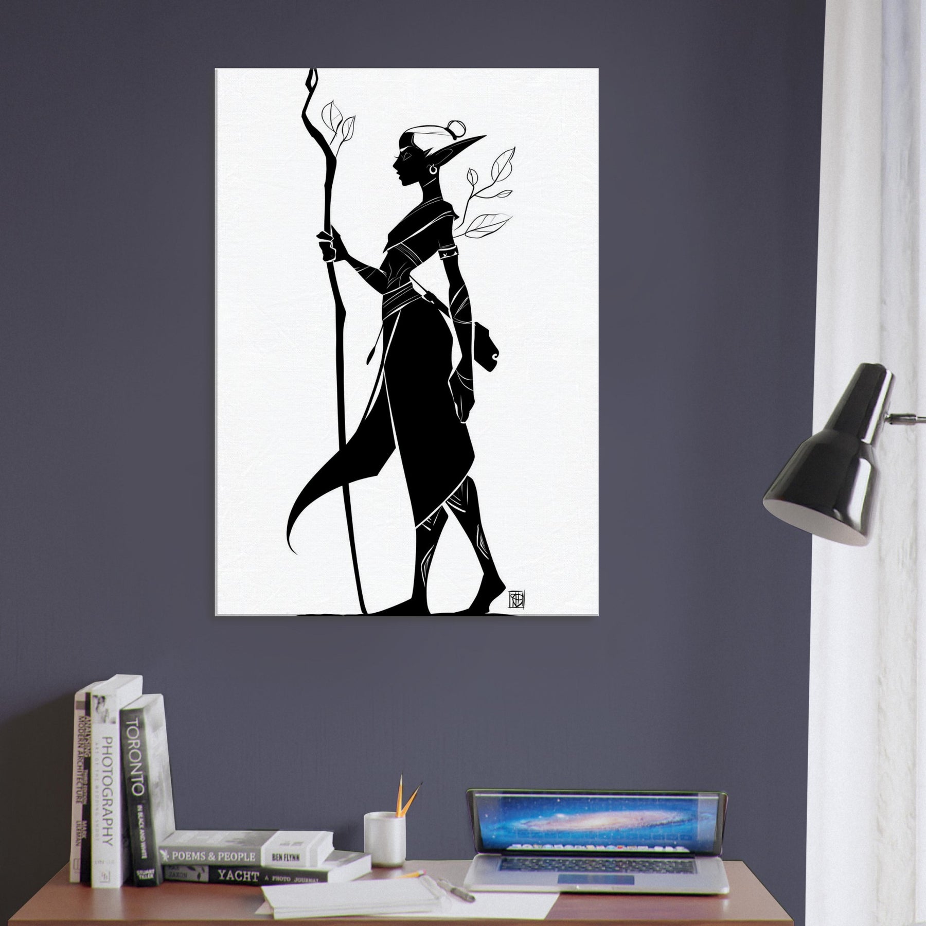 In this elegant line art, the Mystical Elf threads light through a shadowed forest of memory. The bold black silhouette stands tall with a carved staff, leaves trailing like breath. The negative space invites quiet reflection, turning a wall into a window onto quiet magic. Perfect for a serene living room, study, or hallway, it complements minimalist palettes and warms a monochrome scheme with a whisper of myth.