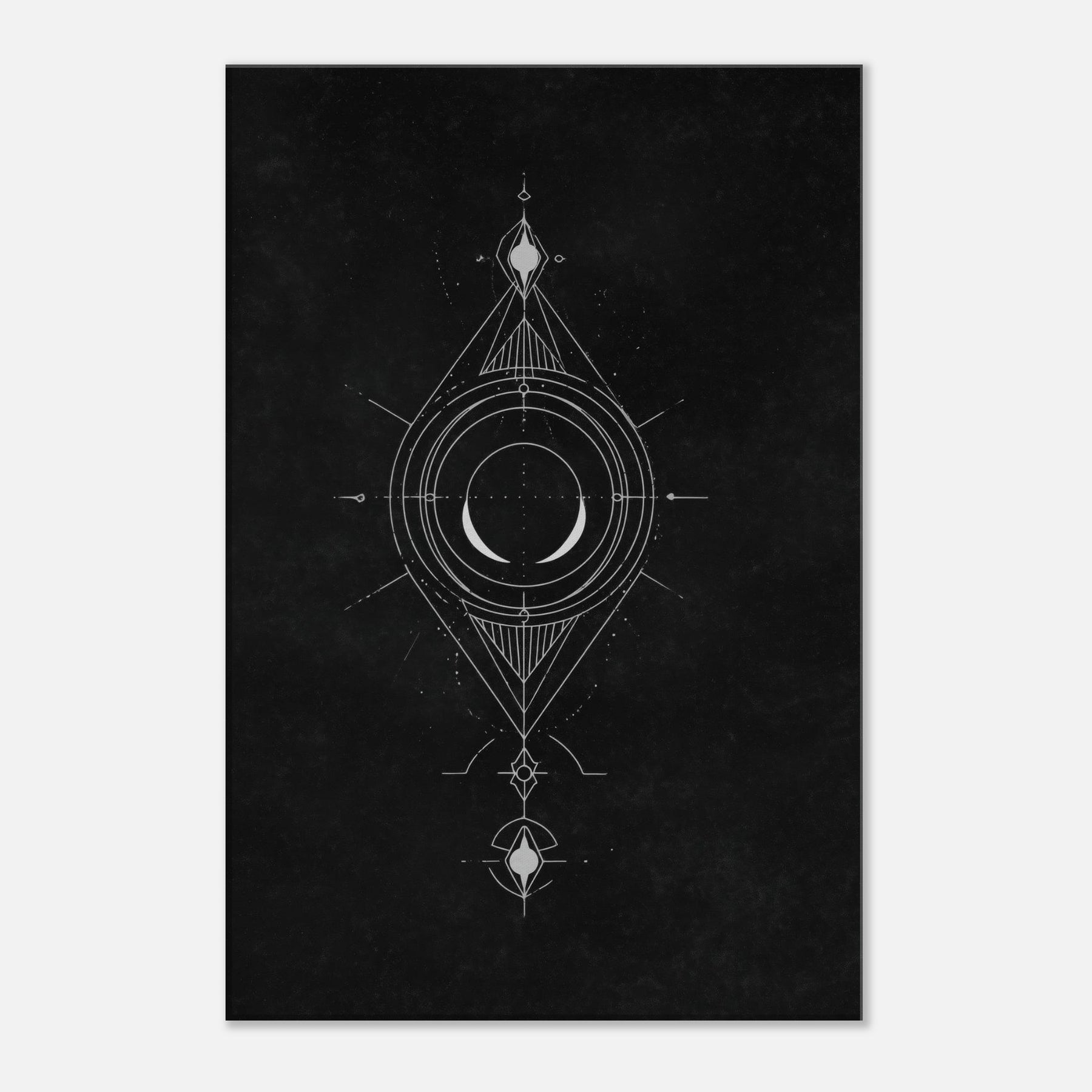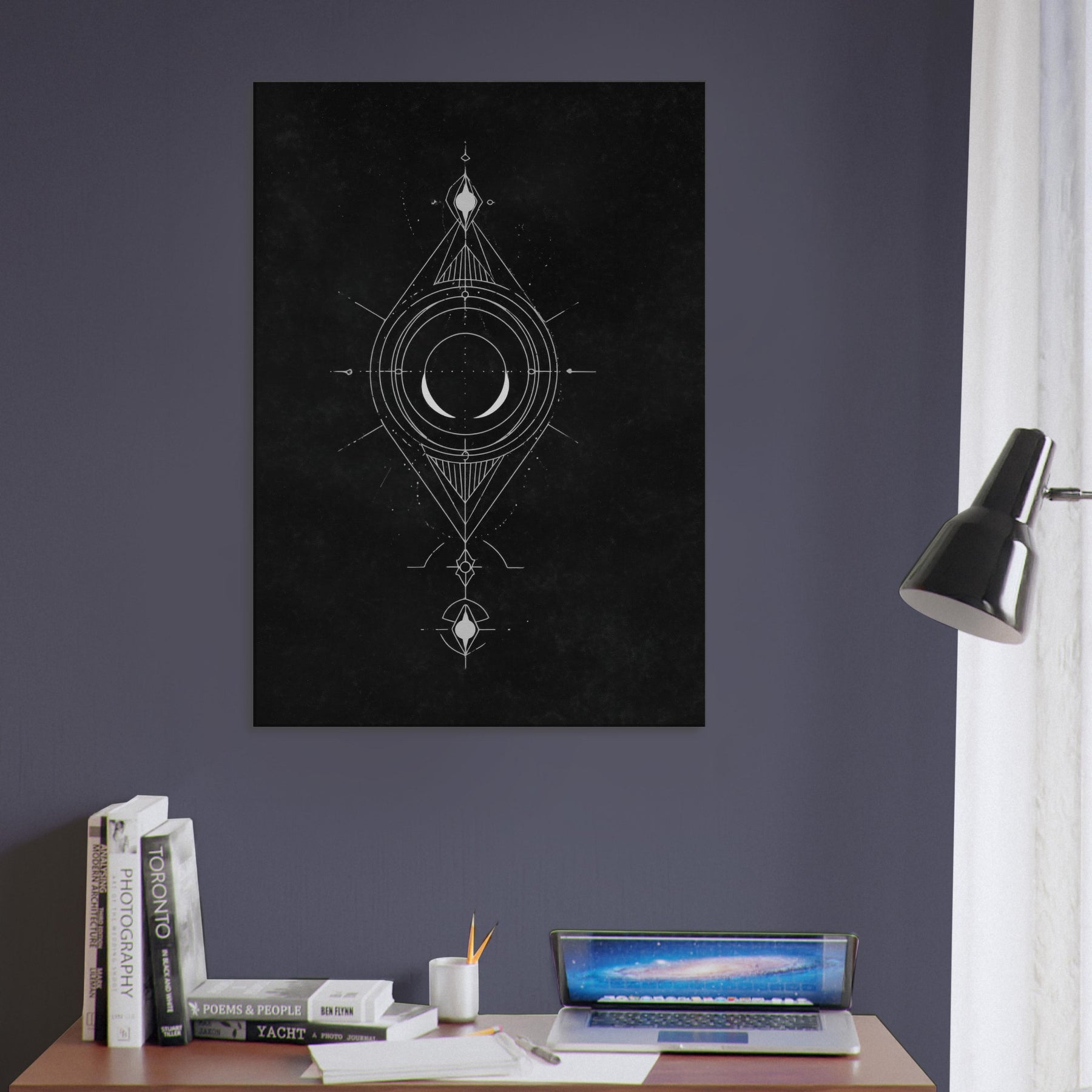 Within this lunar line study, a slender Moon rests at the center of a constellation of circles and diamond arcs. The precise, silvered geometry feels like starlight mapped onto velvet night, a quiet invitation to pause. The mystic symmetry radiates calm, guiding the eye outward with graceful arcs that echo in the airspace of your room. As light falls across the wall, the piece casts a subtle halo of contemplation perfect for a living room or bedroom, where it invites focus, stillness, and a dreamy, otherworldly mood.