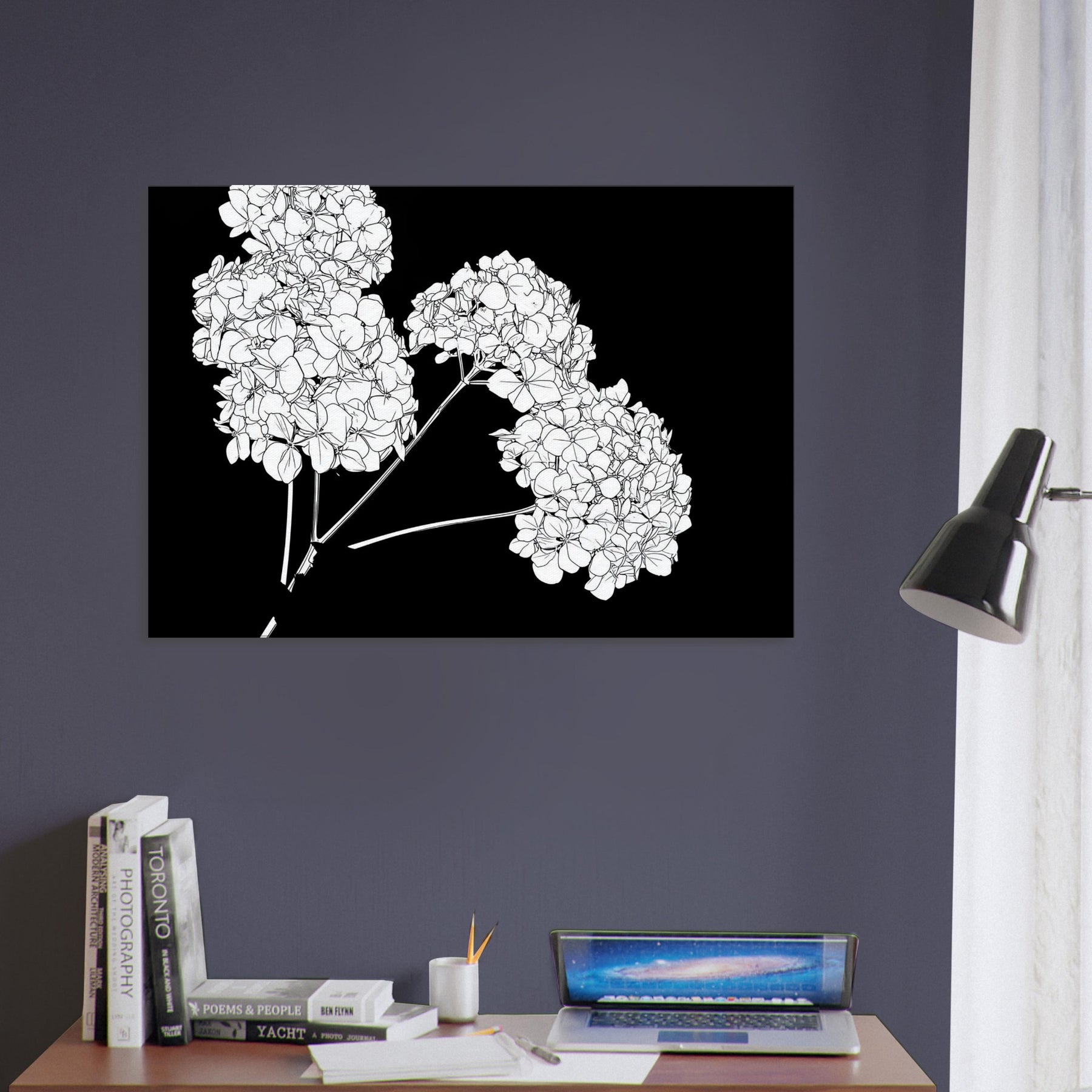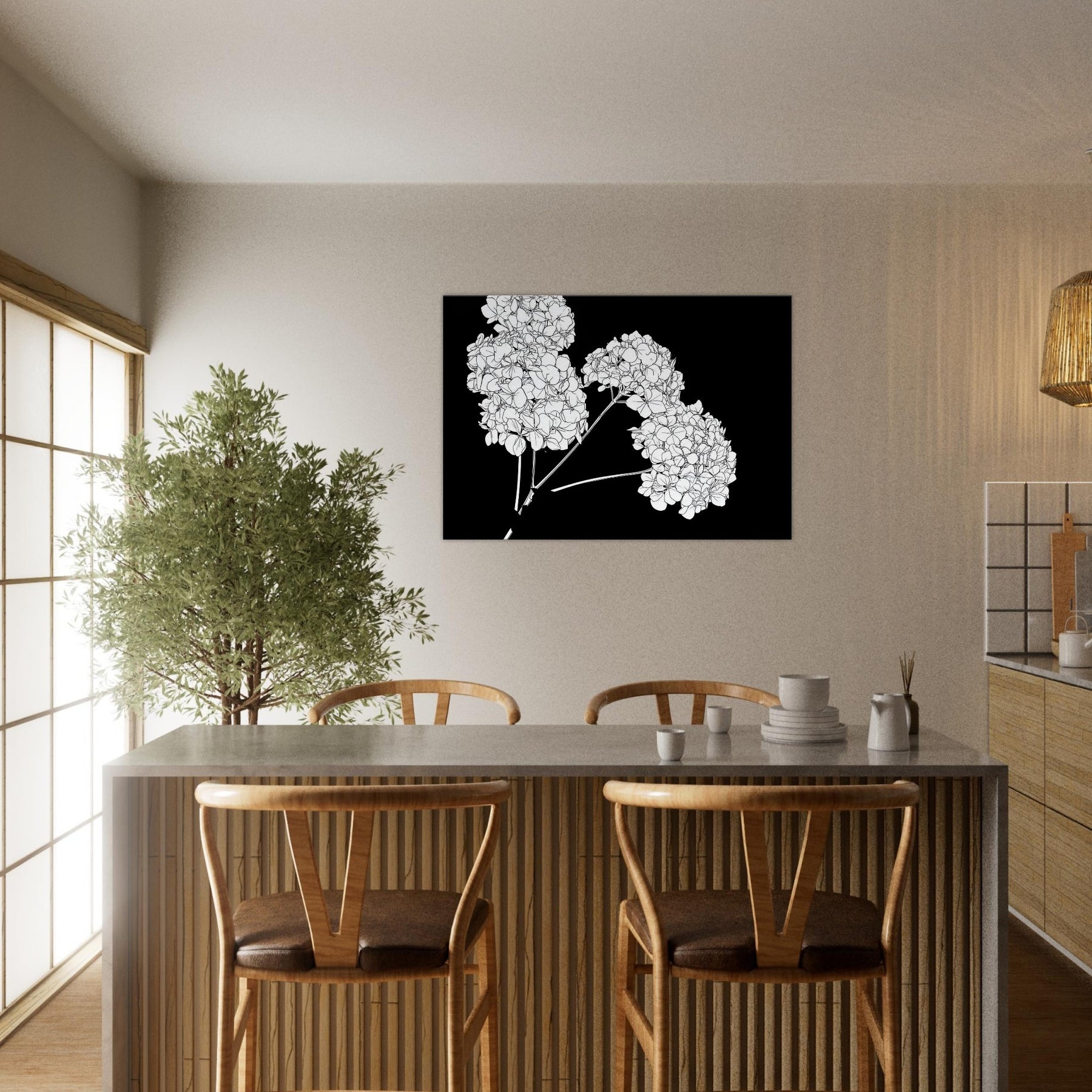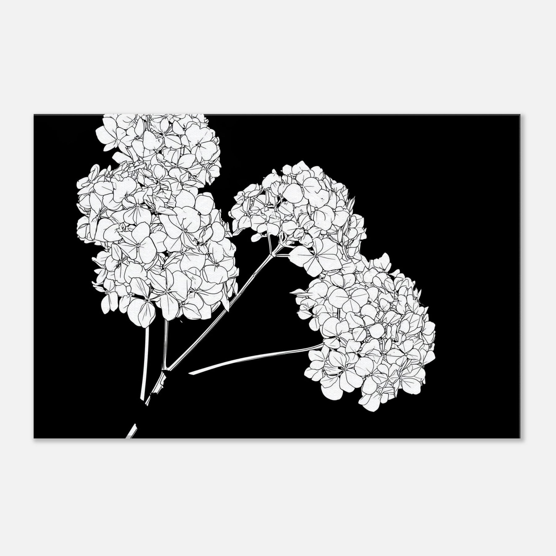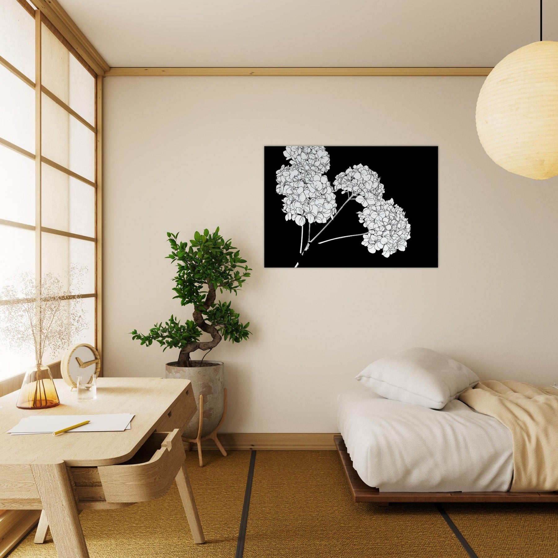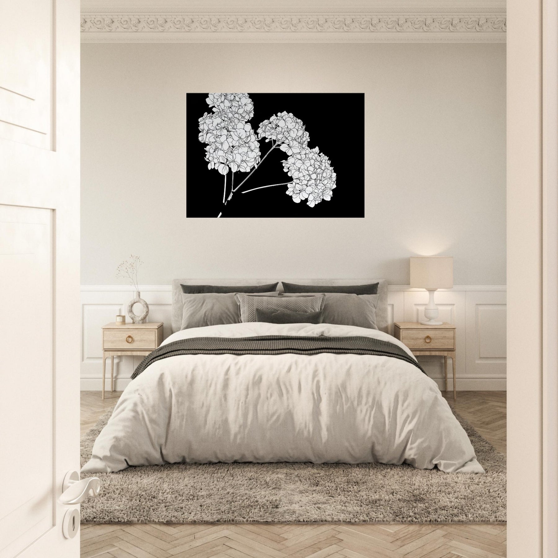 A poised, continuous line traces the Hydrangea into graceful clusters, inviting a quiet pause in any room. This line art blooms with restraint: luminous whites against a velvet black backdrop, like moonlight skimming petals. It exudes modern calm, turning a living space into a serene gallery perfect above a sofa, in a hallway, or beside a bedside vignette. The subject’s generous form is suggested, not crowded, offering a tactile sense of air, balance, and understated elegance.