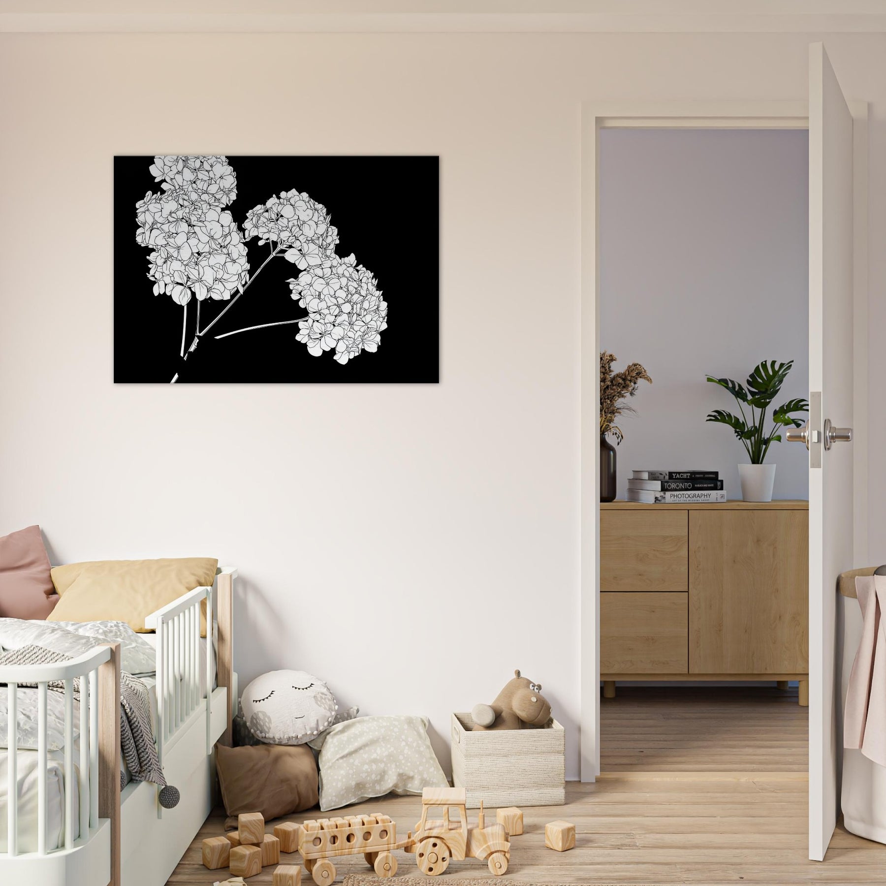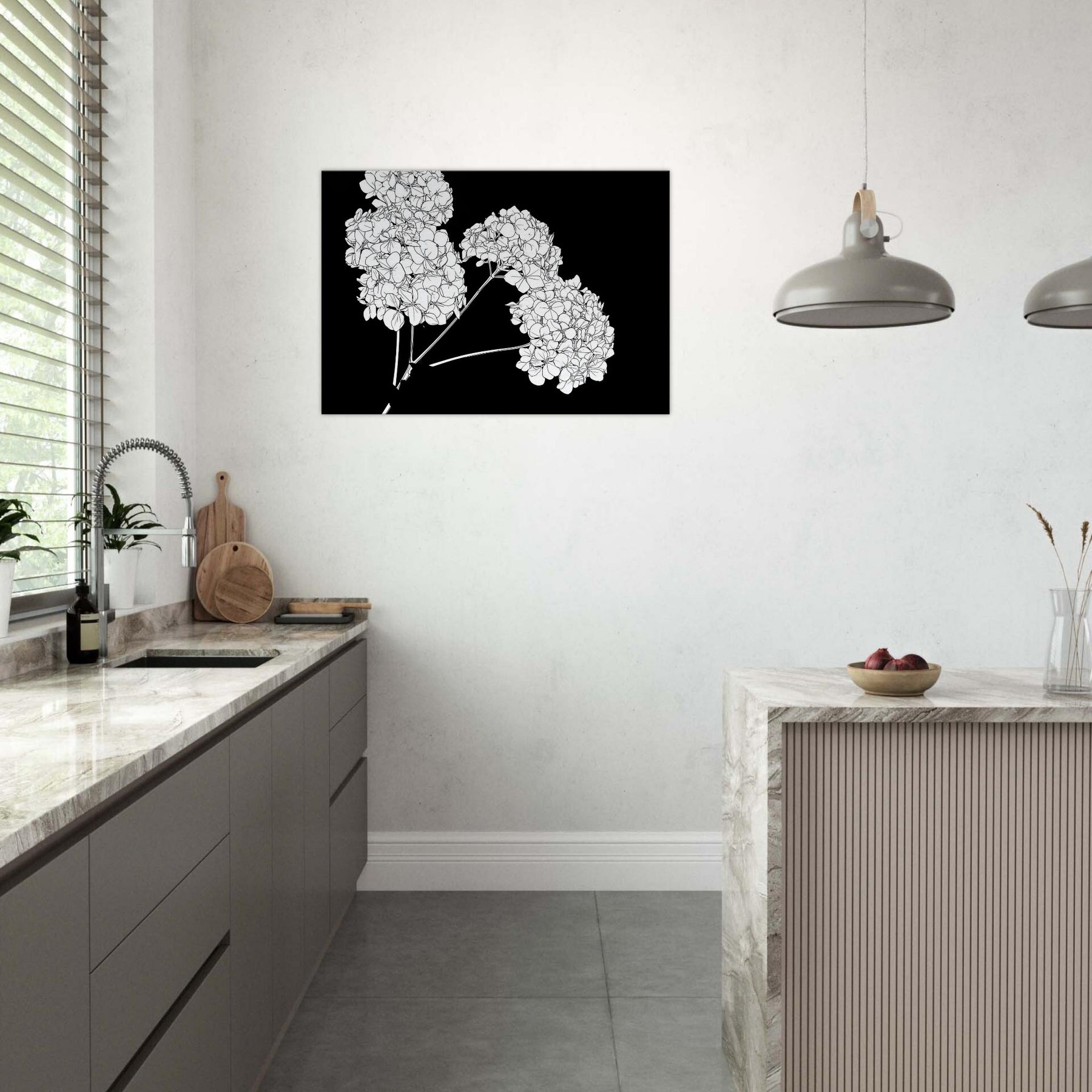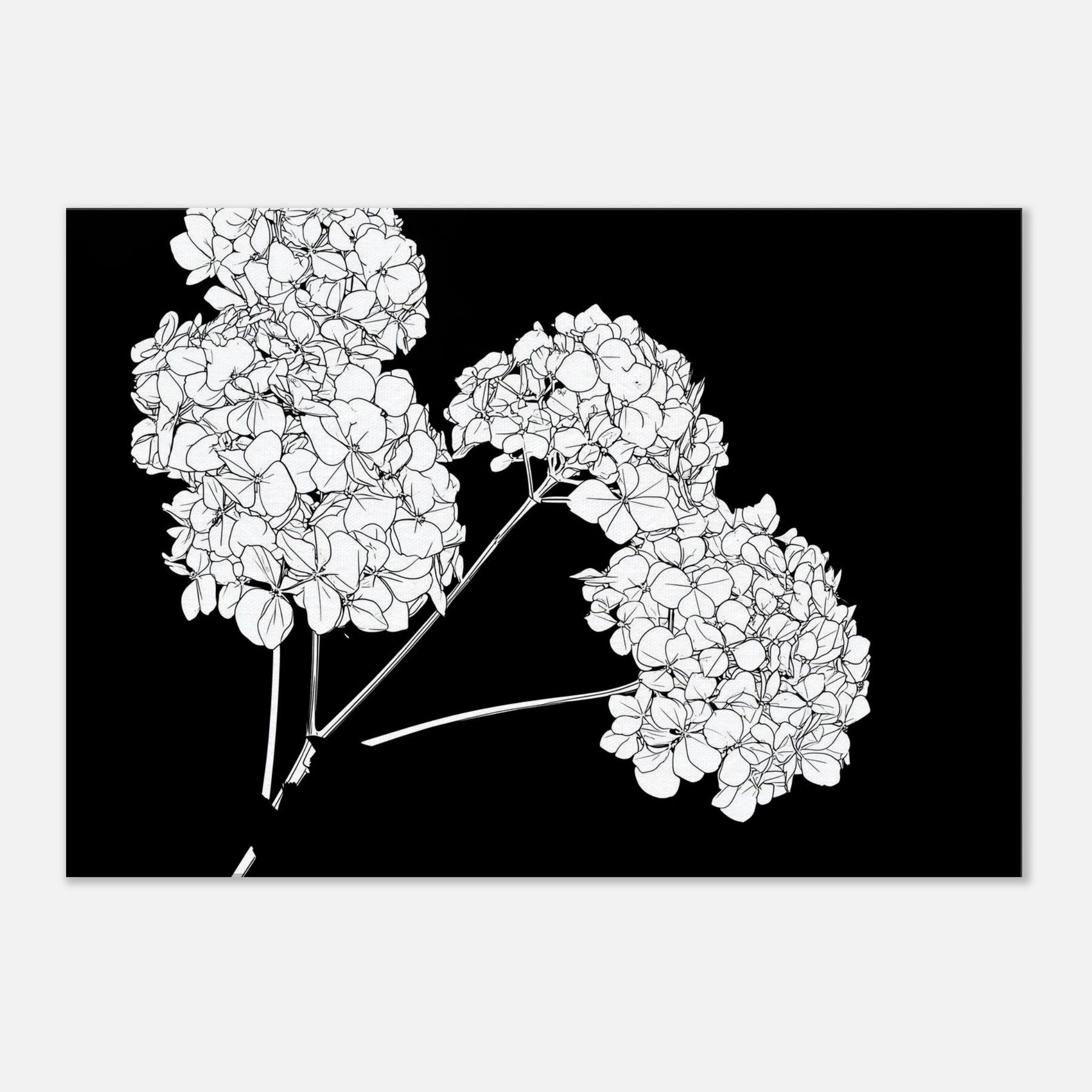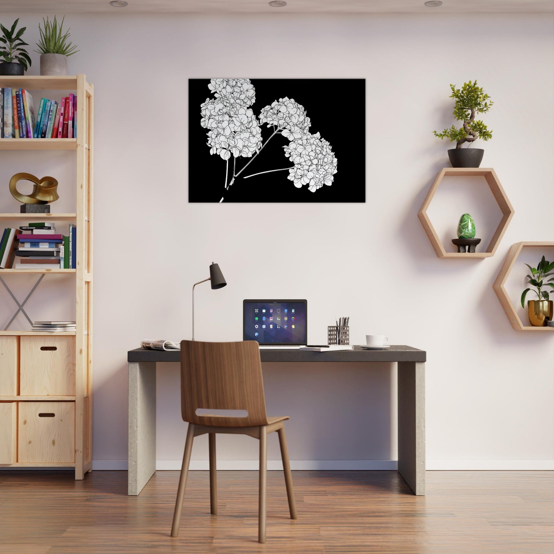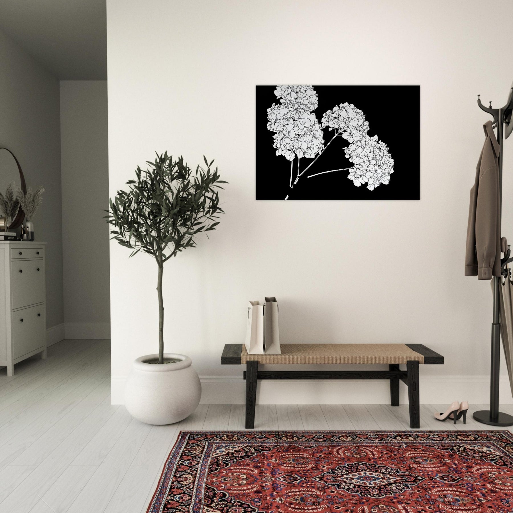 A poised, continuous line traces the Hydrangea into graceful clusters, inviting a quiet pause in any room. This line art blooms with restraint: luminous whites against a velvet black backdrop, like moonlight skimming petals. It exudes modern calm, turning a living space into a serene gallery perfect above a sofa, in a hallway, or beside a bedside vignette. The subject’s generous form is suggested, not crowded, offering a tactile sense of air, balance, and understated elegance.