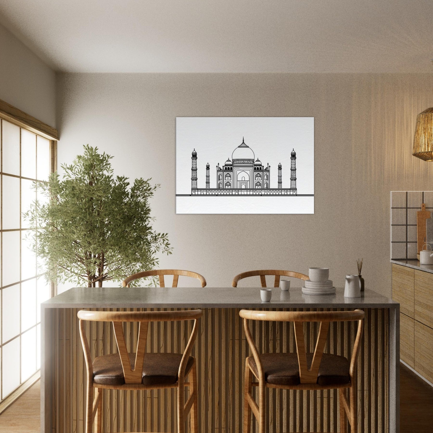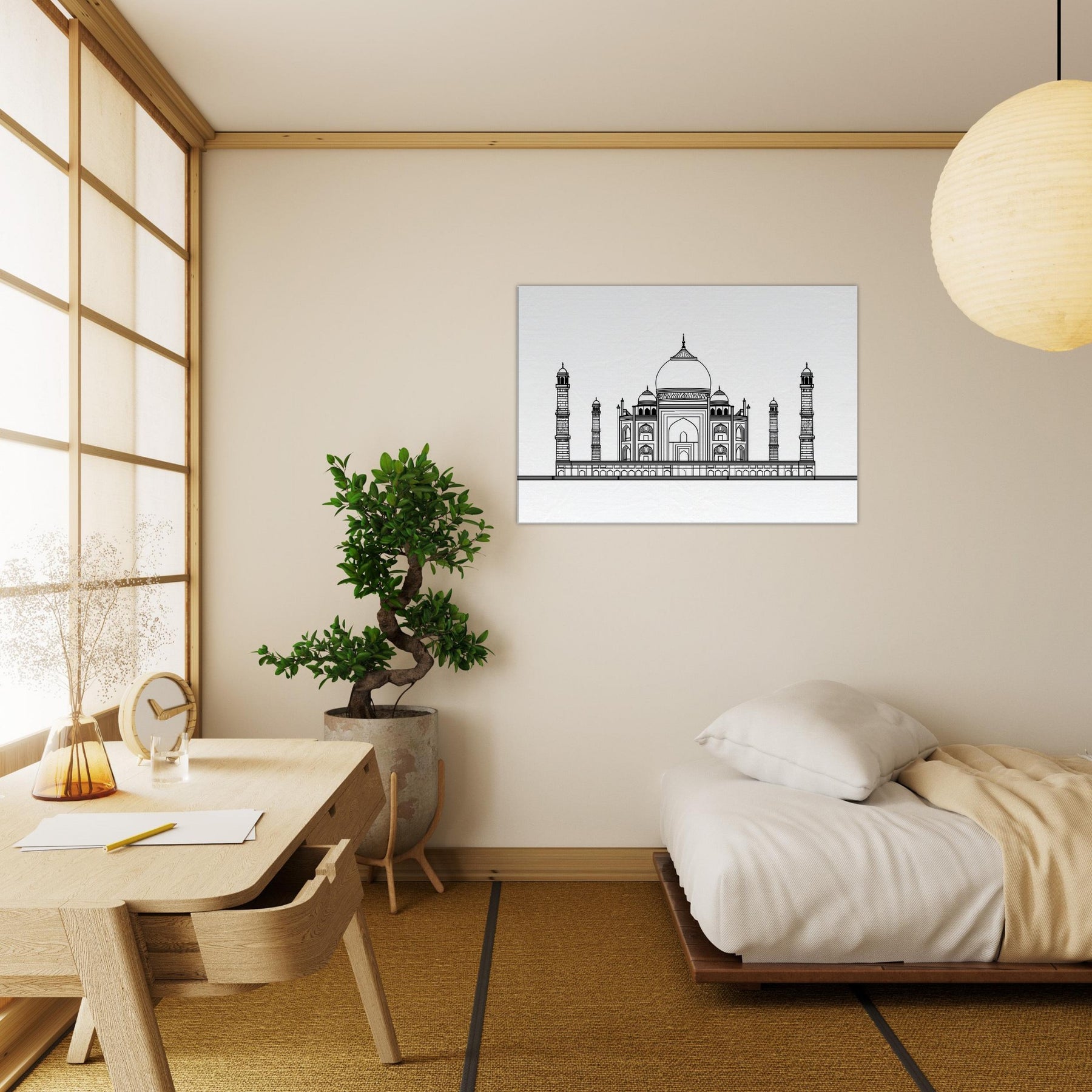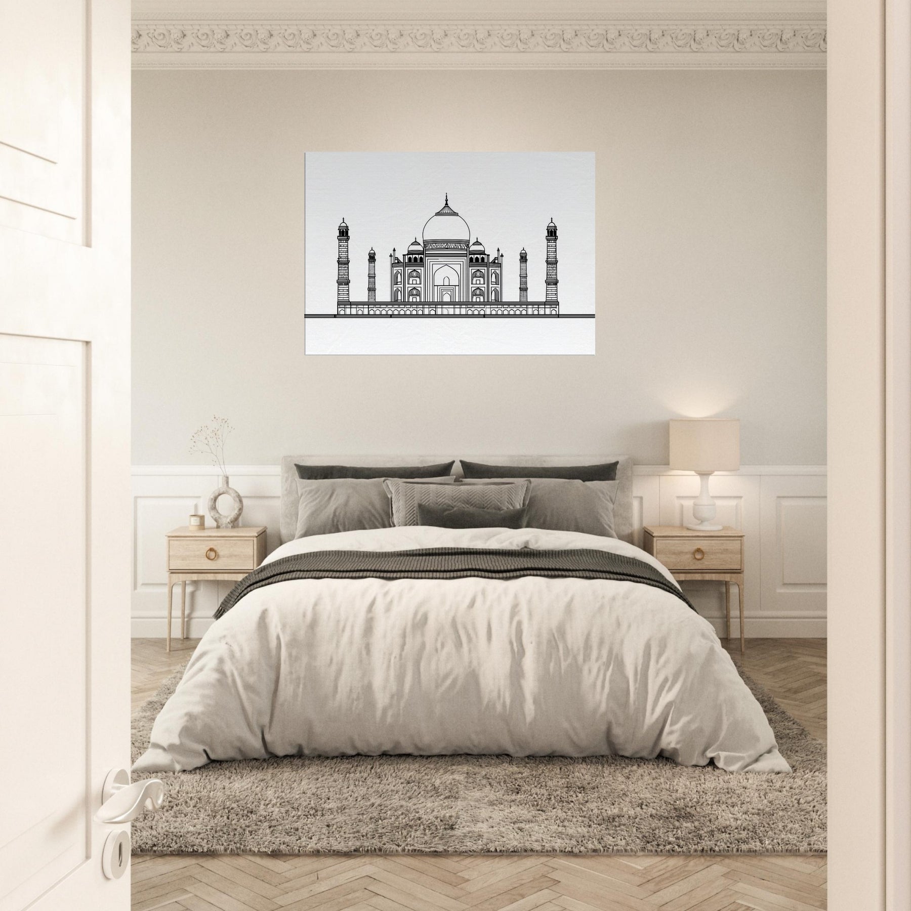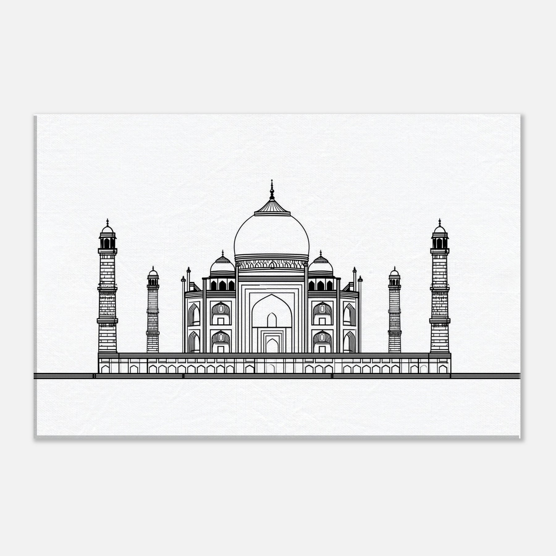 Declare a moment of quiet grandeur with this Taj Mahal line art print. Rendered in a precise, continuous black stroke, the outline distills the monument’s symmetry into elegant simplicity, inviting calm into any room. The generous white space around the drawing breathes, while the bold arcs and minarets offer architectural poetry that complements modern interiors. Perfect hung above a sofa or beside a reading chair, it anchors your living space with timeless mausoleum grace, without shouting, only suggesting wonder.
