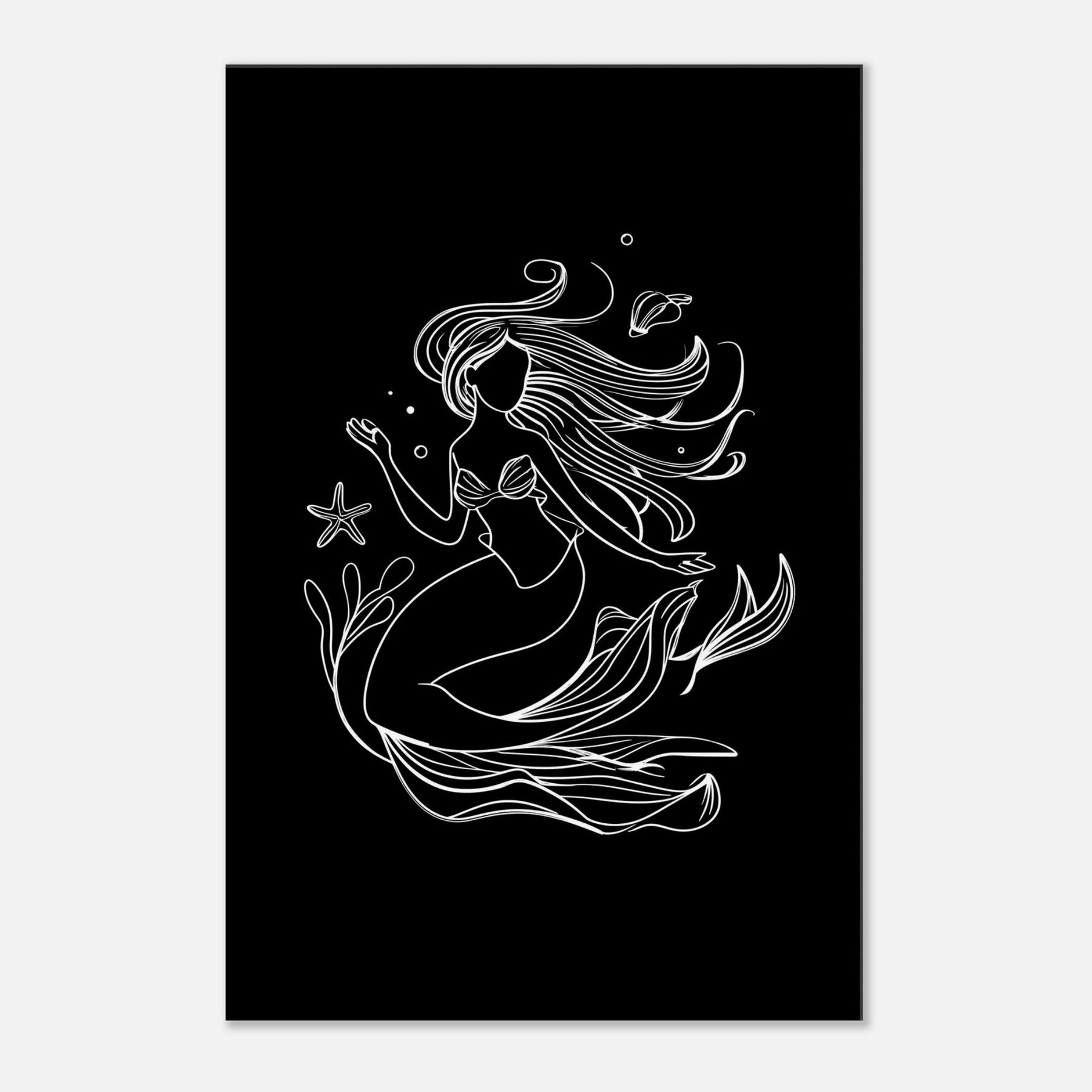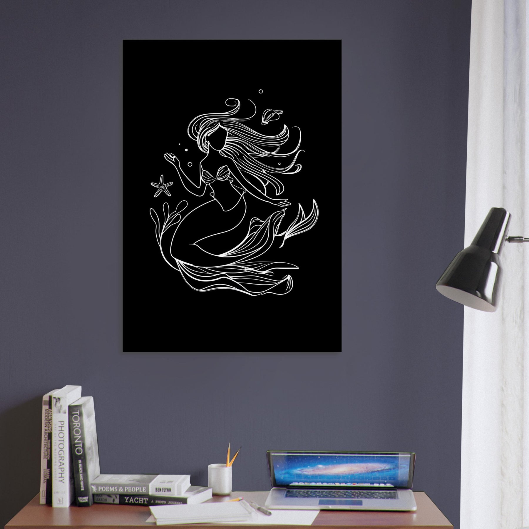 Let the Enchanted Mermaid glide across your wall in a whisper of white lines. This line art pulls the sea into your living room, where breathy curves and poised movement echo in low light. The stark black background makes the figure glow, inviting quiet wonder. Perfect above a sofa or bed, it adds a tide of calm, dreamlike energy, pairing coastal grace with modern restraint for a refined, imaginative atmosphere.