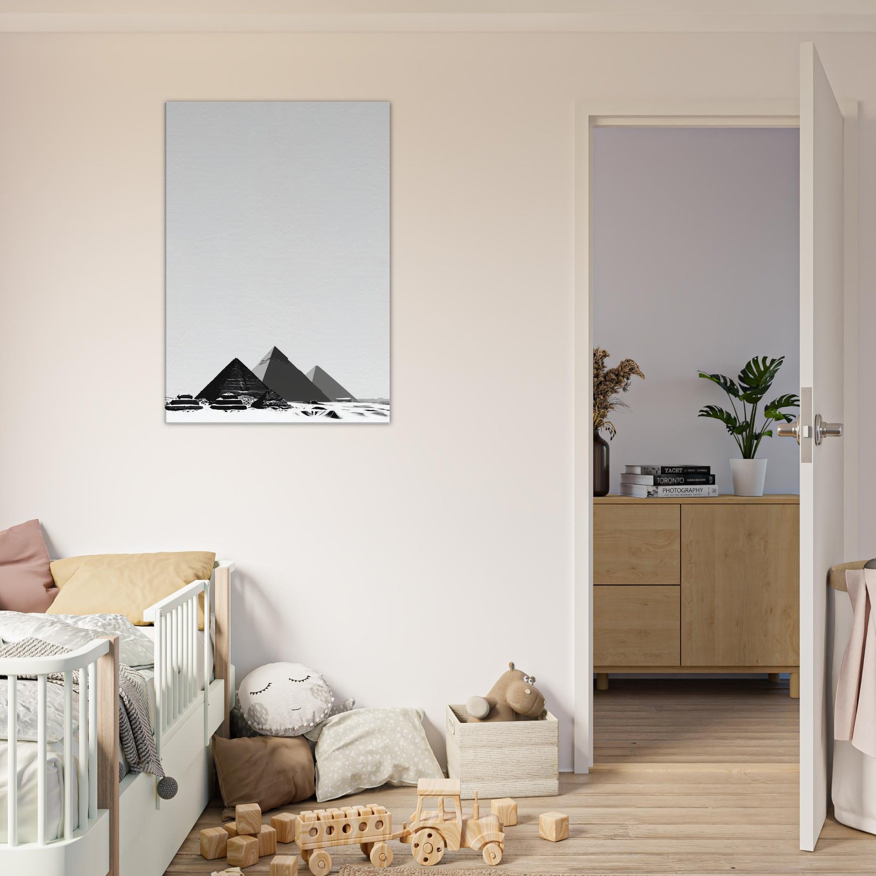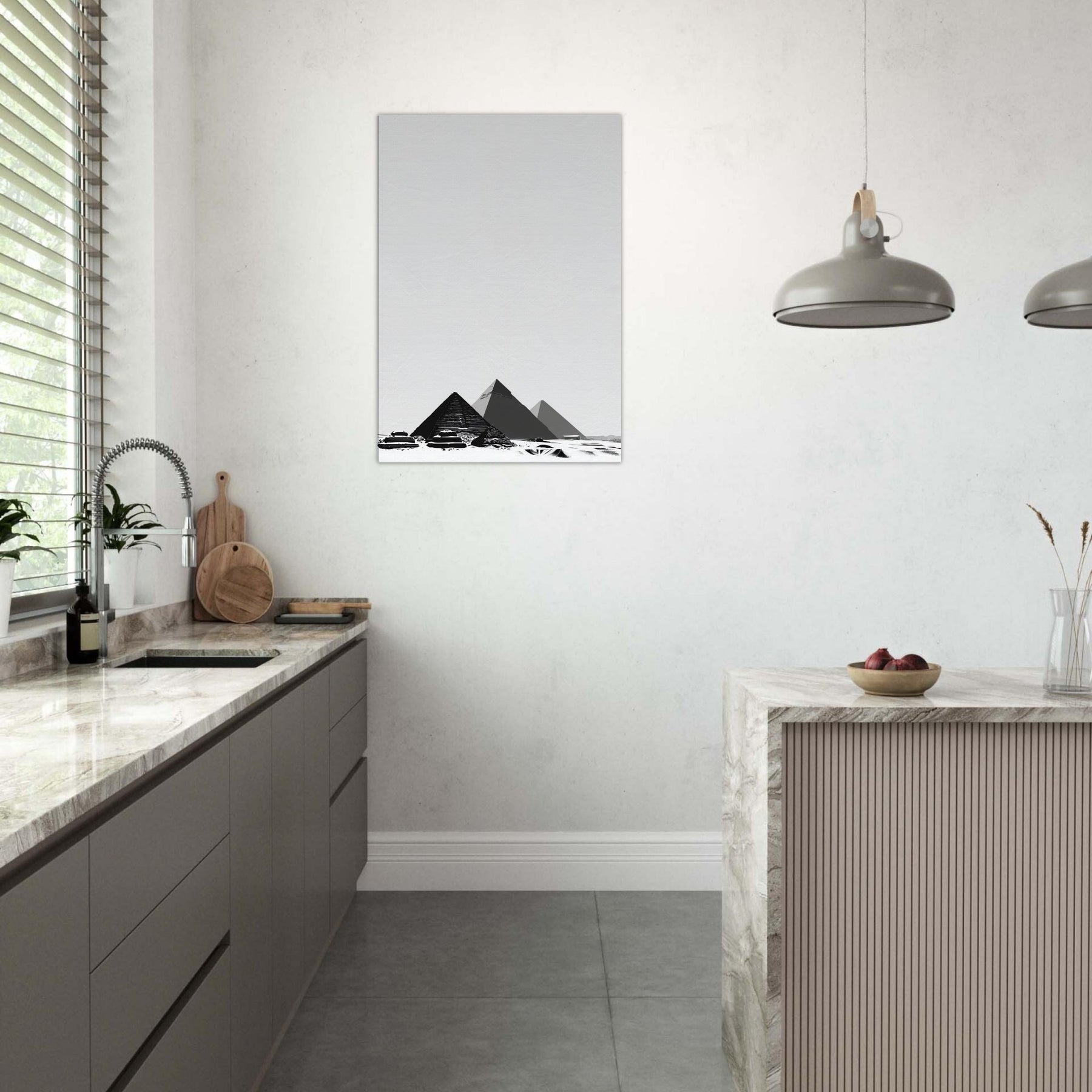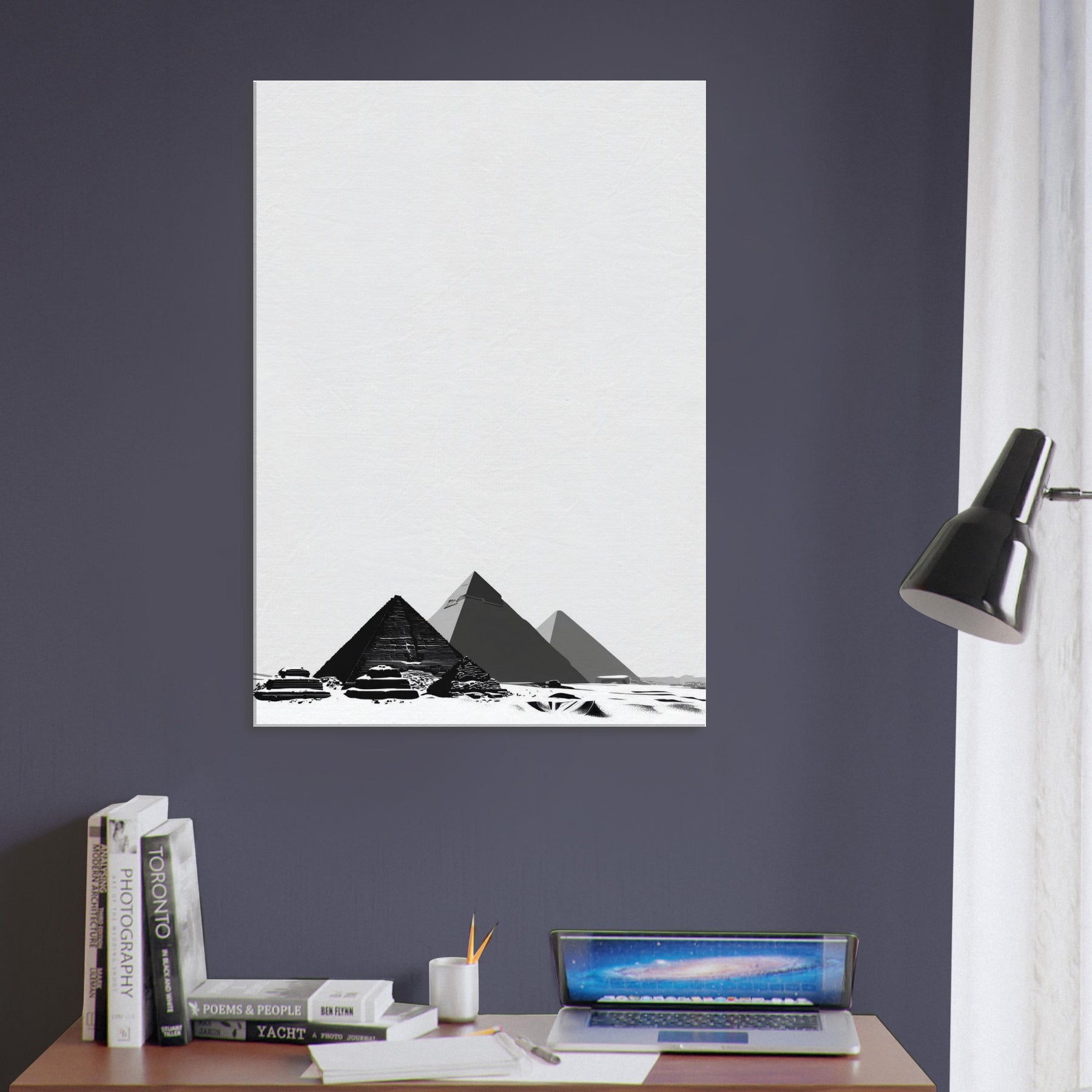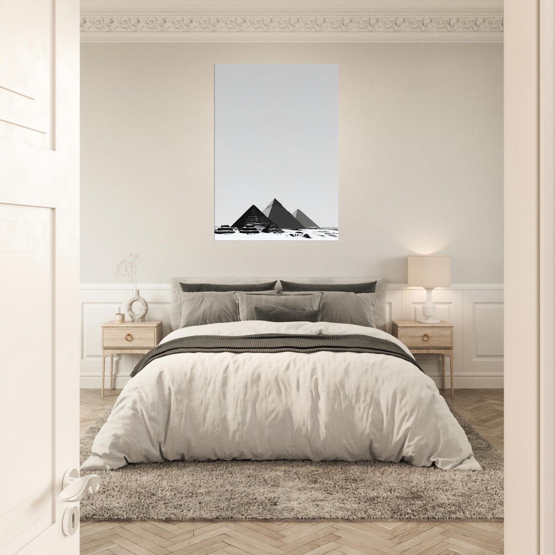 Step into a hush of ancient light with this Pyramids of Giza line art print. The slender black contours carve a timeless skyline, inviting contemplation as if strolling between sands at dusk. We framed in negative space for a breath of calm, letting the quiet geometry of pyramids become a focal point in living rooms, hallways, or study corners. A versatile, elegant accent that pairs with modern neutrals and soft textures.