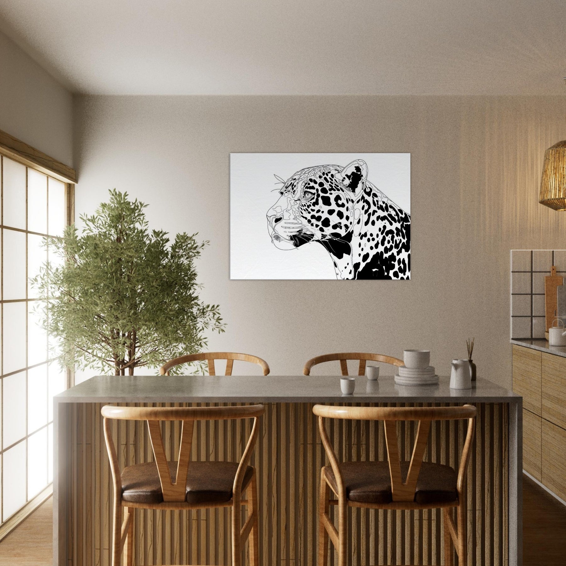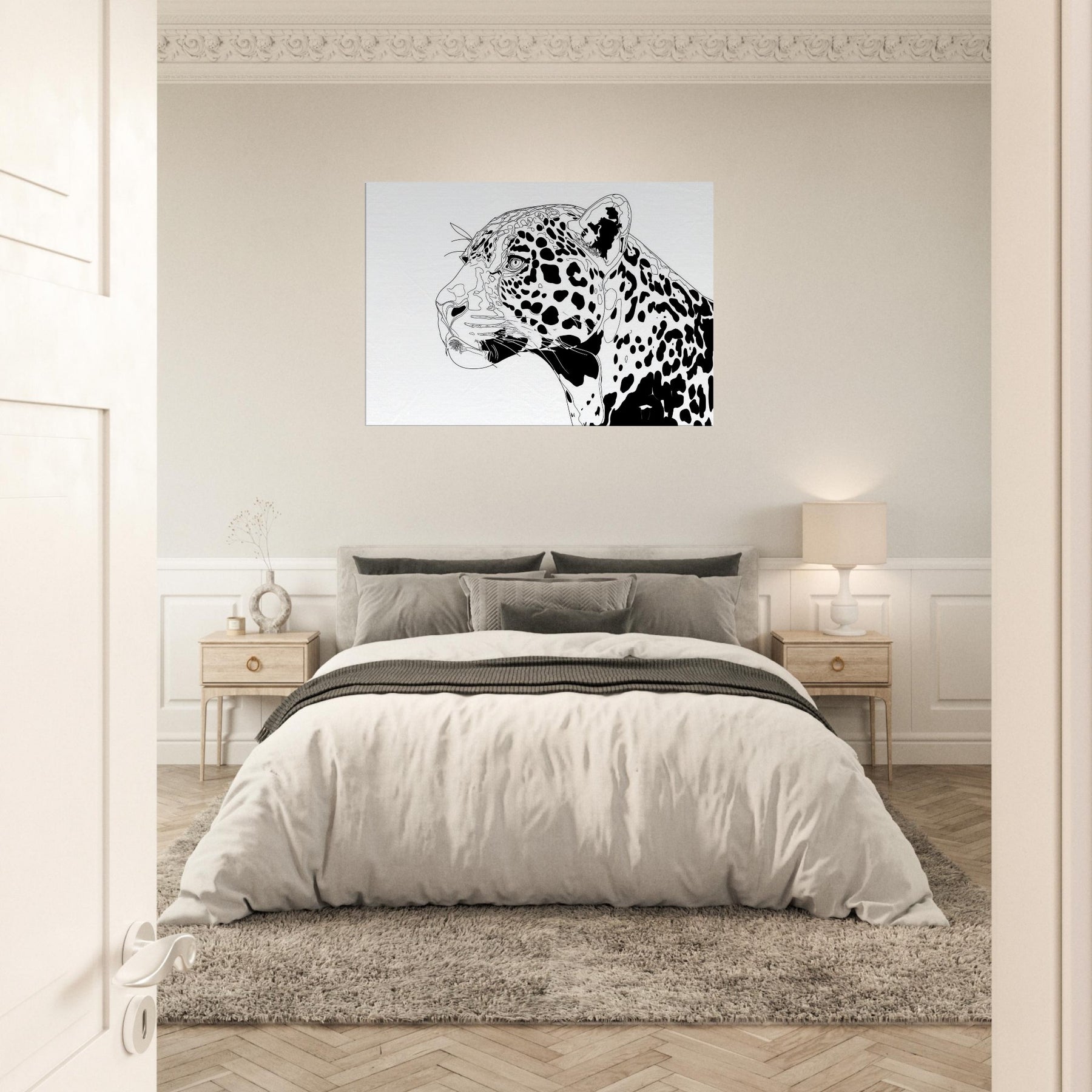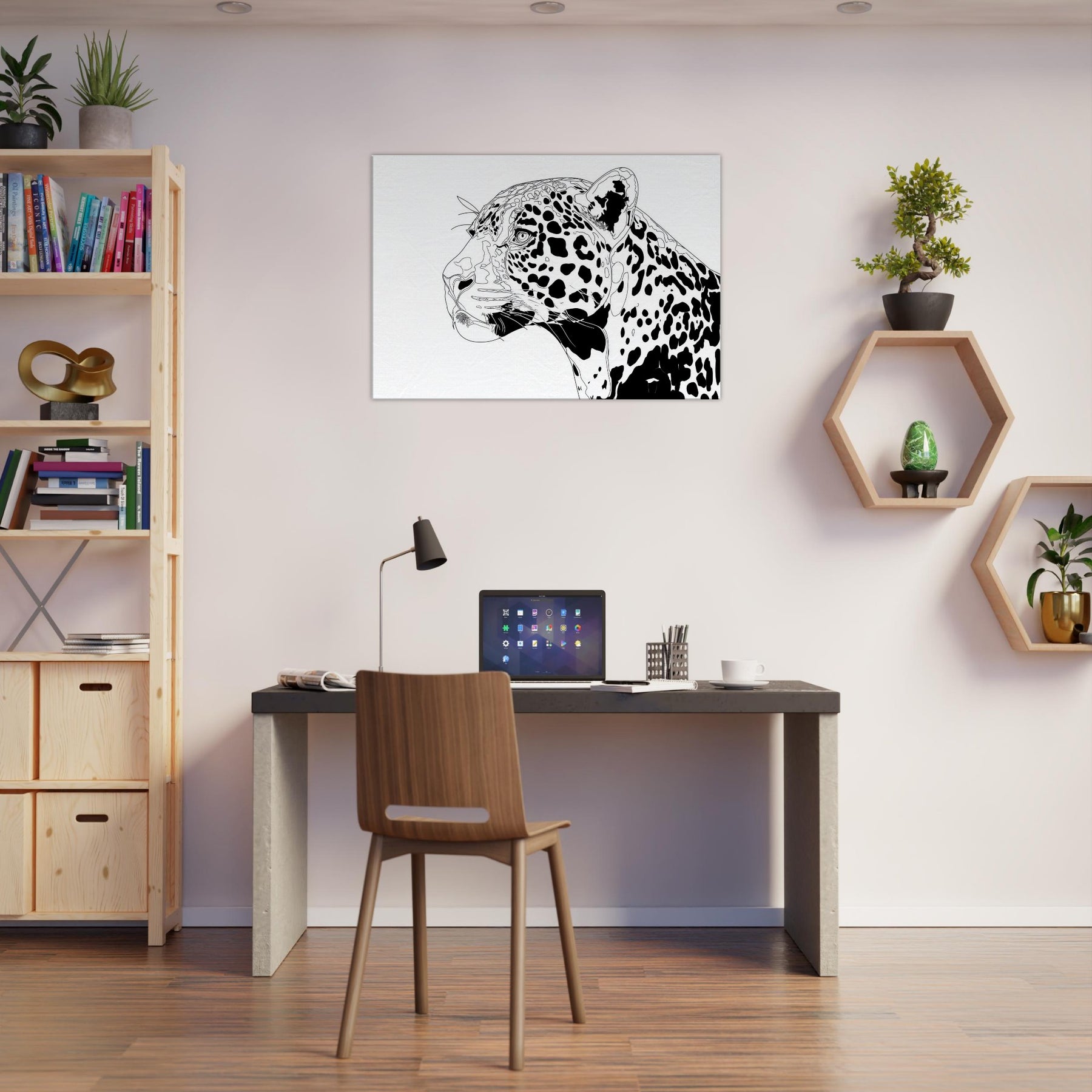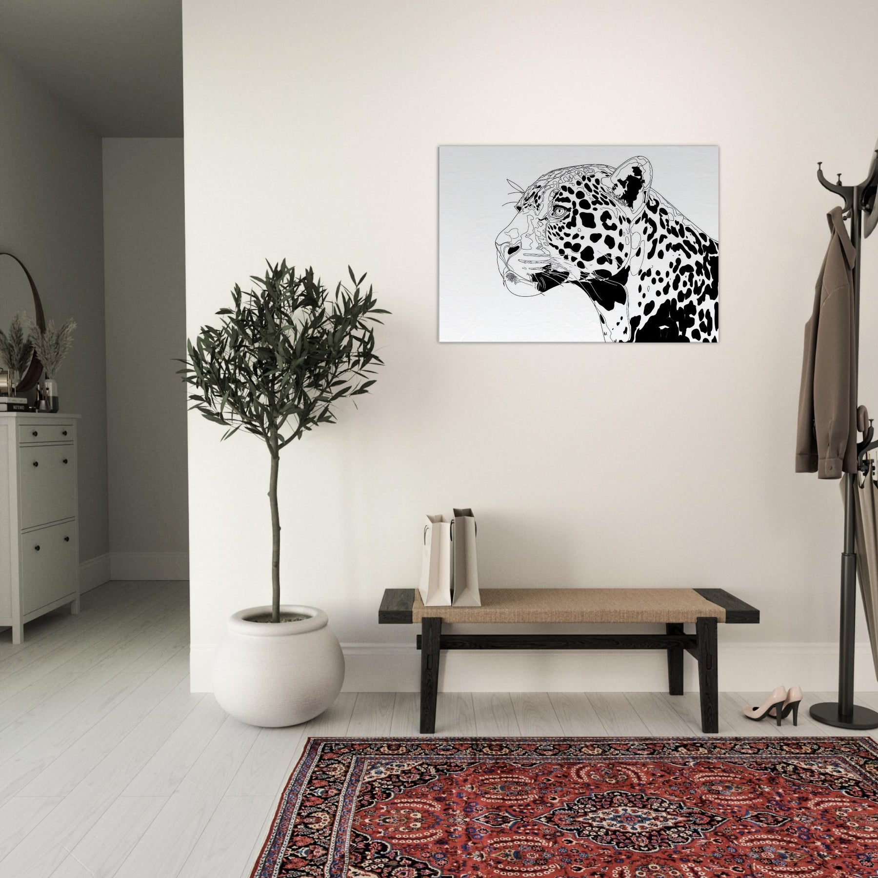 This minimalist composition centers the Jaguar, the primary subject, in clean, uninterrupted lines, letting light and shadow breathe across the page. The absence of color heightens the animal’s poised, watchful presence, turning a simple outline into a quiet drama that invites reflection. Hang it in a living room or entryway to spark calm energy and focus; the piece pairs beautifully with steel, wood, or marble accents, creating a serene backdrop that enhances conversation, contemplation, and everyday moments.