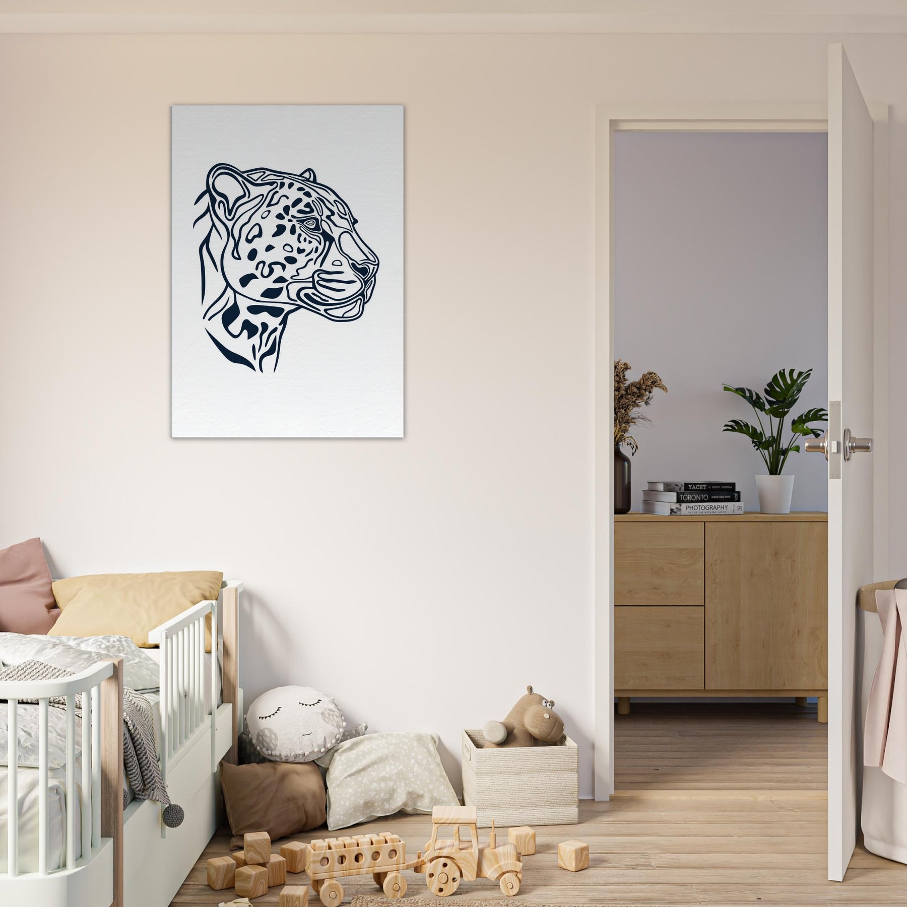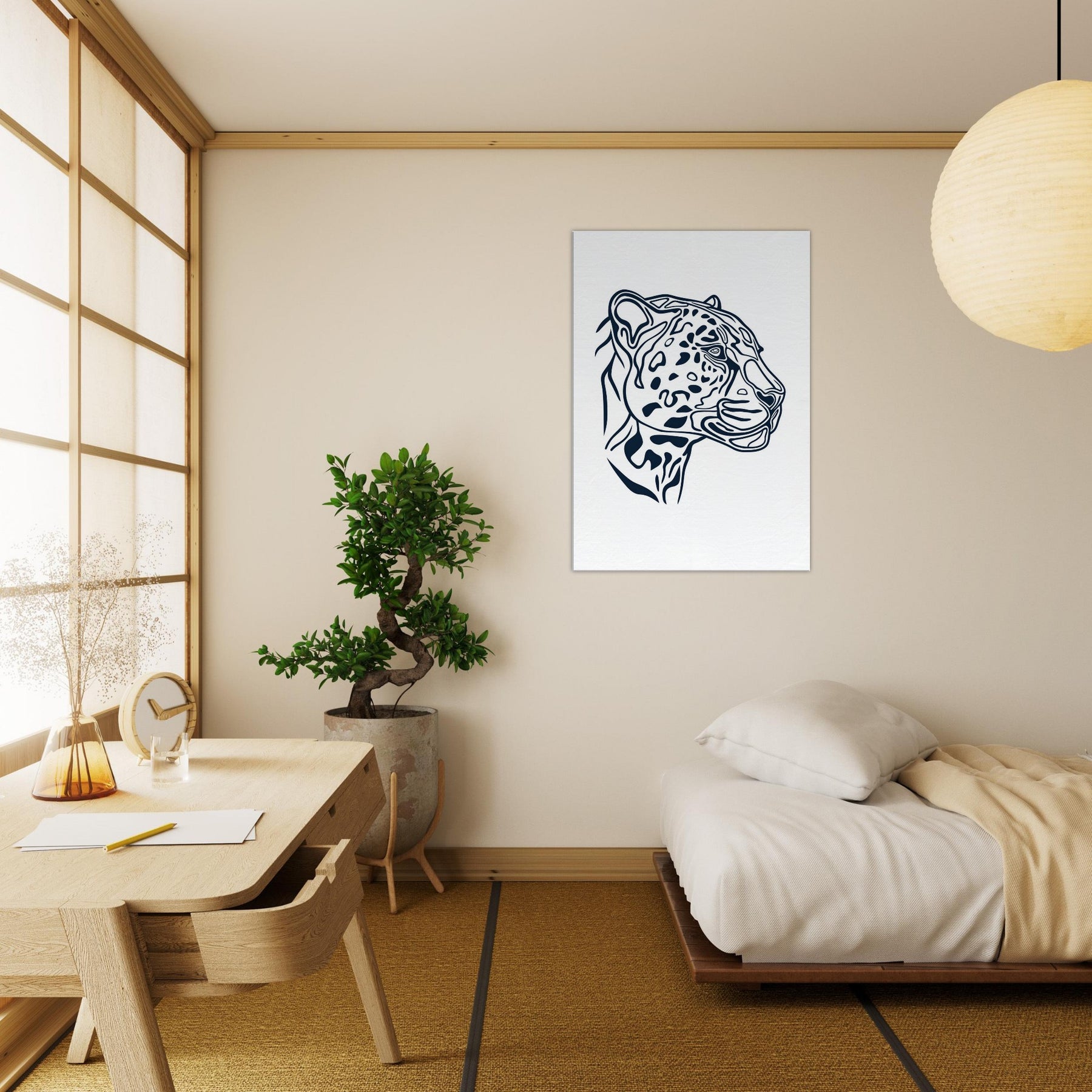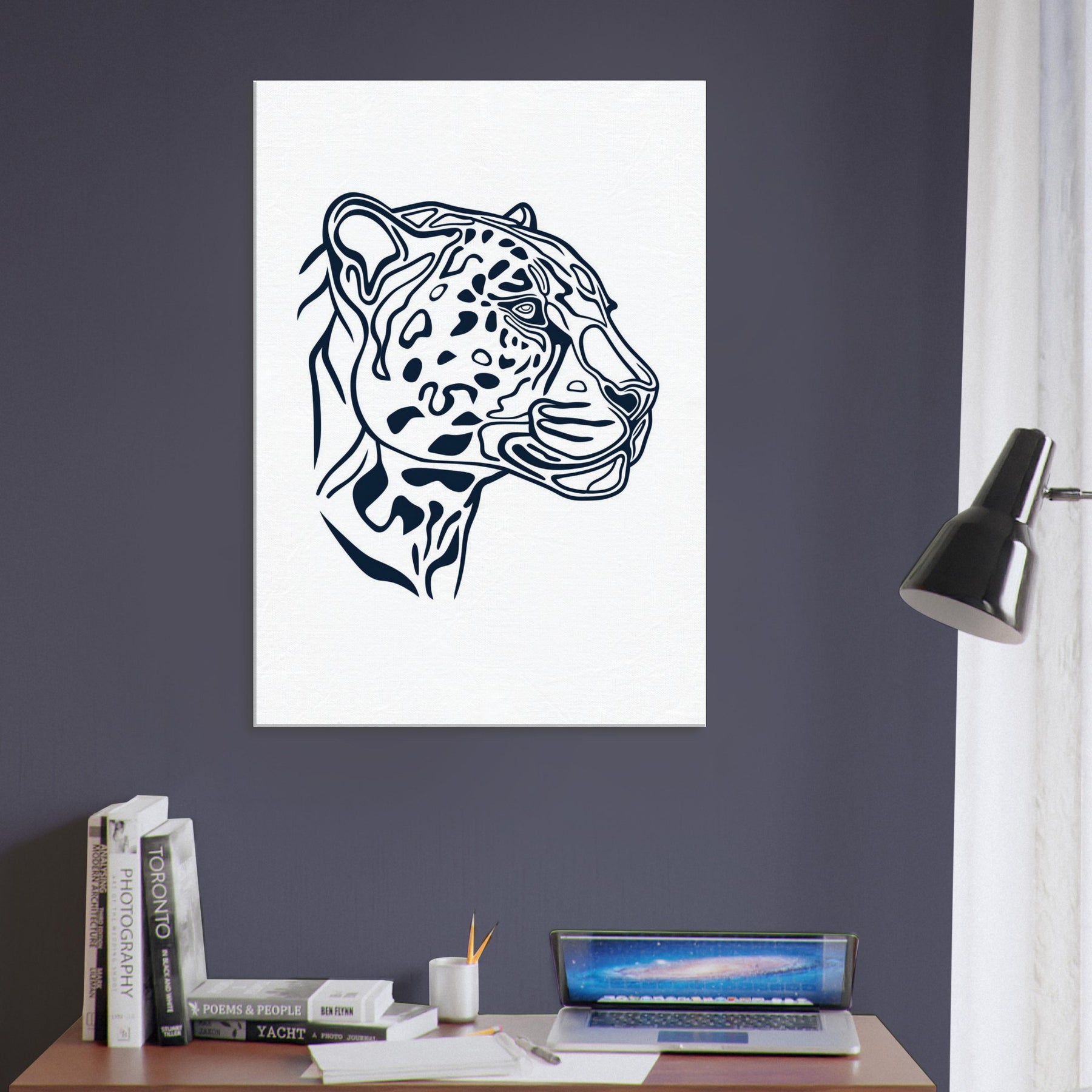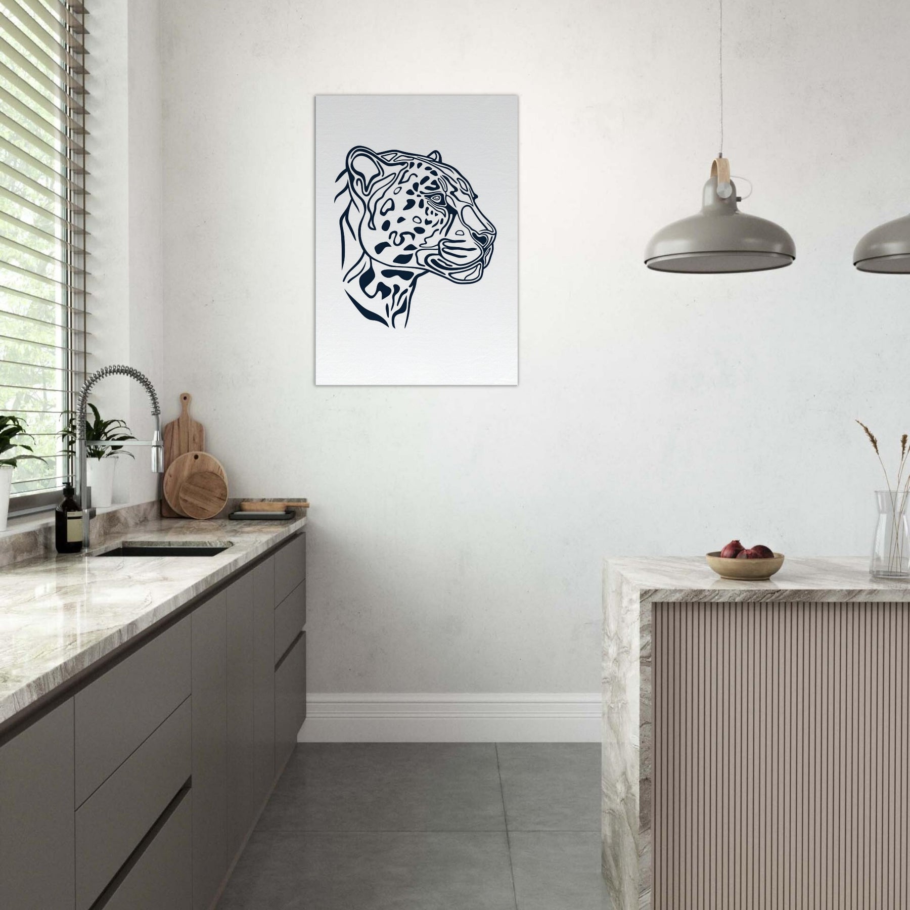 This minimalist uses clean, confident lines to evoke the jaguar's poised presence. The negative space and tapered curves invite the eye to follow the animal's form, turning a fierce gaze into a serene focal point. Perfect for a calm living room or study, it adds a memorable, modern aura without dominating the scene. Let the jaguar silhouette glow on a white wall, slowing time and inviting thoughtful, sensory appreciation of nature inspired art.