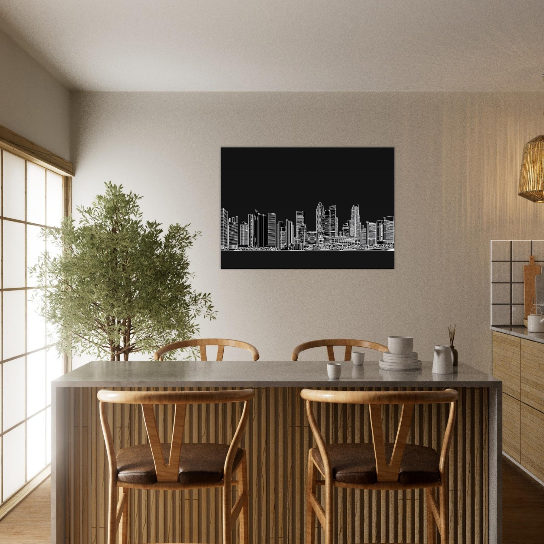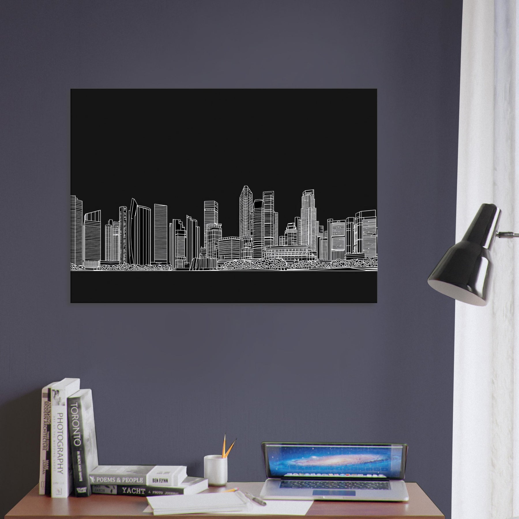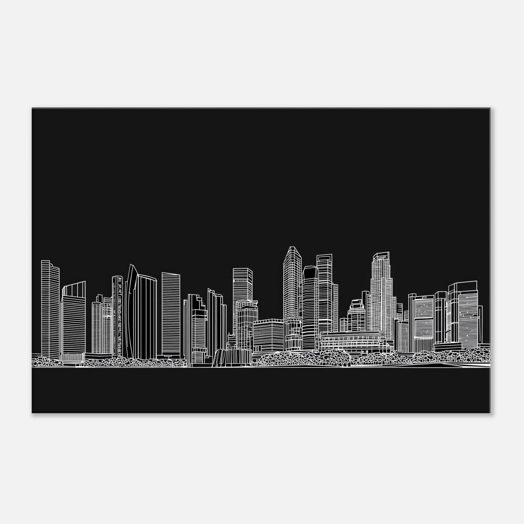 This line art skyline captures Singapore in a breath of lucid white on a velvet black field, where every contour suggests movement and memory. The minimalist contours trace towers and bridges with quiet poise, turning a wall into a window bright, expansive, and somehow intimate. Hang it in a living room or study to invite clarity, to slow the eye as city lights dissolve into rhythm. The piece complements modern interiors, pairing bold structure with serene contrast for a calming focal point.