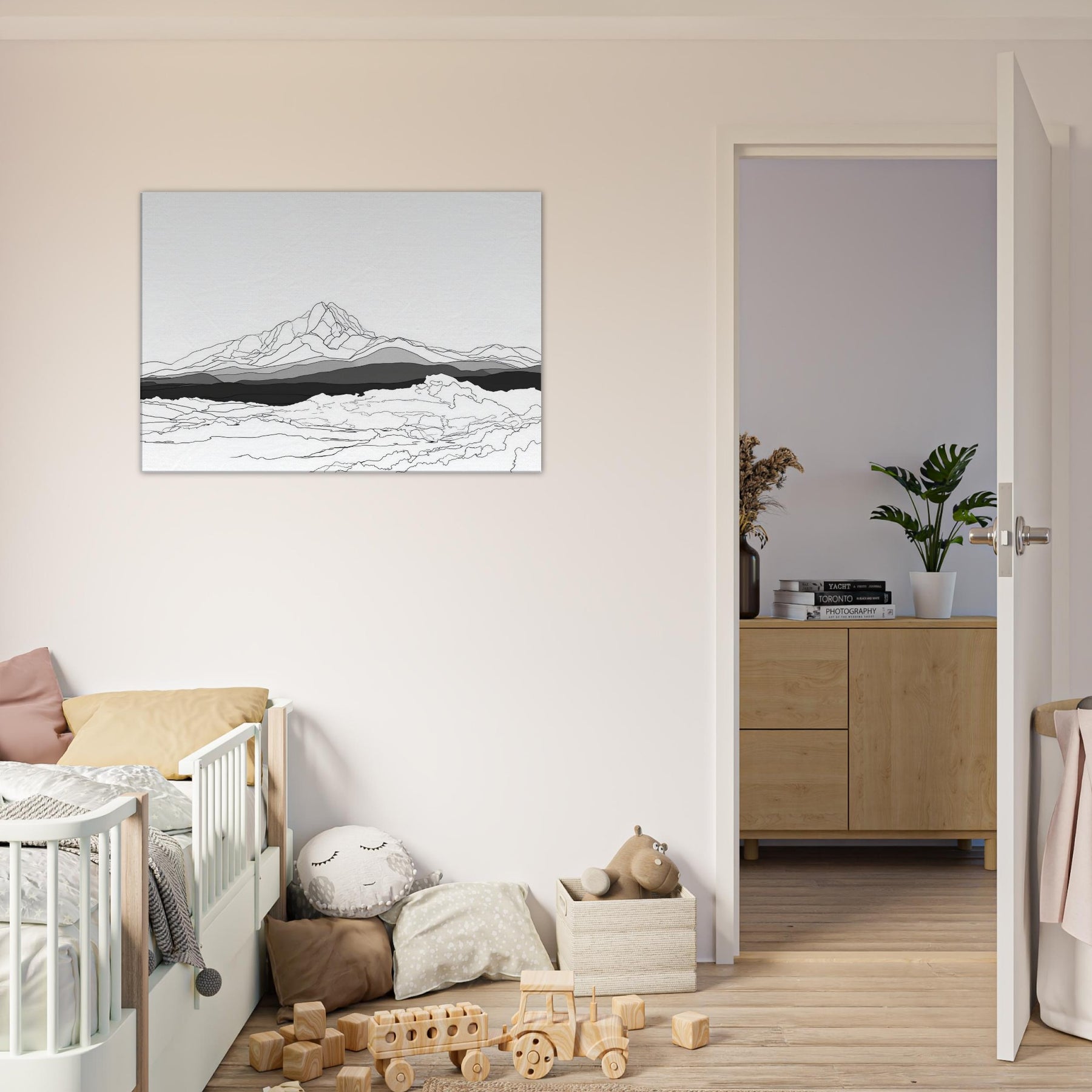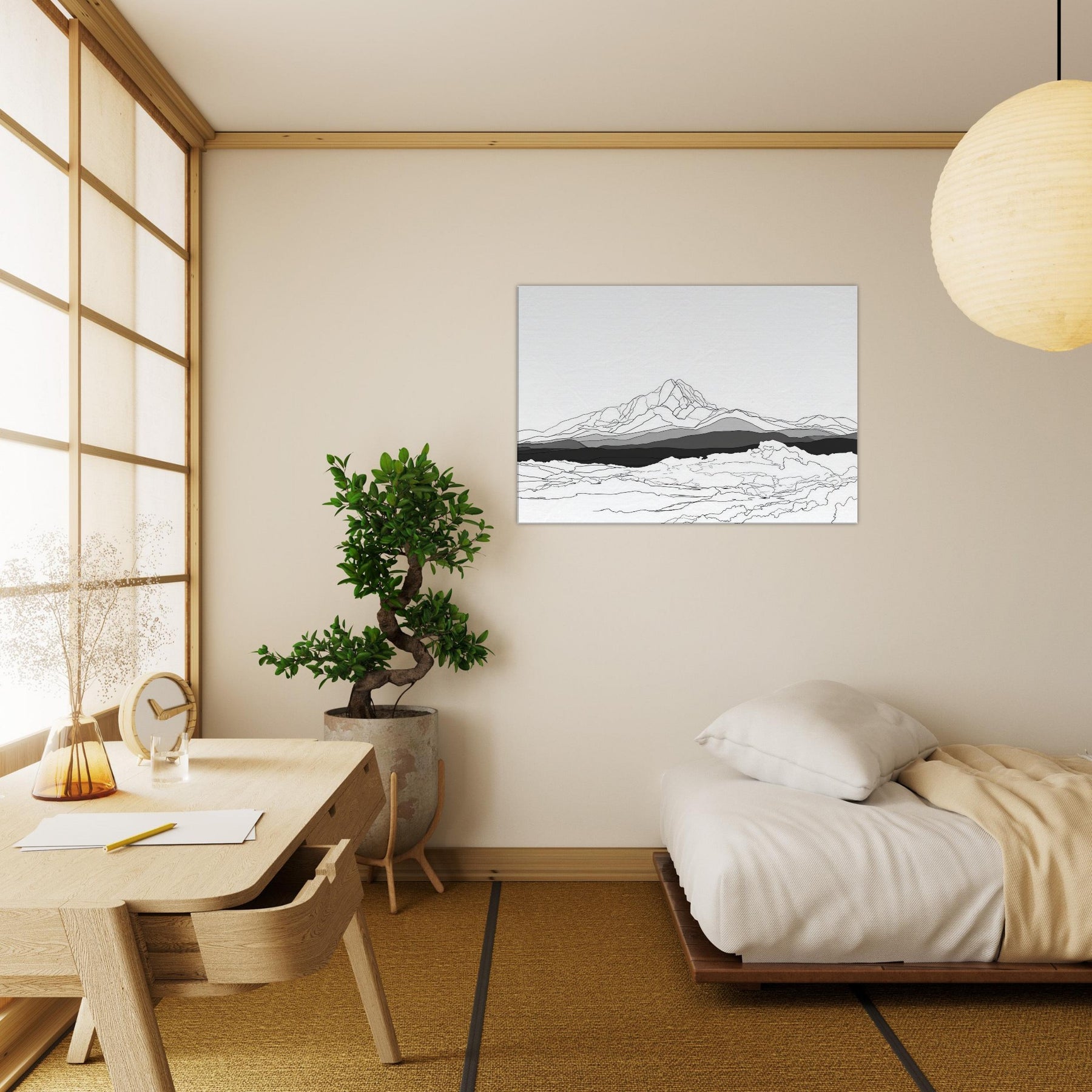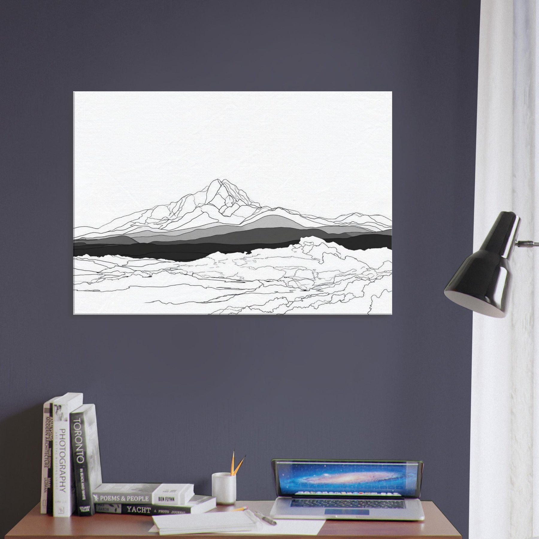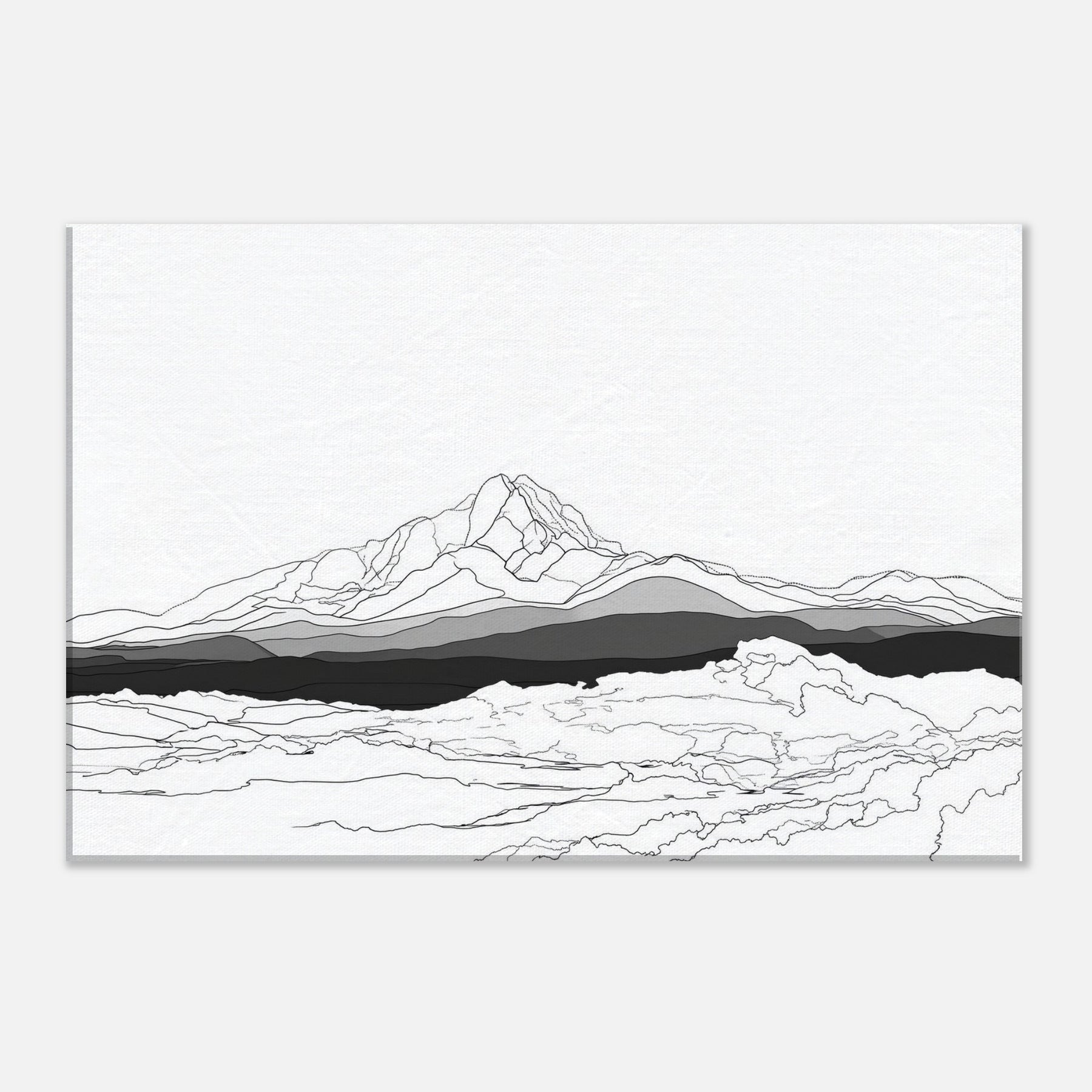 Let the quiet drama of the night unfold on your wall. This line art stages a sweeping horizon where peaks rise like whispered notes beneath a pale aurora, rendered in clean lines and layered grayscale. The Aurora Borealis is suggested through luminous restraint, inviting calm focus and contemplative space. Hang it in a living room or study to evoke spacious evenings, where light moves with subtle grace and the atmosphere becomes a gentle, timeless companion.