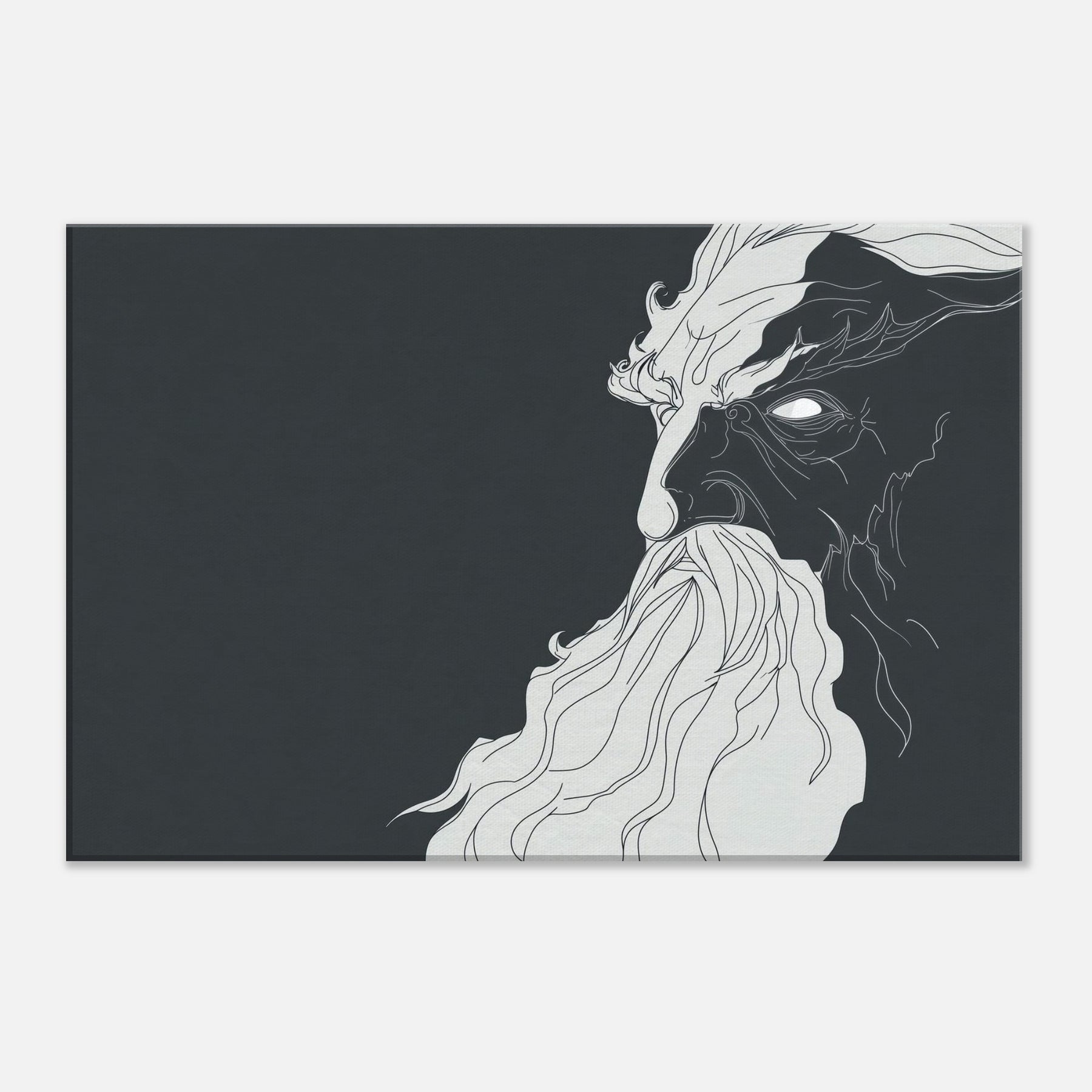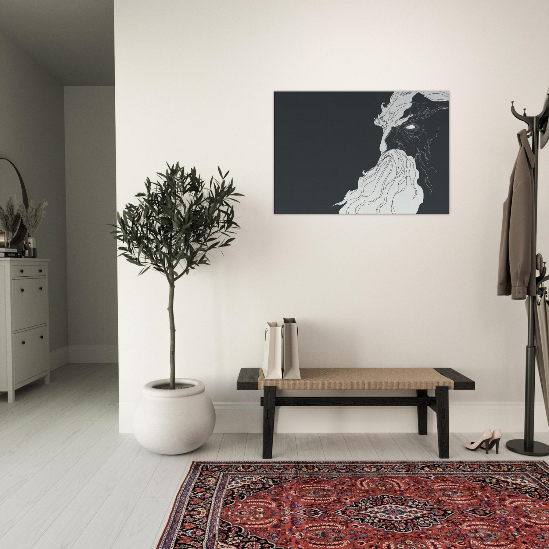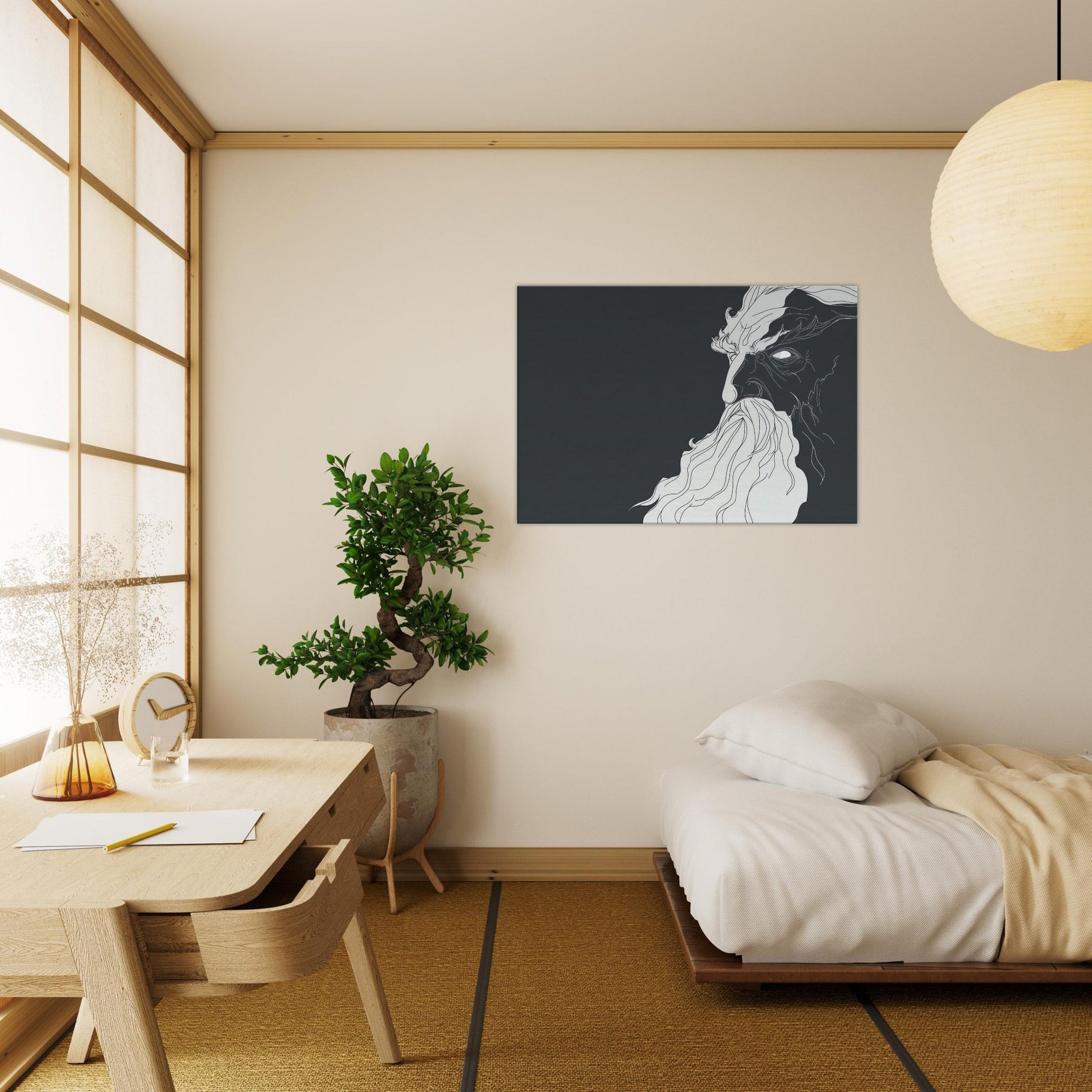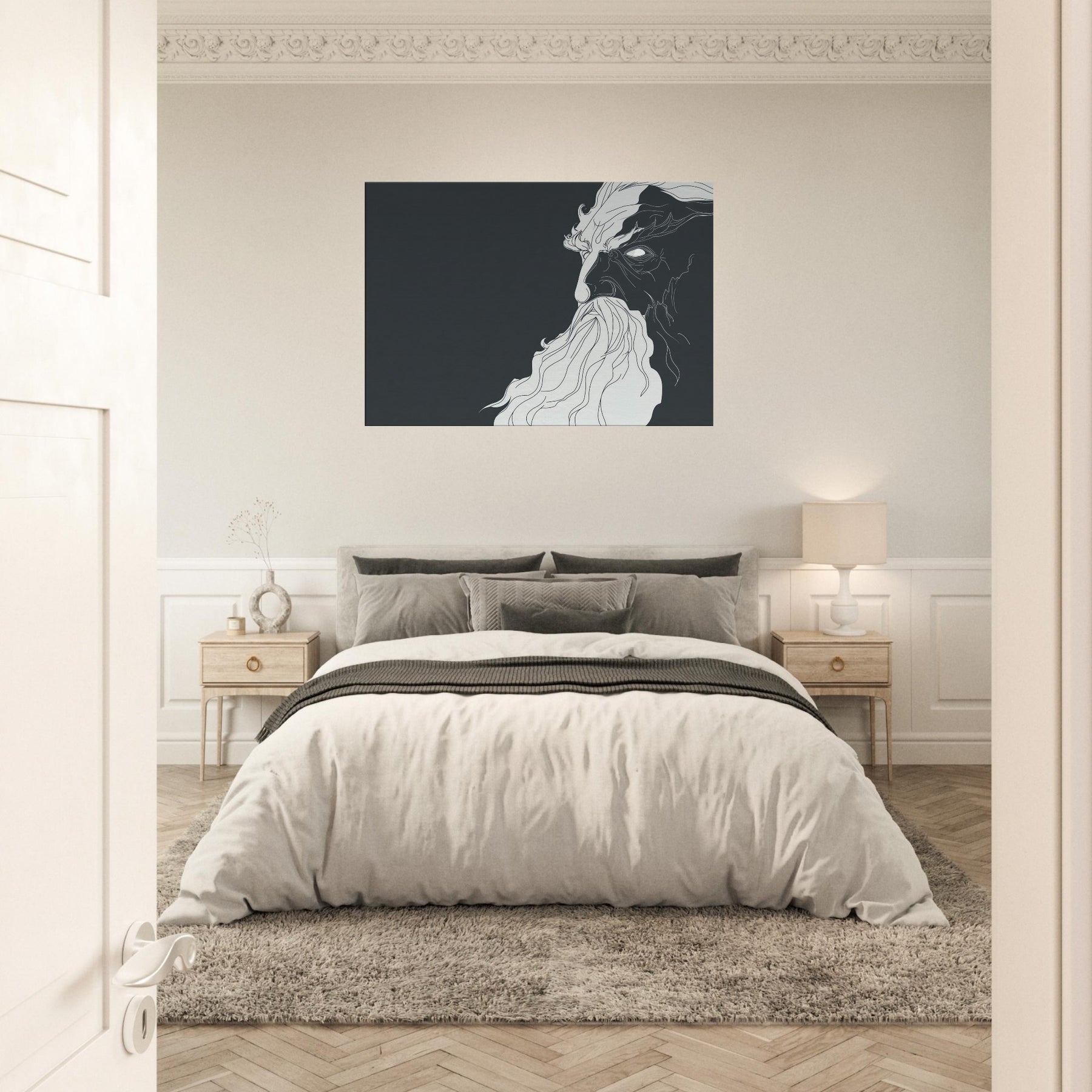 An austere, luminous silhouette: Odin, the All Father with a long beard and one eye, rendered in crisp line work against a moody backdrop. This piece breathes ancient wind and myth into a modern room, inviting quiet contemplation and a sense of legend. The restrained contrast and flowing contours skim the surface of power and wisdom, turning a wall into a portal perfect for a living space seeking serenity, depth, and a touch of timeless prophecy.