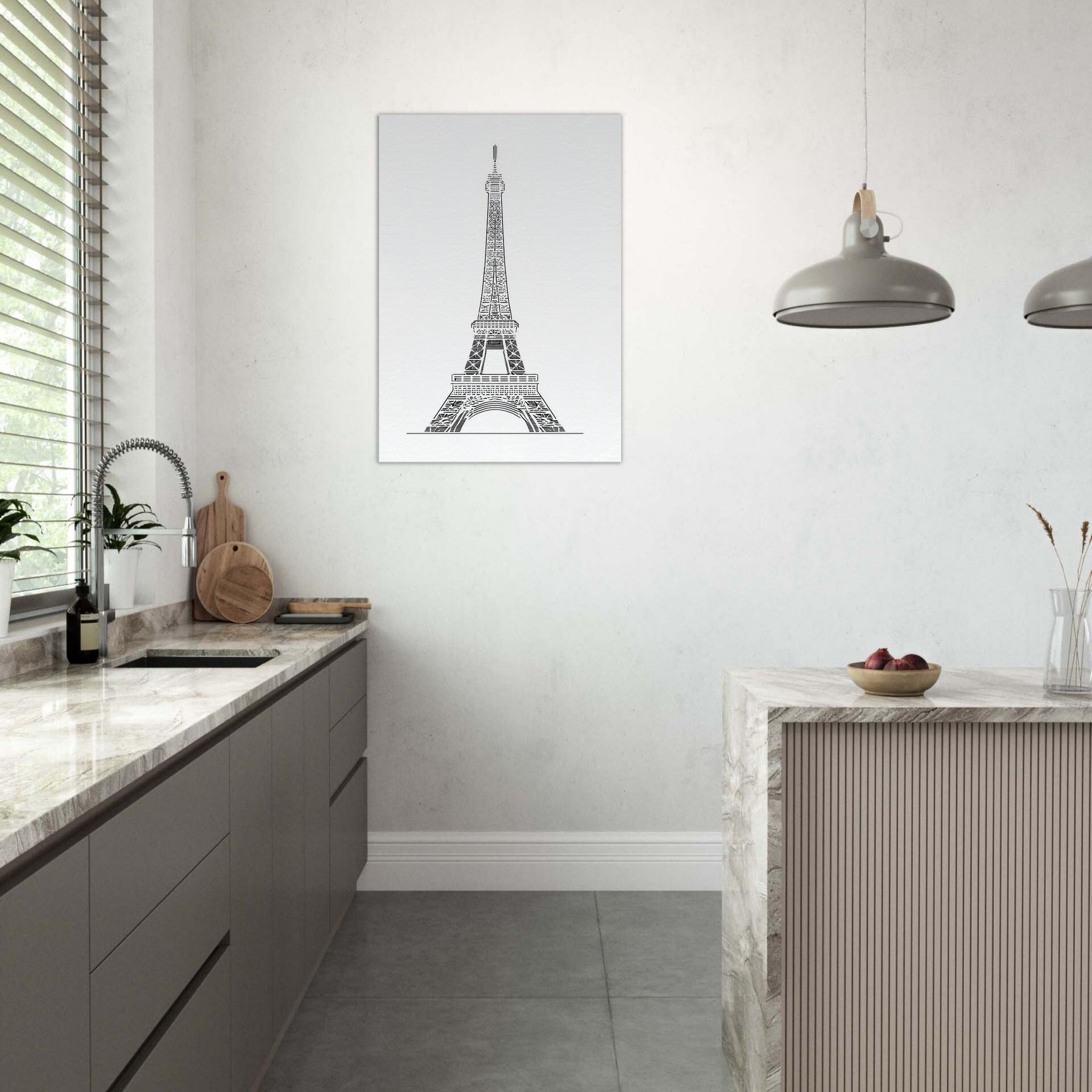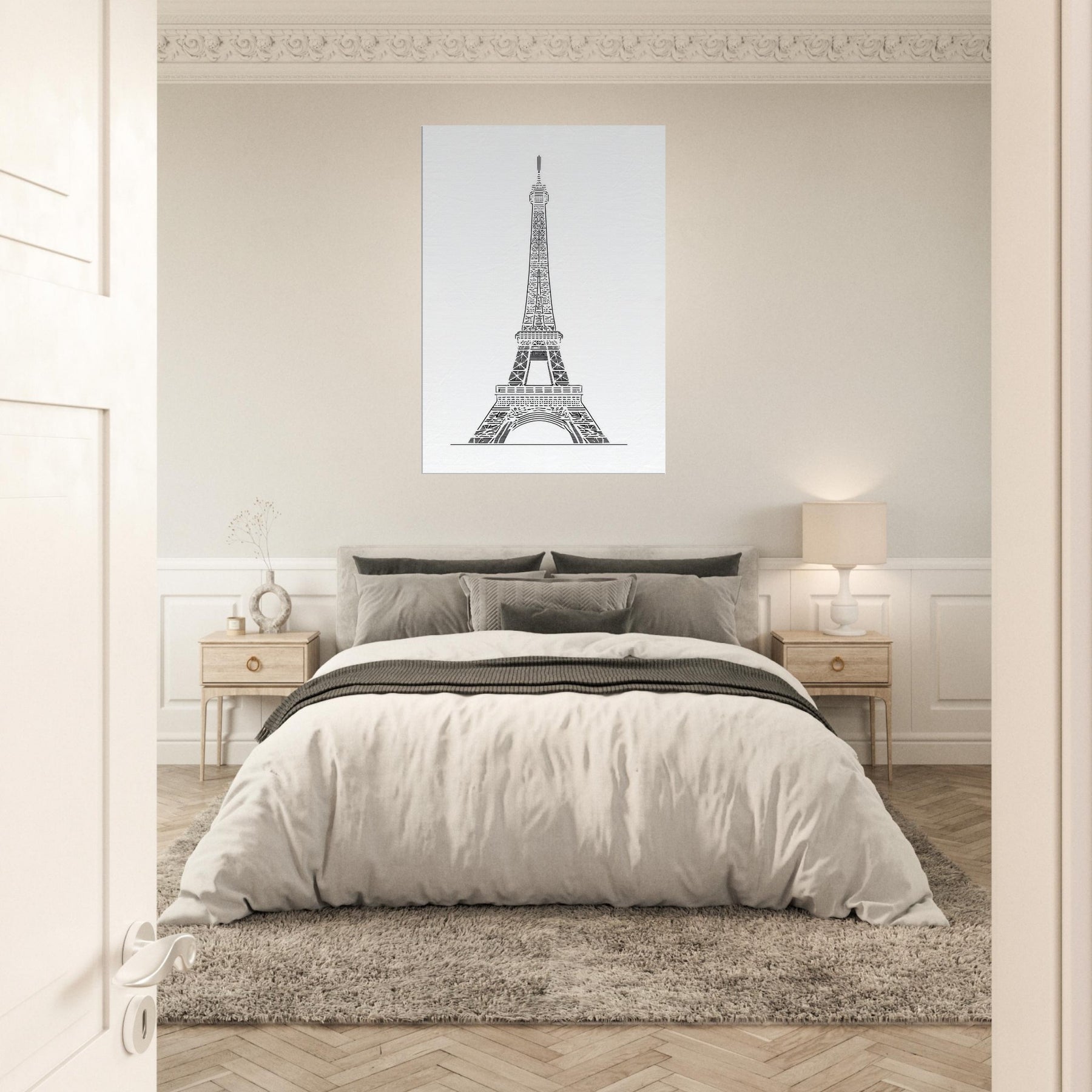 An ink inspired silhouette of the Eiffel Tower unfolds with refined simplicity. This line art print captures Paris's timeless glow in crisp black on white, inviting a quiet, luminous mood to your space. Hang it where daylight meets shadows to evoke strolling along the Seine; the gleam of tall spans and delicate details breathes clarity into a living room or office. A modern centerpiece that pairs with minimal furnishings, it elevates texture, balance, and urban wonder.