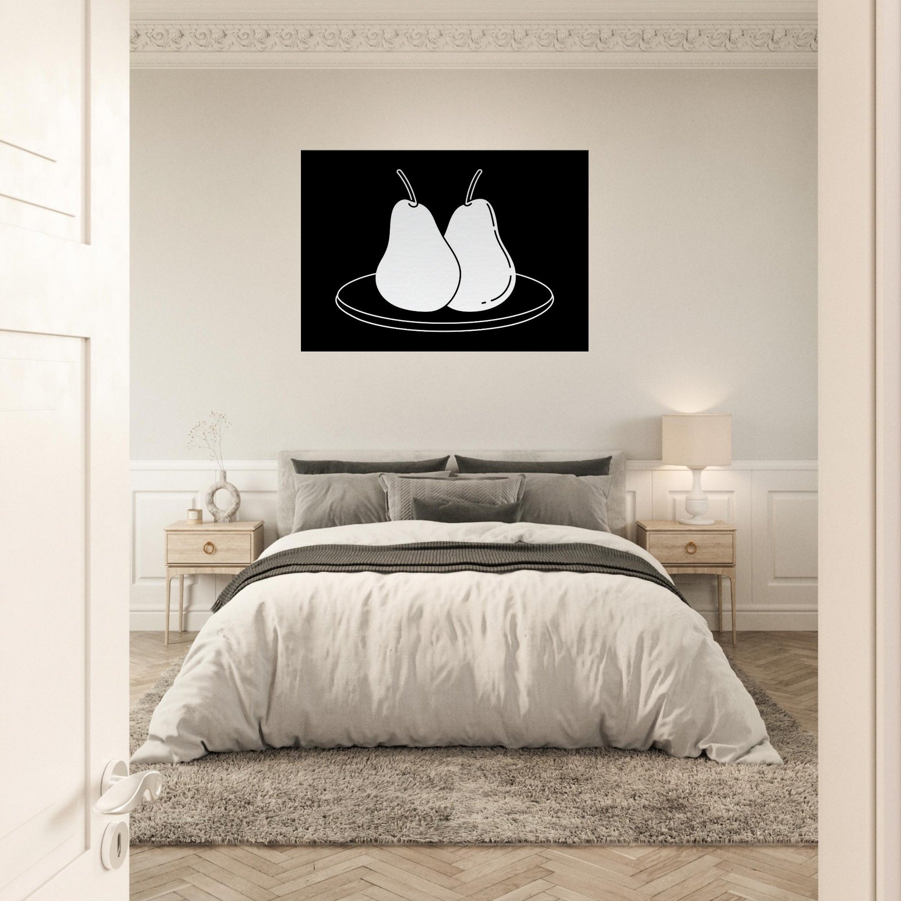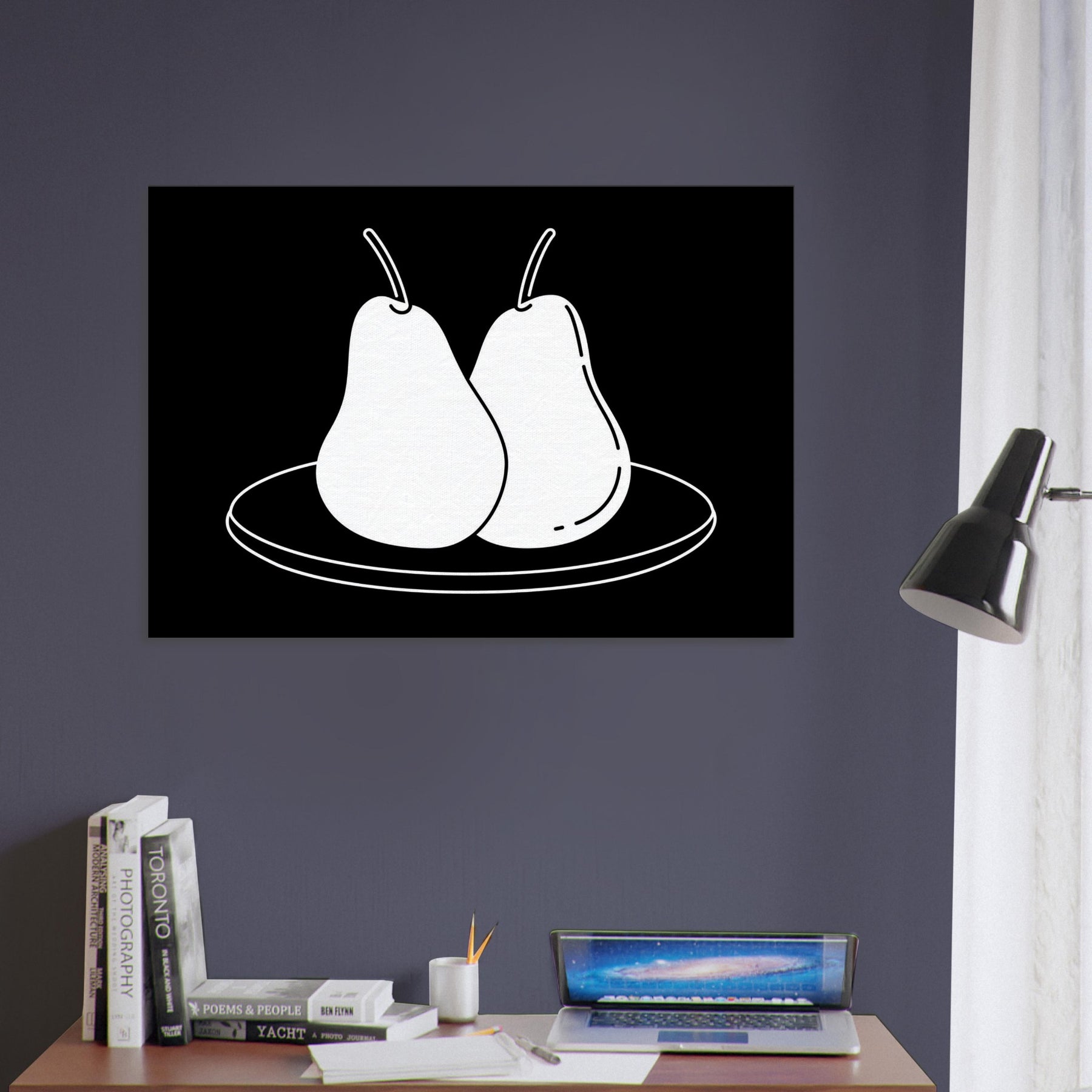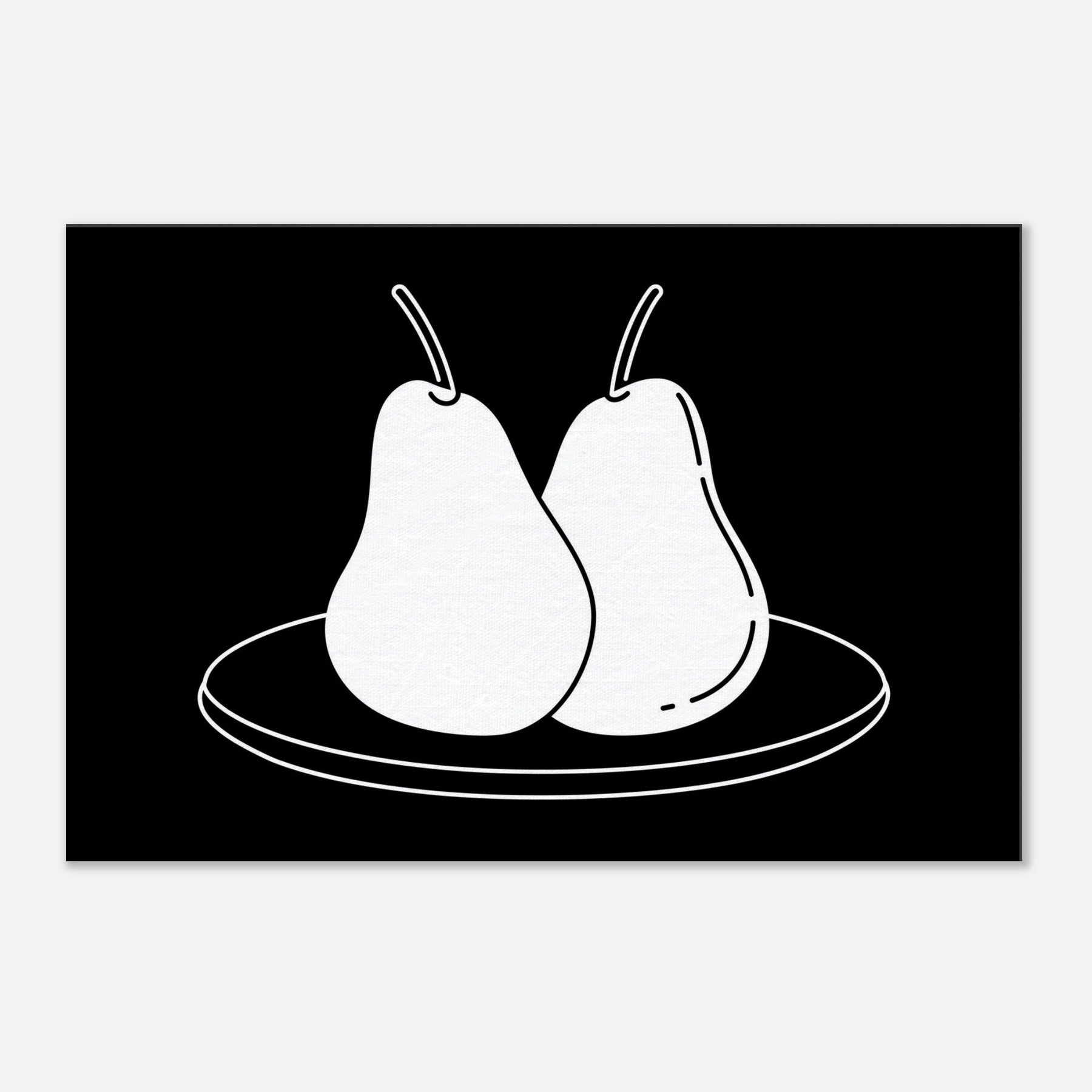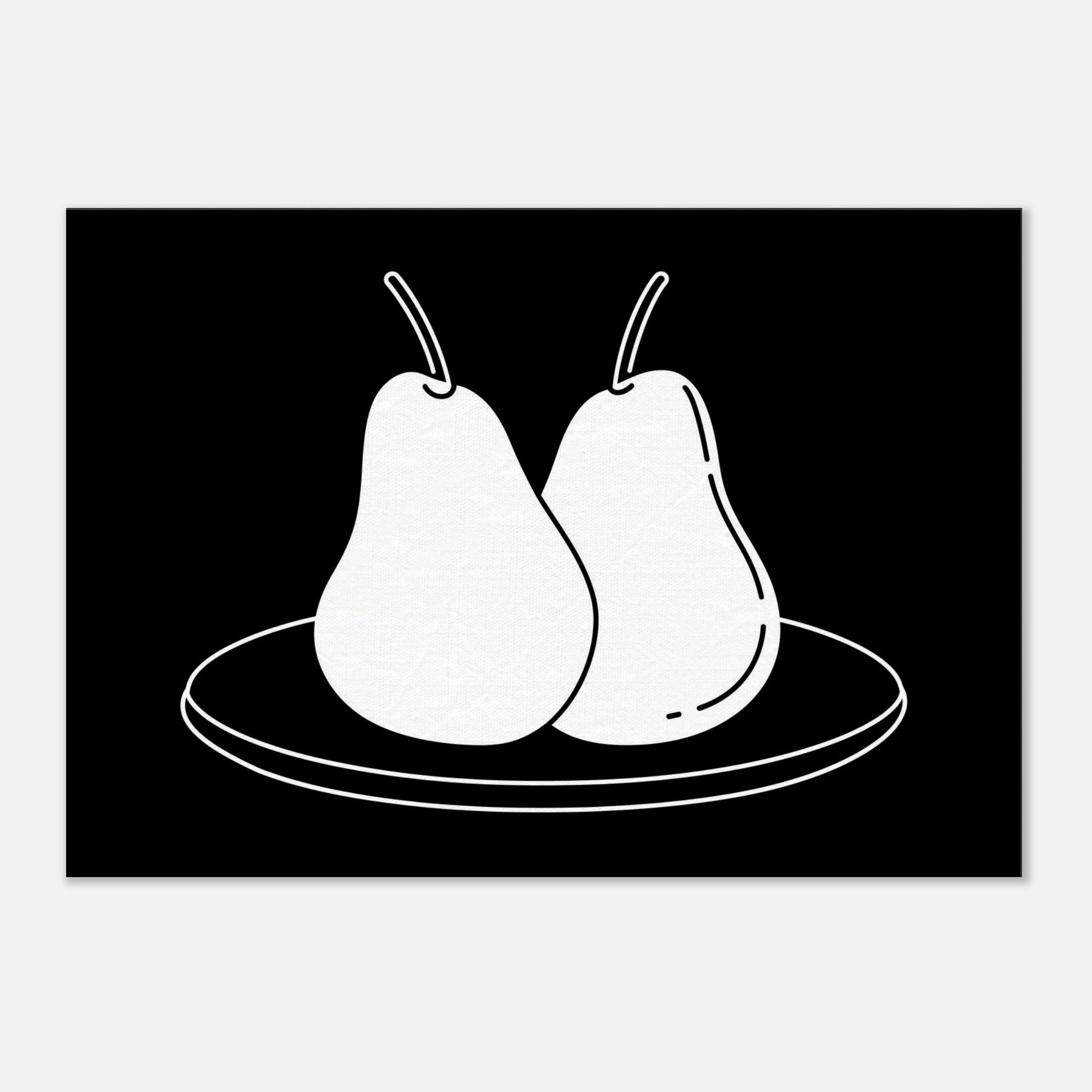 This study of Pears on Plate unfolds in clean, confident lines that invite a moment of calm. The stark black background makes the white form glow, turning a simple kitchen still life into a modern emblem of balance and restraint. Hang it where you crave quiet focus a dining nook, a sunlit hallway, or above a sofa and let its pared back elegance sharpen conversation without shouting. A timeless nod to everyday beauty, Pears on Plate pairs beautifully with neutrals and warm woods alike.