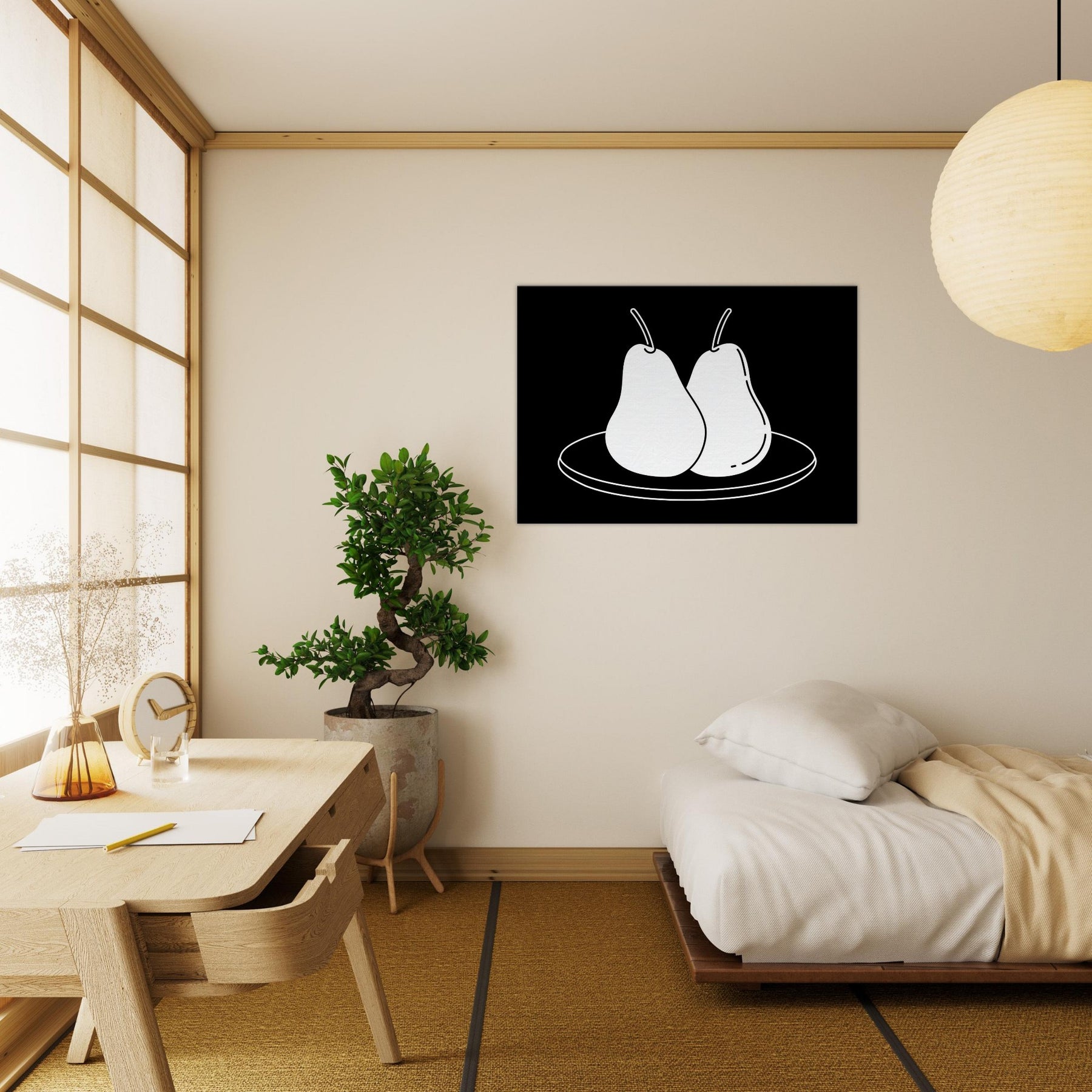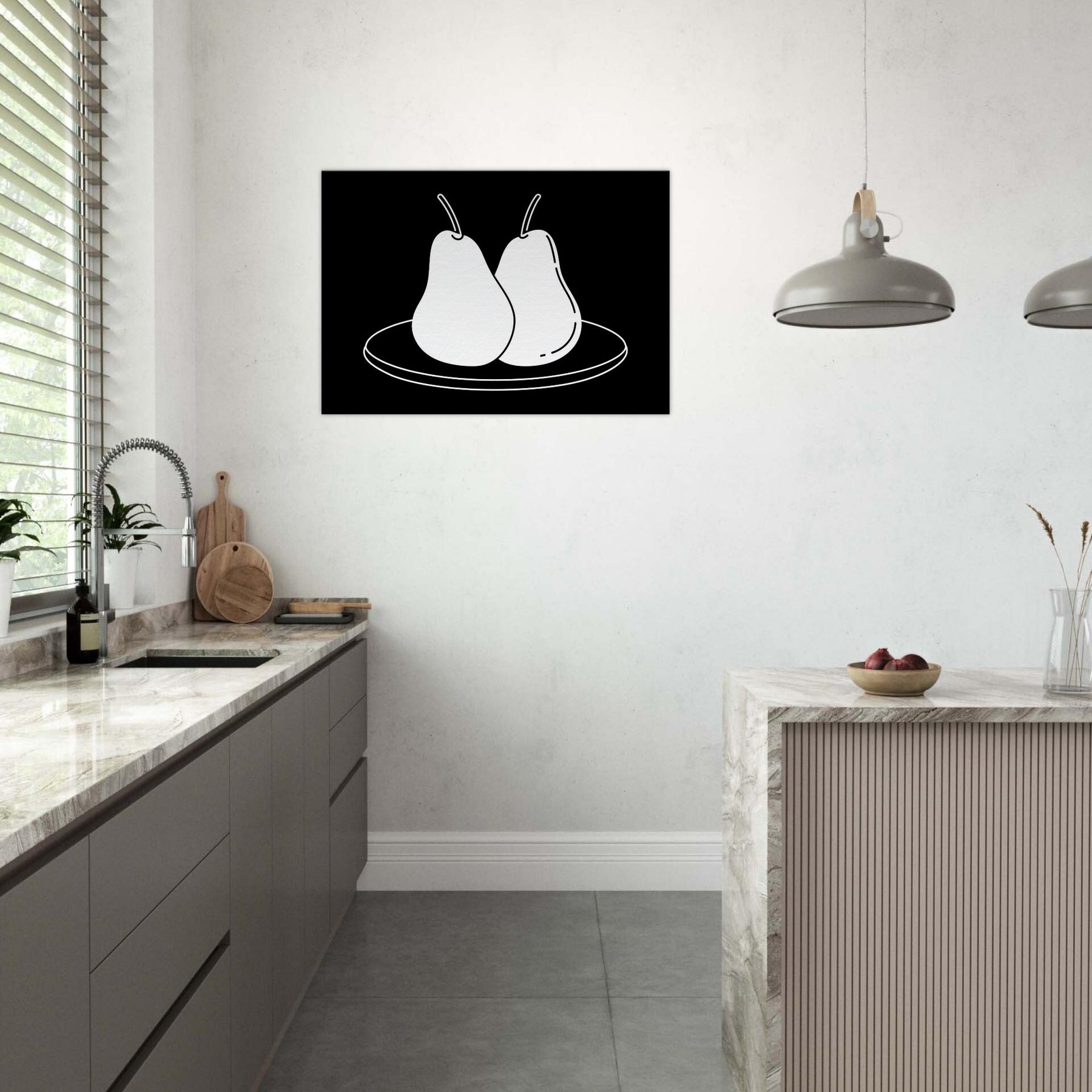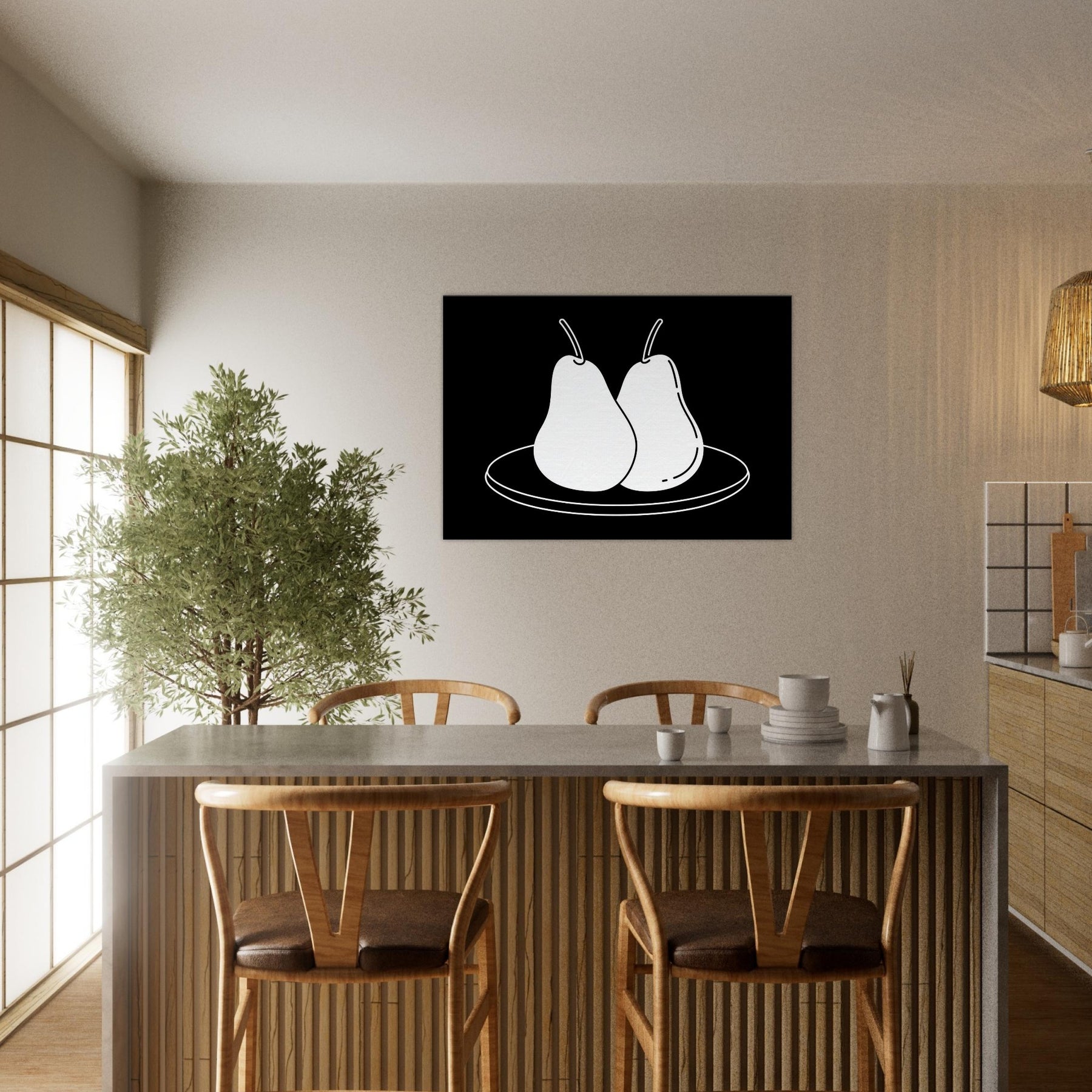 This study of Pears on Plate unfolds in clean, confident lines that invite a moment of calm. The stark black background makes the white form glow, turning a simple kitchen still life into a modern emblem of balance and restraint. Hang it where you crave quiet focus a dining nook, a sunlit hallway, or above a sofa and let its pared back elegance sharpen conversation without shouting. A timeless nod to everyday beauty, Pears on Plate pairs beautifully with neutrals and warm woods alike.