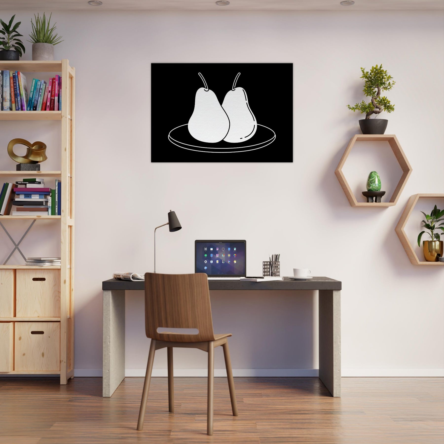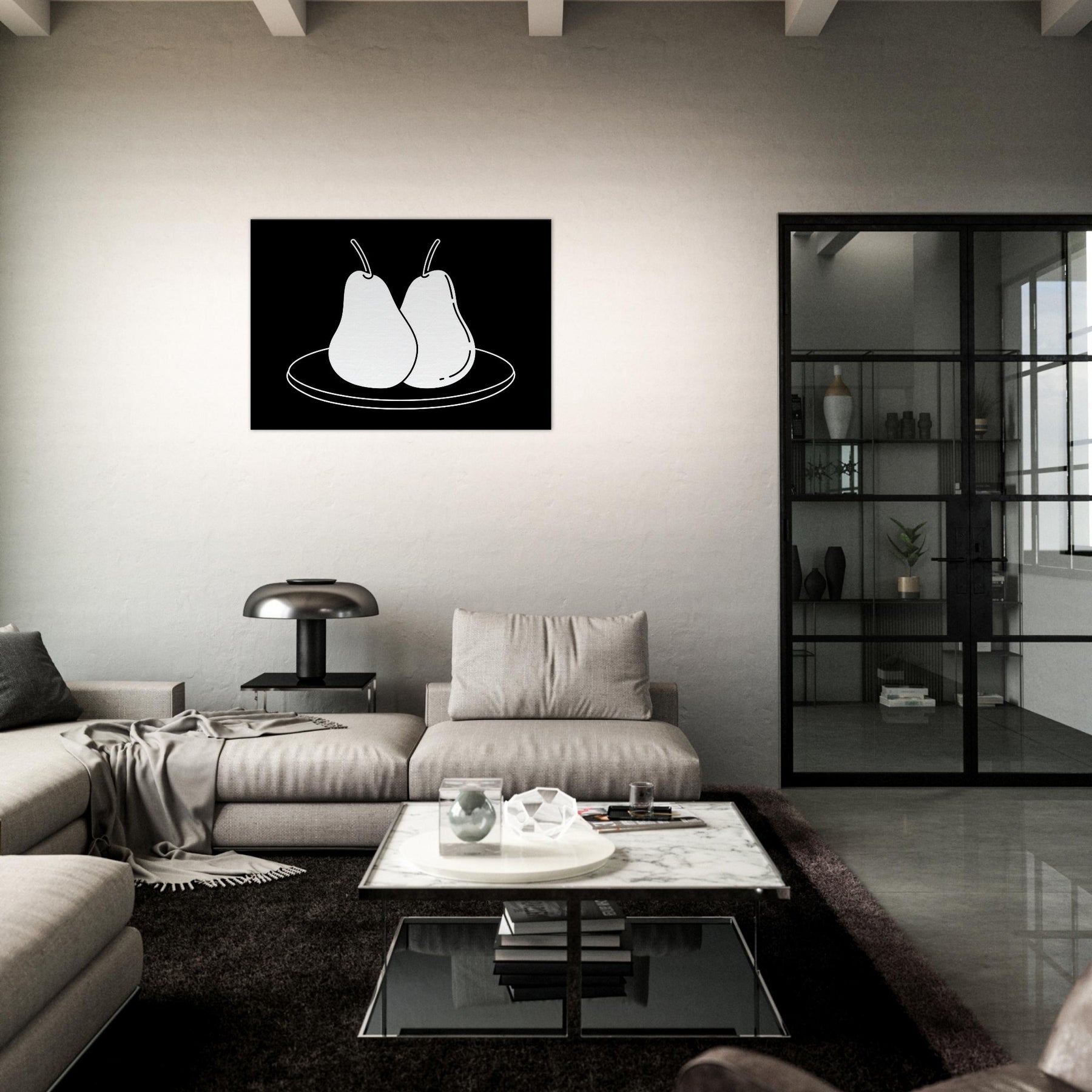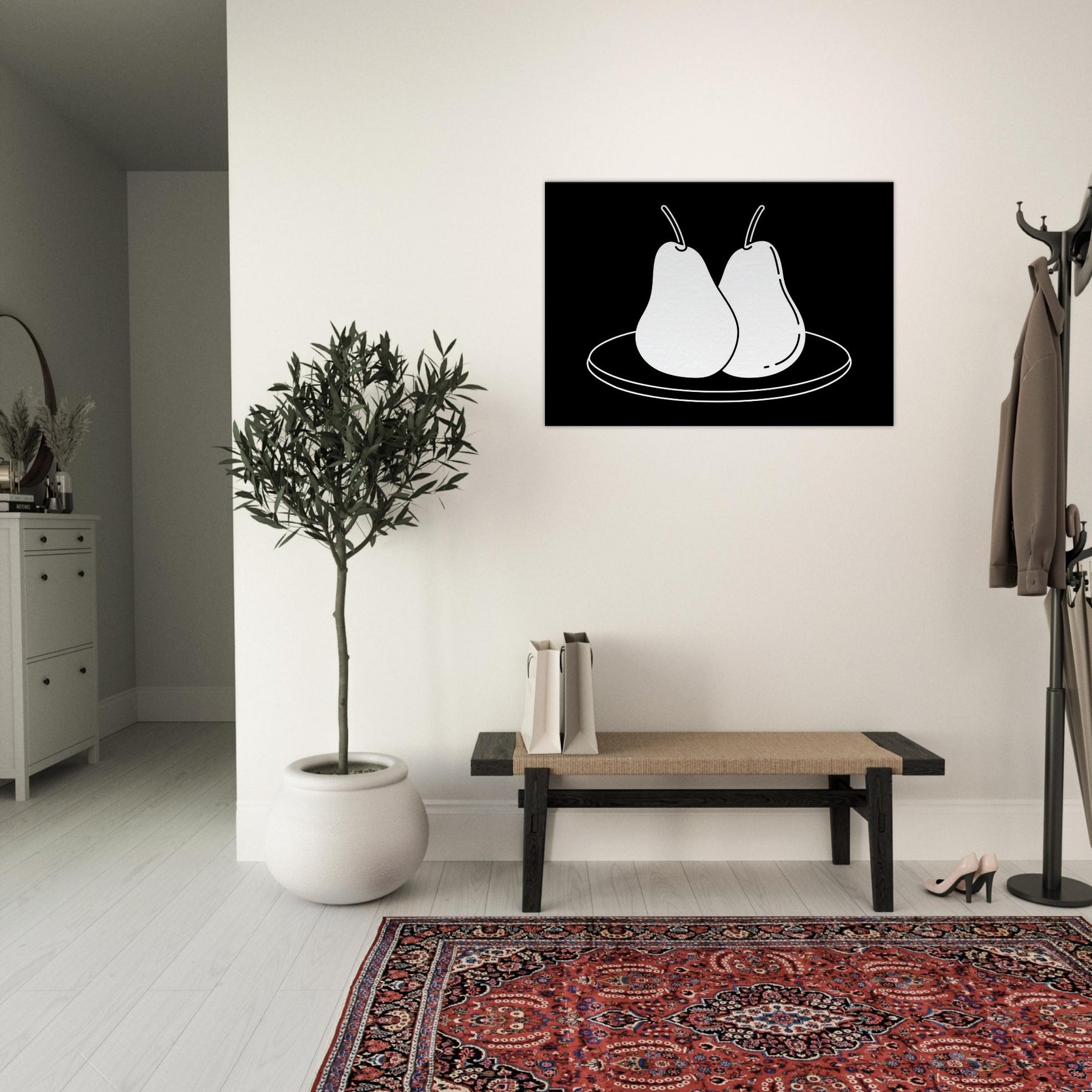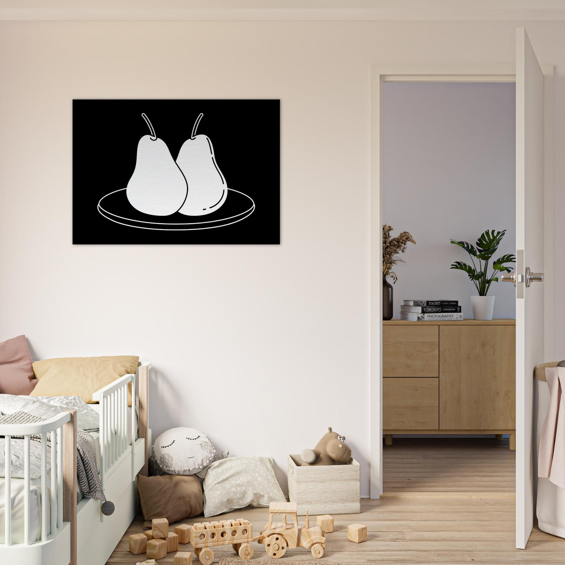 This study of Pears on Plate unfolds in clean, confident lines that invite a moment of calm. The stark black background makes the white form glow, turning a simple kitchen still life into a modern emblem of balance and restraint. Hang it where you crave quiet focus a dining nook, a sunlit hallway, or above a sofa and let its pared back elegance sharpen conversation without shouting. A timeless nod to everyday beauty, Pears on Plate pairs beautifully with neutrals and warm woods alike.