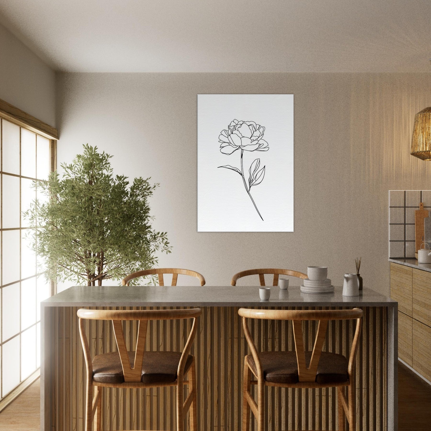 Immerse your room in the quiet elegance of a single Peony captured in clean, continuous line. This line art piece treats nature with restraint the bloom unfurls in graceful arcs, the stem a slender whisper. The monochrome contour invites soft light to play along its curves, turning walls into a calm, contemplative space. Perfect for a living room or bedroom, it pairs with airy textiles and natural wood, elevating mood without shouting for attention. A timeless, ethereal accent for modern interiors.