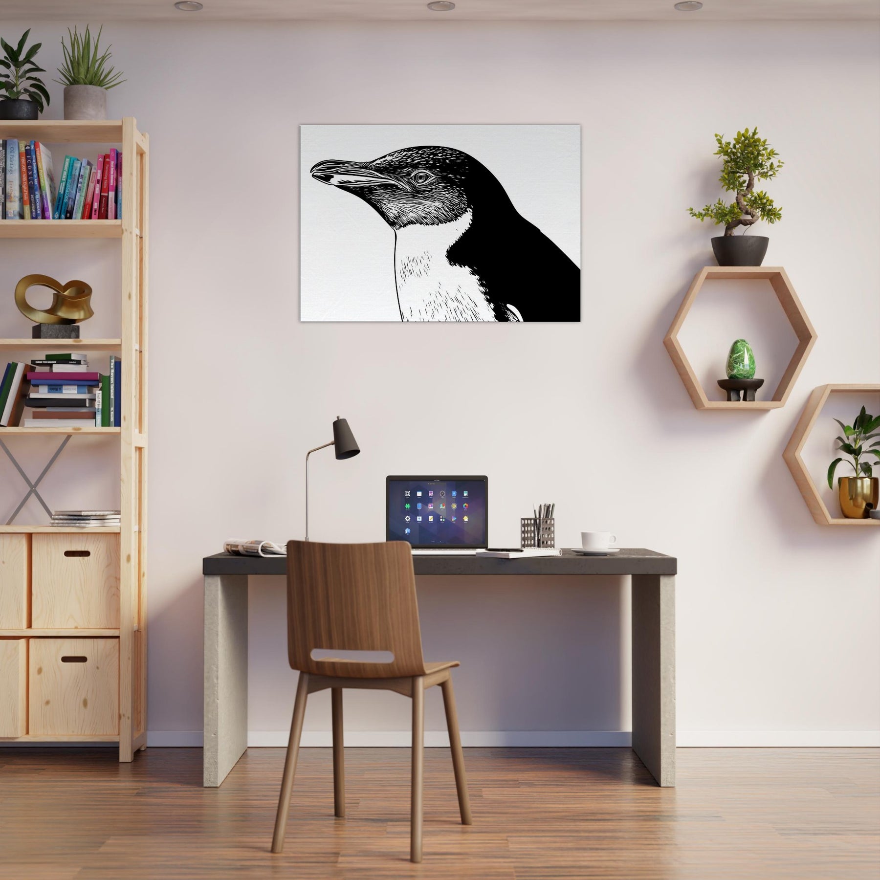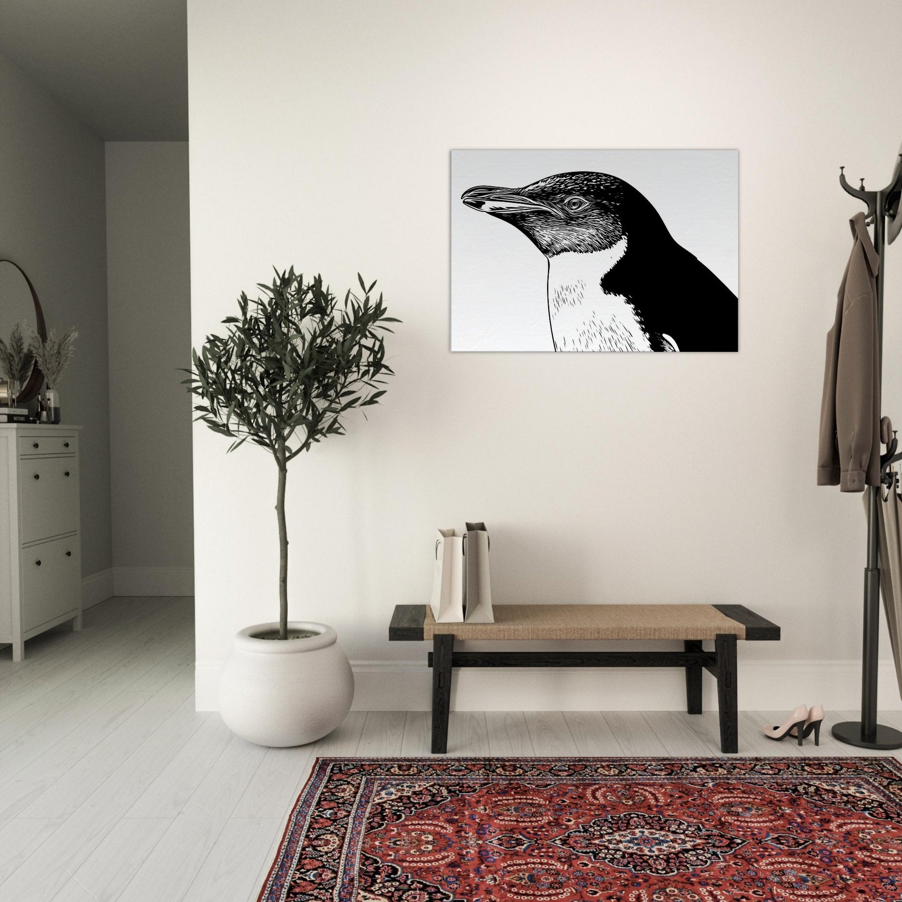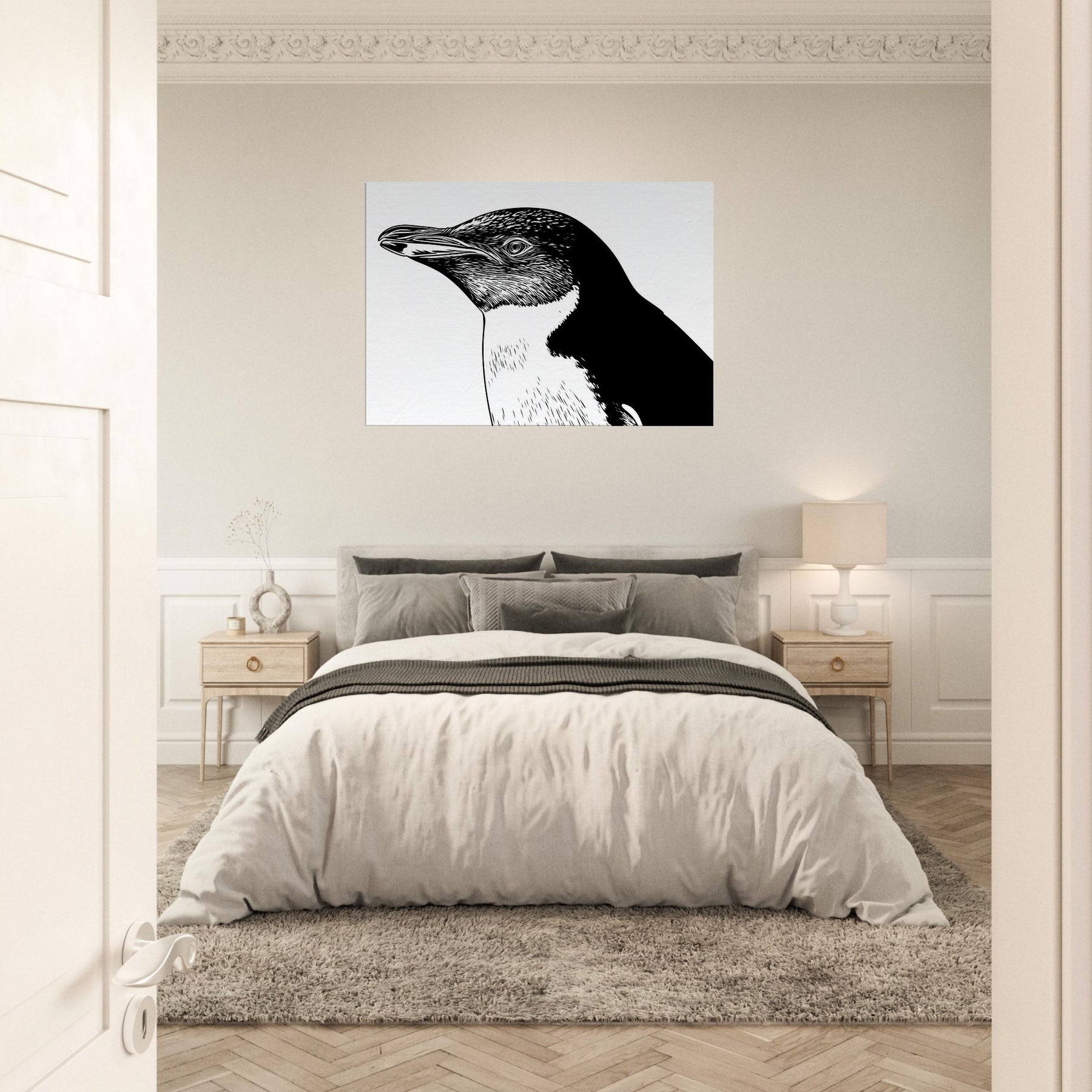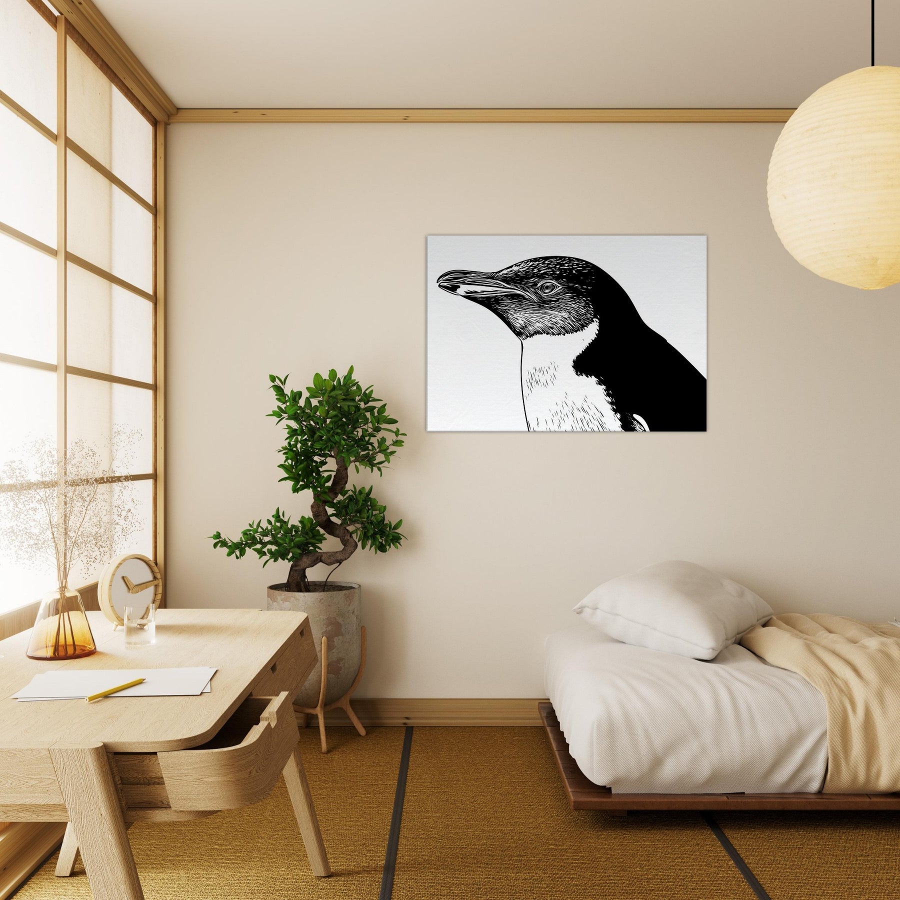 Rendered in clean lines, this Penguin line drawing evokes the quiet grandeur of a glacial morning. The bold black silhouette contrasts with delicate white space, inviting calm reflection rather than loud display. As it anchors a wall, the piece breathes a cool, airy energy into living rooms, bedrooms, or hallways, pairing effortlessly with neutrals and natural textures. The Penguin's poised profile suggests patience and grace, turning everyday moments into a small, cinematic pause for contemplation.