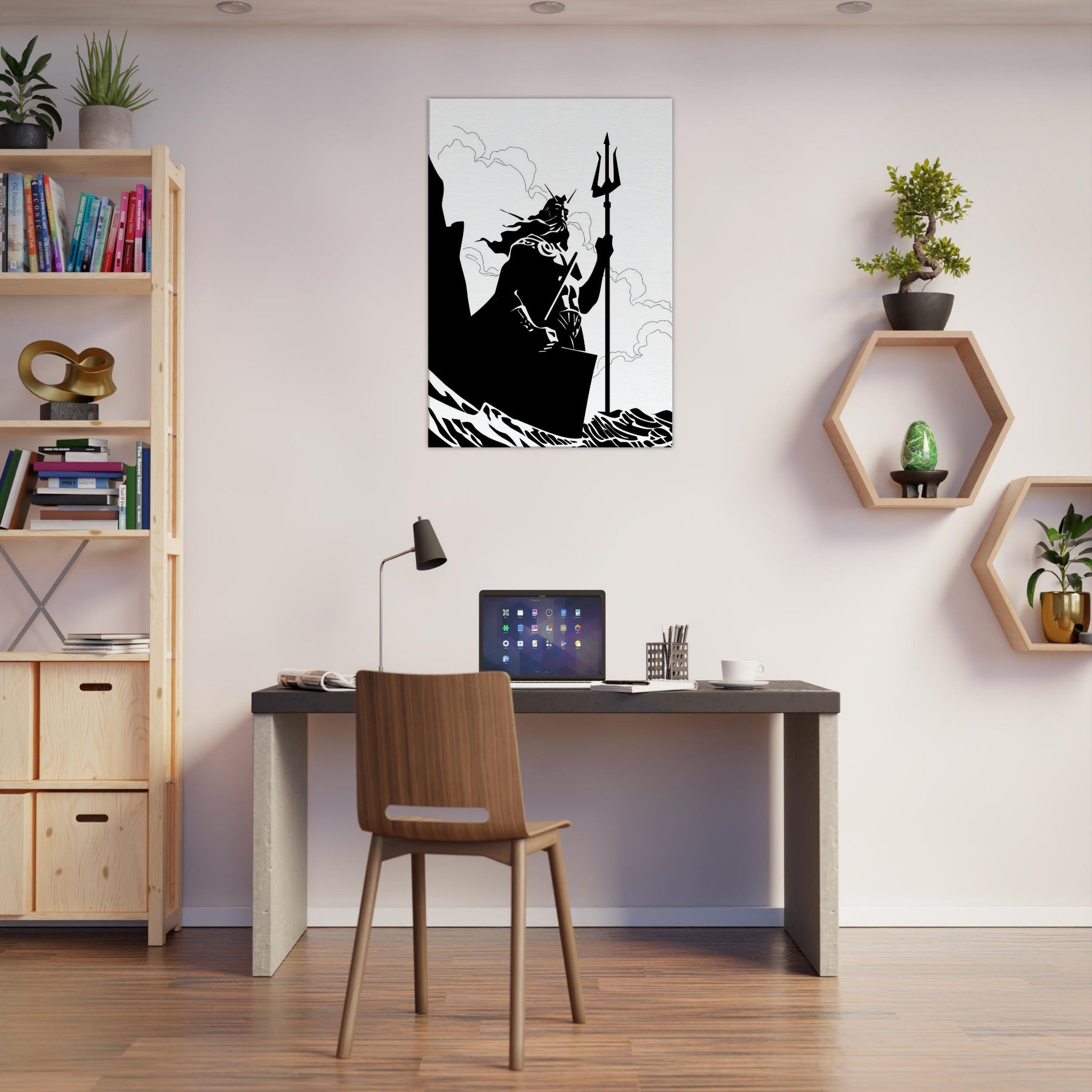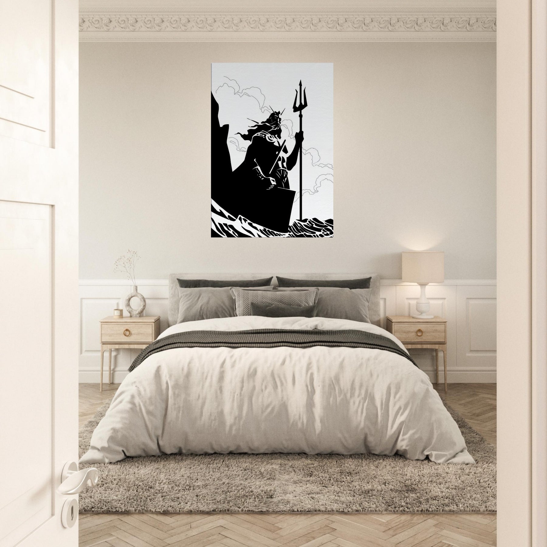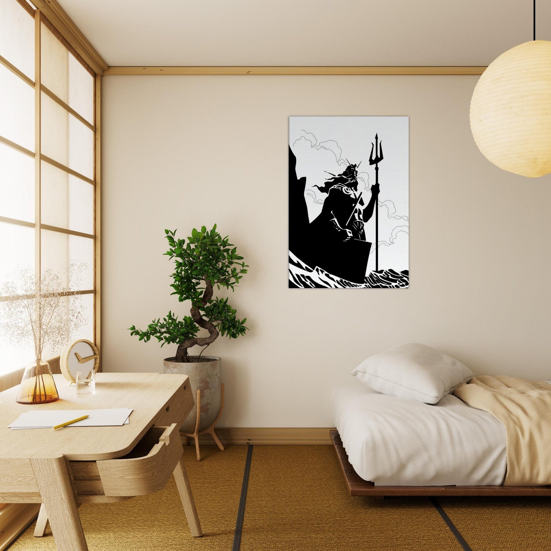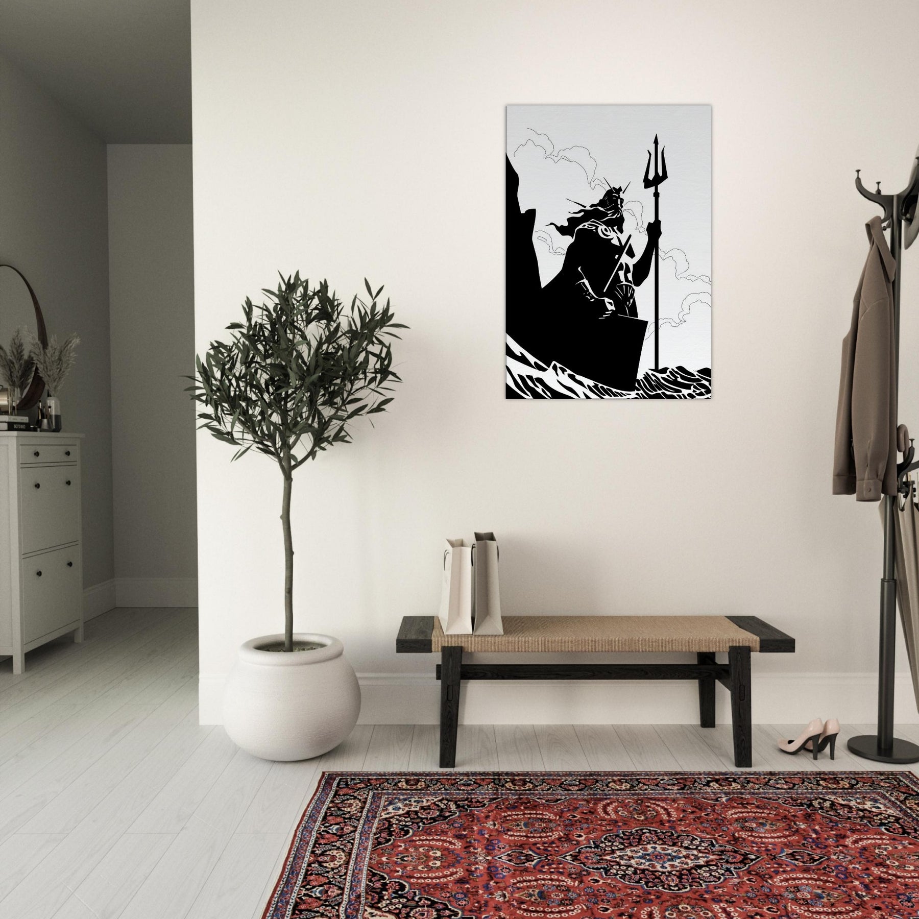 On your wall, Poseidon, God of the Sea and Storms commands the room with a hushed, elemental grace. This bold, monochrome silhouette breathes with sea salt air and thunder filled skies, its crisp lines curling like rising spray. The figure stands at the prow of a vessel, trident raised, as waves crest beneath. It invites contemplation and movement, turning a living space into a harbor of imagination calm when calm is needed, electric when storm’s spirit calls.