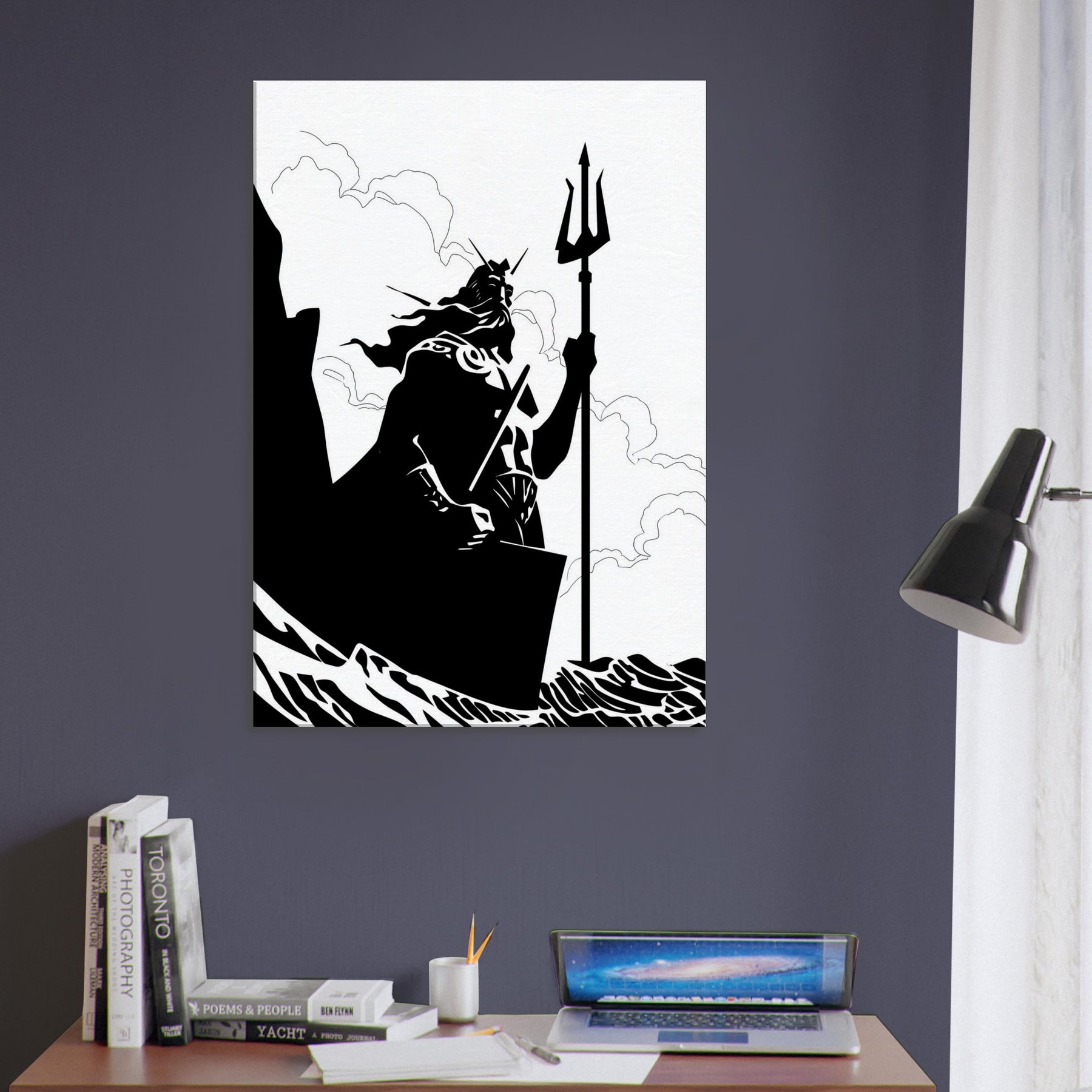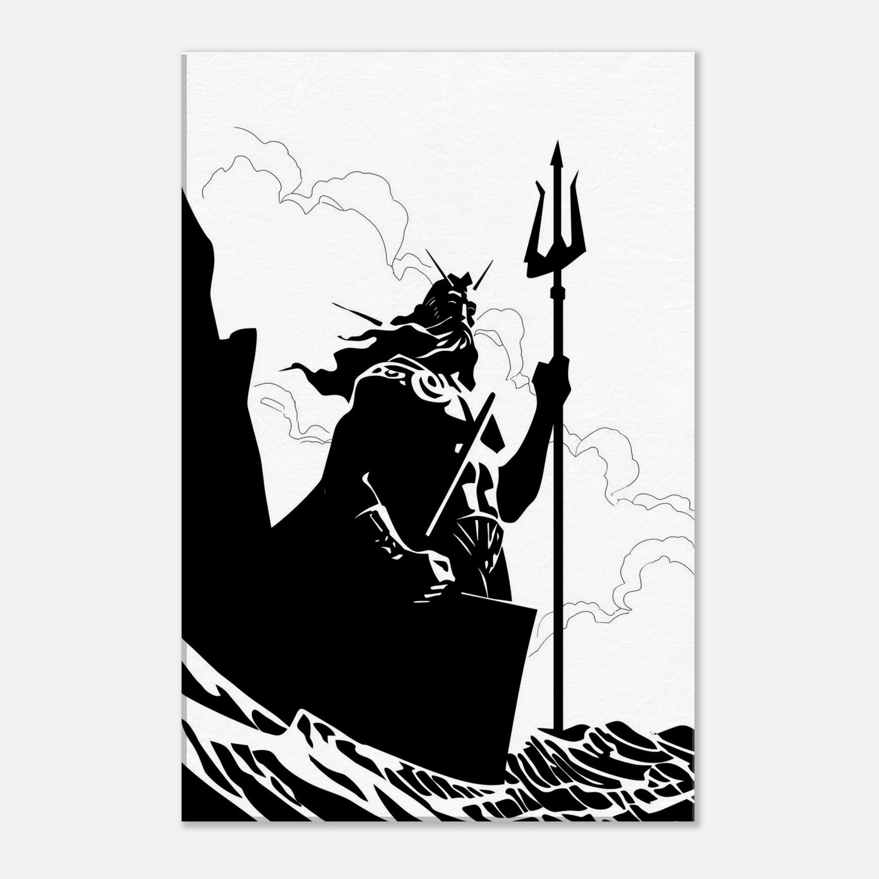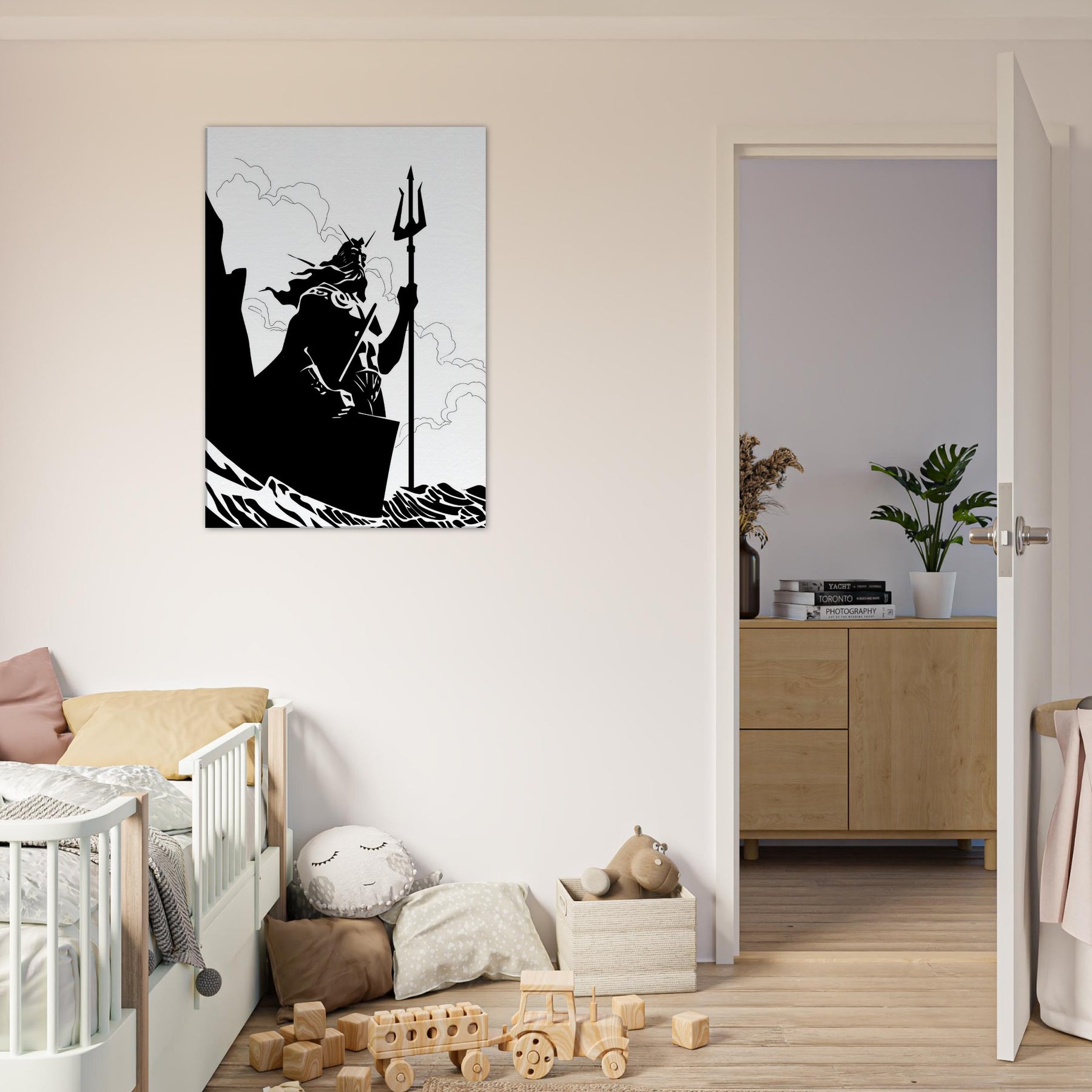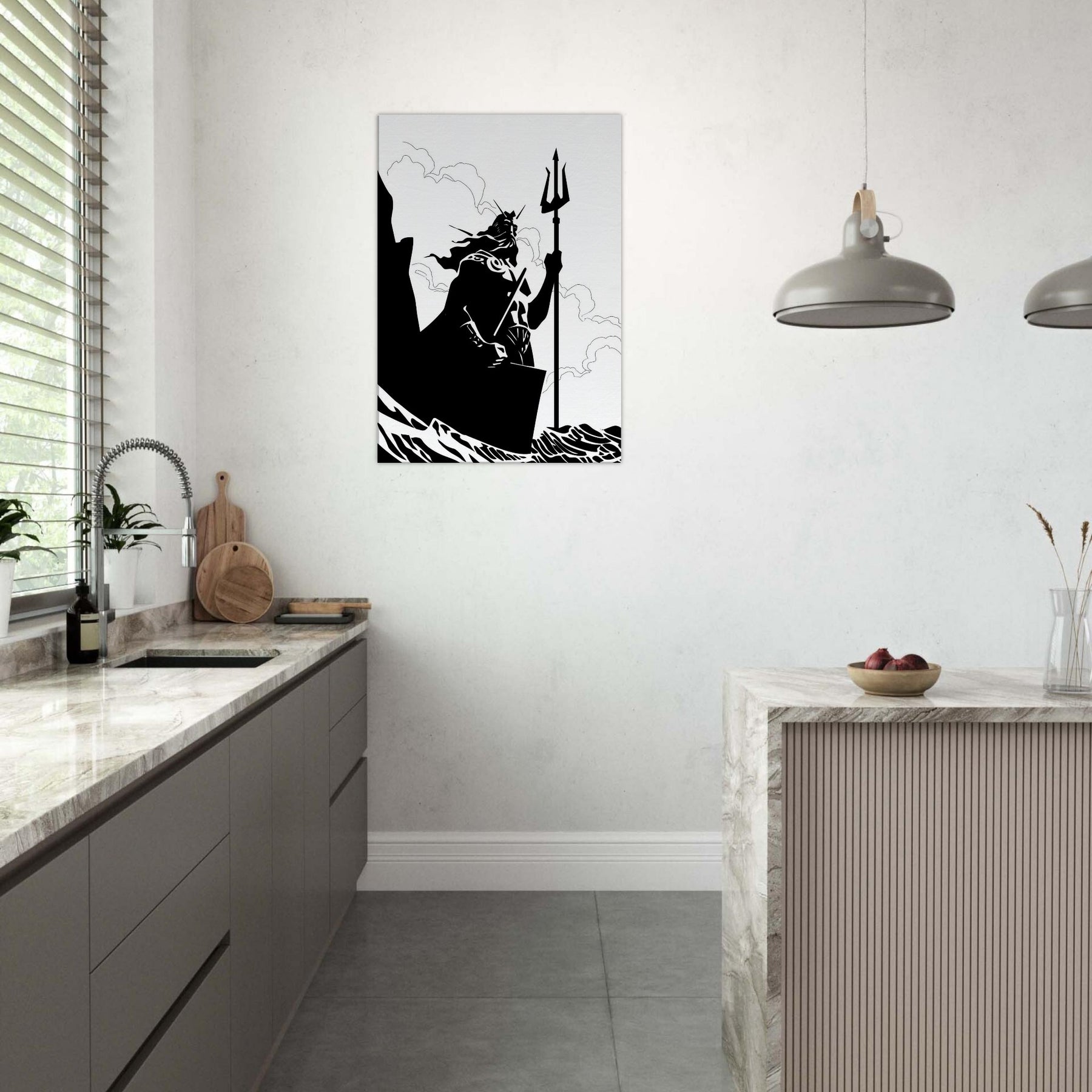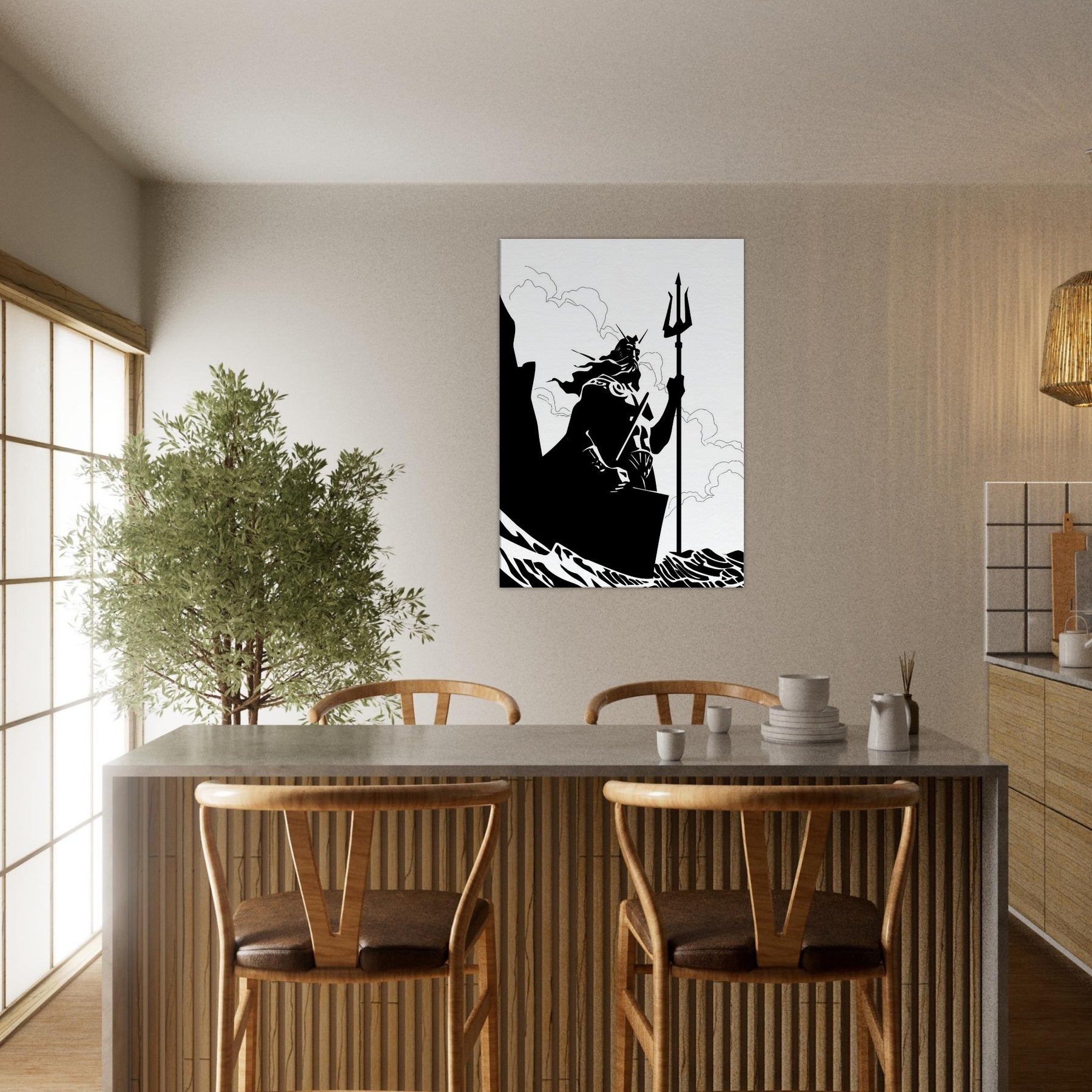 On your wall, Poseidon, God of the Sea and Storms commands the room with a hushed, elemental grace. This bold, monochrome silhouette breathes with sea salt air and thunder filled skies, its crisp lines curling like rising spray. The figure stands at the prow of a vessel, trident raised, as waves crest beneath. It invites contemplation and movement, turning a living space into a harbor of imagination calm when calm is needed, electric when storm’s spirit calls.