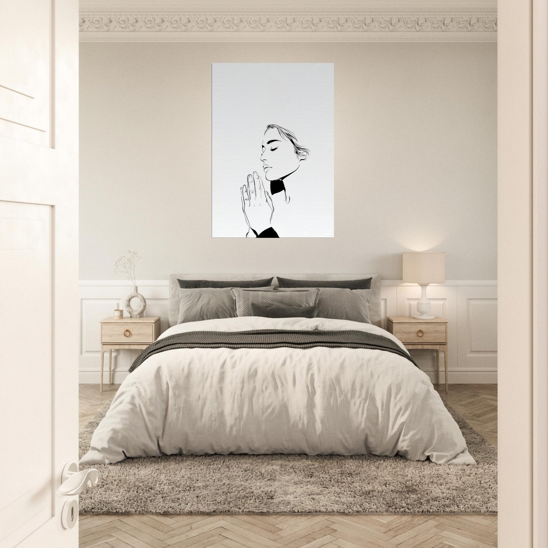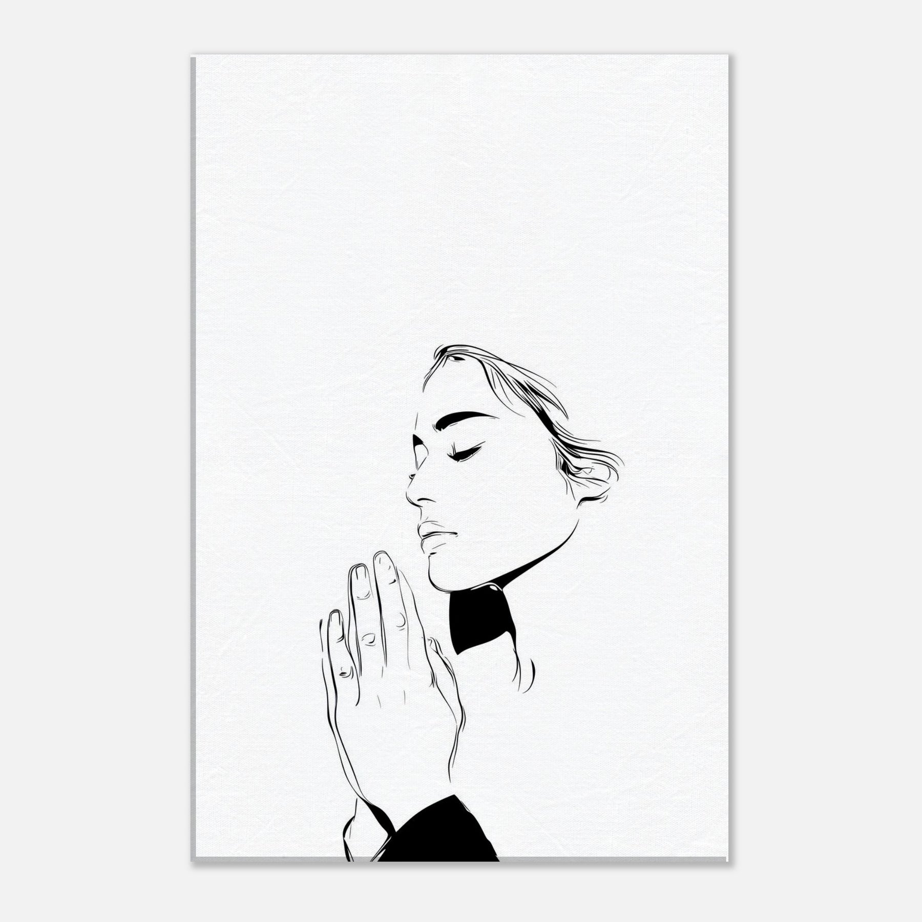 Soft, restrained line work traces a serene profile in a moment of quiet reverence. Hands in Prayer rise with graceful stillness, their gesture echoing through a clean, luminous field. This piece invites calm into a room: a meditative focal point above a sofa or workspace, its stark black and white contour balancing busy interiors with effortless poise. The minimal forms become a ritual of pause, turning everyday walls into a sanctuary of breath, memory, and clarity an elegant, contemporary accent that enhances mood and intimacy in any living space.