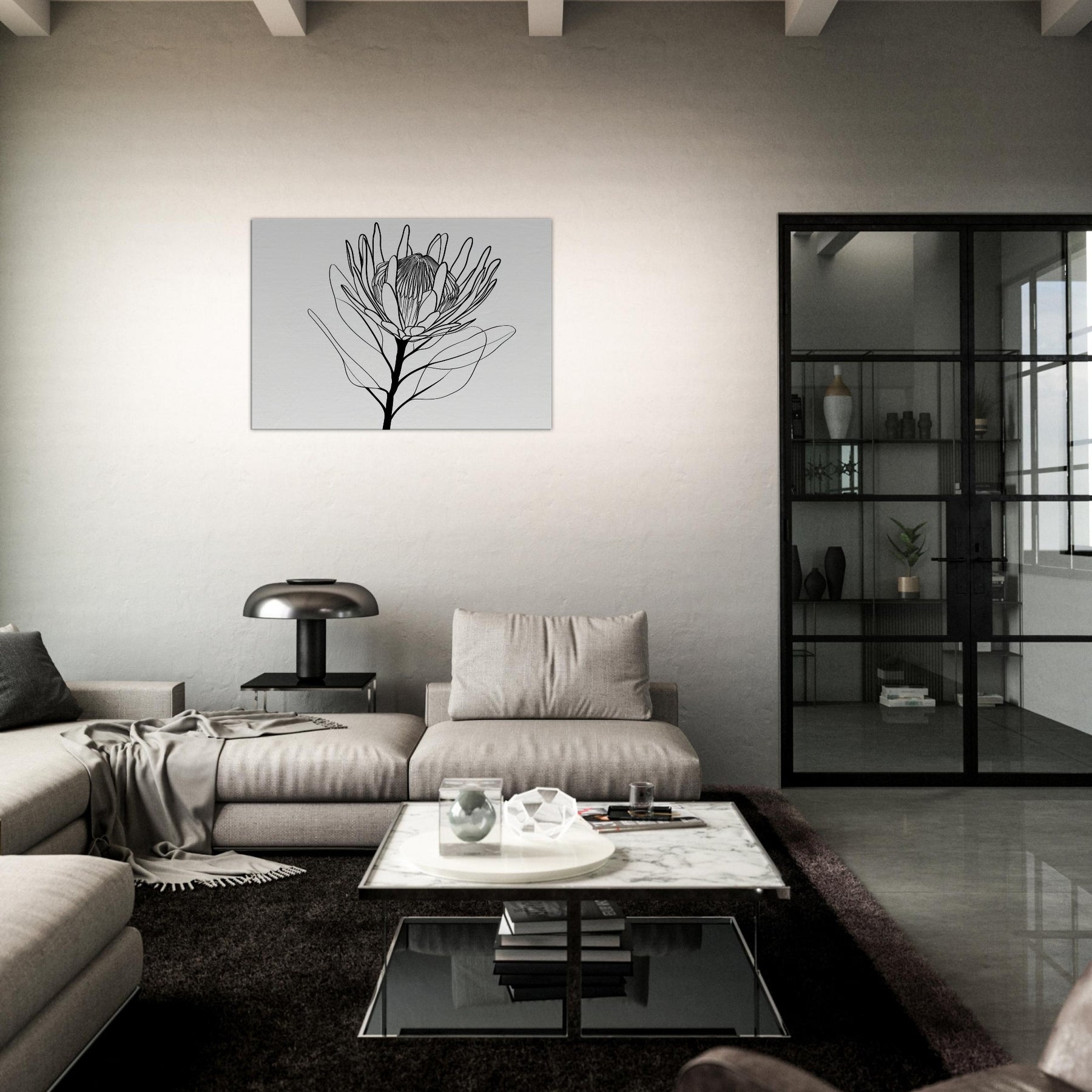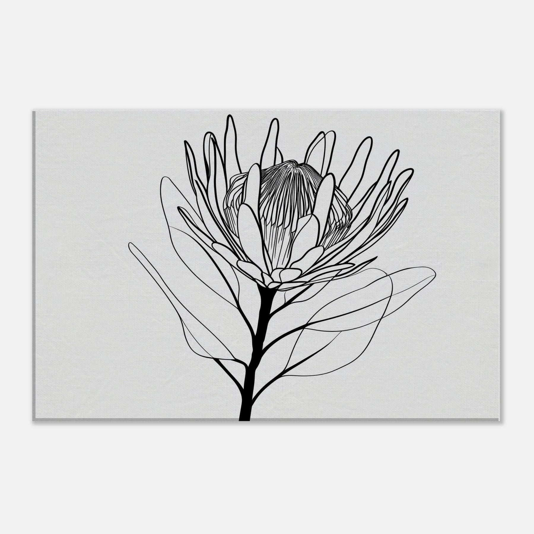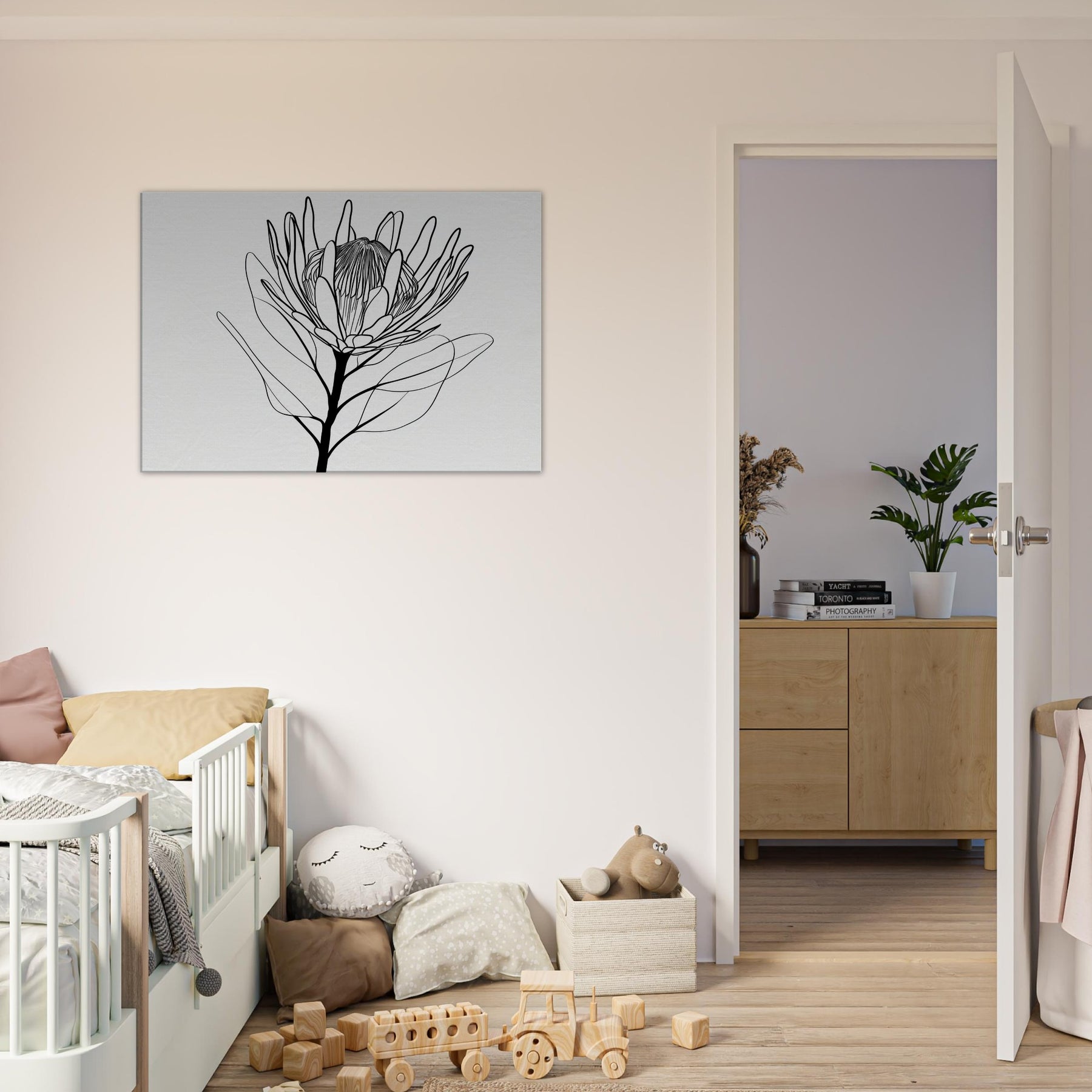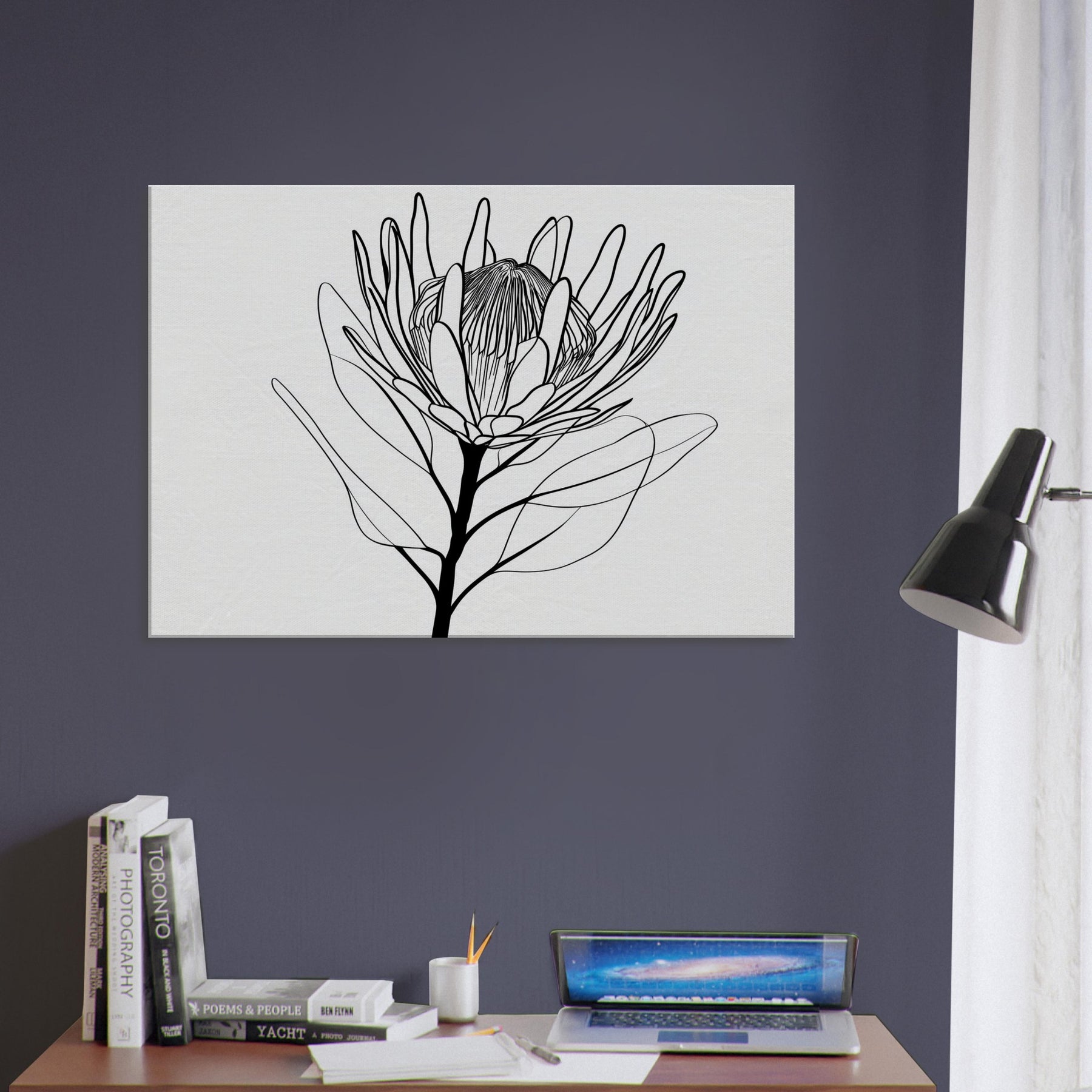 Protea whispers in graphite light a single line tracing its bold silhouette, then softening into delicate curves. This line art study invites quiet reflection, turning everyday walls into a gallery of calm. The Protea rises with sculptural grace, its petals unfurling in crisp, continuous motion, while leaves drift like gentle breaths around the stem. In a neutral space, the stark black on cream contrast creates a serene focal point, pairing effortlessly with natural textures. Hang it to breathe sophistication and a touch of wild, botanical poetry into your living space.