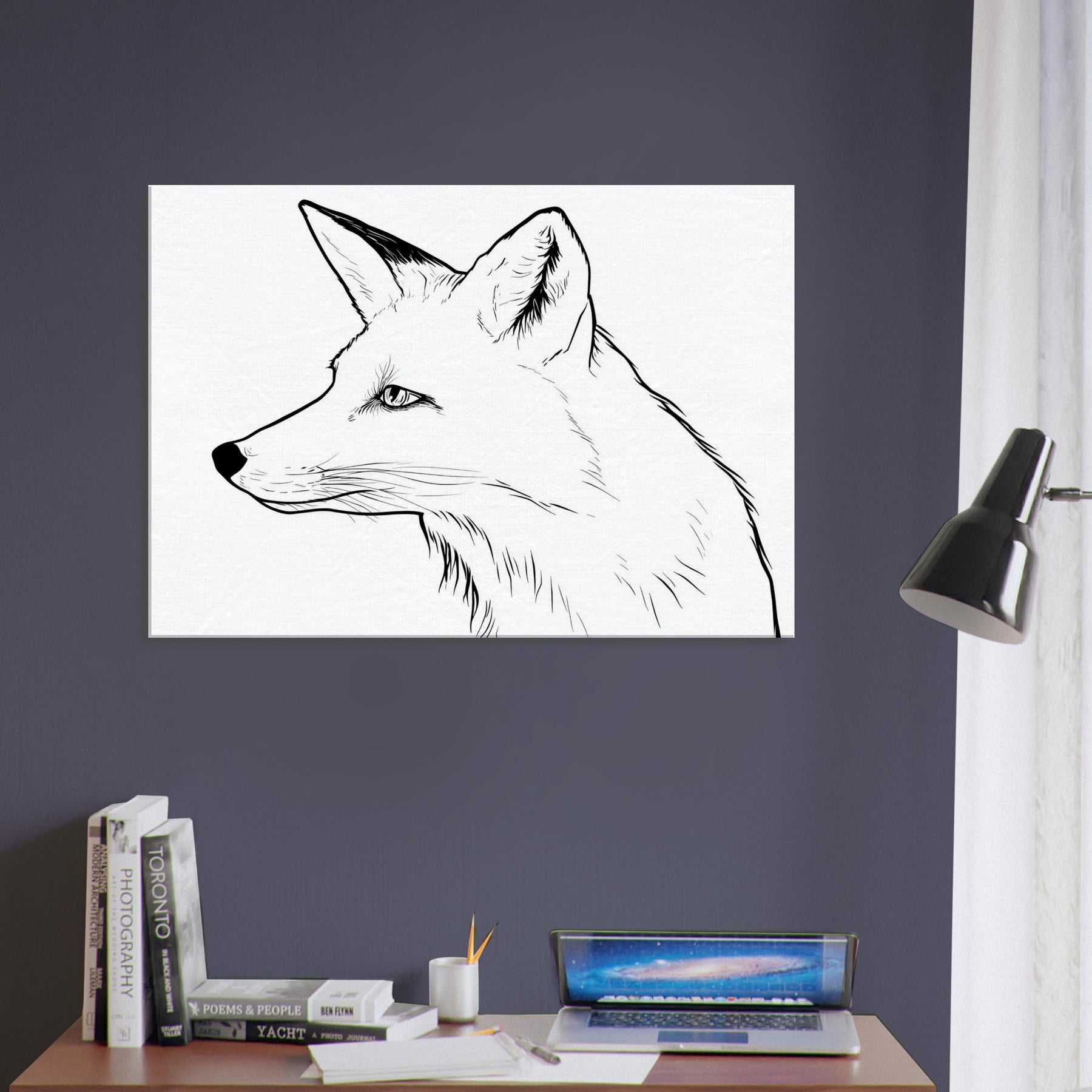 An understated of the fox, rendered in clean, continuous lines that breathe quiet presence into any room. This minimalist study captures the animal's poised stillness: a hint of gaze, a suggestion of fur, and the elegant arc of the neck. Placed in a living space, it becomes a serene focal point a touch of wilderness distilled into calm, monochrome contrast. Let the Fox softly contour your walls, inviting reflection, warmth, and a subtle sense of untamed grace.