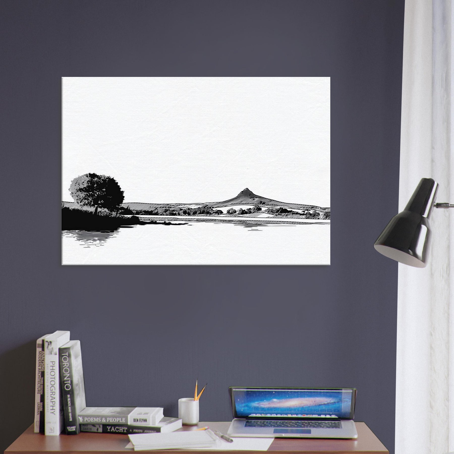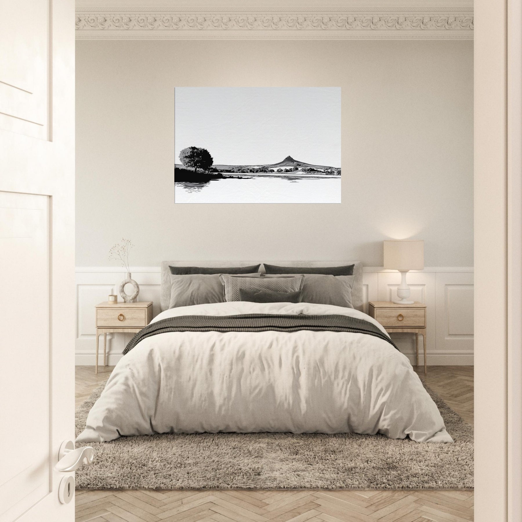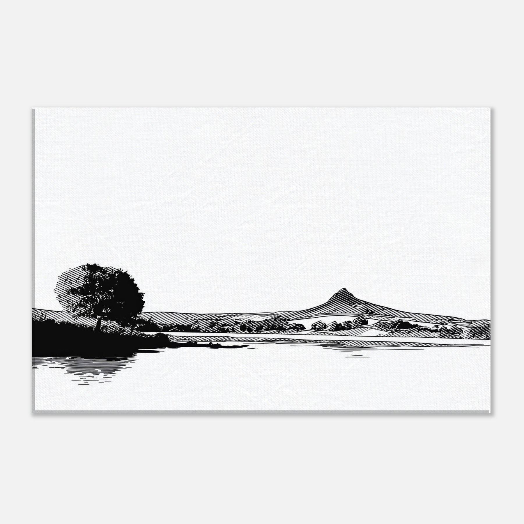 Immerse your space in a quiet, contemplative scene where the Lake meets a horizon of ink black pines and distant hills. This line work study captures the breath between shore and sky, inviting daylight to play on its white surface. The atmosphere feels serene, almost meditative, a gentle counterpoint to busyness. Hang it in a living room or bedroom to frame conversations with calm. Its restrained contrast and graceful curves elevate minimal decor into a moment of stillness.