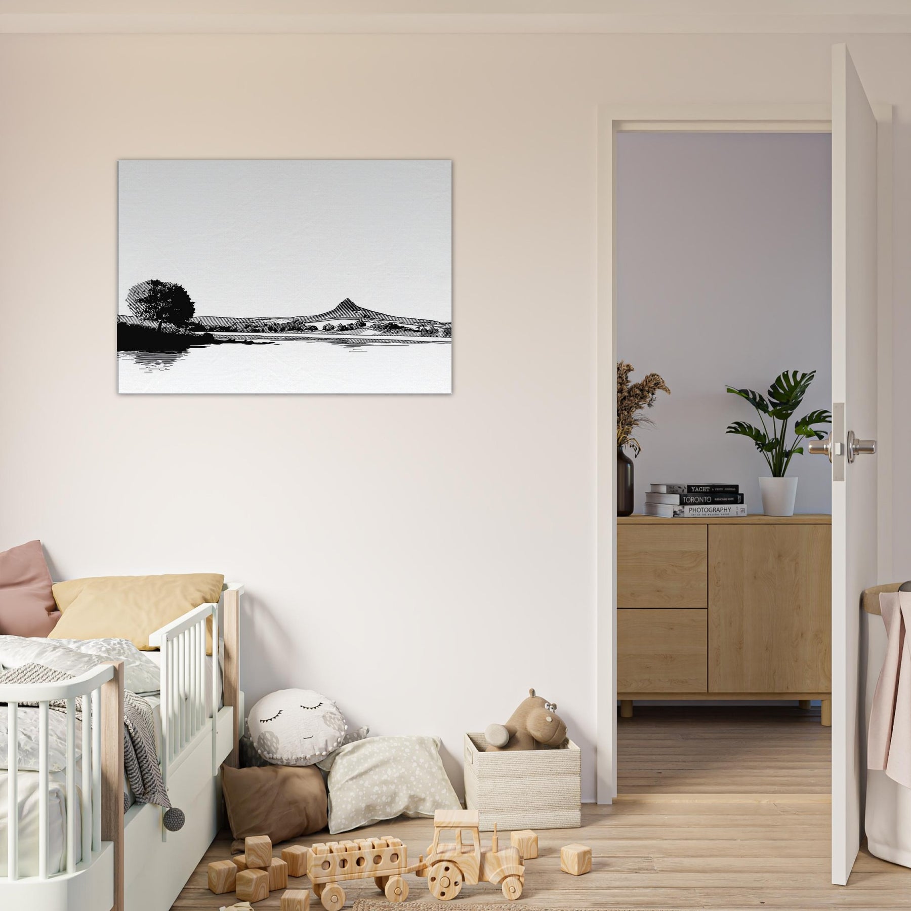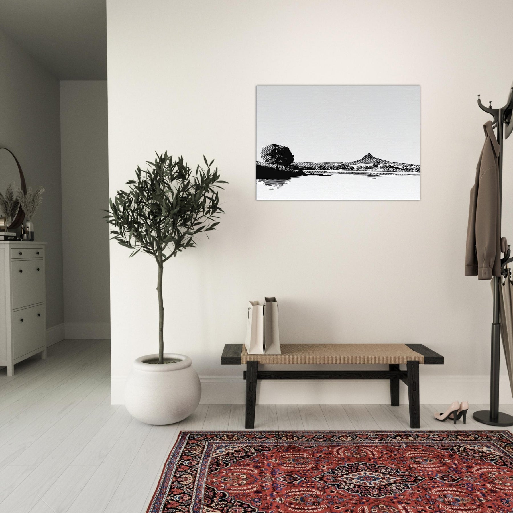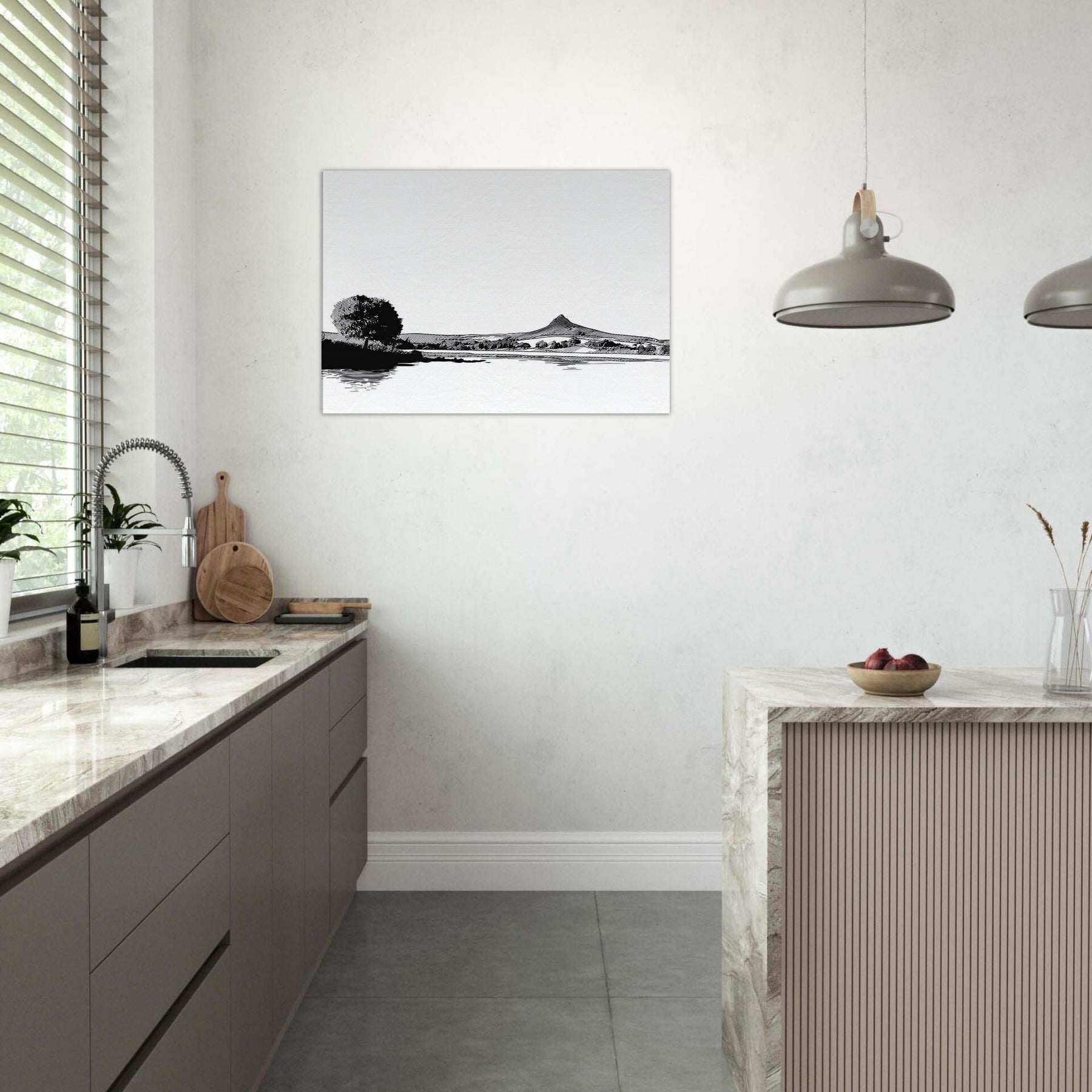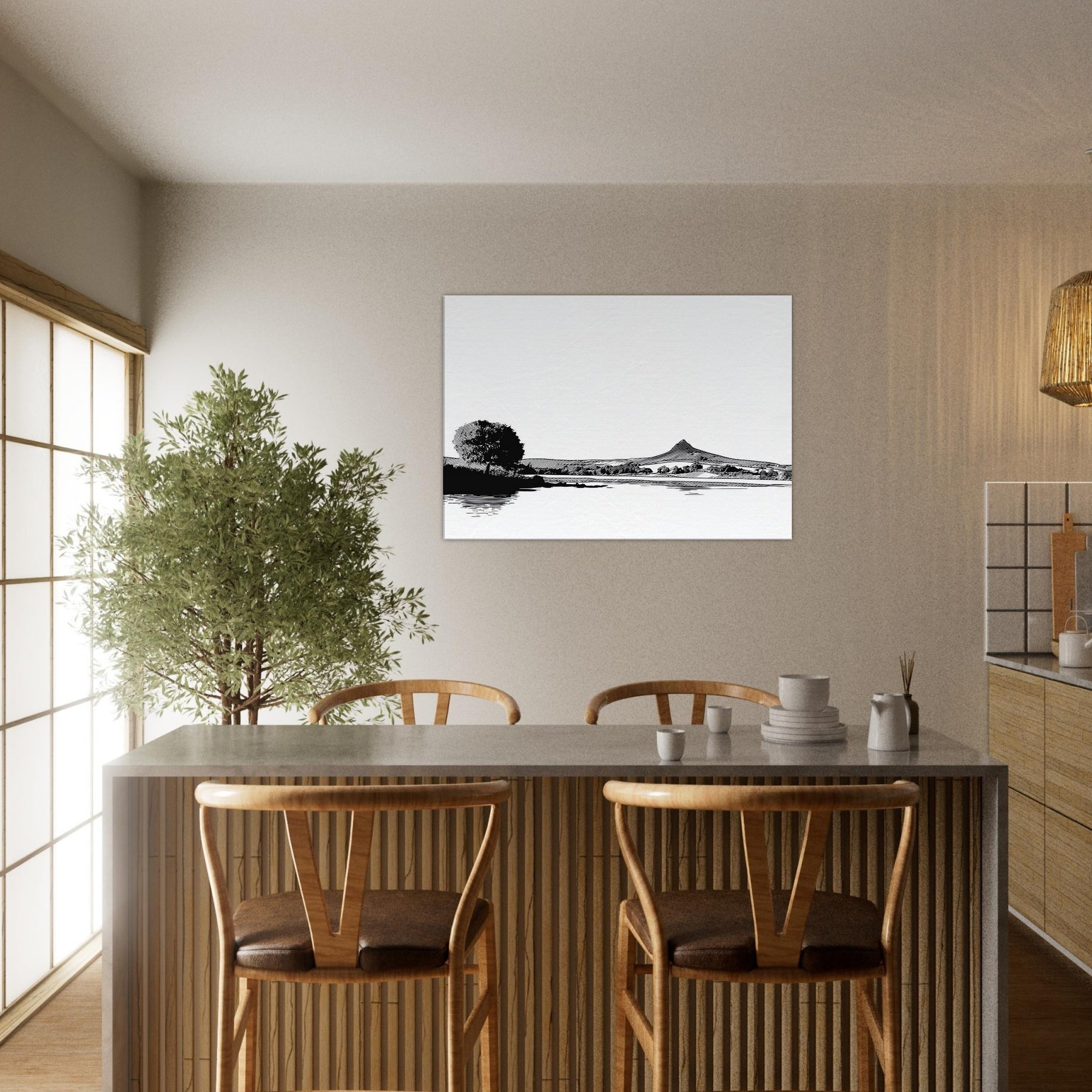 Immerse your space in a quiet, contemplative scene where the Lake meets a horizon of ink black pines and distant hills. This line work study captures the breath between shore and sky, inviting daylight to play on its white surface. The atmosphere feels serene, almost meditative, a gentle counterpoint to busyness. Hang it in a living room or bedroom to frame conversations with calm. Its restrained contrast and graceful curves elevate minimal decor into a moment of stillness.