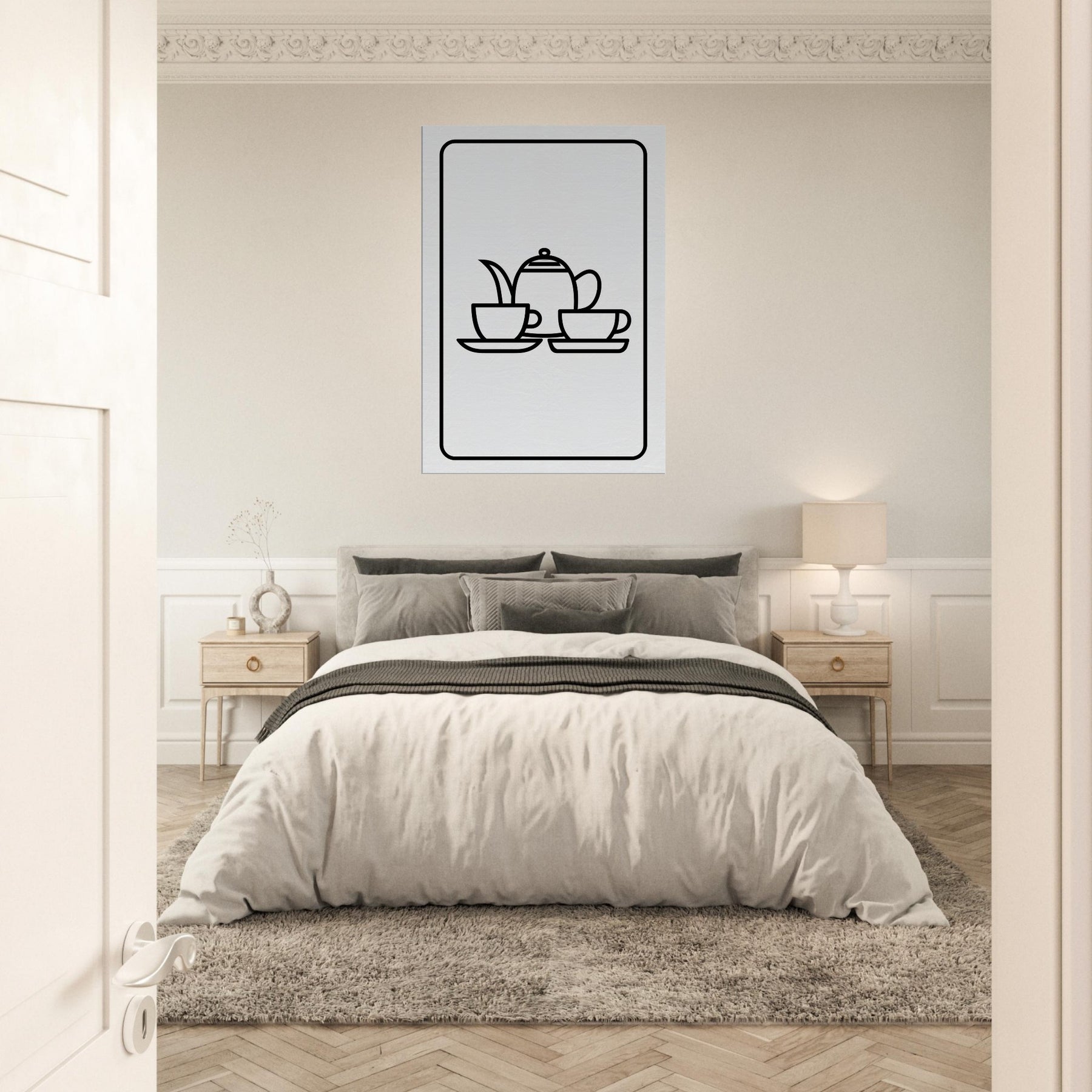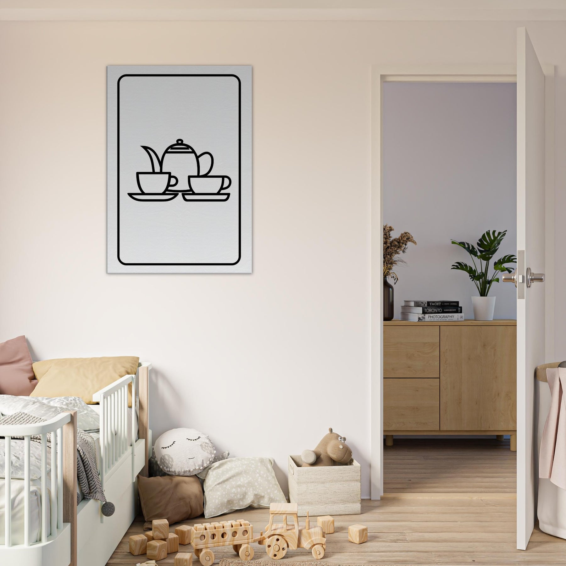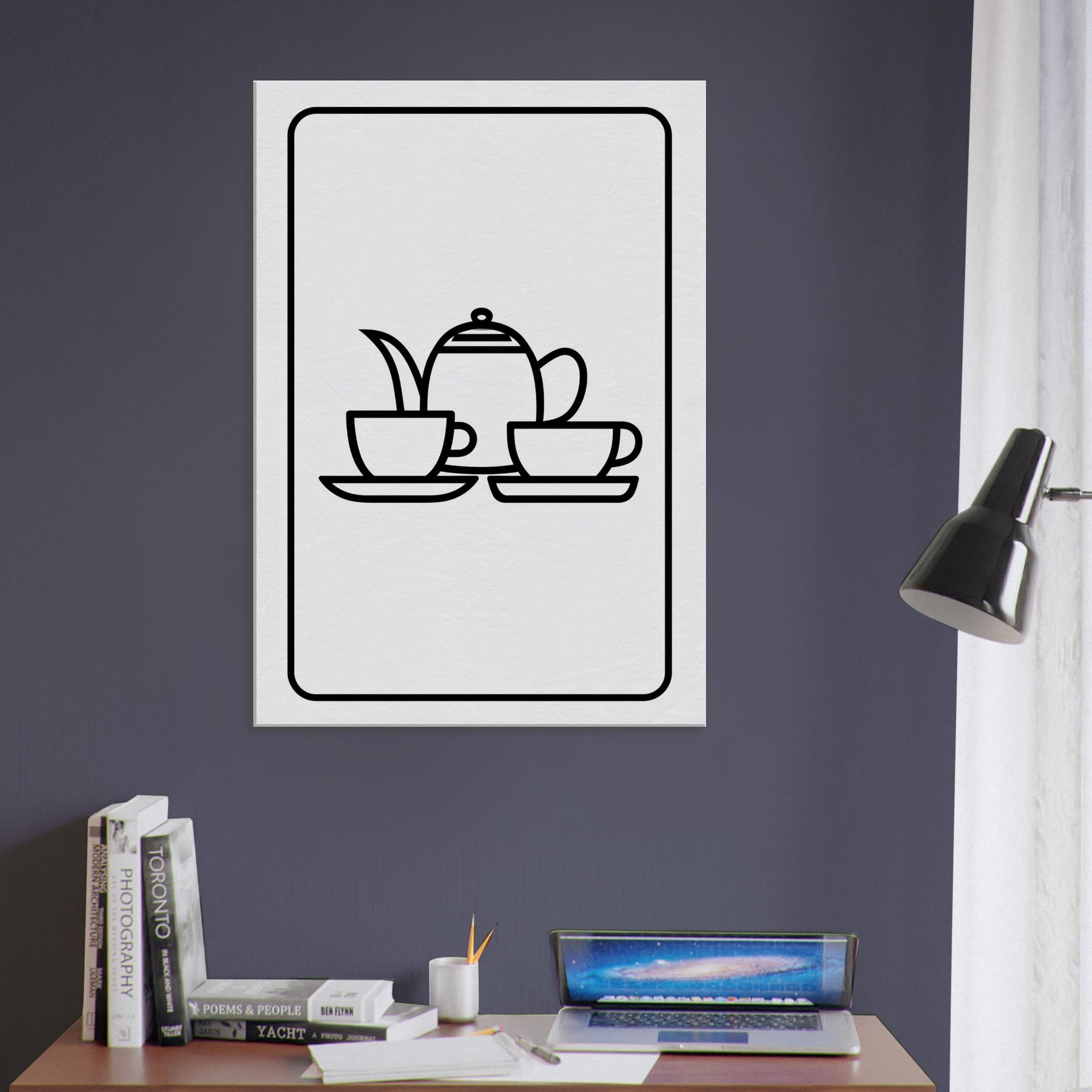 Allow the clean, uninterrupted lines of this Tea Set to soften a space and invite a moment of stillness. This minimalist line study folds the teapot, cups, and saucers into a delicate rhythm that feels welcoming and refined. Hung in a sunlit kitchen or a quiet living room, its monochrome elegance glows against warm walls, transforming everyday rituals into a mood of calm, thoughtful hospitality. A timeless accent that elevates the atmosphere without overpowering, it invites lingering conversations and slow, appreciative moments.