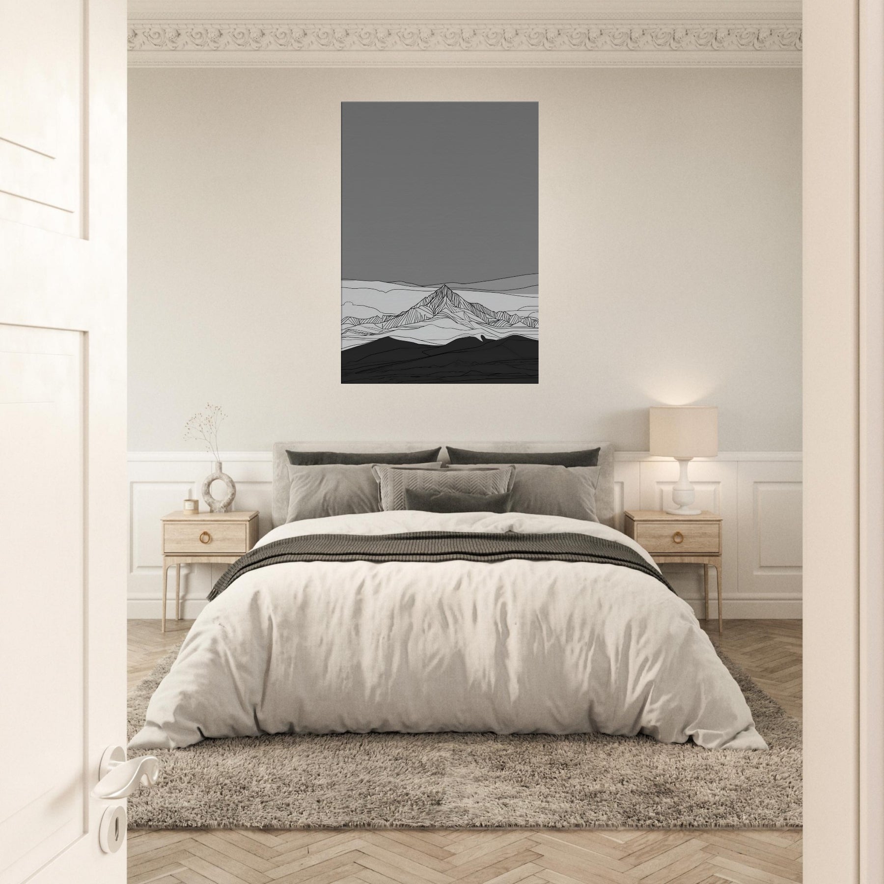 In Rainbow Minimal, a delicate web of line art traces a quiet mountain range across a softened sky. The result is a meditative scene that breathes serenity into any room, inviting the eye to wander the ridgelines and rest on the calm horizon. The monochrome palette and precise contours give nature a modern, breathable presence ideal above a sofa, in a hallway, or a quiet home office. It turns everyday walls into a spacious moment of clarity and quiet inspiration.