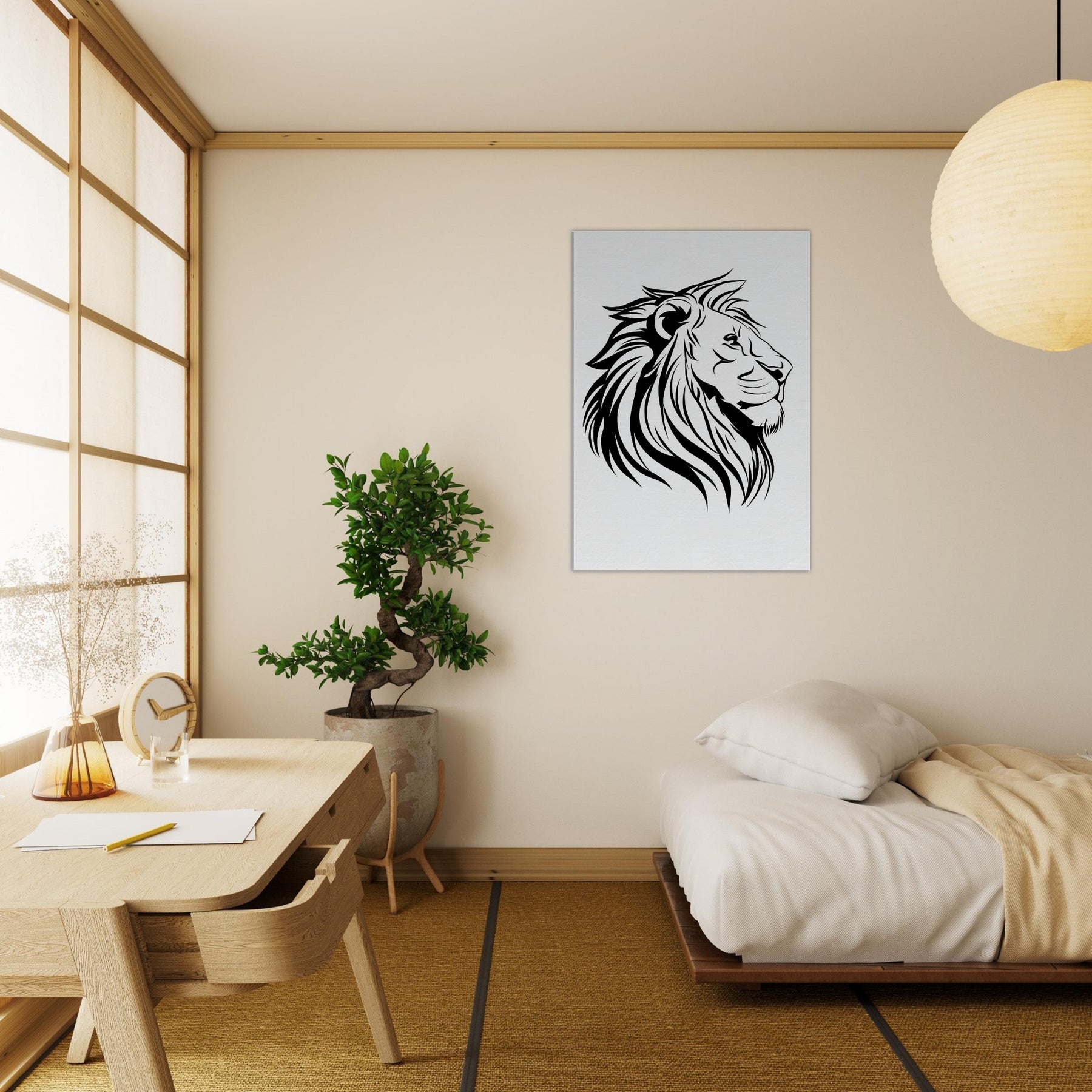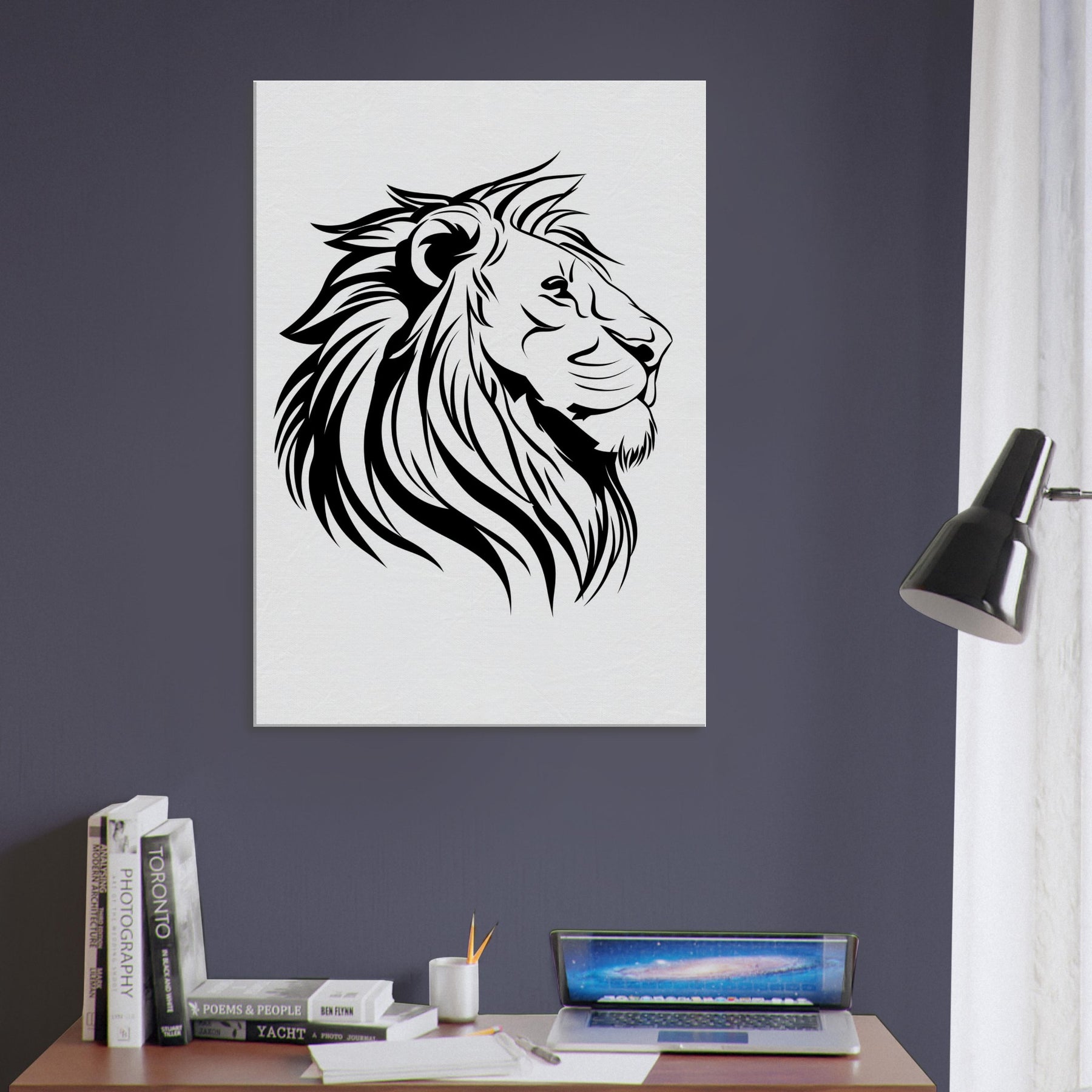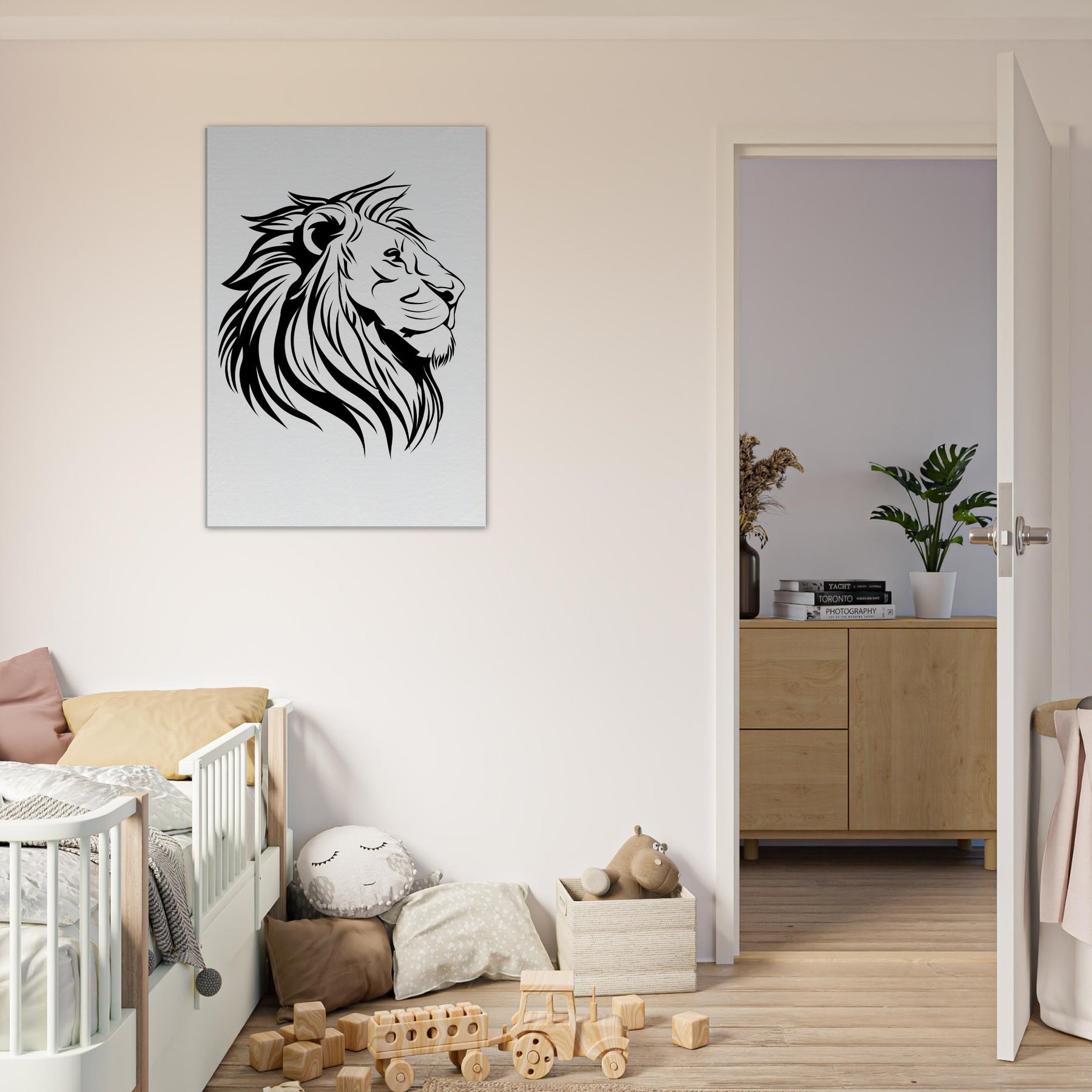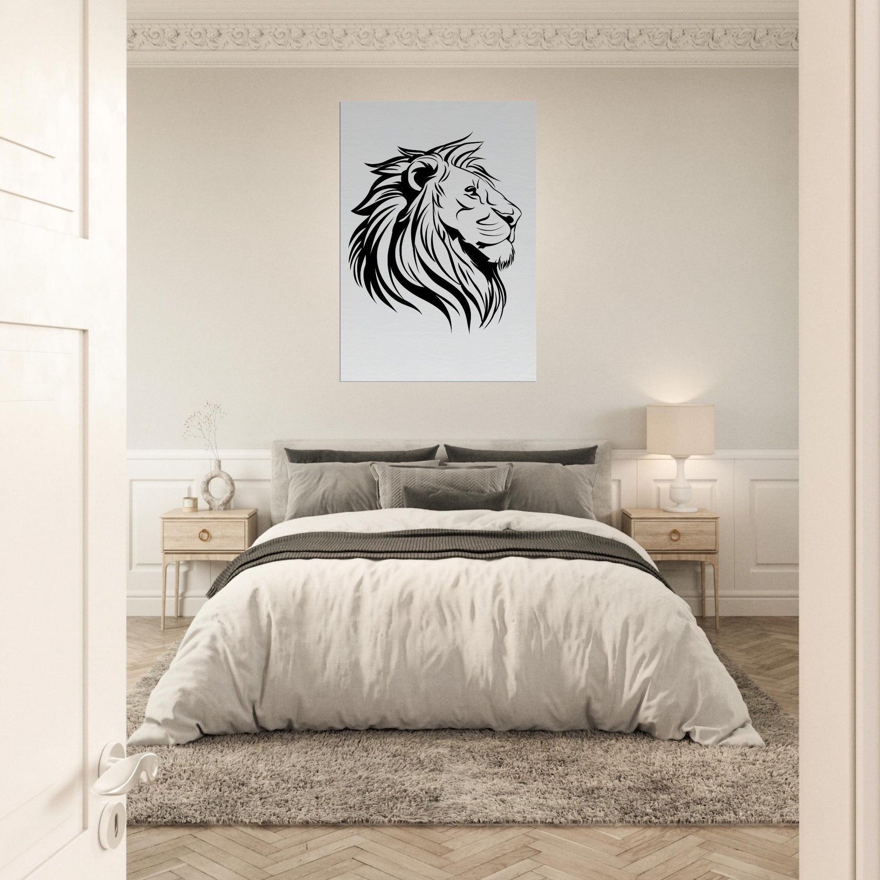 A study in quiet power, this minimalist Lion captures the essence of majesty with a handful of bold lines. The composition breathes, and negative space lets the eye slow and wander along the mane’s sweeping curves. Hang it where light falls softly, and the room rises to a calm, confident energy. The primary subject Lion exudes both fierceness and grace, providing a timeless focal point for a modern living space.