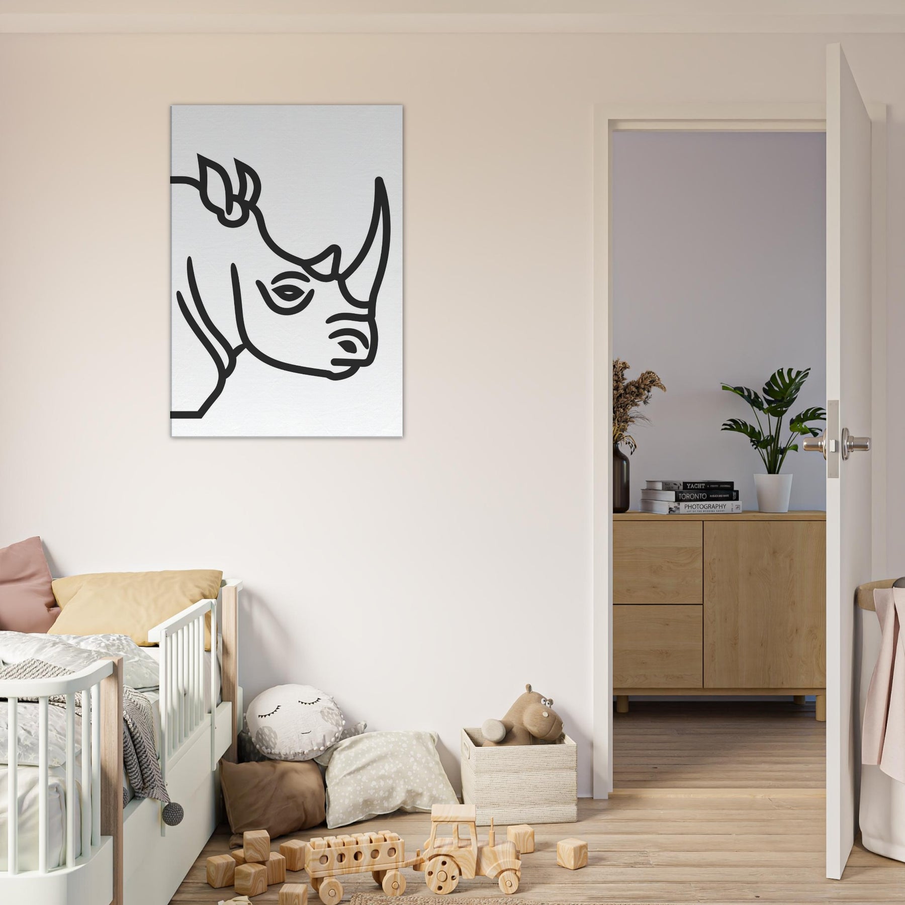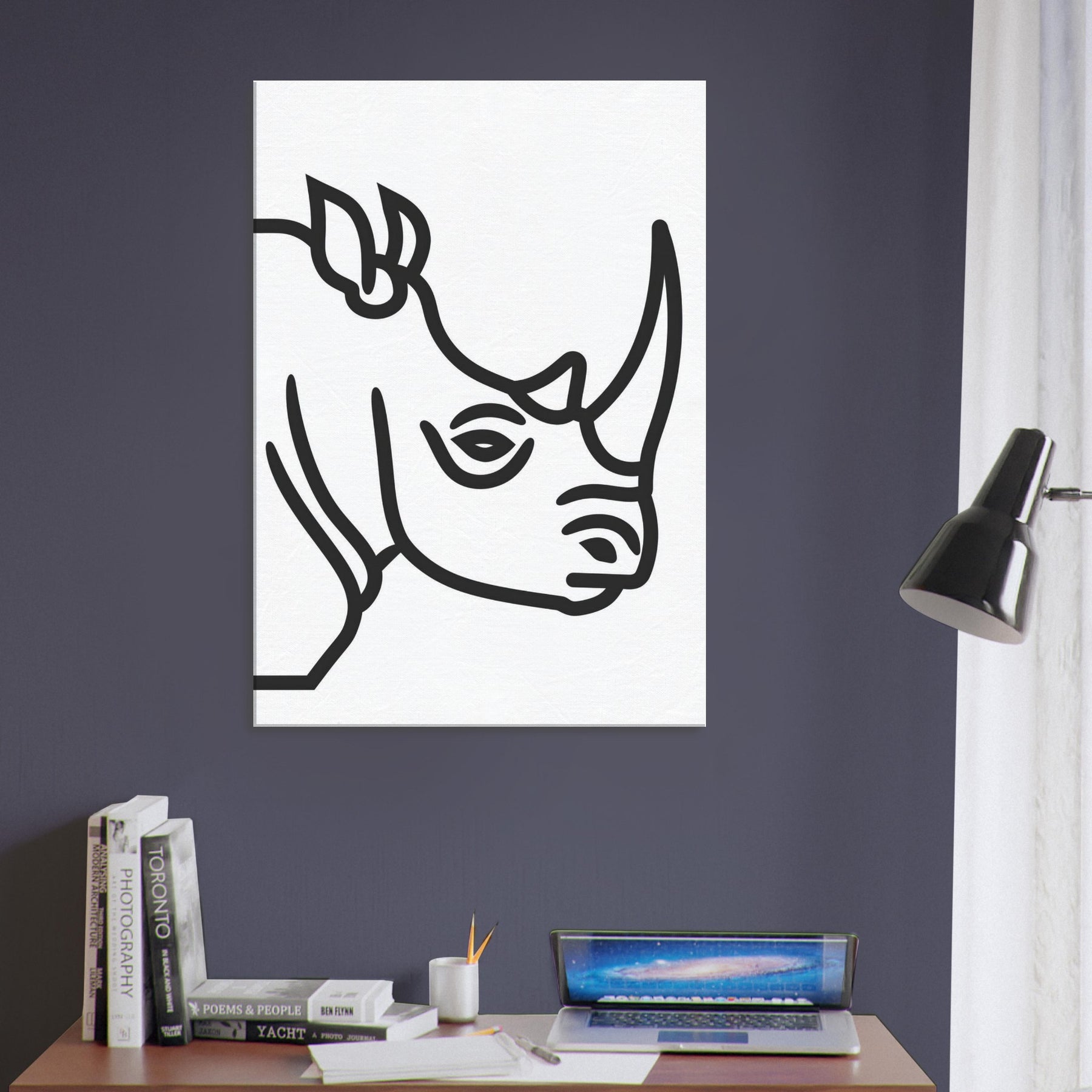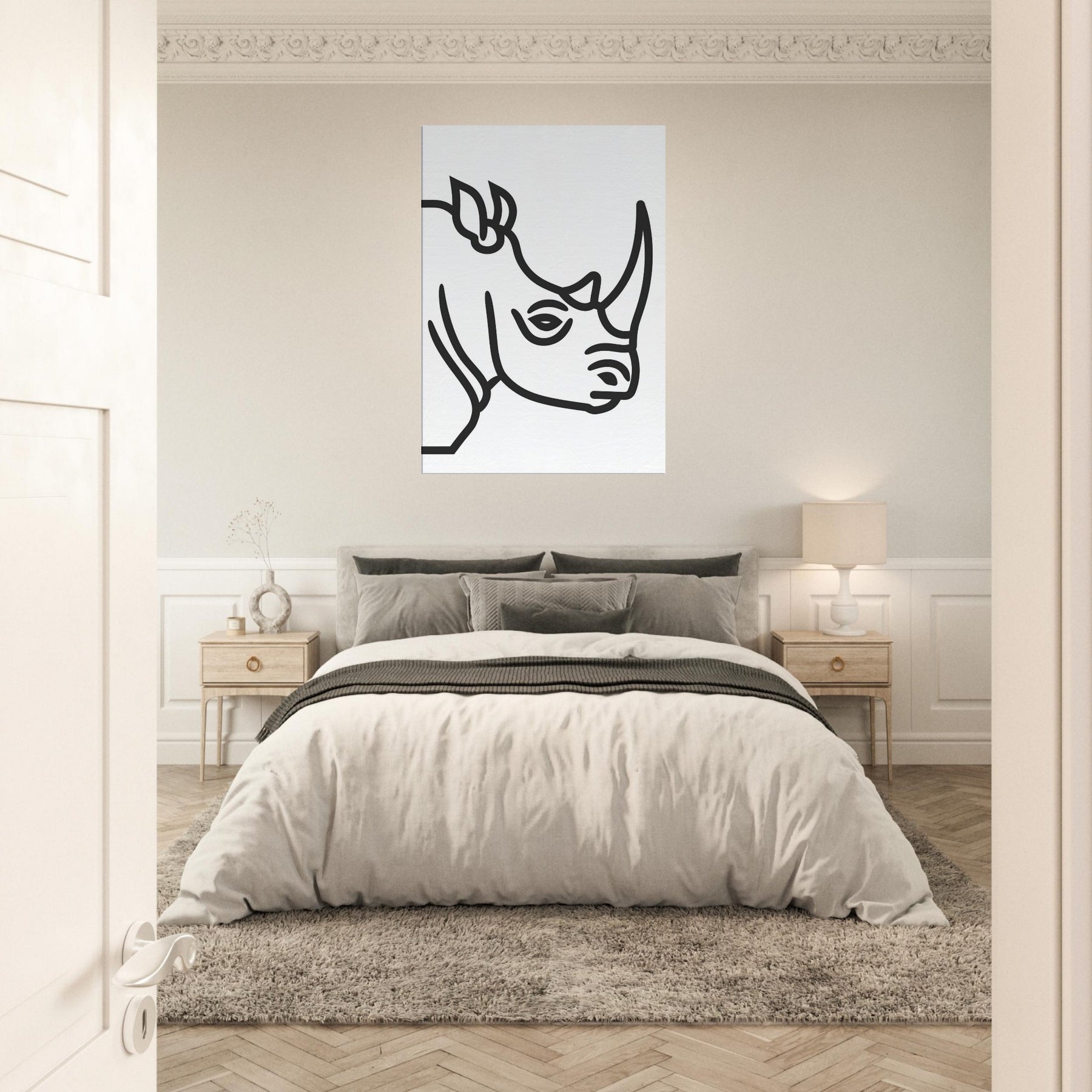 An elegant reduced form of a Rhinoceros arrives as a quiet companion in the living room. The bold, unbroken line traces the contour with breathless economy, leaving space to breathe around the figure. In its calm, minimalist presence, the piece reframes the wild into a serene silhouette you can live with softening edge lit walls, guiding light, and conversations around style, not space. Hang it where morning sun meets coffee rituals, and let the Rhinoceros become a mindful moment of stillness.