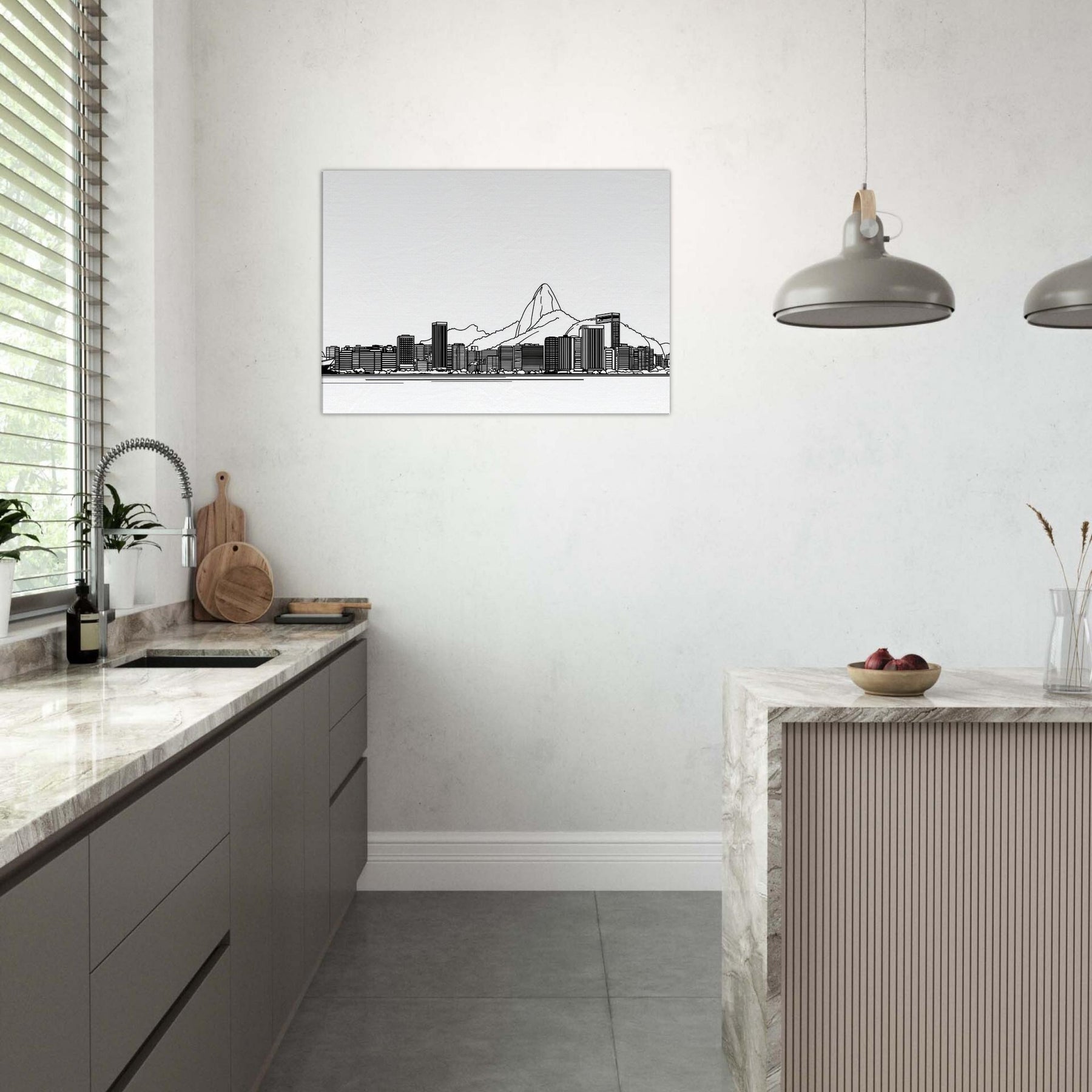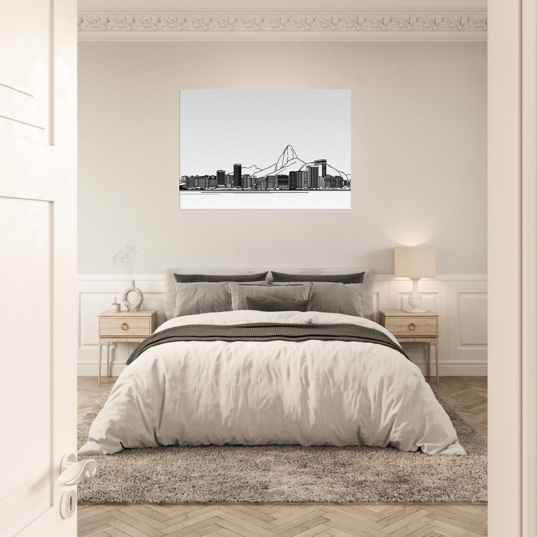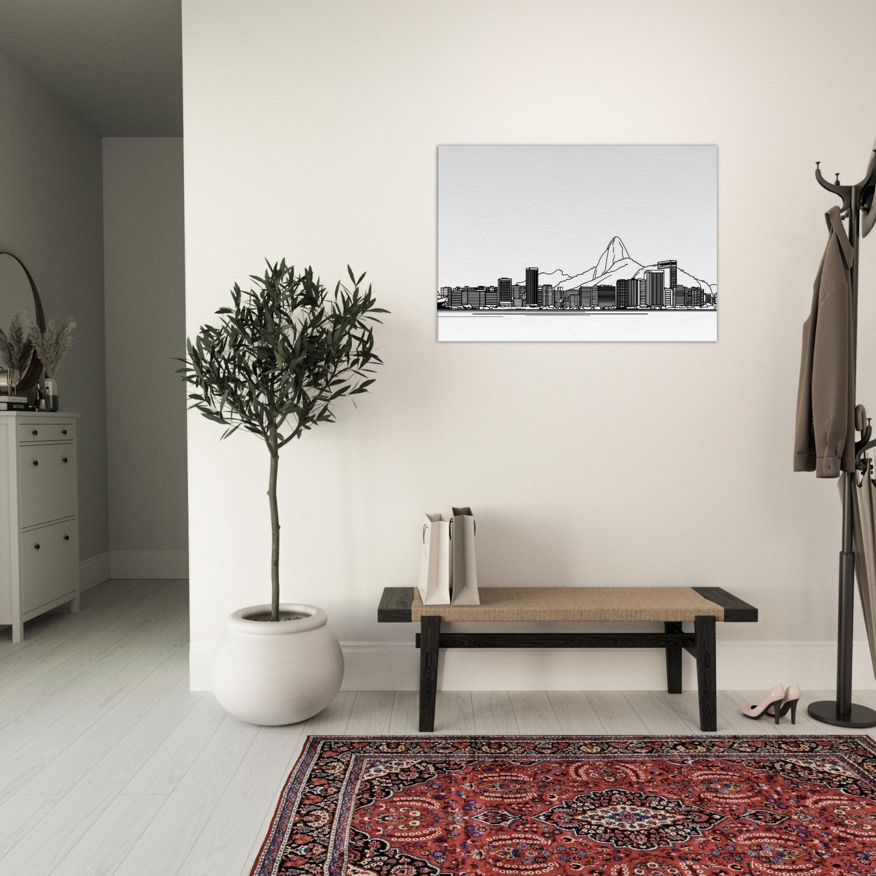 Rio De Janeiro unfurls in pristine line, a cityscape of bold towers, gentle waves, and the iconic peak rising in quiet grace. The simplicity of the contour draws the eye and quiets the mind, turning a room into a harbor of careful balance. In a living room, it catches the day's light and returns it as shadowed rhythm, pairing beautifully with natural textures and black and white tones. This artwork invites introspection, conversation, and a subtle sense of travel, making any space feel expansive and luminous.