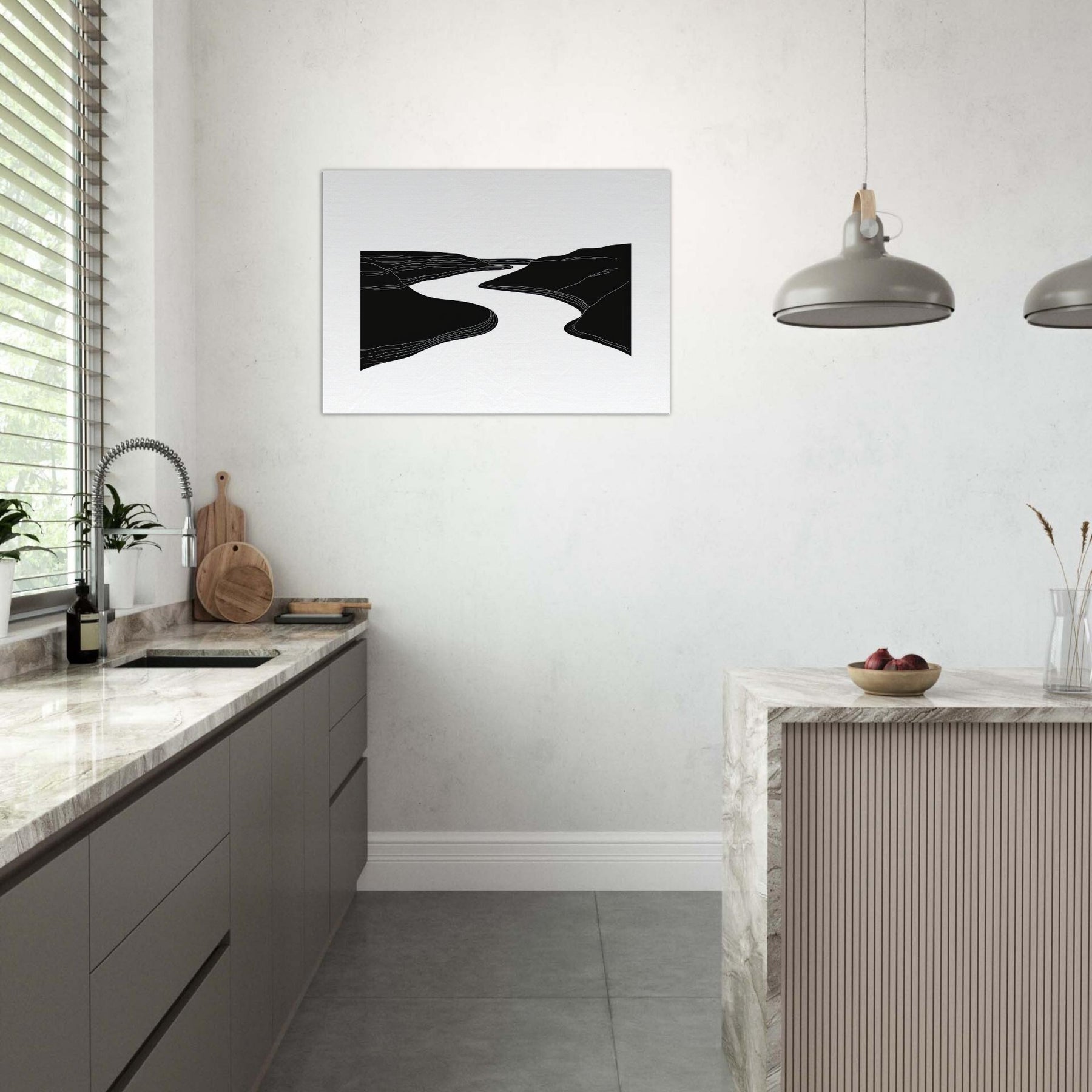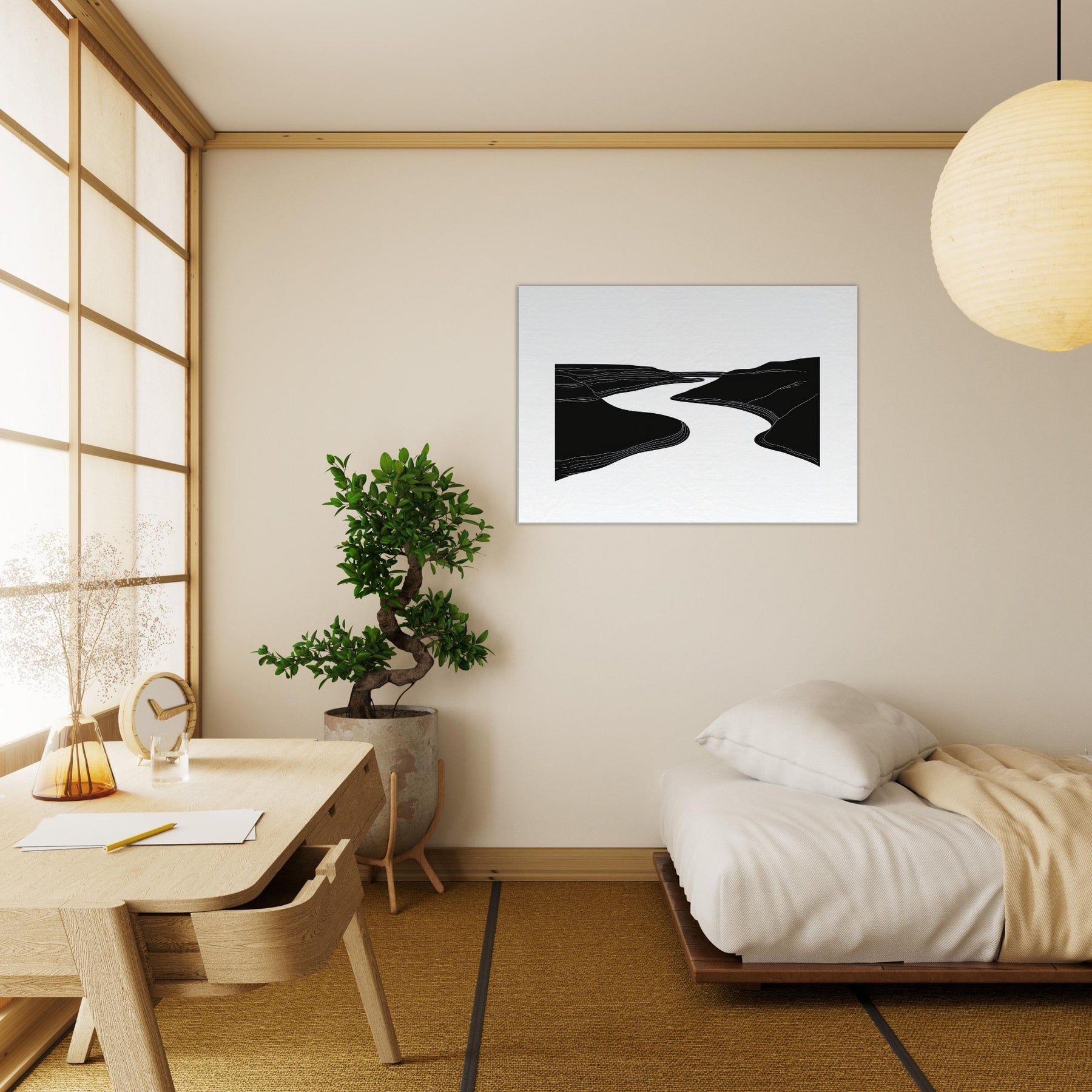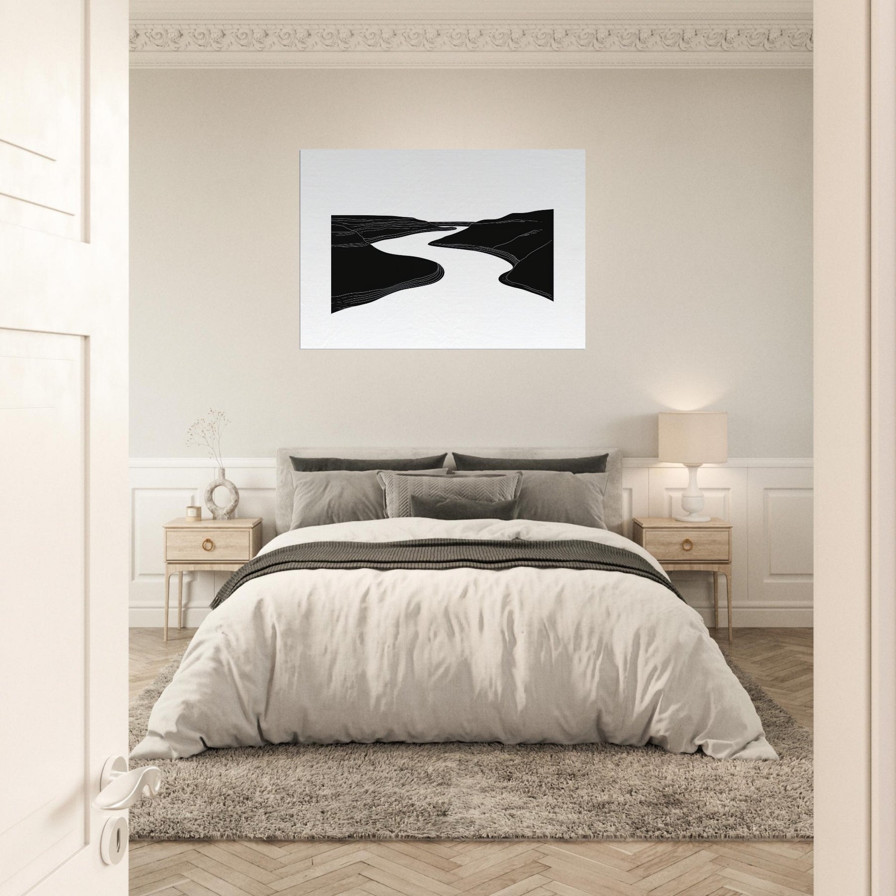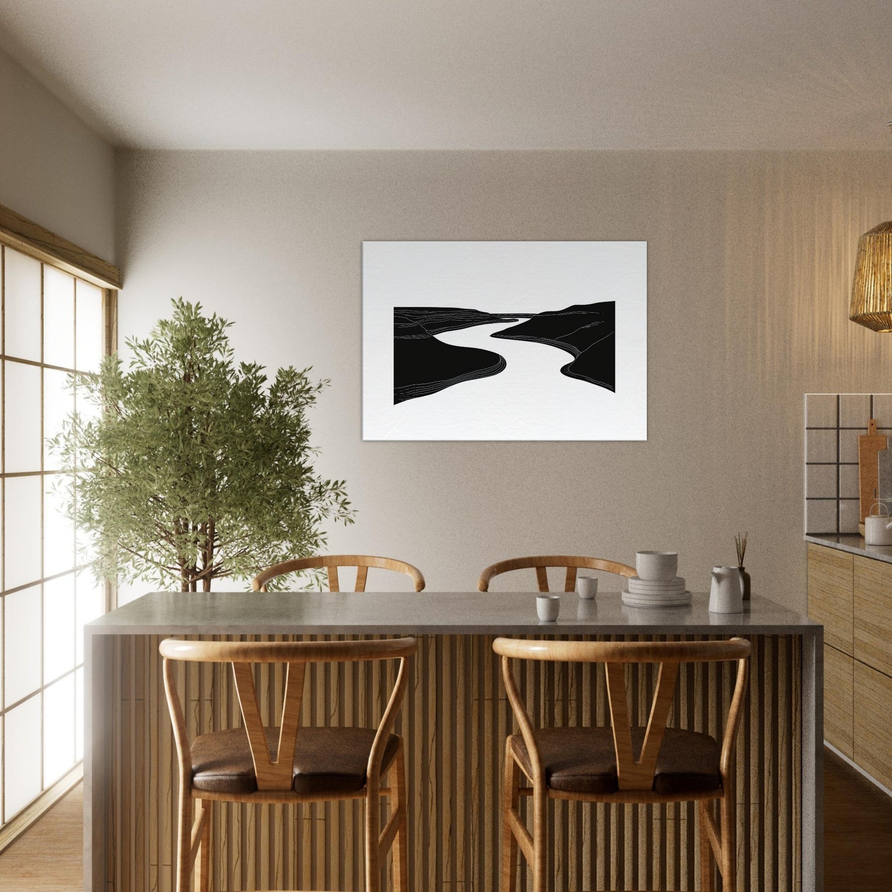 Silhouette and silence converge where the River winds between dark banks, traced by quiet lines that ripple across the canvas. This line art study invites a slow gaze, turning walls into a living of breeze and movement. In a living room, it acts as a serene conduit for light and shadow, elevating textures with airy contrast and generous negative space. The effect is calming, contemplative, and timeless nature distilled into an elegant, architectural gesture.