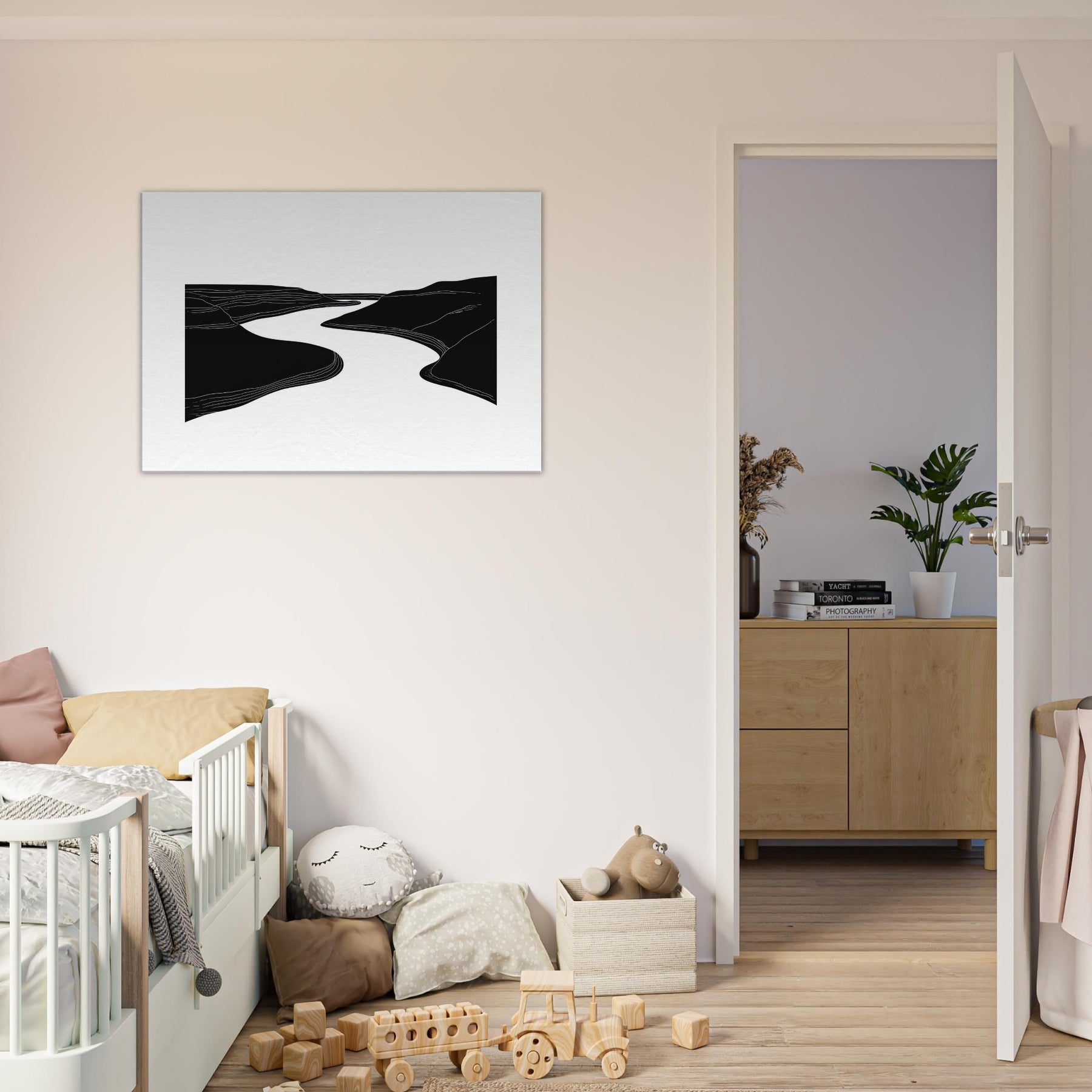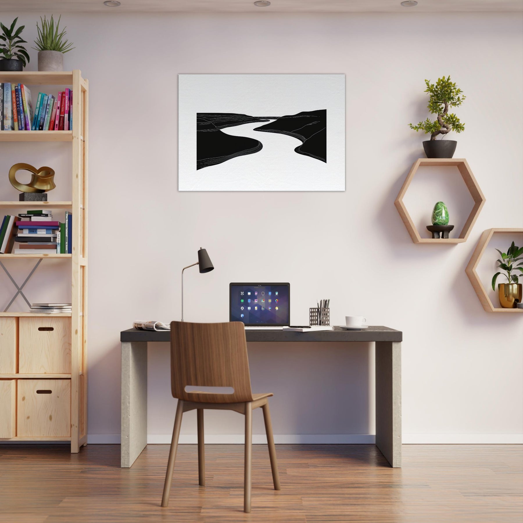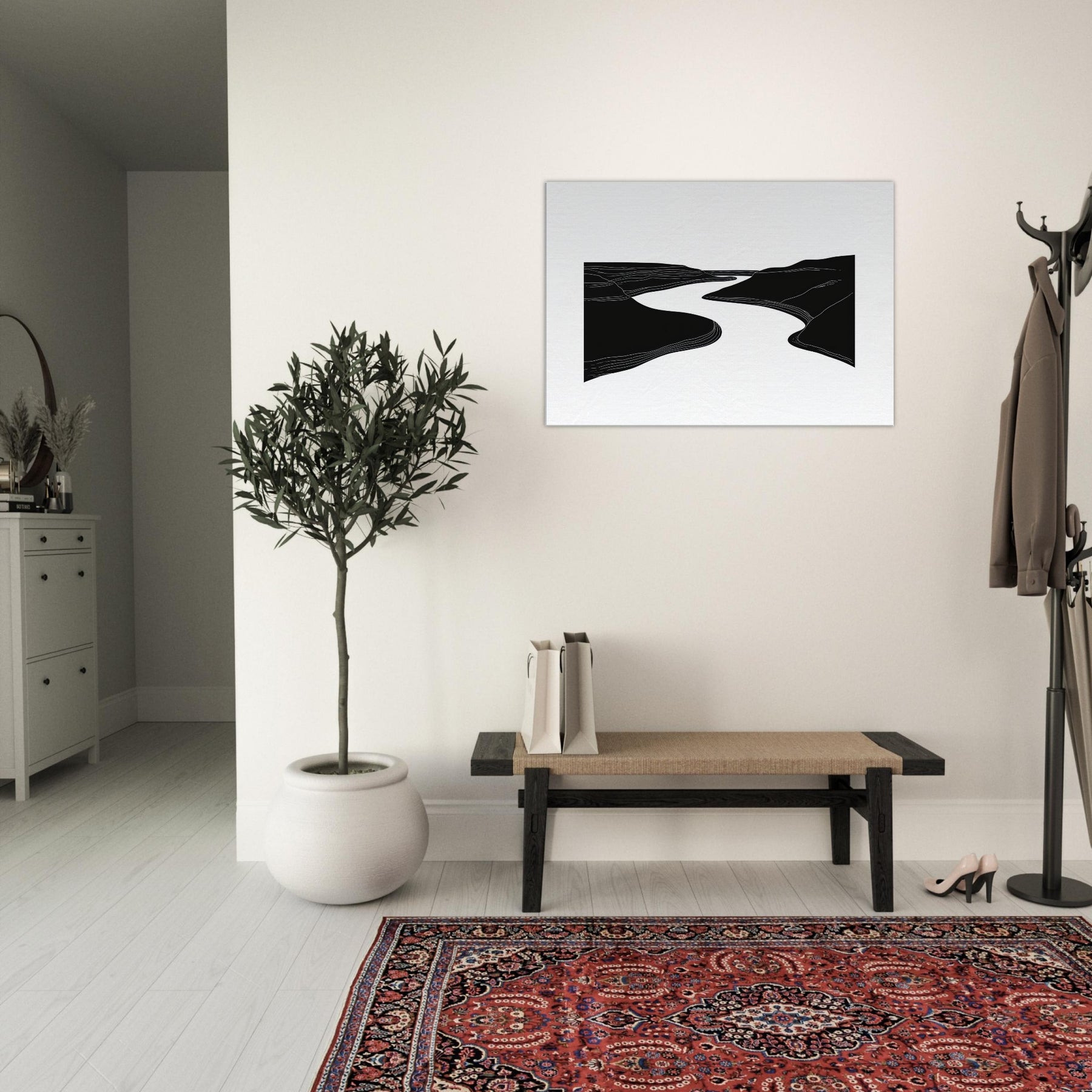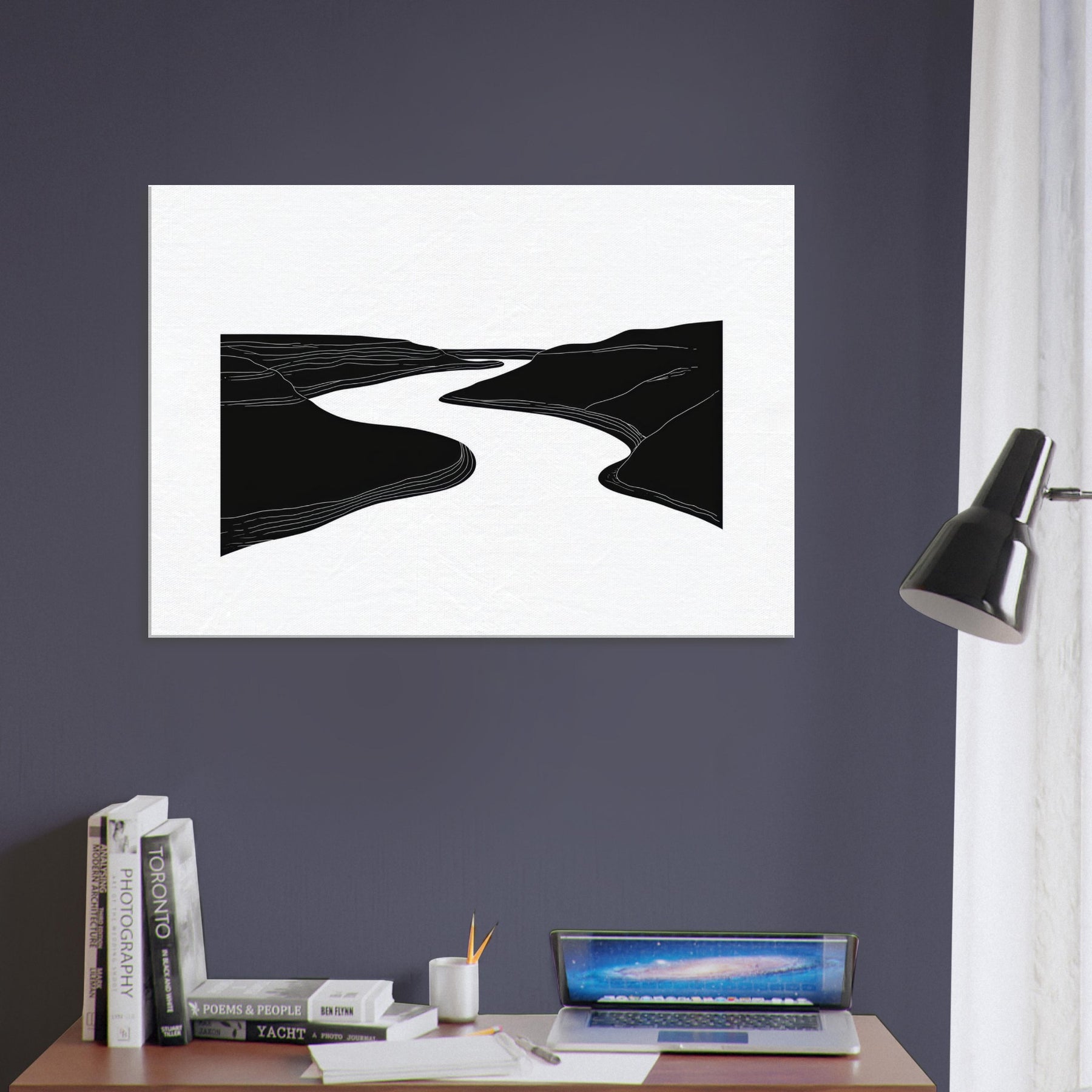 Silhouette and silence converge where the River winds between dark banks, traced by quiet lines that ripple across the canvas. This line art study invites a slow gaze, turning walls into a living of breeze and movement. In a living room, it acts as a serene conduit for light and shadow, elevating textures with airy contrast and generous negative space. The effect is calming, contemplative, and timeless nature distilled into an elegant, architectural gesture.
