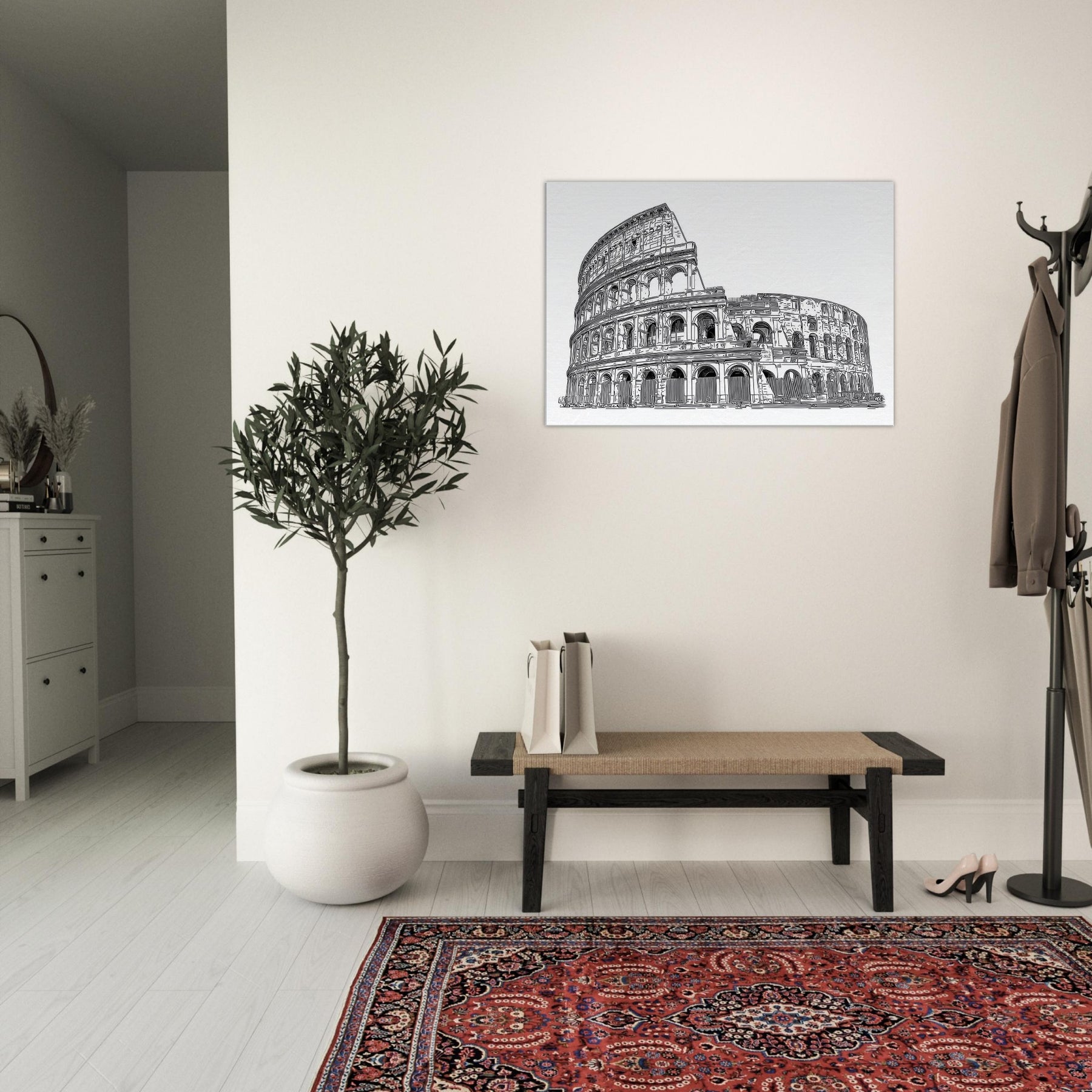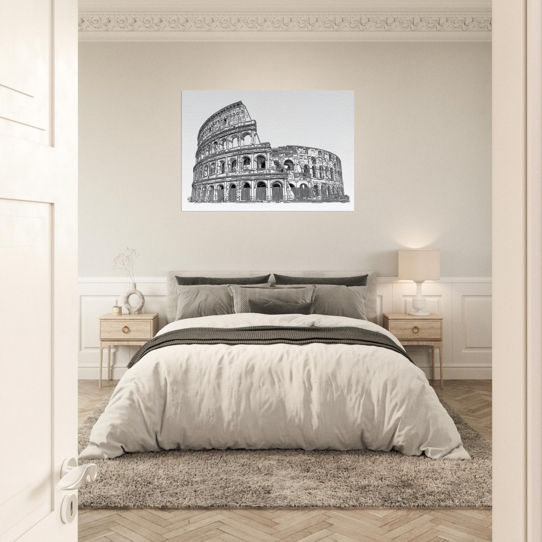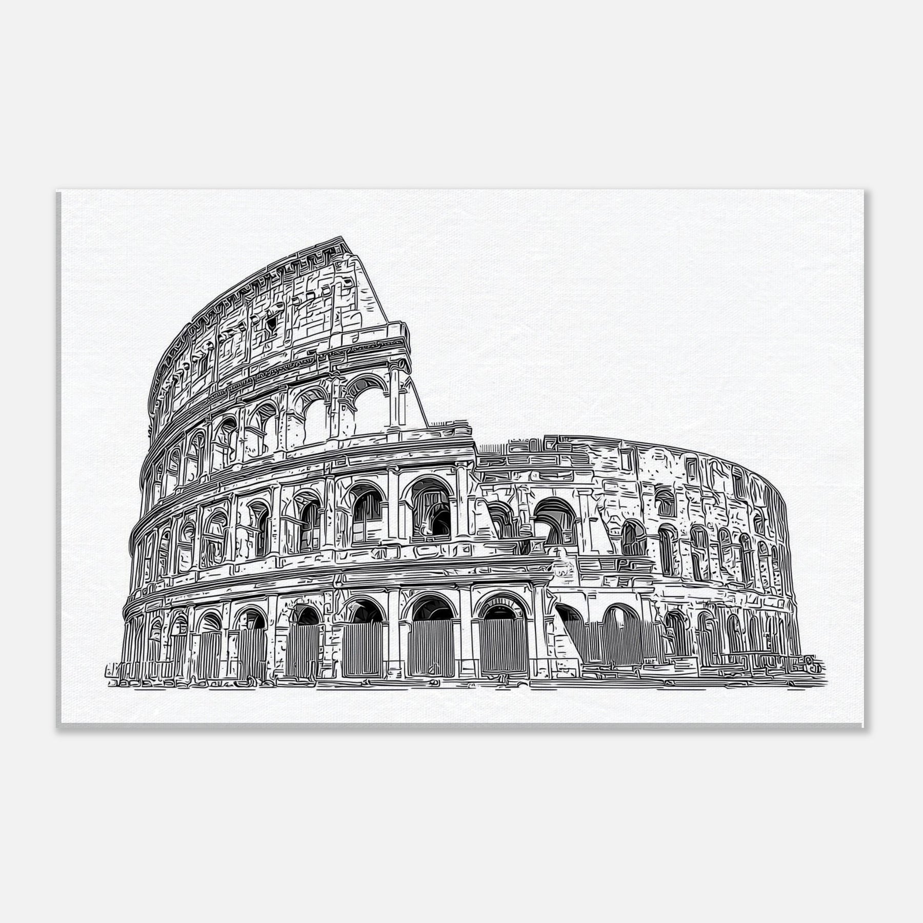Let the timeless arches of Rome unfold in your space with quiet elegance. This refined line drawing captures the Colosseum's terraces and arches in a living room friendly monochrome, inviting the eye to trace its elegant contours. The minimalist black and white palette adds drama without overpowering, making it ideal for a serene corner, study, or above a sofa. In morning light or evening glow, the piece feels airy and timeless, turning everyday moments into a quiet passport to history and architectural poetry.